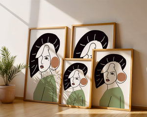 Home Minimalist Abstract Portrait Featuring Woman with Black Hat and Green Outfit