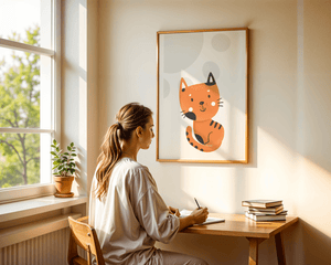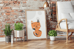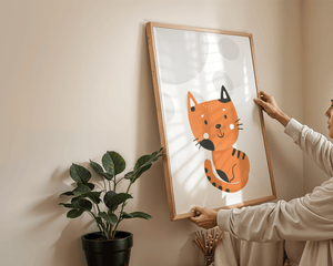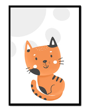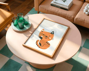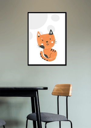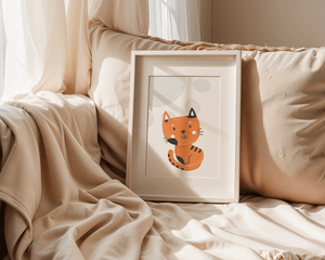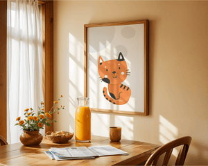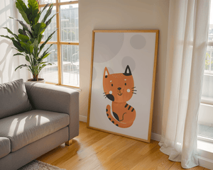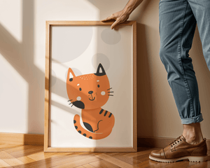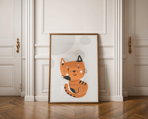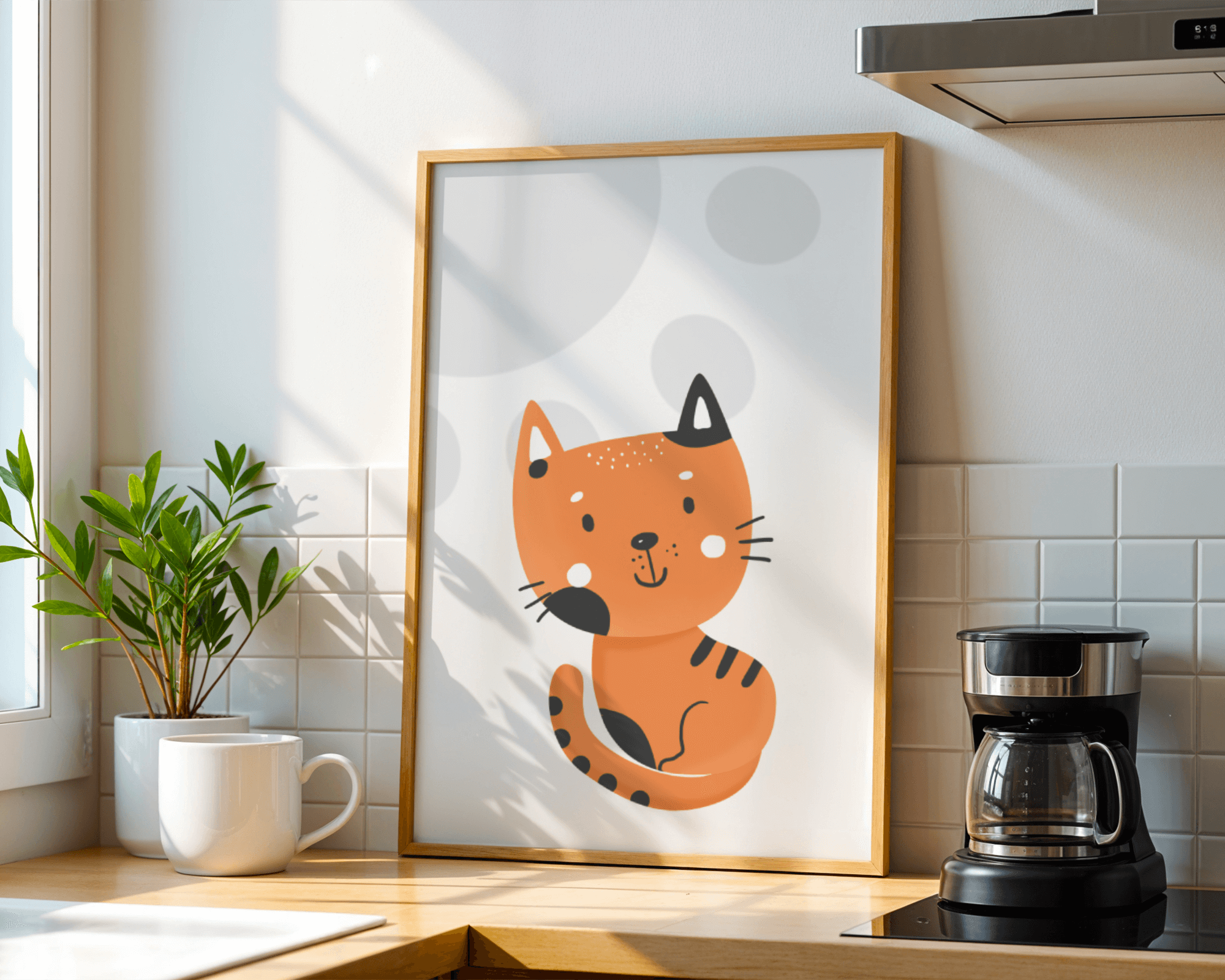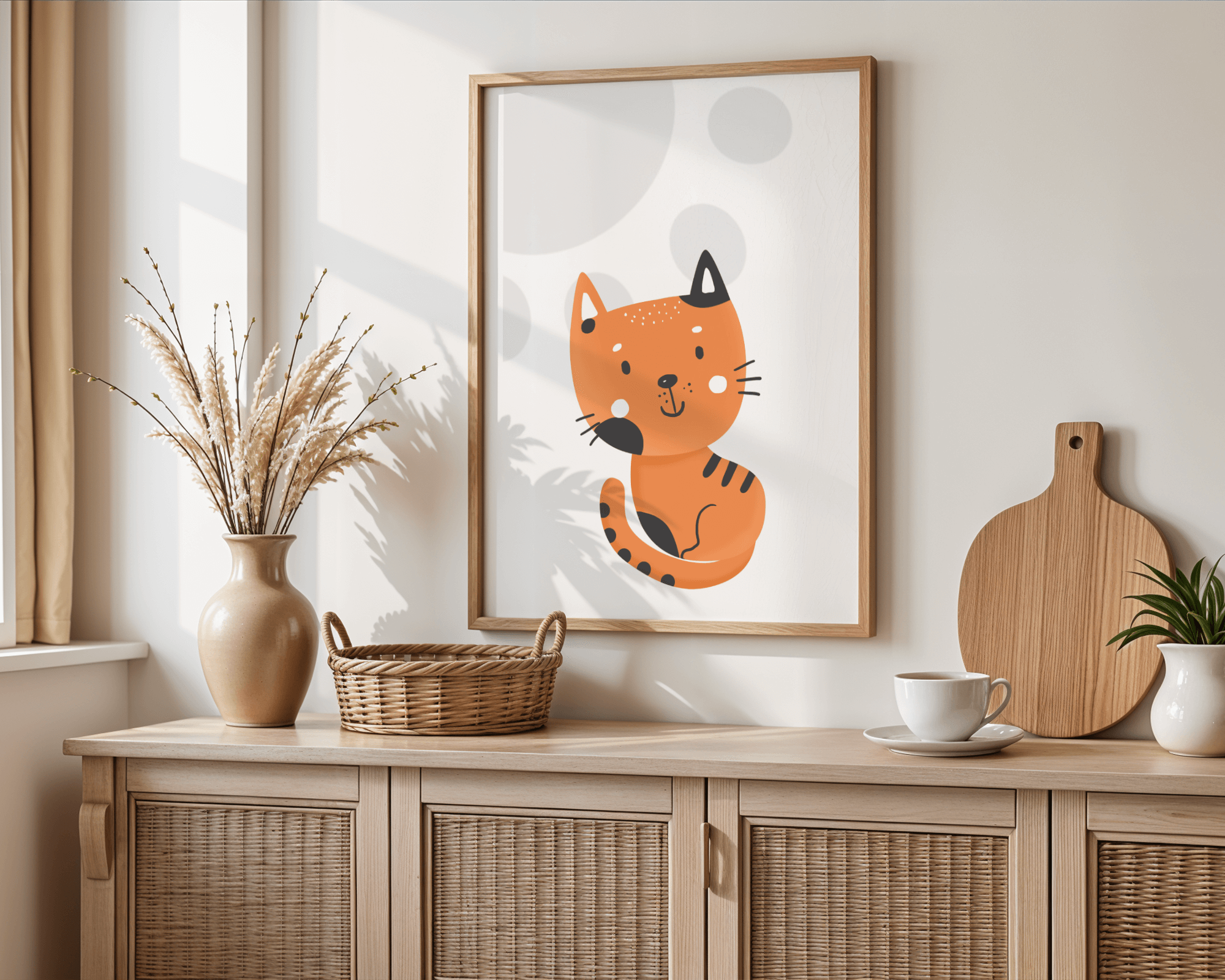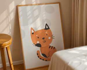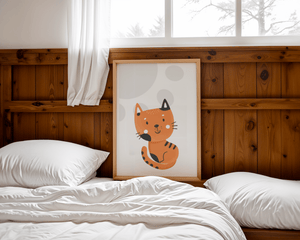 This charming minimalist cat poster features a playful orange kitten illustration, perfect for adding warmth and personality to any space. Designed with soft colors and a modern aesthetic, this piece is ideal for children's rooms, nurseries, or anyone who loves feline-themed decor. The clean lines and cute expression make it an inviting addition to your home.