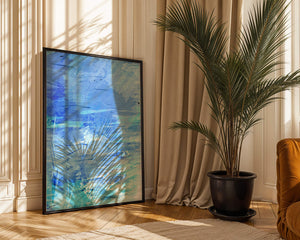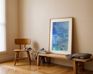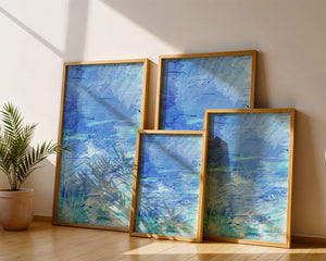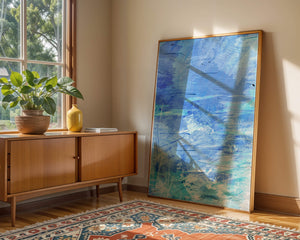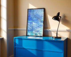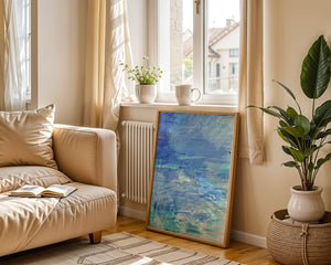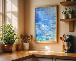 This vibrant image showcases an abstract blue watercolor texture, perfect for modern interiors. Its fluid brushstrokes and layered hues of blue create a serene and calming ambiance.