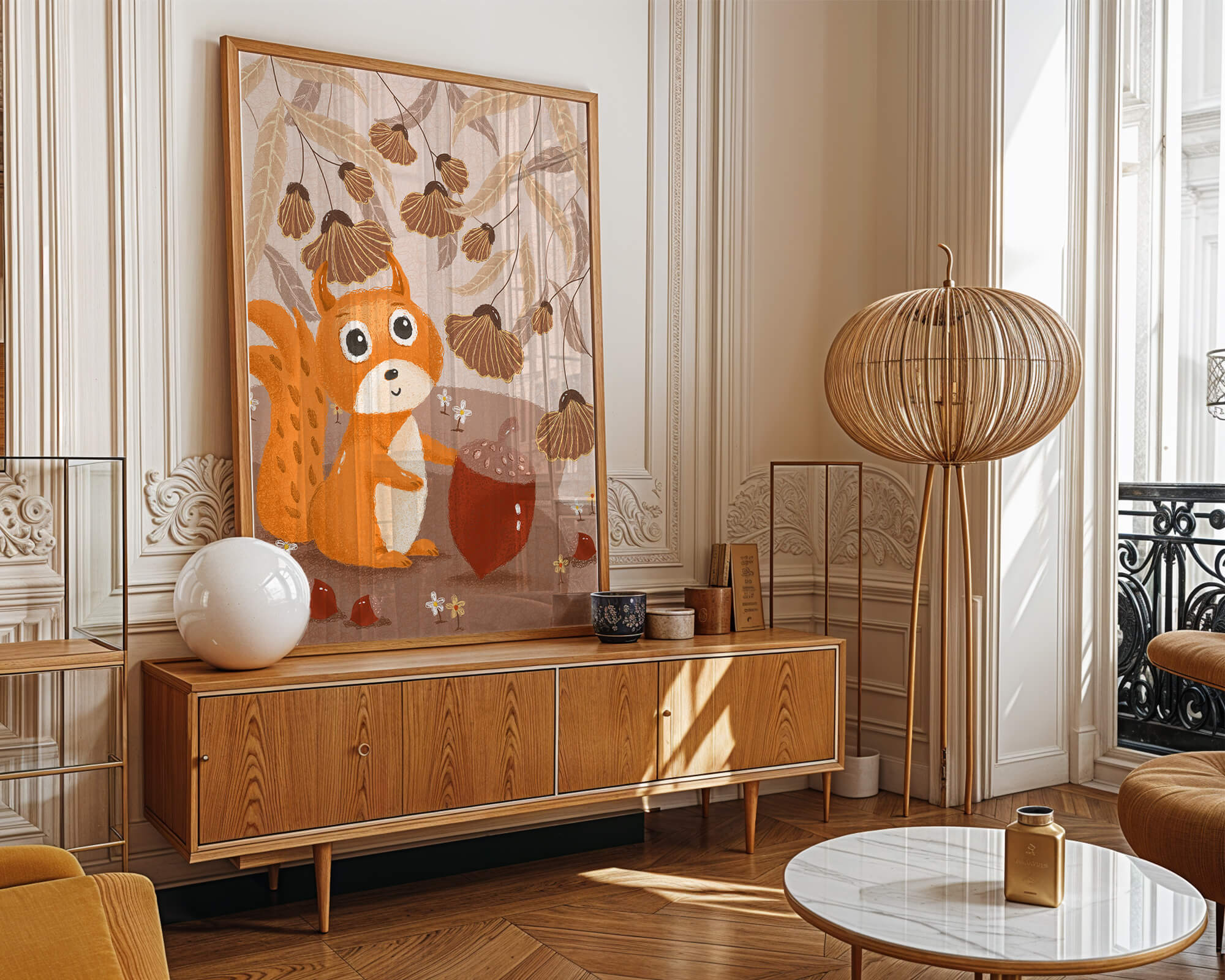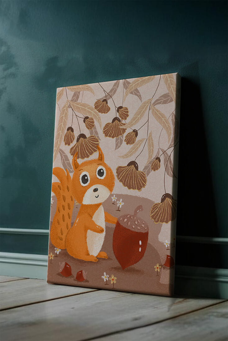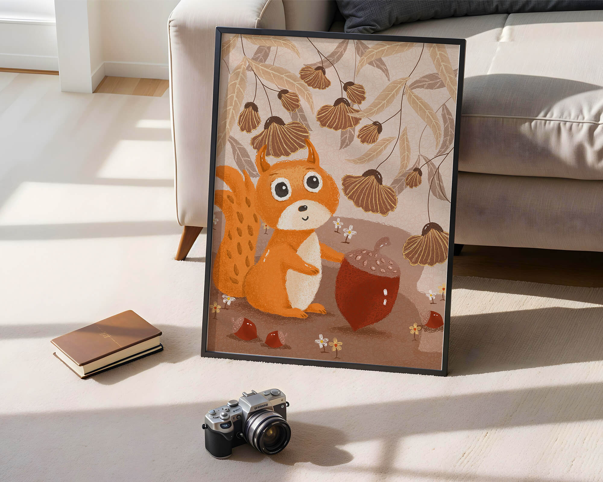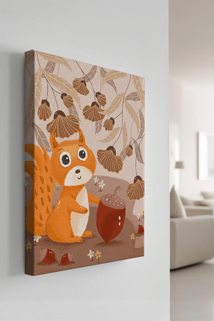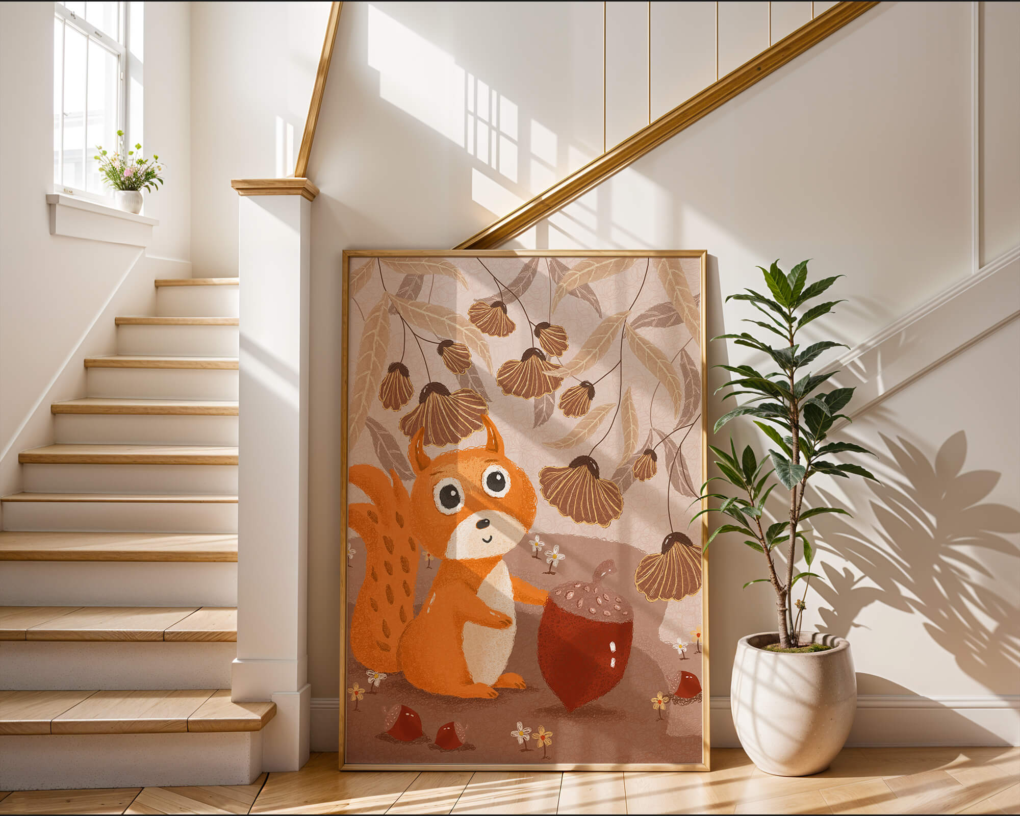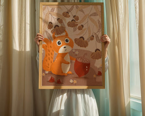 This enchanting illustration captures the essence of autumn with its vibrant colors and charming woodland creature. The orange squirrel, depicted with wide eyes and a joyful expression, symbolizes the playful spirit of the forest. Surrounded by delicate flowers and hanging leaves, the scene evokes a sense of wonder and fantasy. The use of warm tones and whimsical elements creates a cozy and inviting ambiance, perfect for adding a touch of nature to any space. The playful character and detailed background make this artwork appealing for both children and adults who appreciate the magic of the natural world.