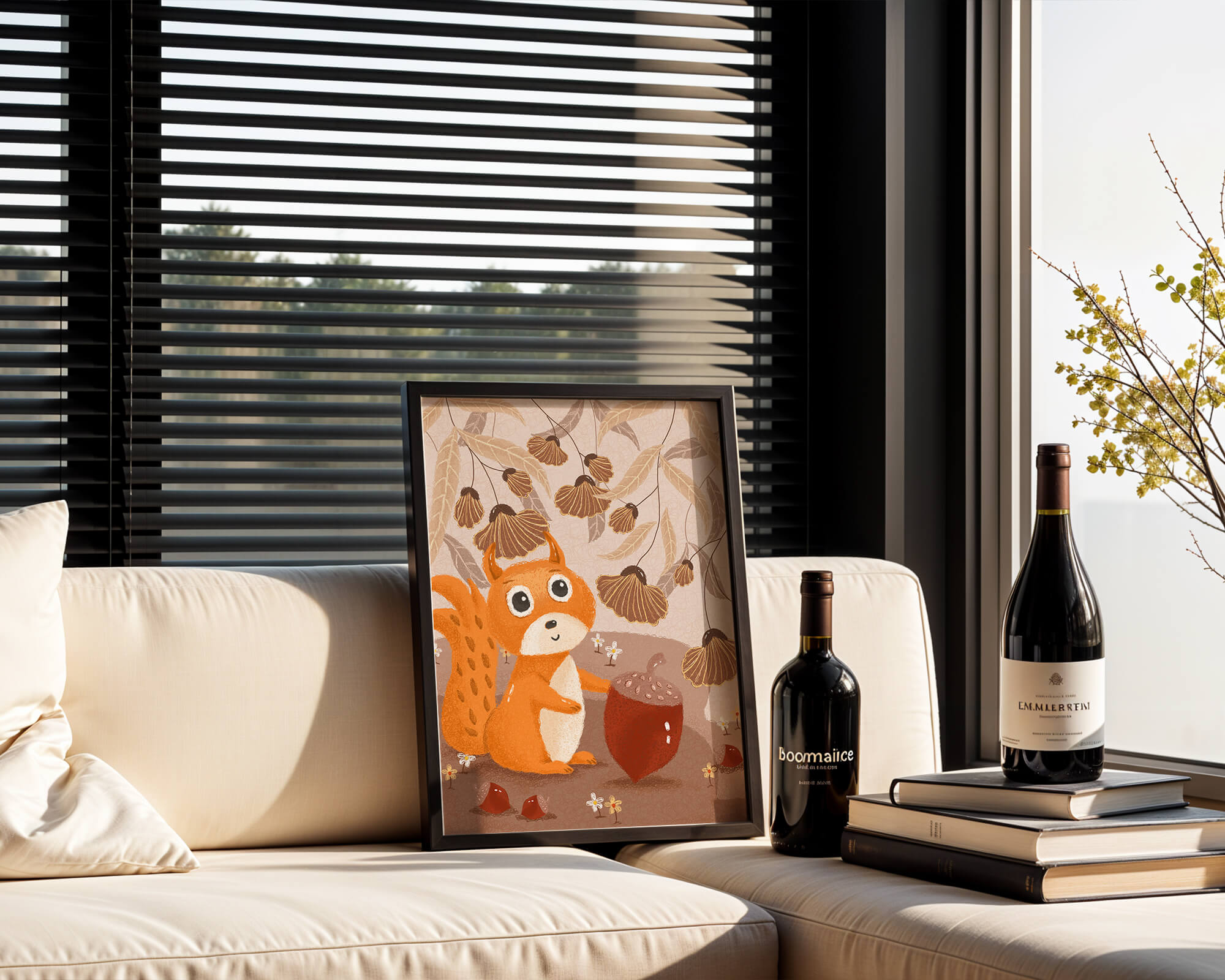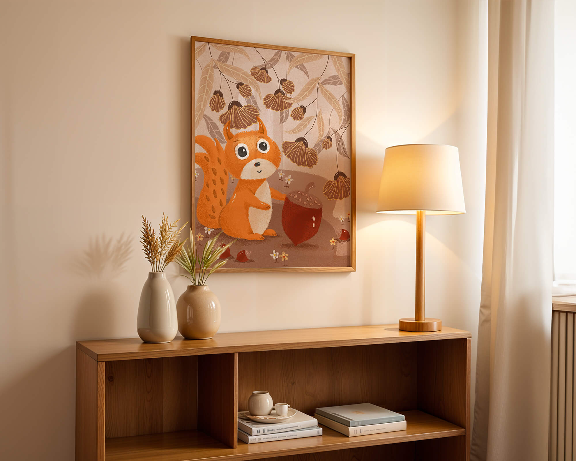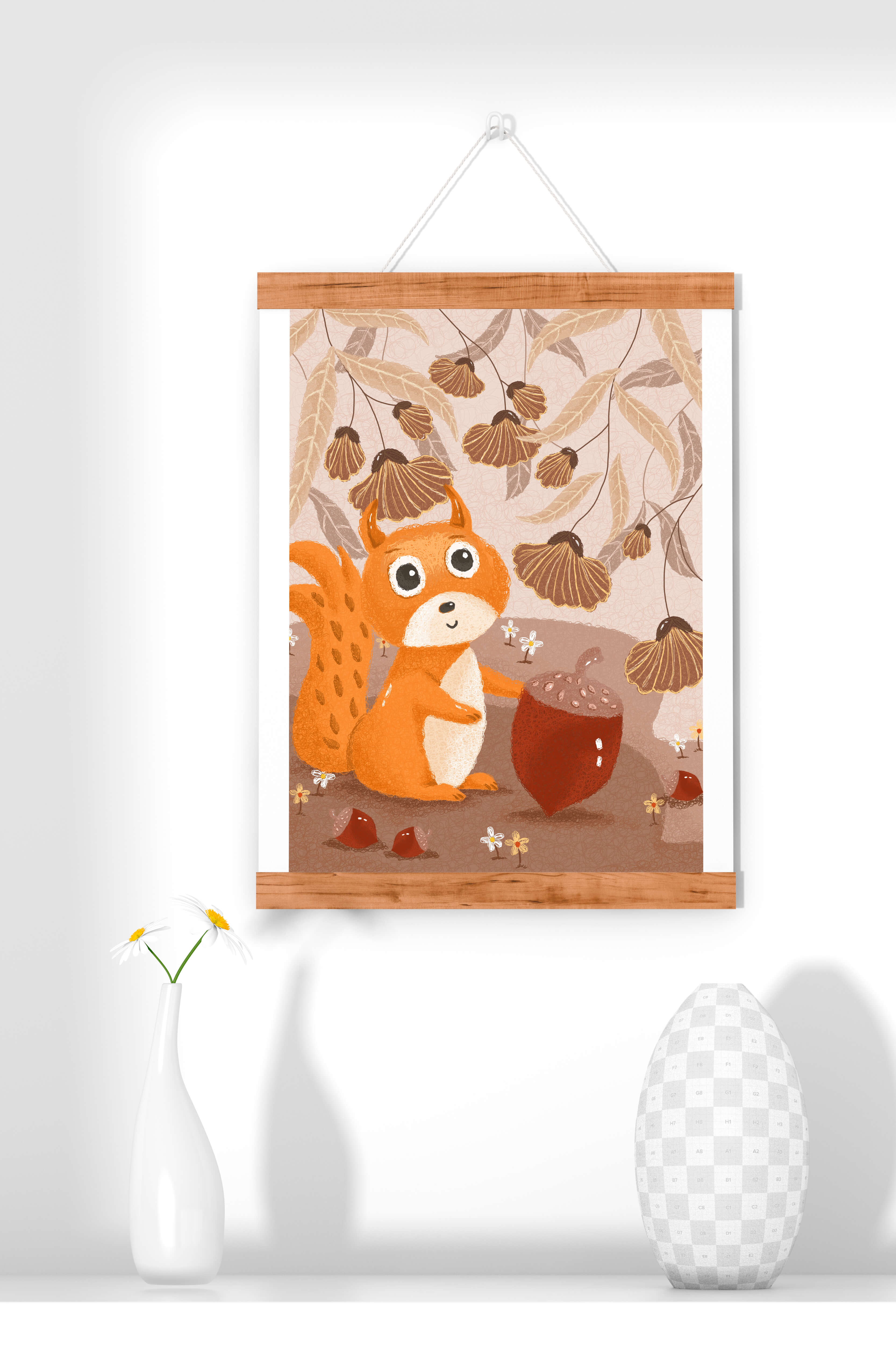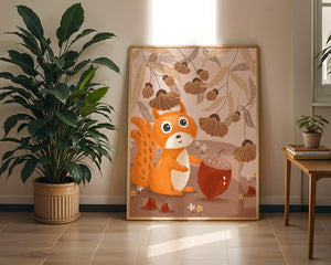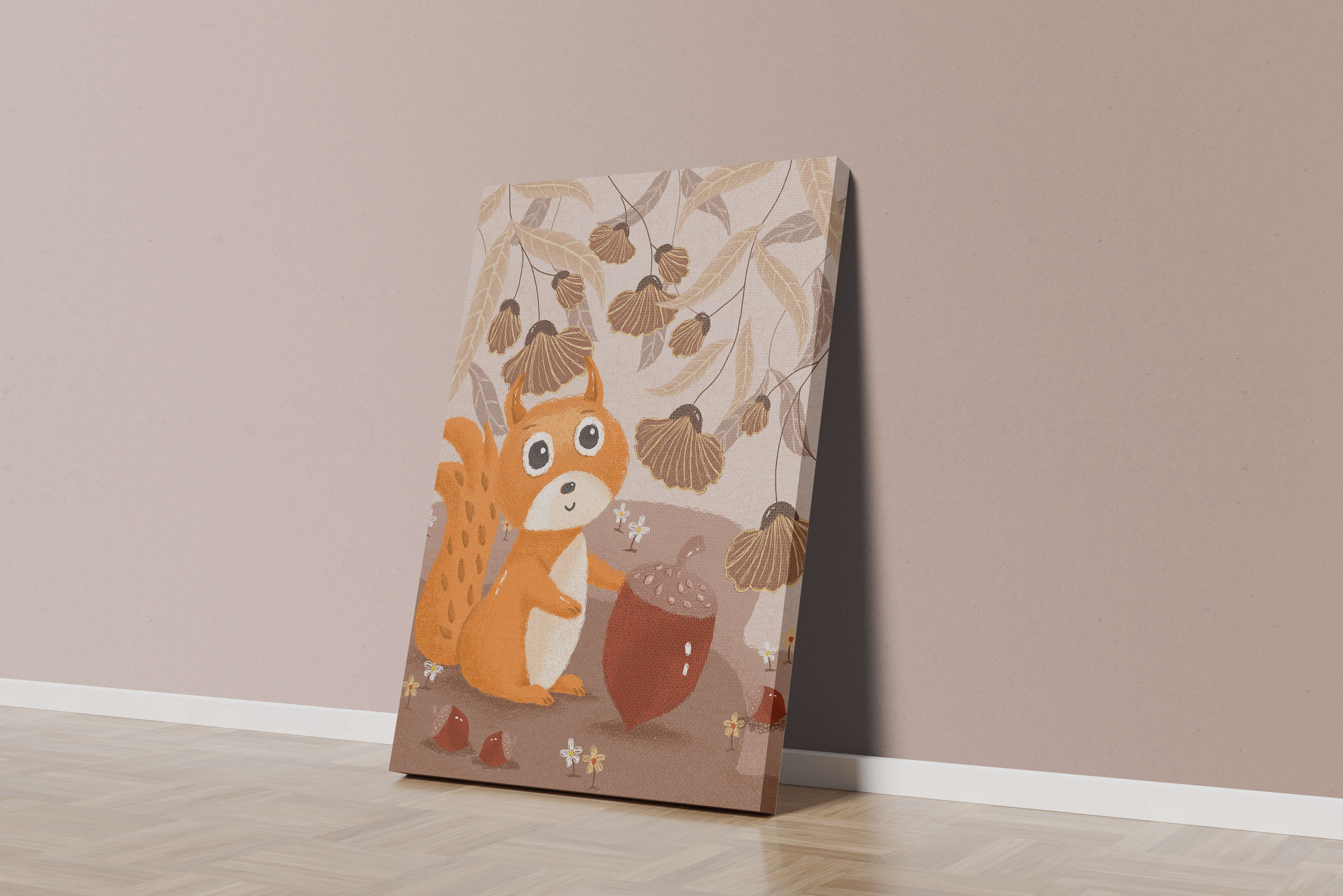 This enchanting illustration captures the essence of autumn with its vibrant colors and charming woodland creature. The orange squirrel, depicted with wide eyes and a joyful expression, symbolizes the playful spirit of the forest. Surrounded by delicate flowers and hanging leaves, the scene evokes a sense of wonder and fantasy. The use of warm tones and whimsical elements creates a cozy and inviting ambiance, perfect for adding a touch of nature to any space. The playful character and detailed background make this artwork appealing for both children and adults who appreciate the magic of the natural world.