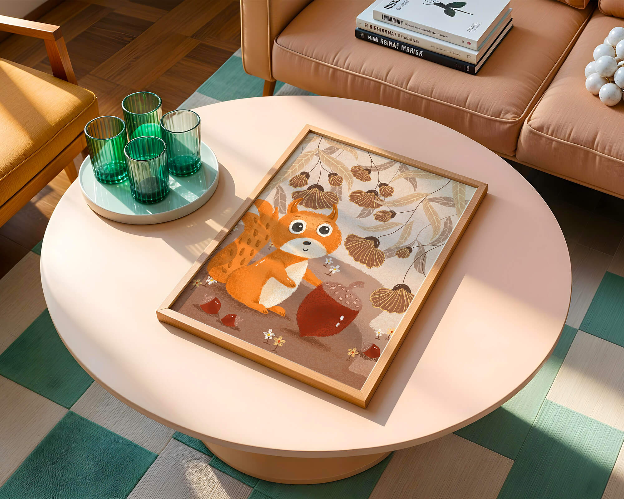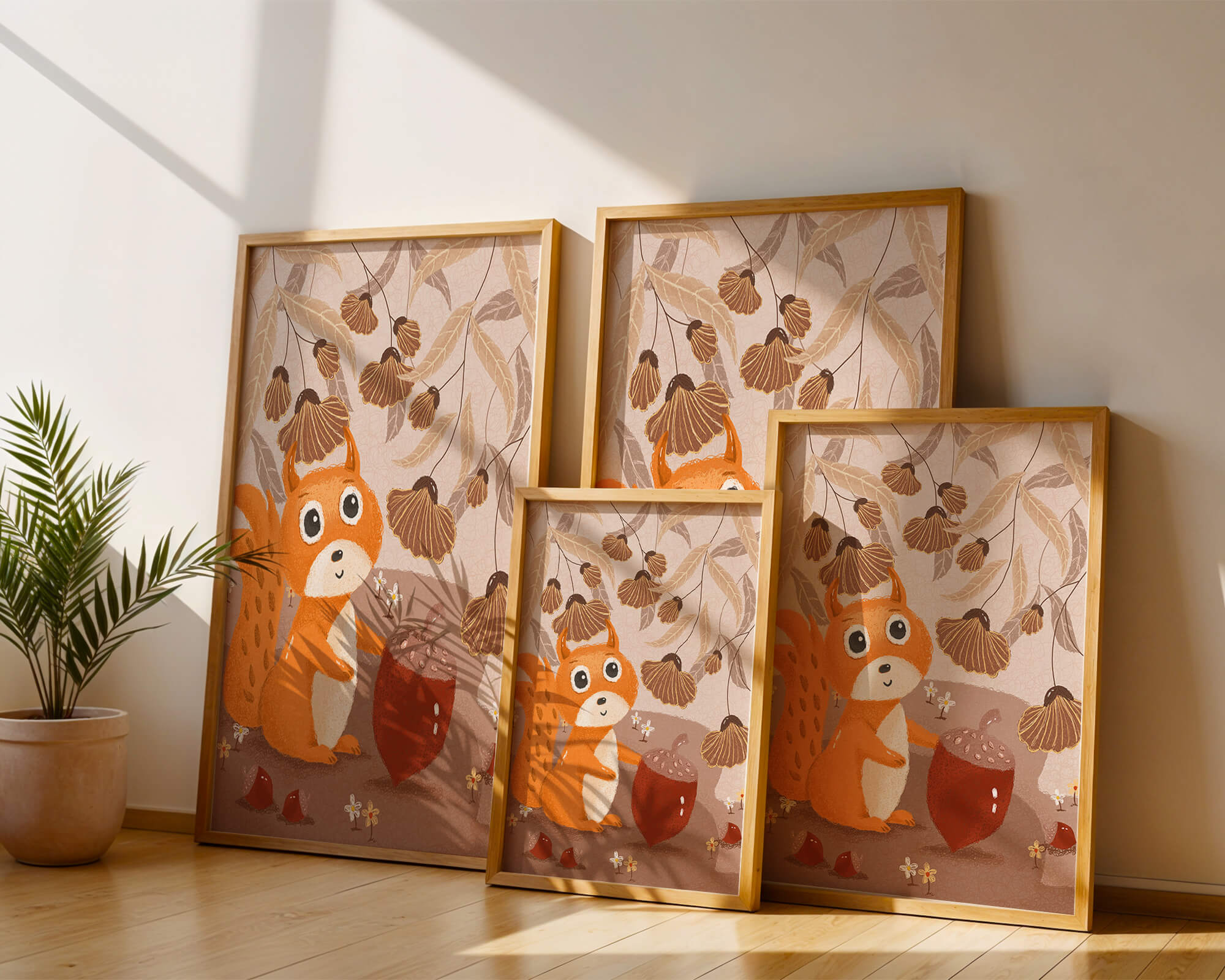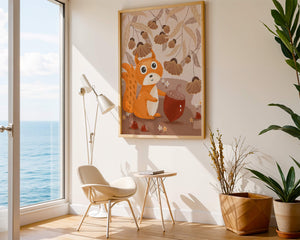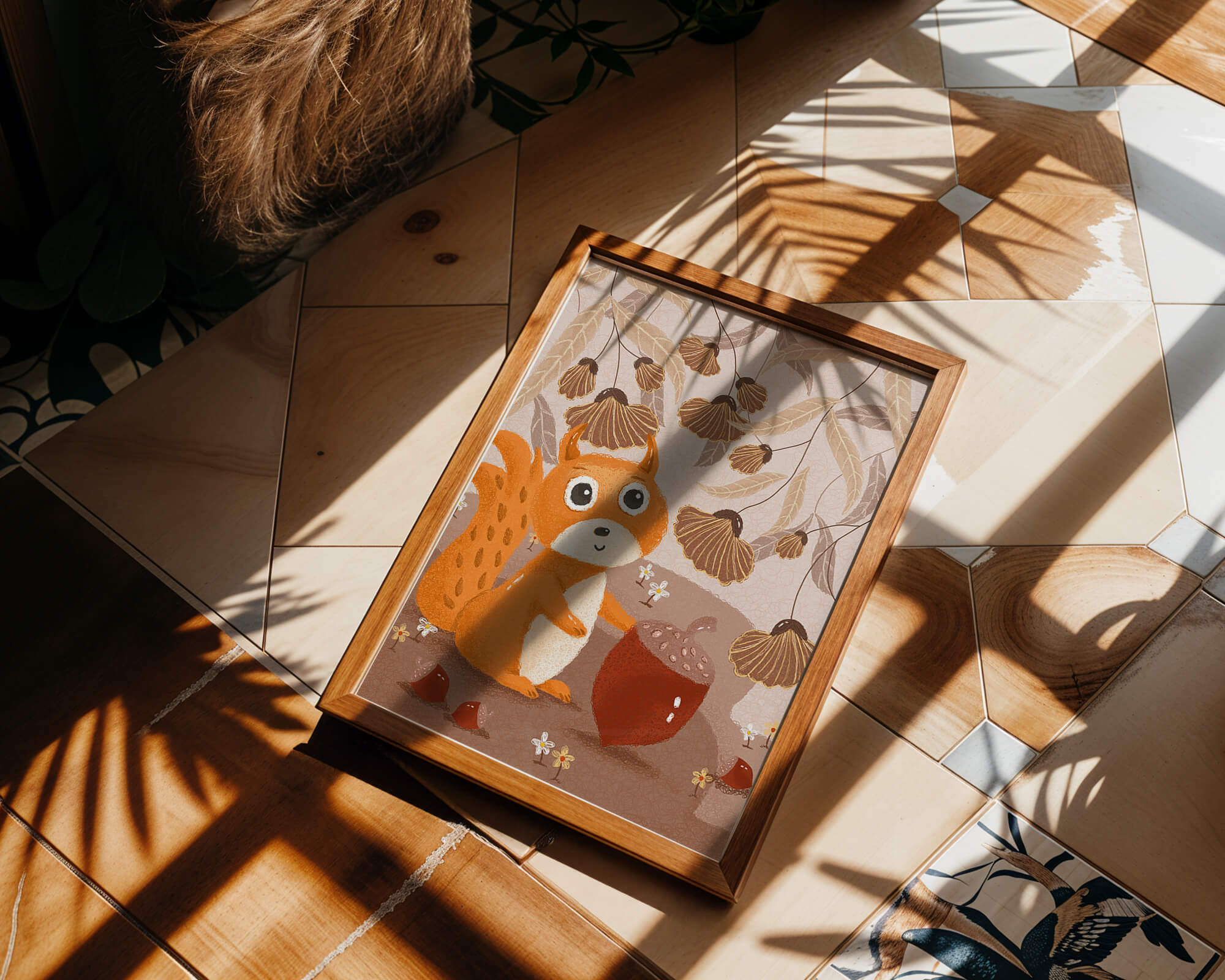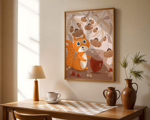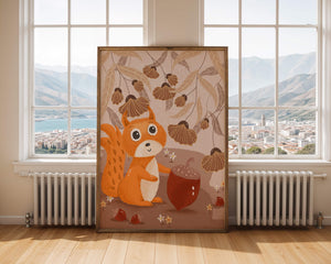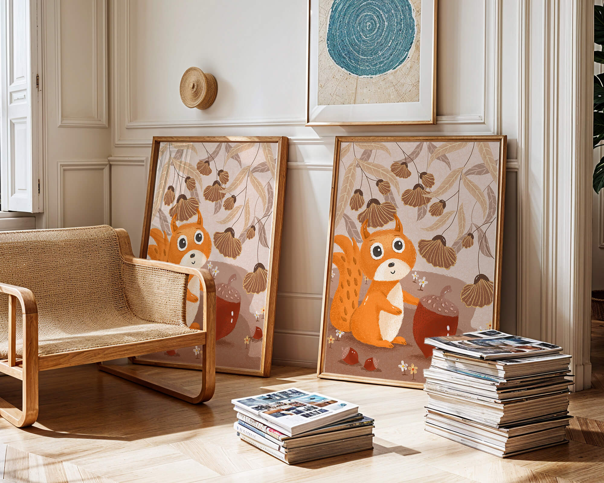 This enchanting illustration captures the essence of autumn with its vibrant colors and charming woodland creature. The orange squirrel, depicted with wide eyes and a joyful expression, symbolizes the playful spirit of the forest. Surrounded by delicate flowers and hanging leaves, the scene evokes a sense of wonder and fantasy. The use of warm tones and whimsical elements creates a cozy and inviting ambiance, perfect for adding a touch of nature to any space. The playful character and detailed background make this artwork appealing for both children and adults who appreciate the magic of the natural world.