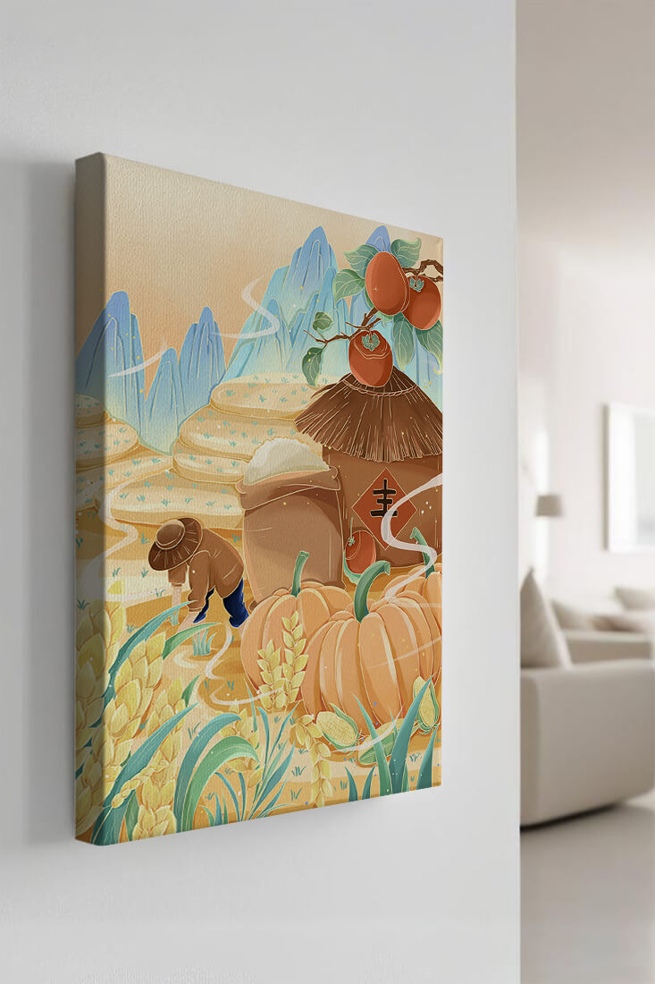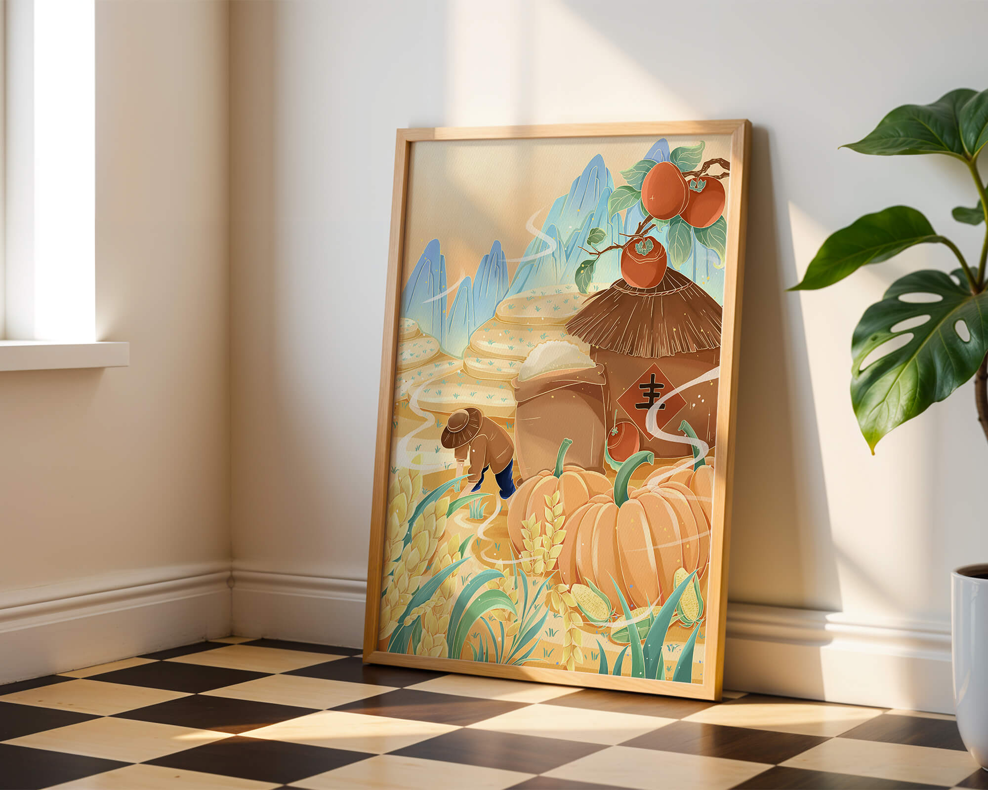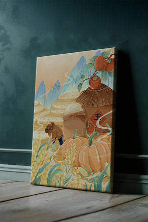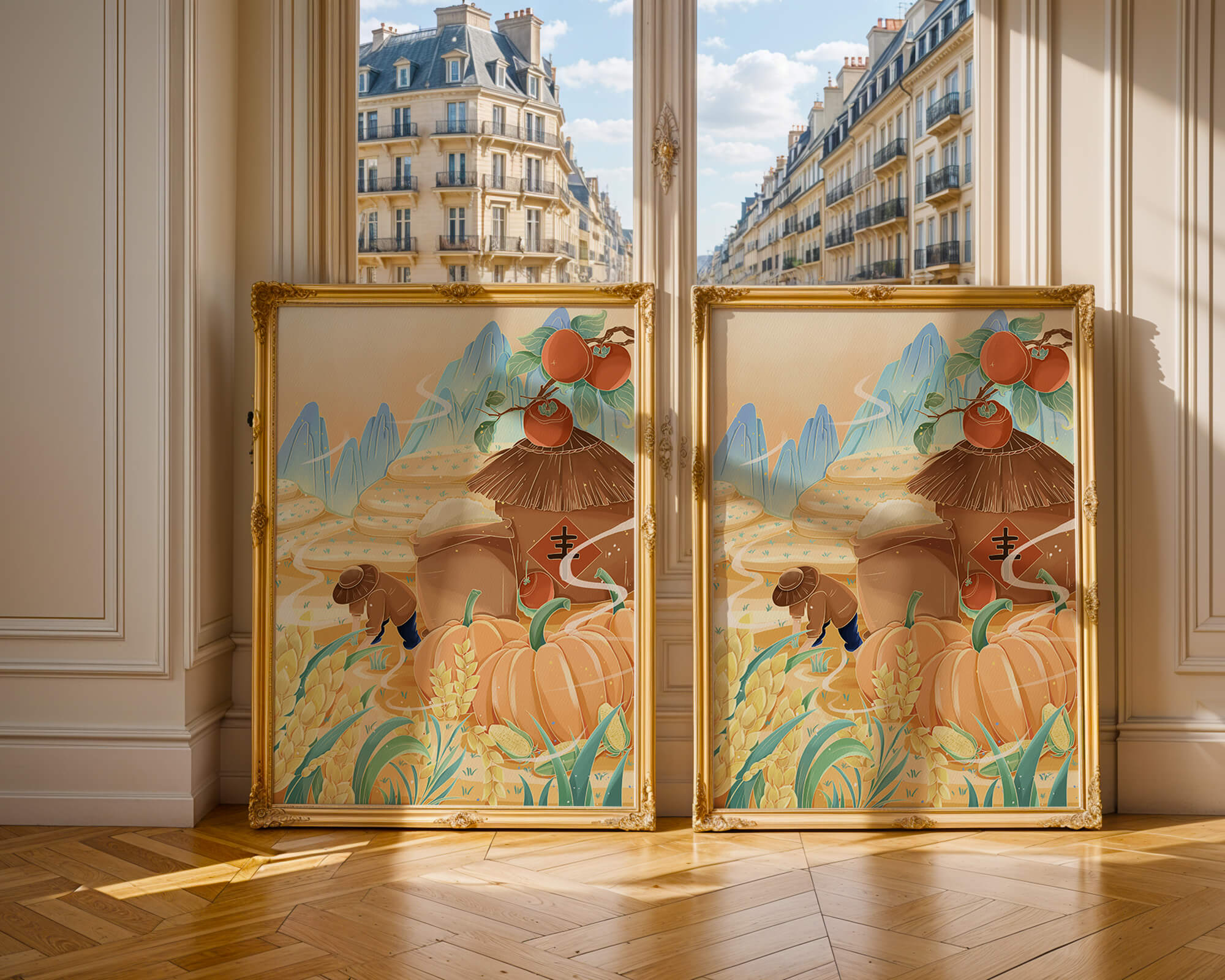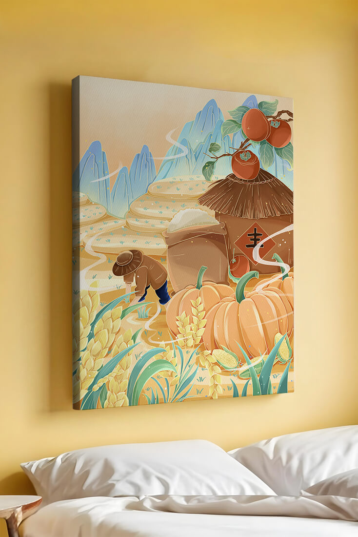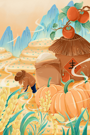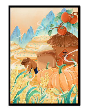 Amidst rolling hills and vibrant blue mountains, several large pumpkins adorn the landscape alongside a farmer diligently tending to golden crops. The terraced fields add depth, illustrating traditional farming techniques. This harmonious landscape highlights the simplicity of rural life, where natures bounty is at the center. Bright persimmons add a pop of color, and a thatched hut exudes warmth, embodying a vibrant scene filled with prosperity and rich harvests.| Type |