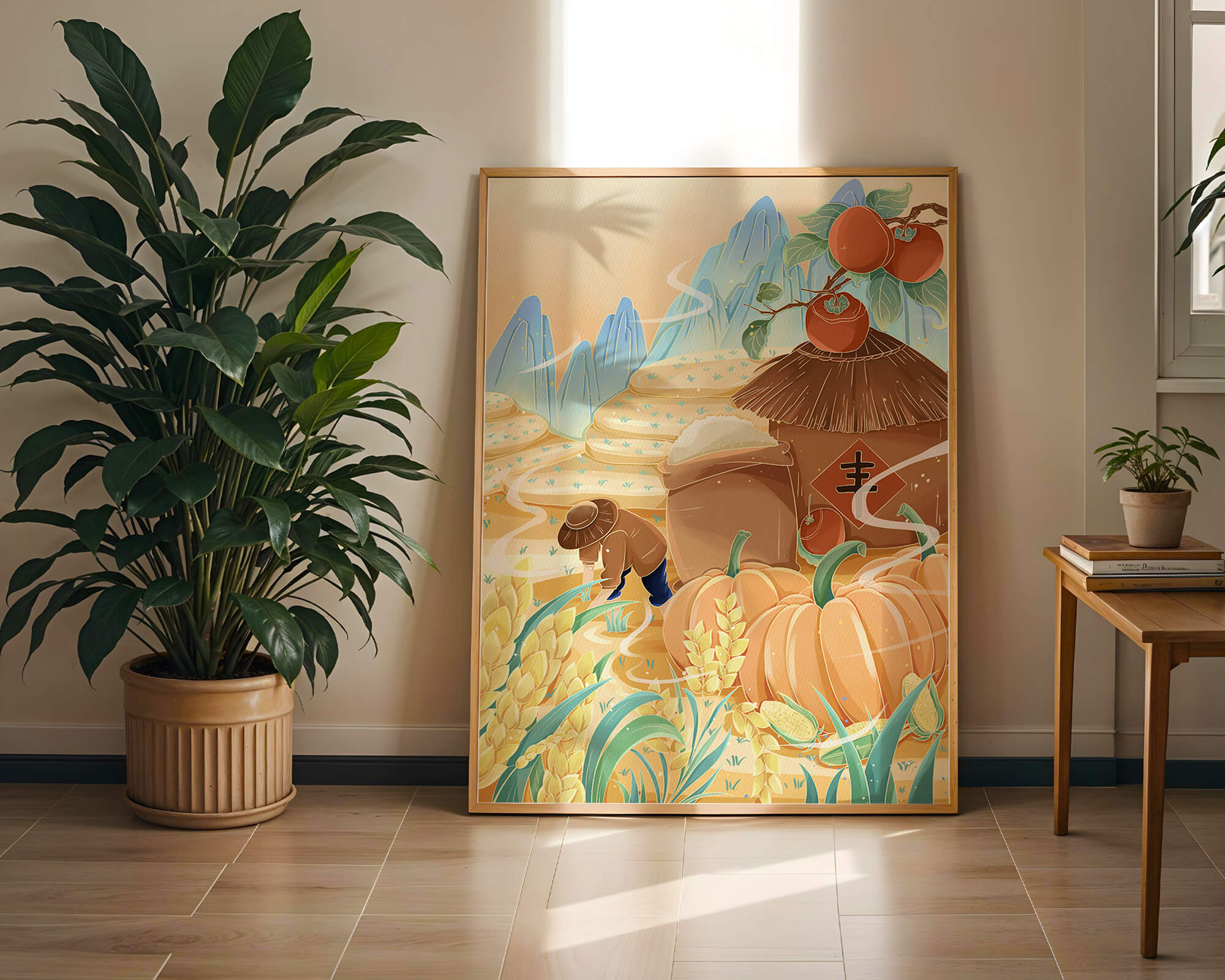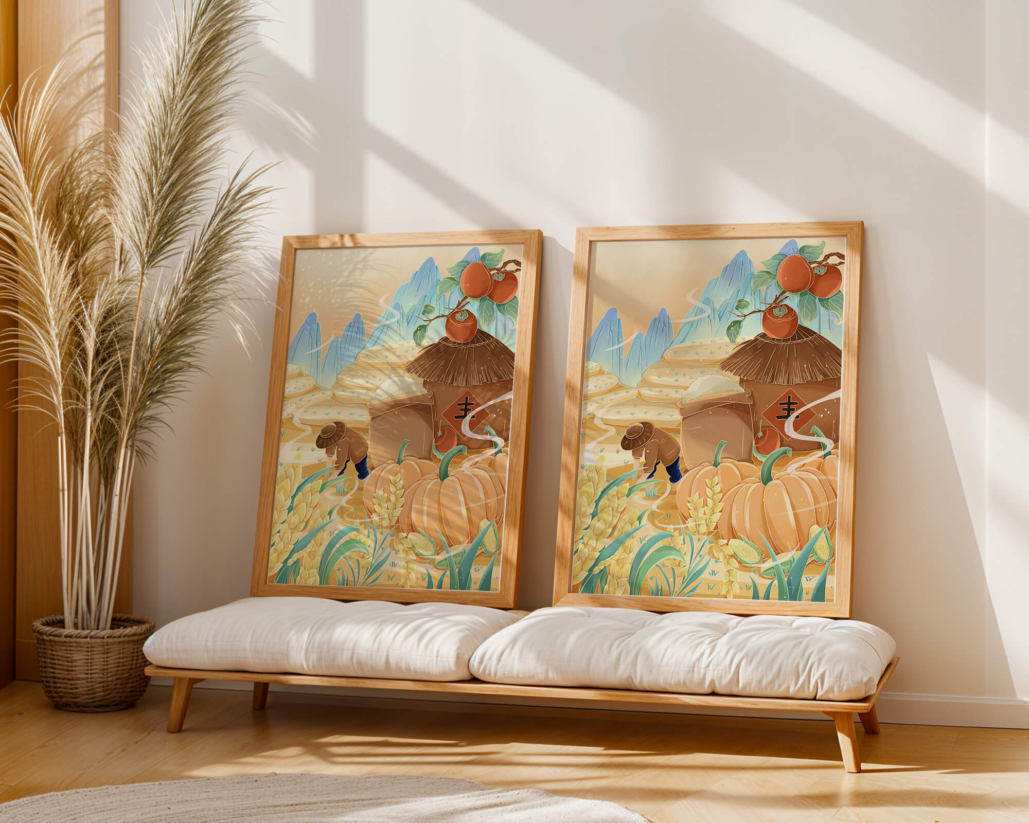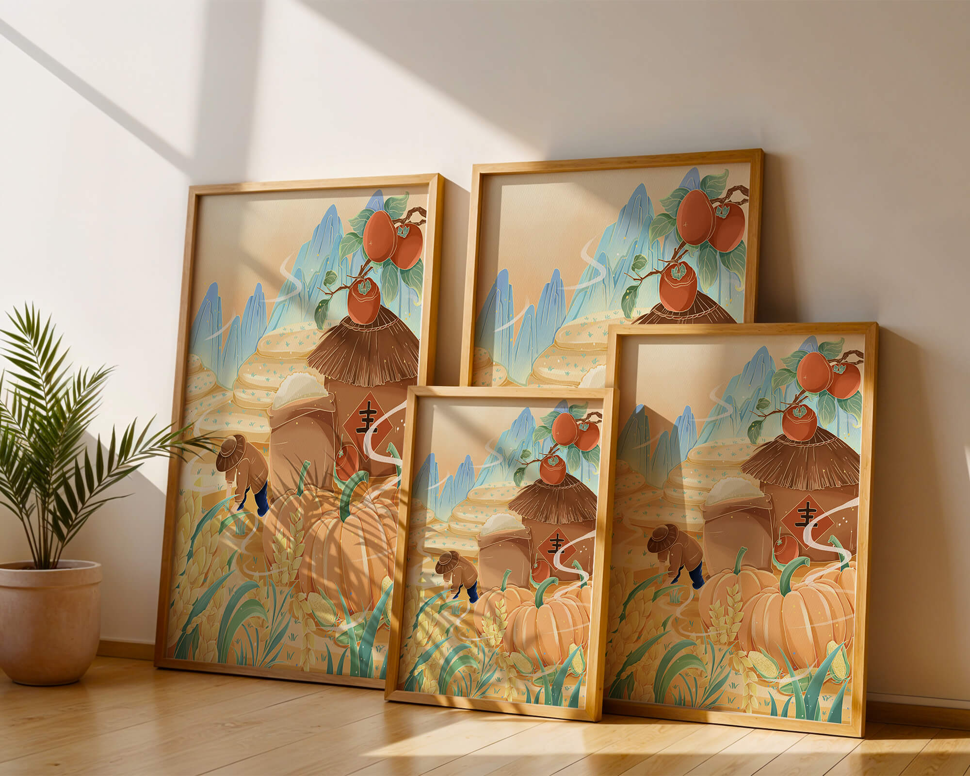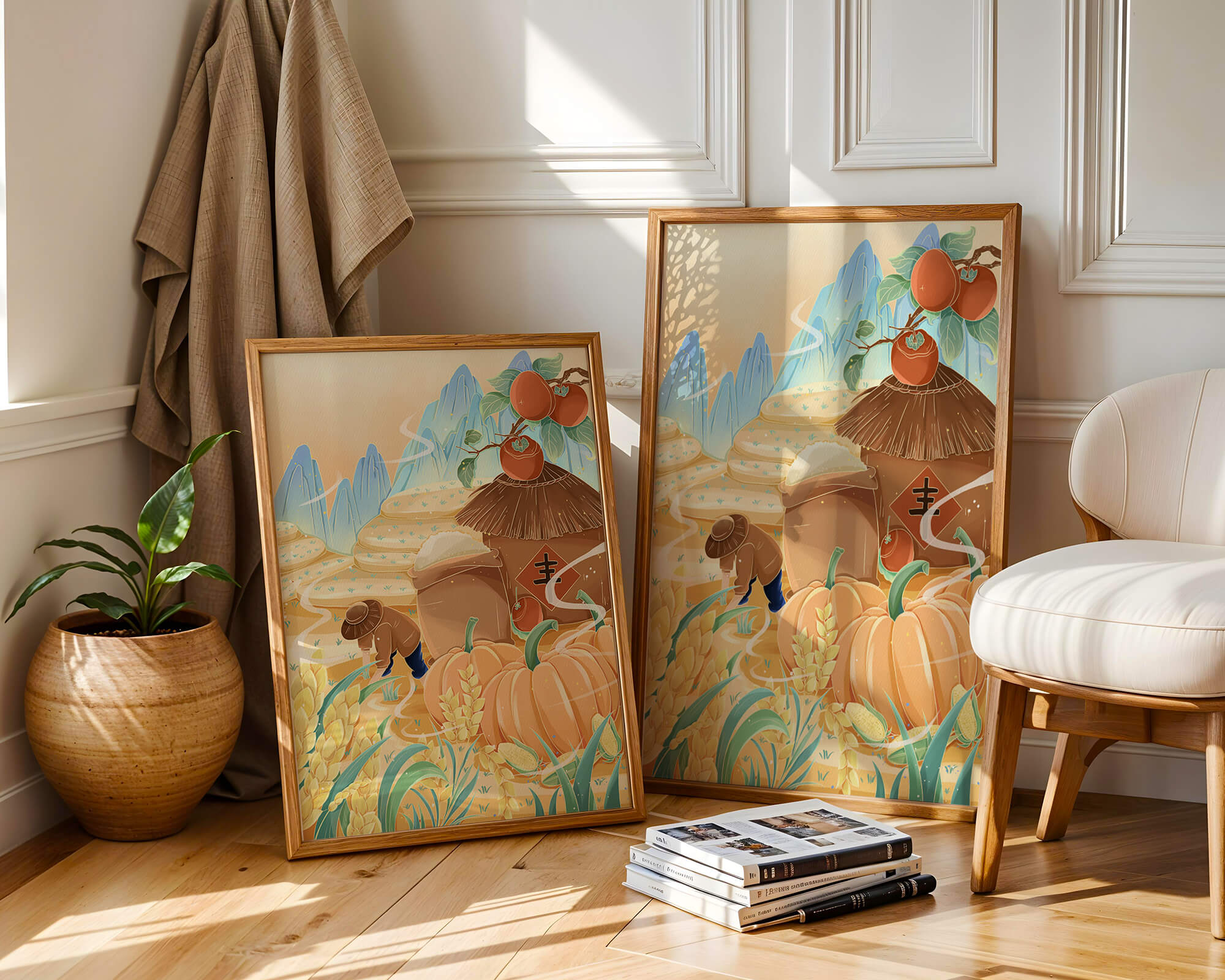 Amidst rolling hills and vibrant blue mountains, several large pumpkins adorn the landscape alongside a farmer diligently tending to golden crops. The terraced fields add depth, illustrating traditional farming techniques. This harmonious landscape highlights the simplicity of rural life, where natures bounty is at the center. Bright persimmons add a pop of color, and a thatched hut exudes warmth, embodying a vibrant scene filled with prosperity and rich harvests.| Type |