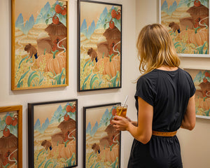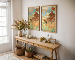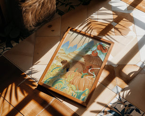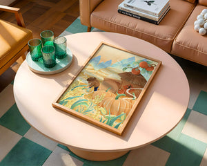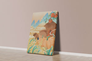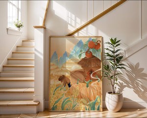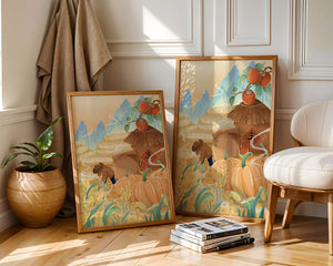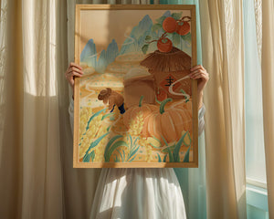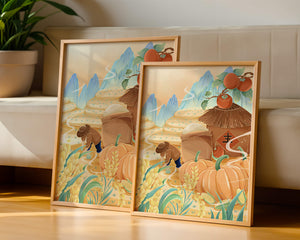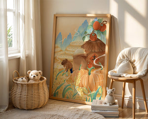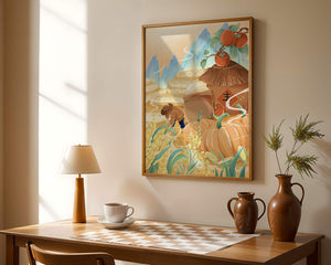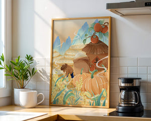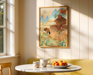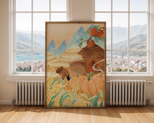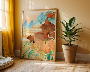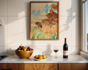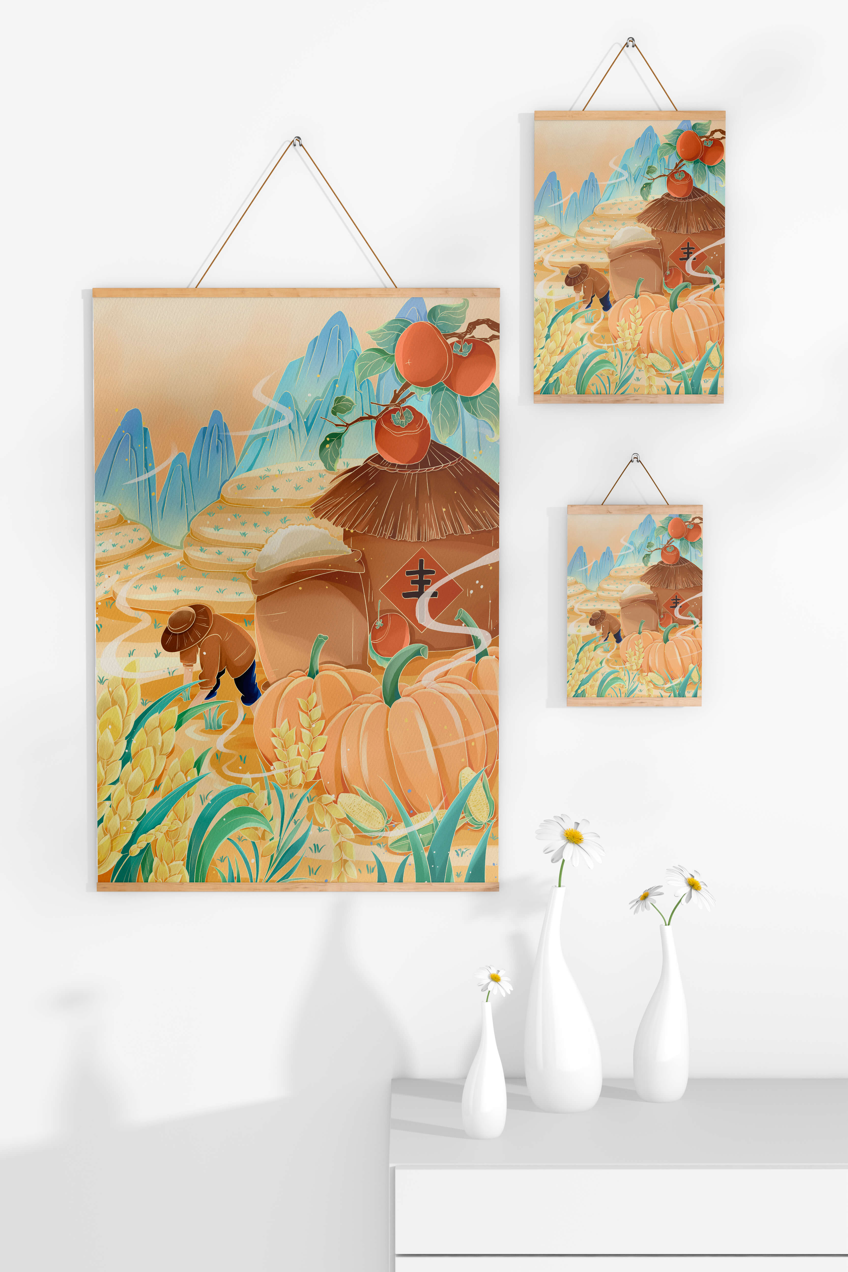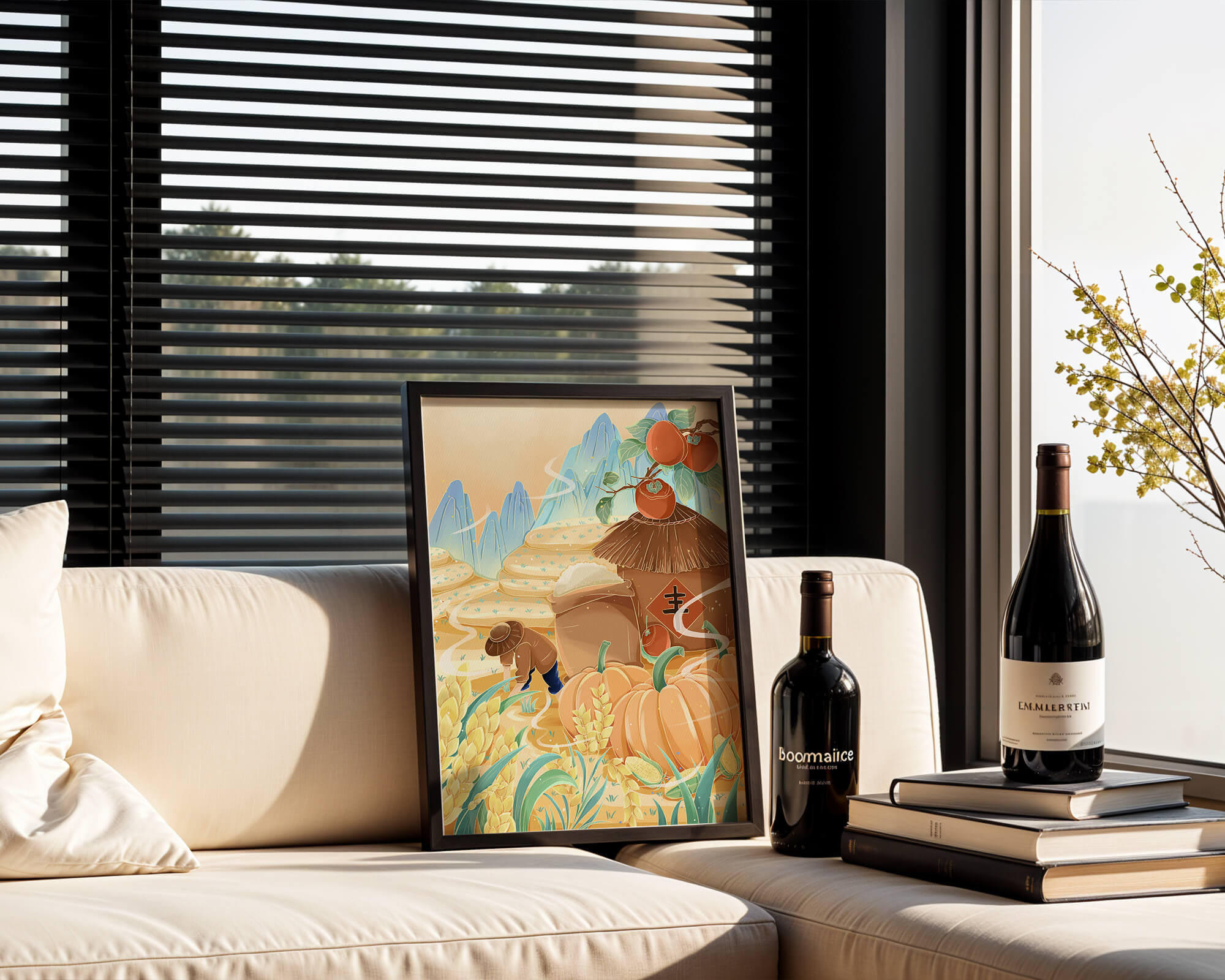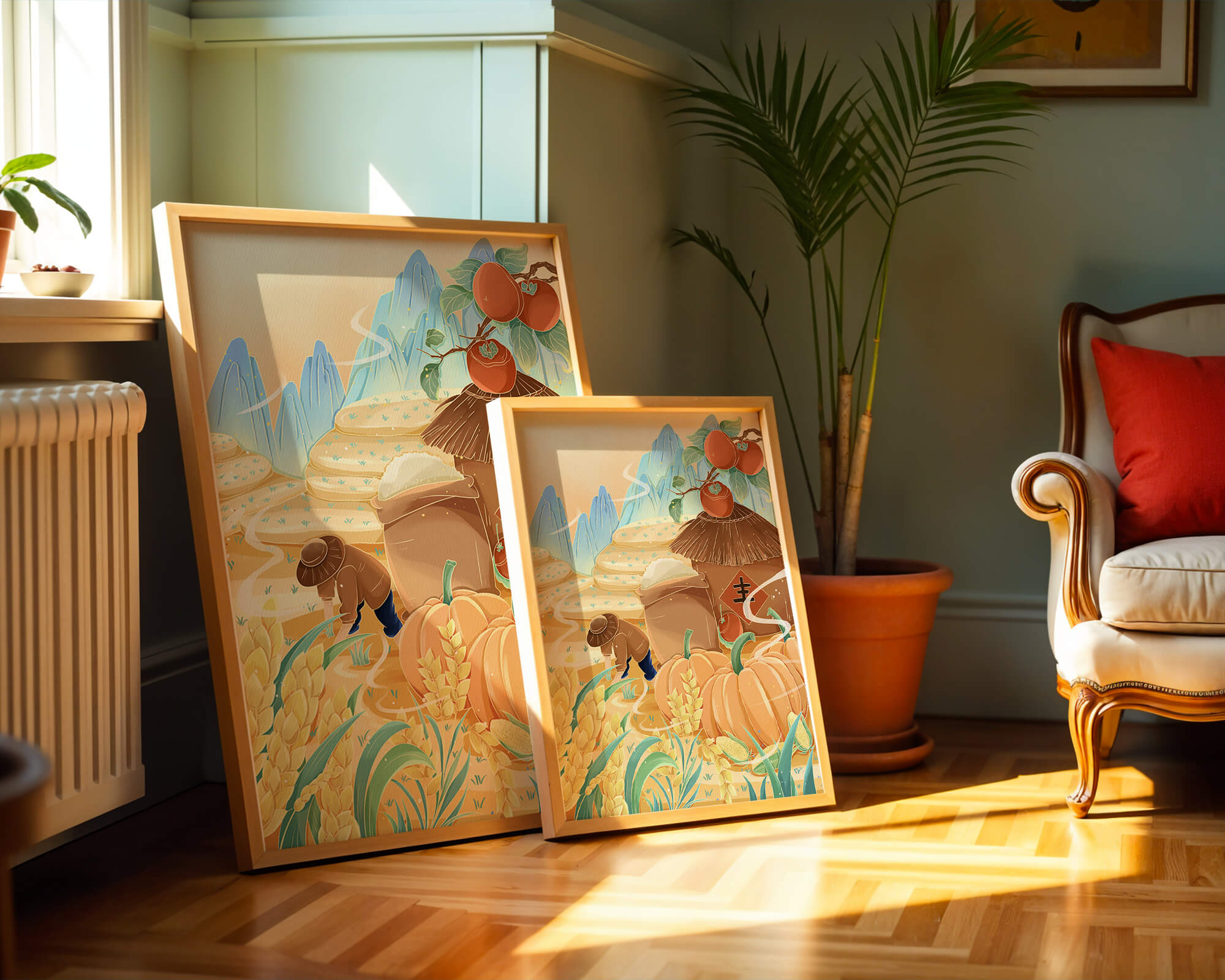 Amidst rolling hills and vibrant blue mountains, several large pumpkins adorn the landscape alongside a farmer diligently tending to golden crops. The terraced fields add depth, illustrating traditional farming techniques. This harmonious landscape highlights the simplicity of rural life, where natures bounty is at the center. Bright persimmons add a pop of color, and a thatched hut exudes warmth, embodying a vibrant scene filled with prosperity and rich harvests.| Type |