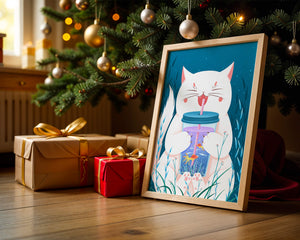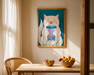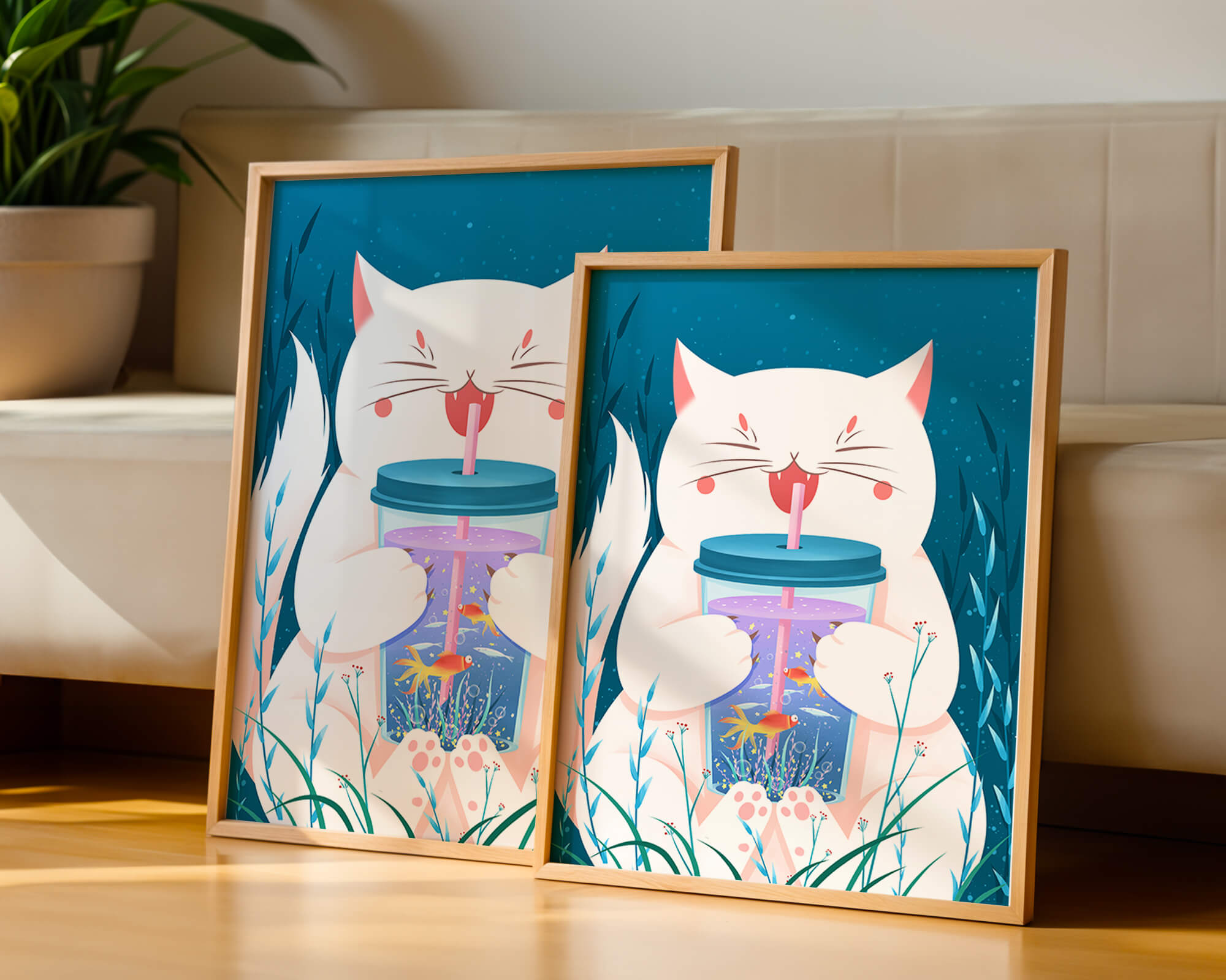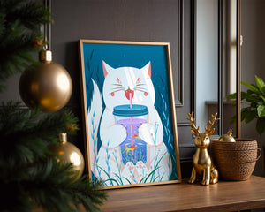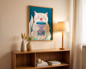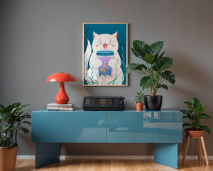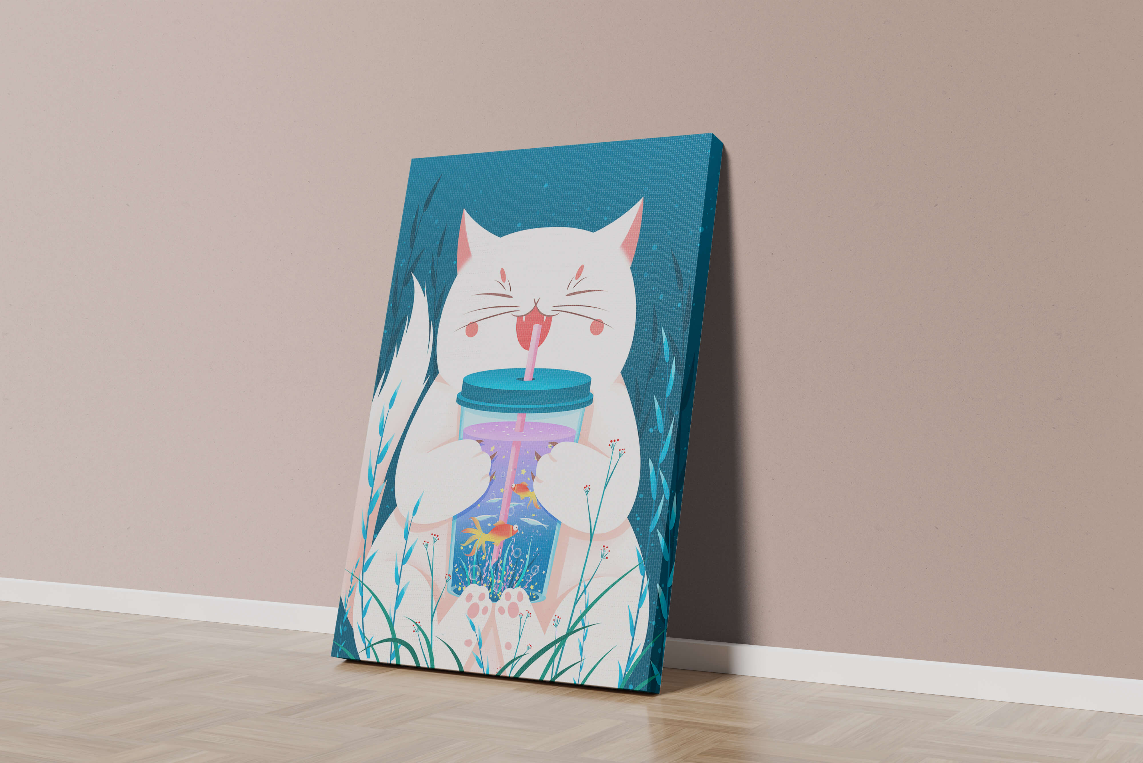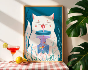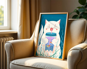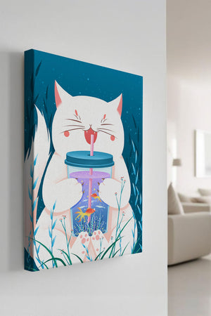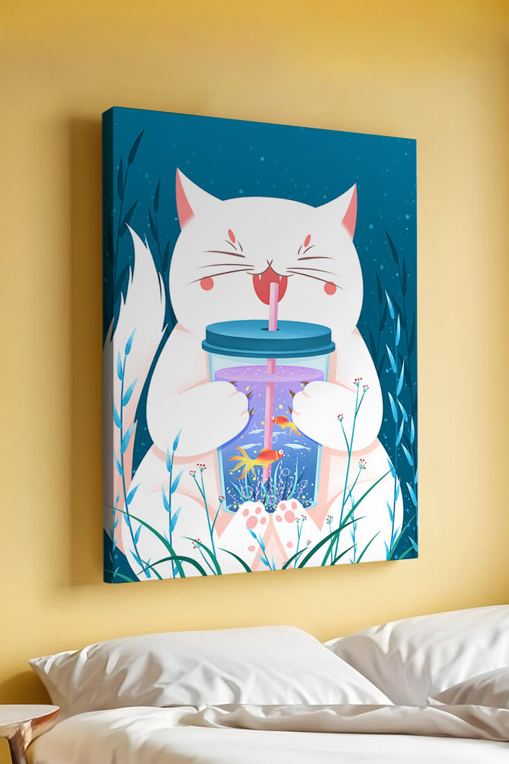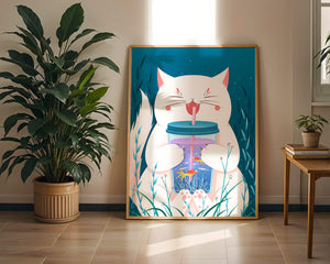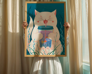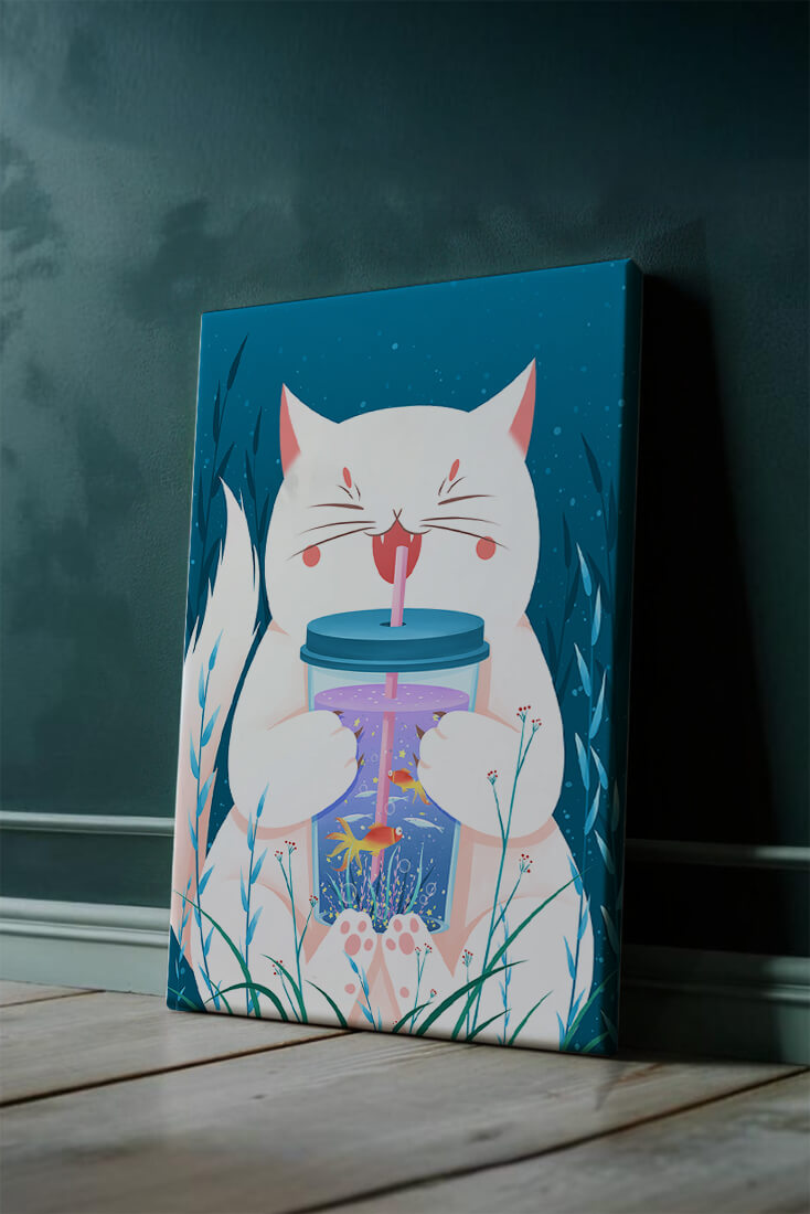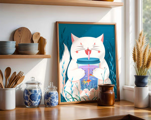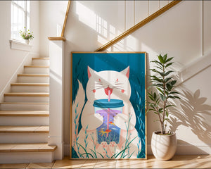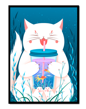 This artwork features a cheerful white cat, its eyes closed in delight, as it embraces a tumbler with a lid and straw. The tumbler itself is a miniature aquarium, complete with bright orange fish swimming amongst aquatic plants, all set against a swirling blue background that suggests an underwater universe with whimsical bubbles and playful seaweed.The combination of the cat’s expressive joy and the vibrant underwater scene brings a sense of fun and imagination, making it an ideal piece for children’s room decor or as a unique art print in any living space. The juxtaposition of the soft white fur of the cat and the rich blue hues of the aquatic environment creates a striking visual contrast, adding to the overall appeal and engaging storytelling of| Type |
