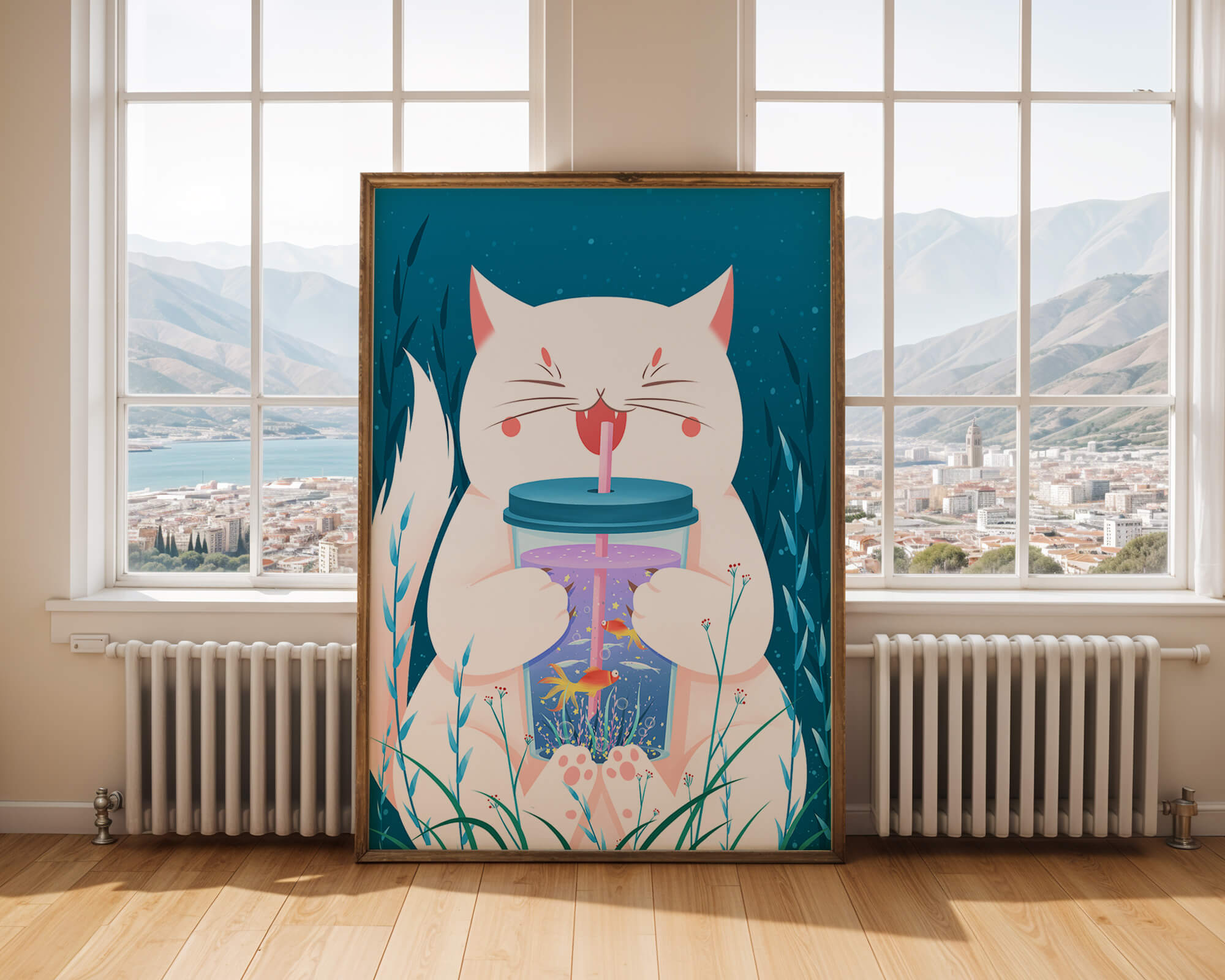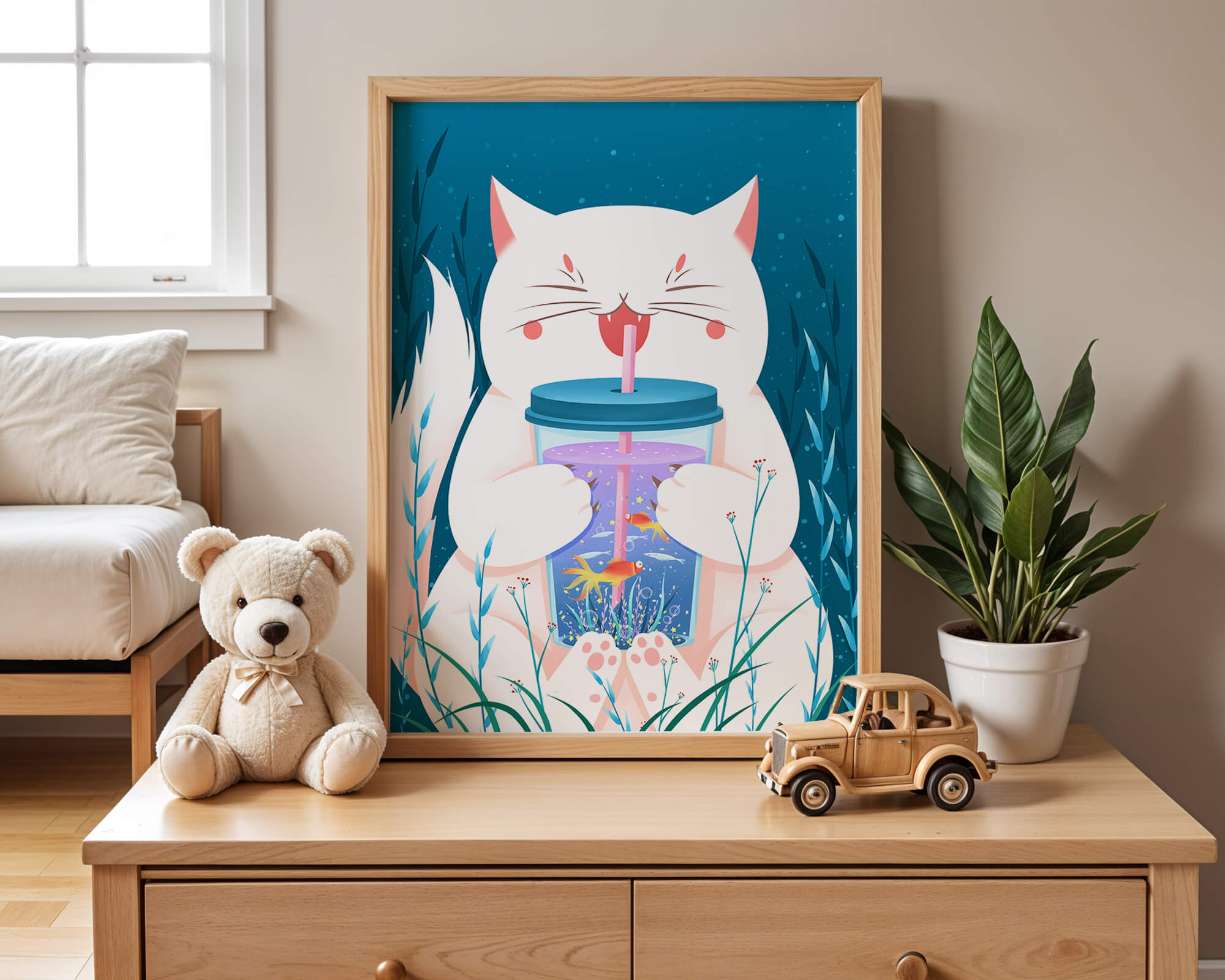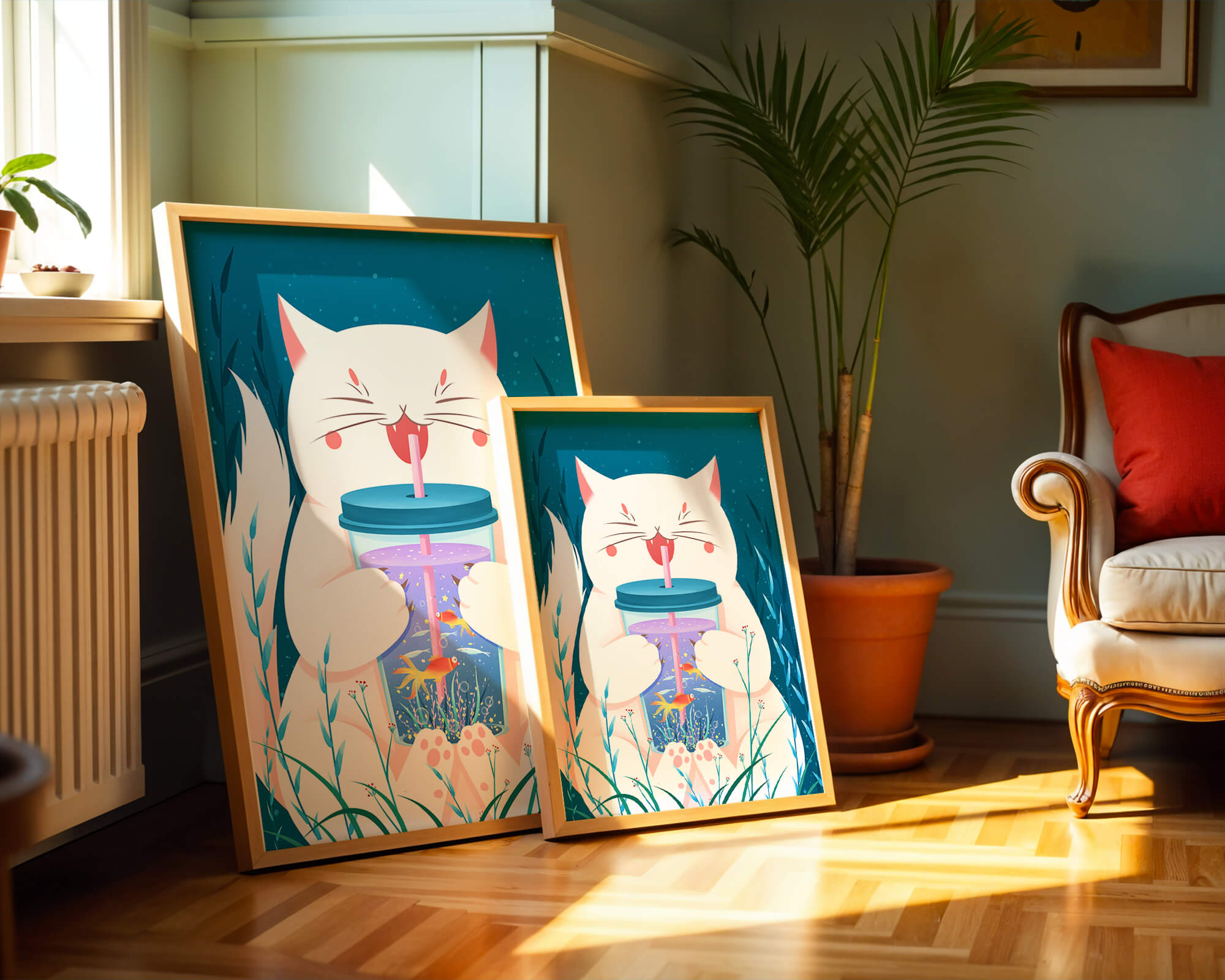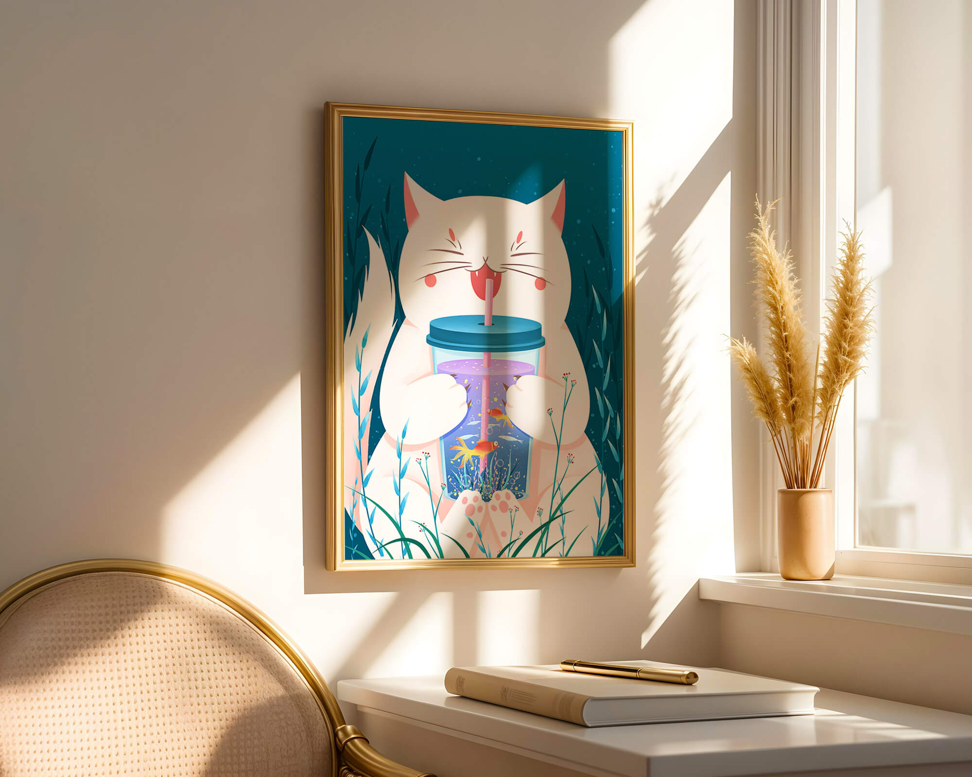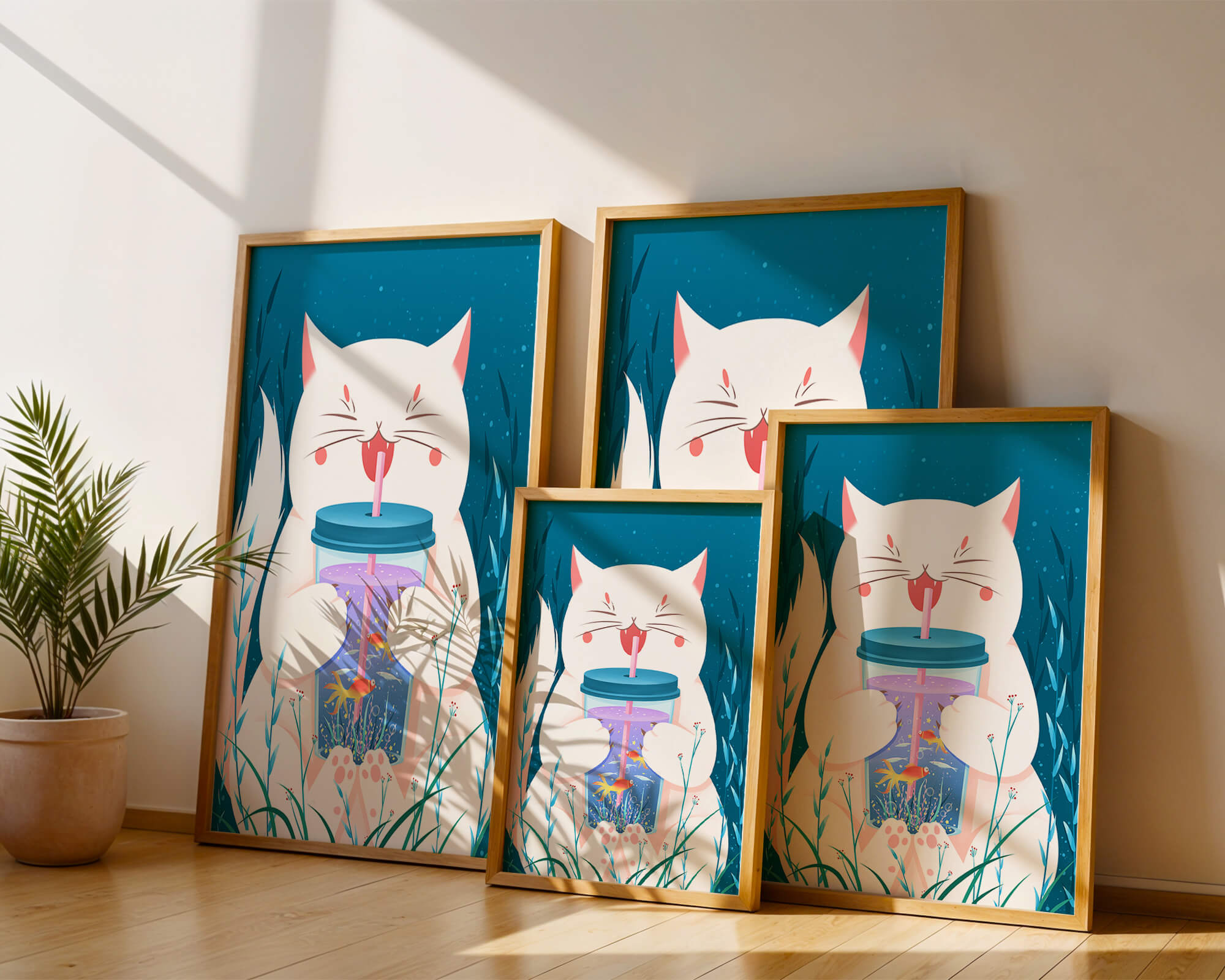 This artwork features a cheerful white cat, its eyes closed in delight, as it embraces a tumbler with a lid and straw. The tumbler itself is a miniature aquarium, complete with bright orange fish swimming amongst aquatic plants, all set against a swirling blue background that suggests an underwater universe with whimsical bubbles and playful seaweed.The combination of the cat’s expressive joy and the vibrant underwater scene brings a sense of fun and imagination, making it an ideal piece for children’s room decor or as a unique art print in any living space. The juxtaposition of the soft white fur of the cat and the rich blue hues of the aquatic environment creates a striking visual contrast, adding to the overall appeal and engaging storytelling of| Type |