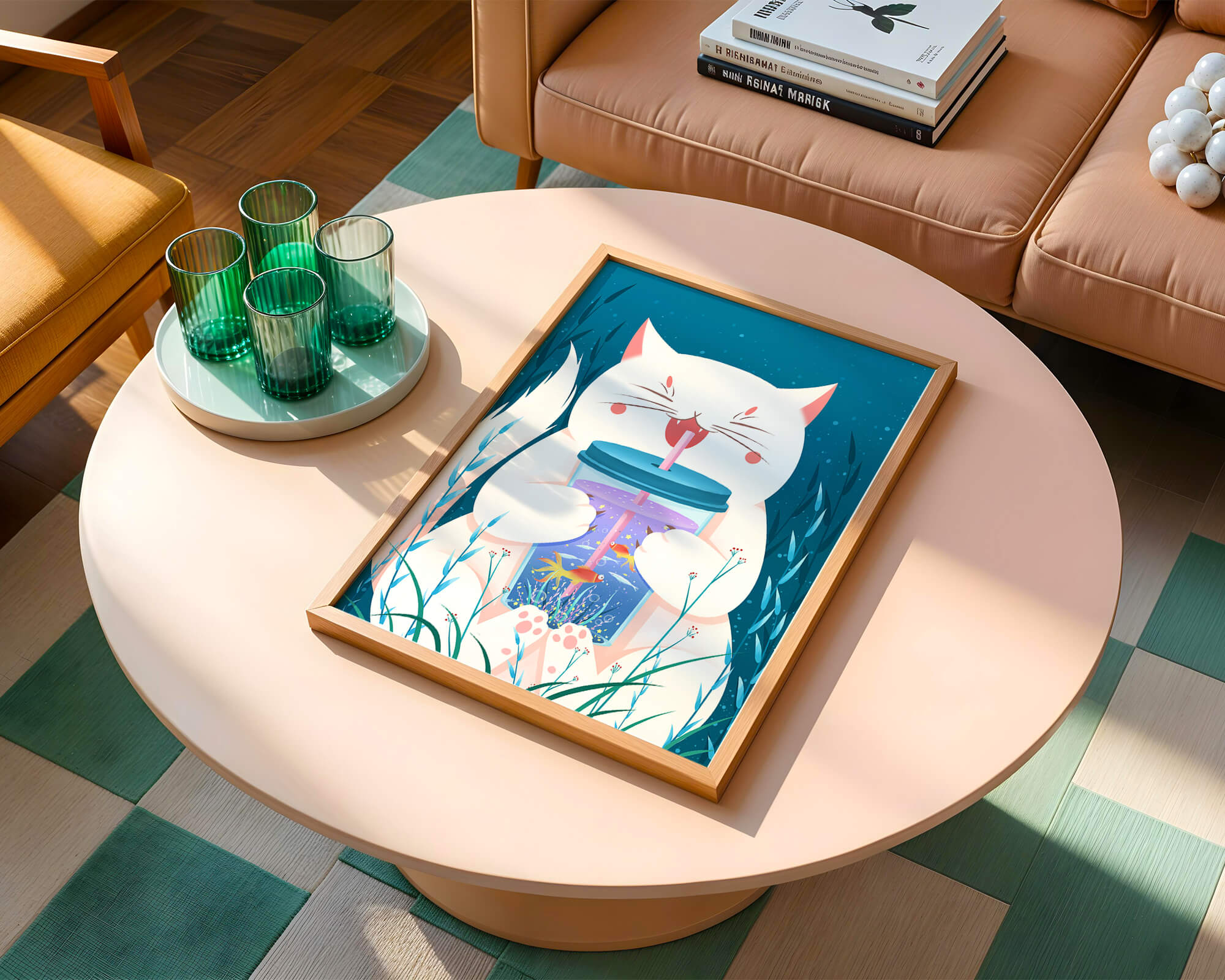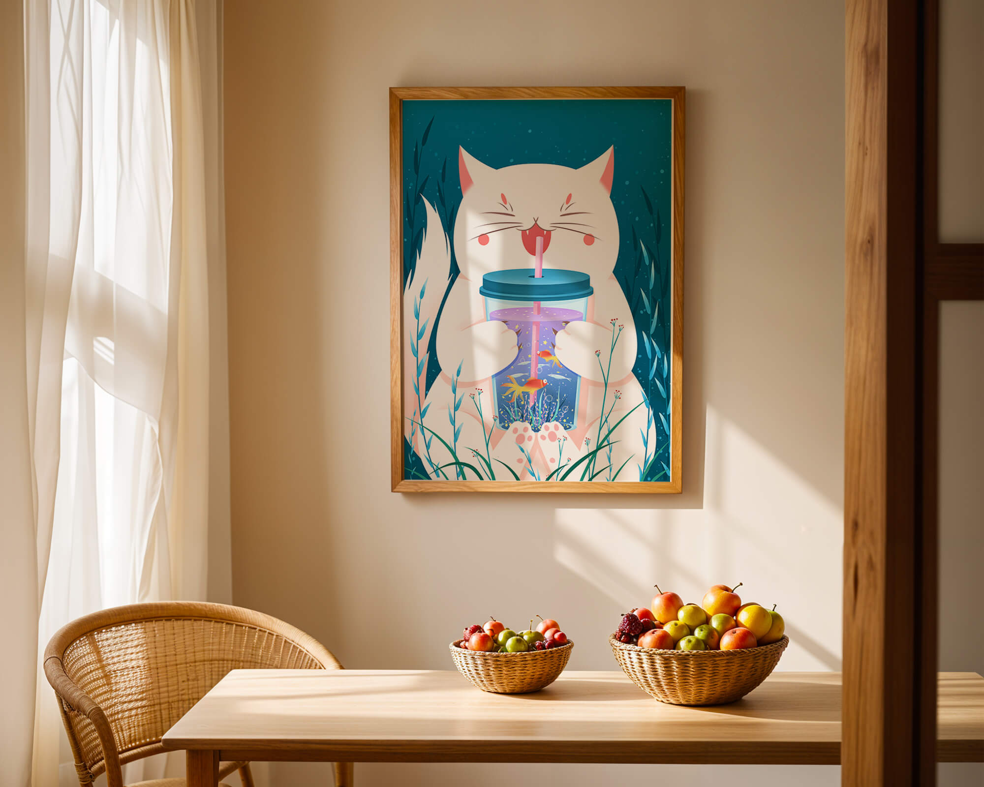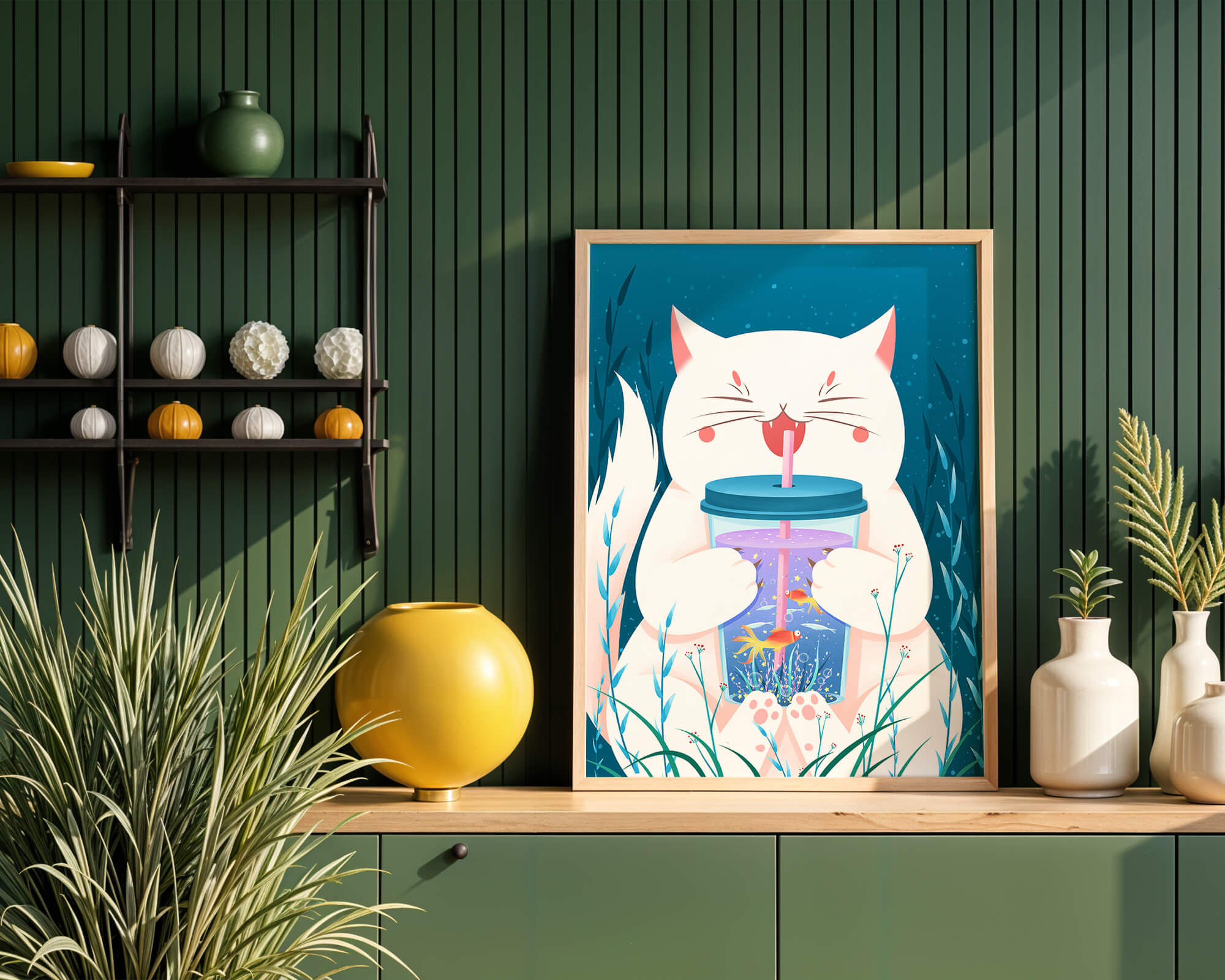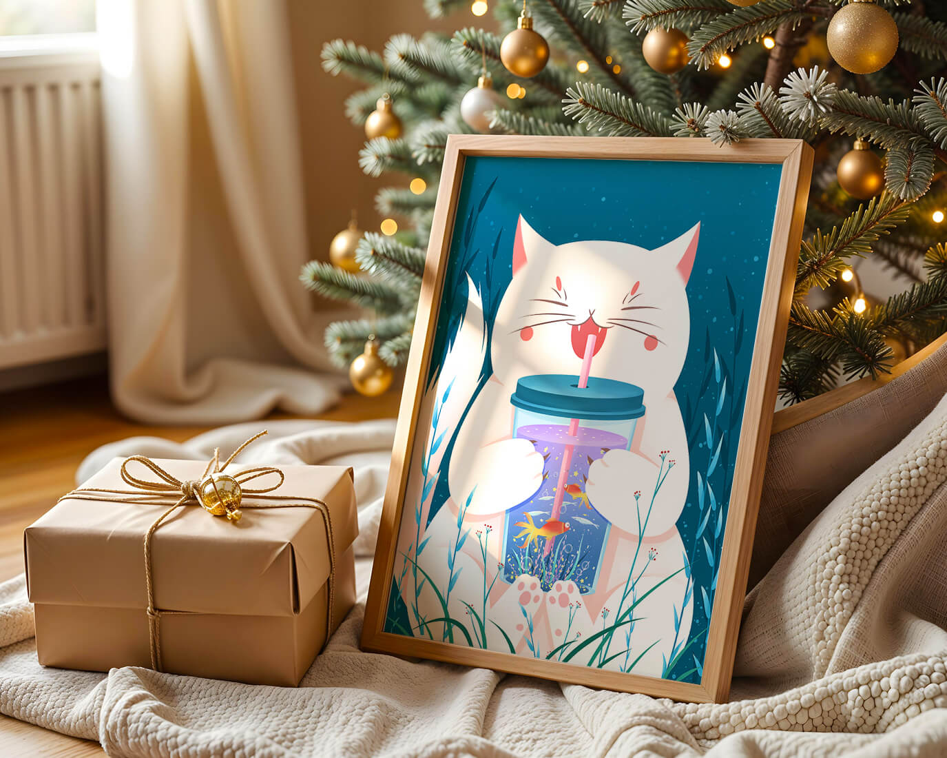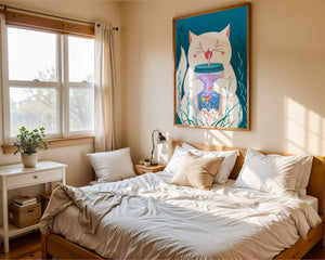 This artwork features a cheerful white cat, its eyes closed in delight, as it embraces a tumbler with a lid and straw. The tumbler itself is a miniature aquarium, complete with bright orange fish swimming amongst aquatic plants, all set against a swirling blue background that suggests an underwater universe with whimsical bubbles and playful seaweed.The combination of the cat’s expressive joy and the vibrant underwater scene brings a sense of fun and imagination, making it an ideal piece for children’s room decor or as a unique art print in any living space. The juxtaposition of the soft white fur of the cat and the rich blue hues of the aquatic environment creates a striking visual contrast, adding to the overall appeal and engaging storytelling of| Type |