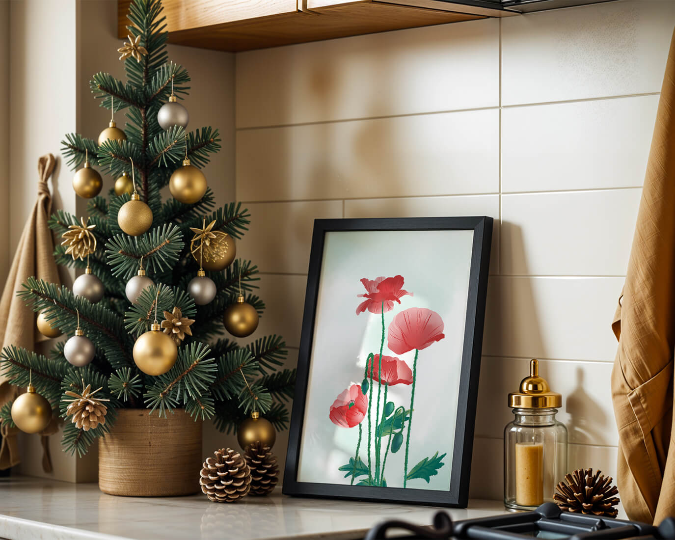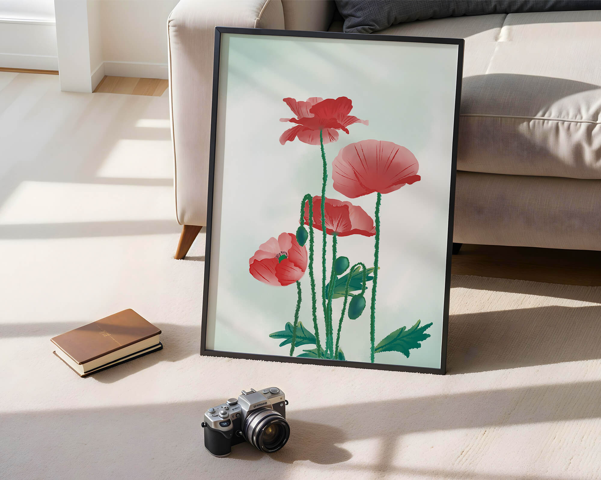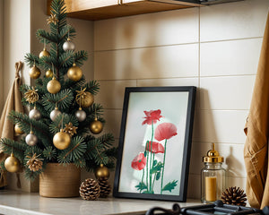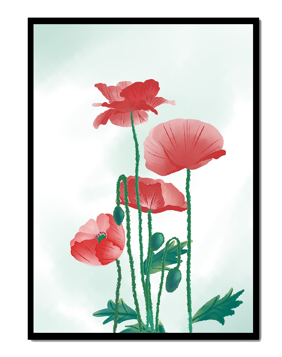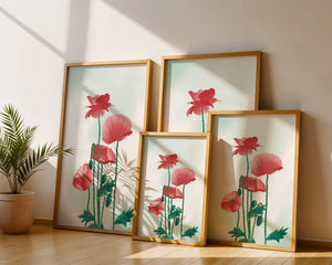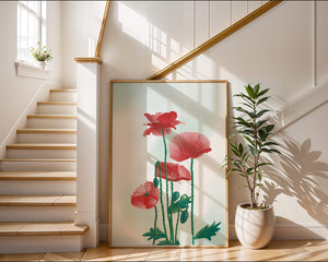 The artwork features elegant red poppies with long green stems and delicate leaves set against a soft background.