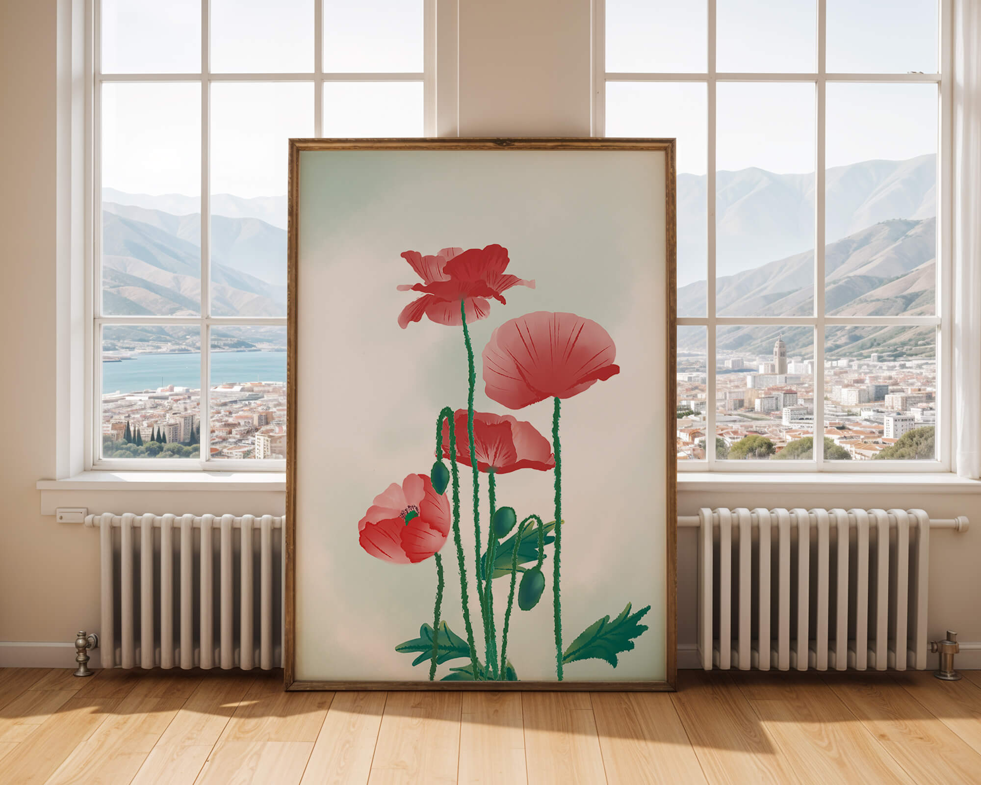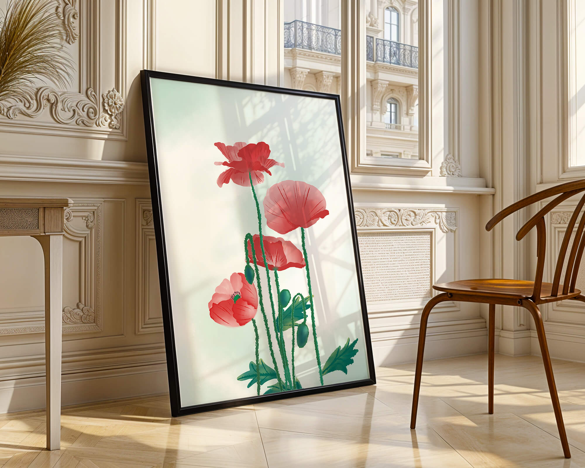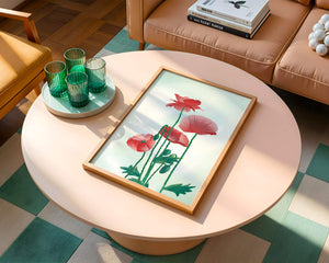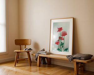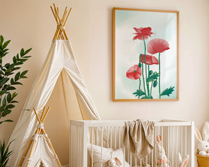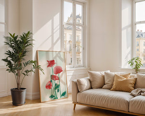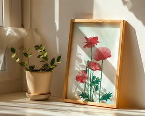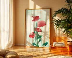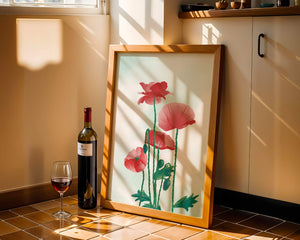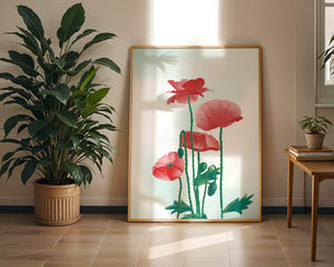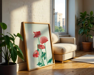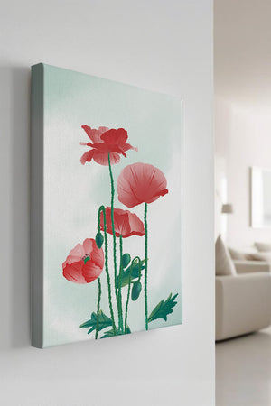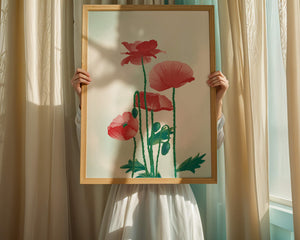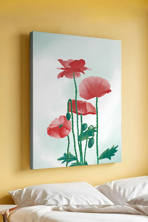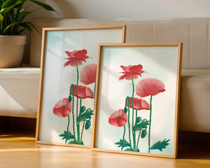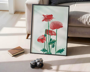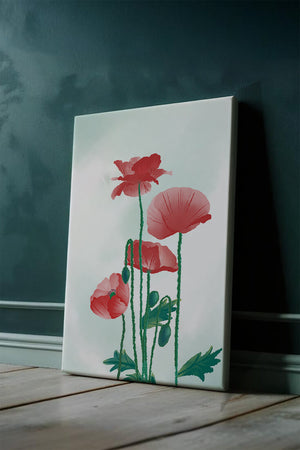 In this captivating illustration, red poppies rise gracefully with their vibrant petals and lush stems. The minimalist design emphasizes the natural beauty and elegance of the flowers. Their bold red color stands out against a subtle, calming backdrop, creating a harmonious and balanced visual.The artworks emphasis on simplicity and natural elements makes it a distinguished piece of art. The delicate colors and form celebrate the timeless beauty of nature, making it a perfect addition to any space that values tranquility and artistic flair.