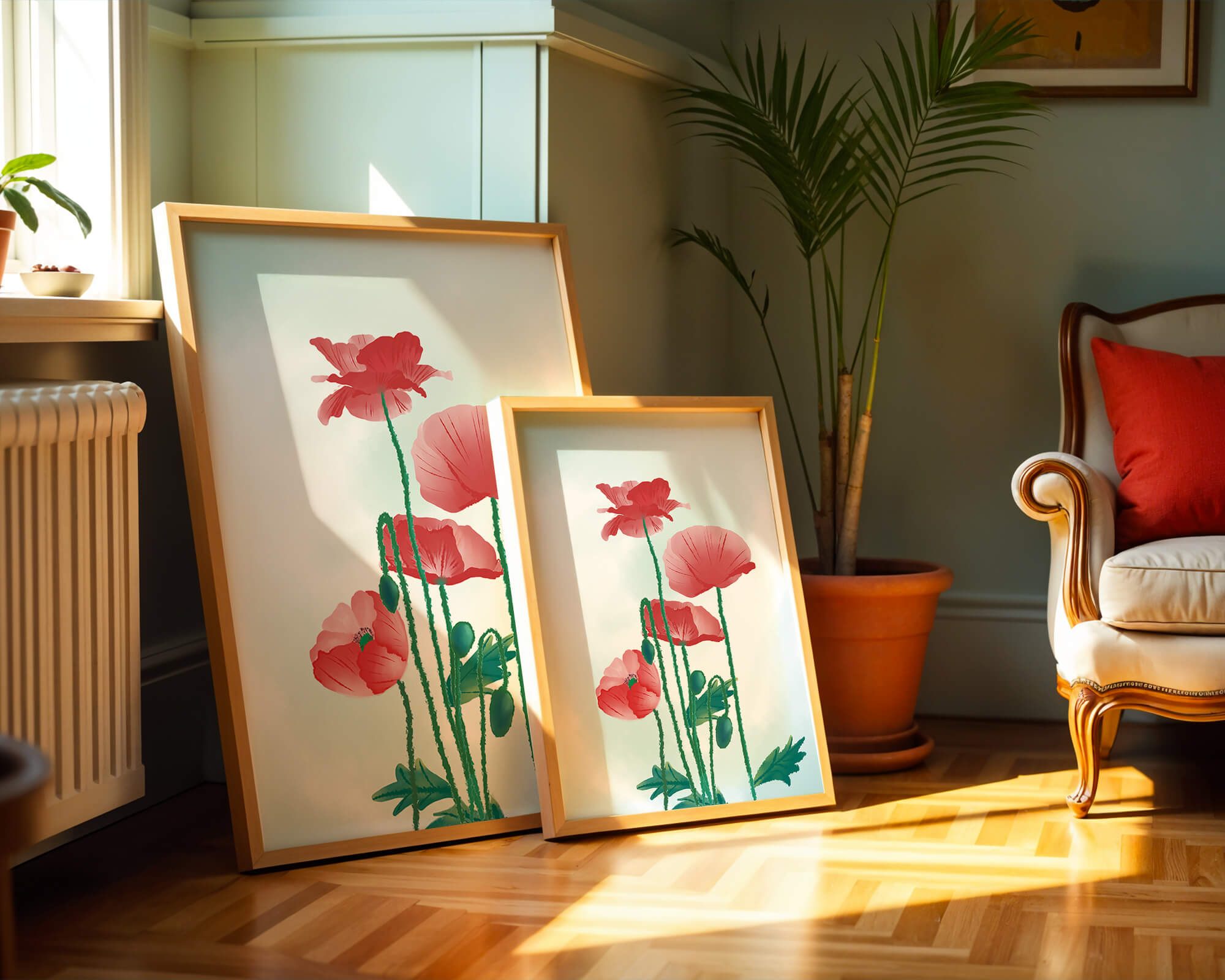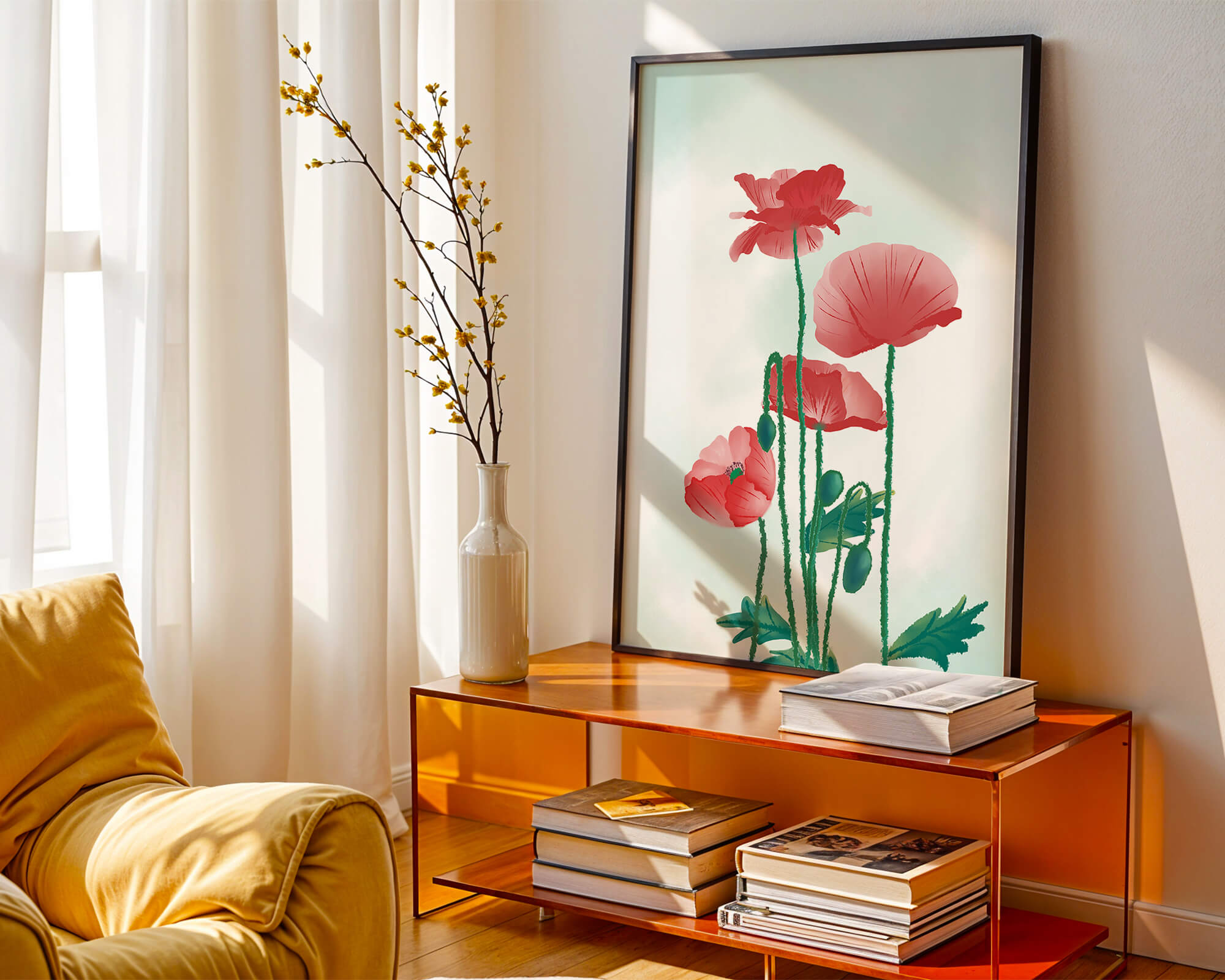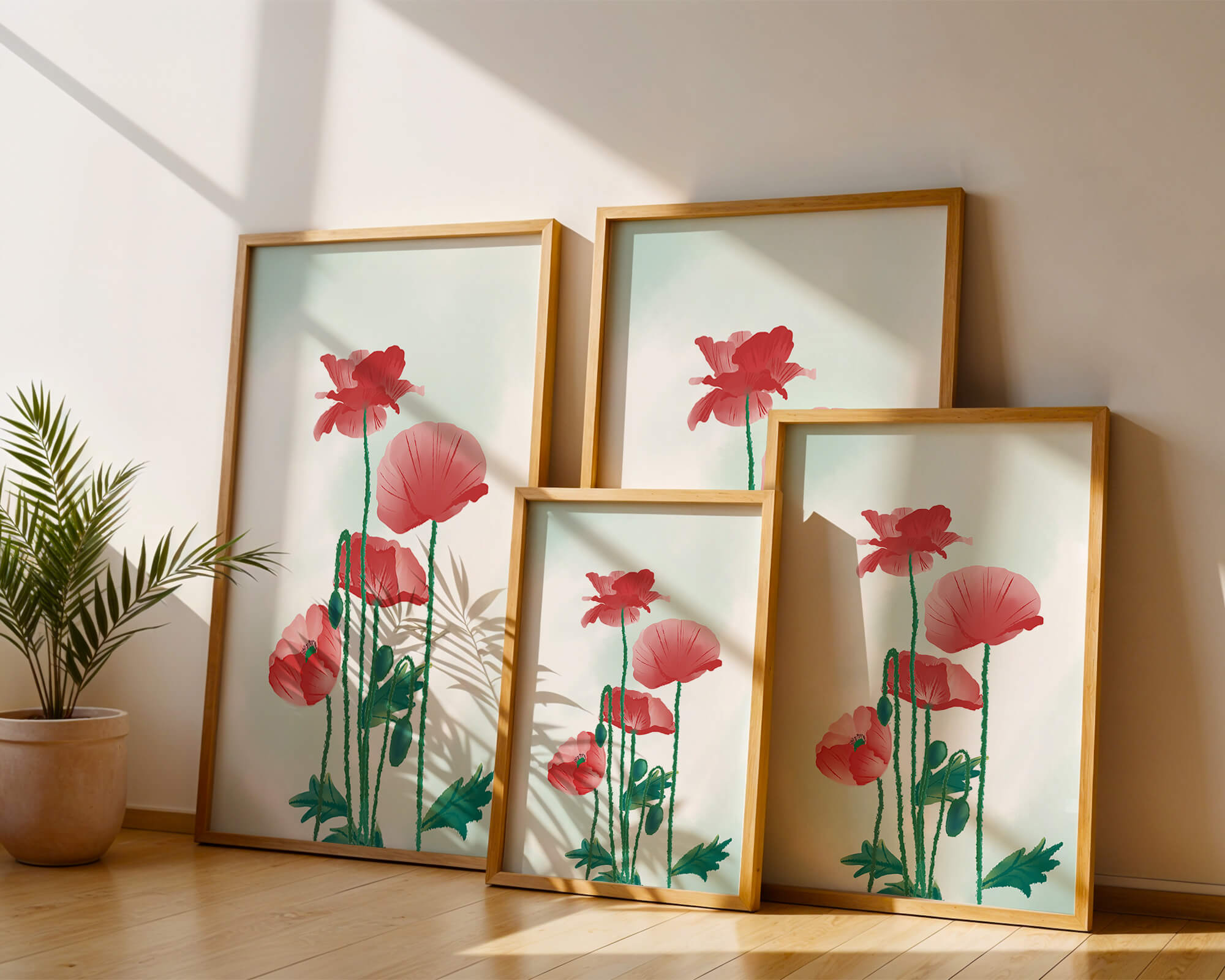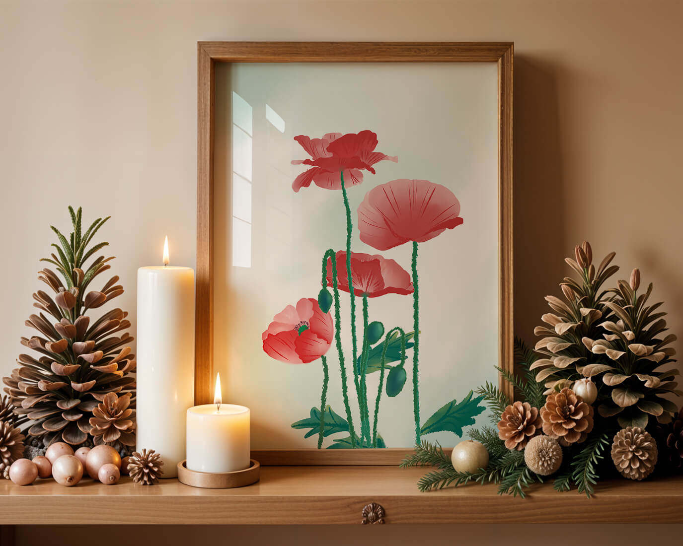 In this captivating illustration, red poppies rise gracefully with their vibrant petals and lush stems. The minimalist design emphasizes the natural beauty and elegance of the flowers. Their bold red color stands out against a subtle, calming backdrop, creating a harmonious and balanced visual.The artworks emphasis on simplicity and natural elements makes it a distinguished piece of art. The delicate colors and form celebrate the timeless beauty of nature, making it a perfect addition to any space that values tranquility and artistic flair.