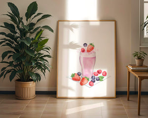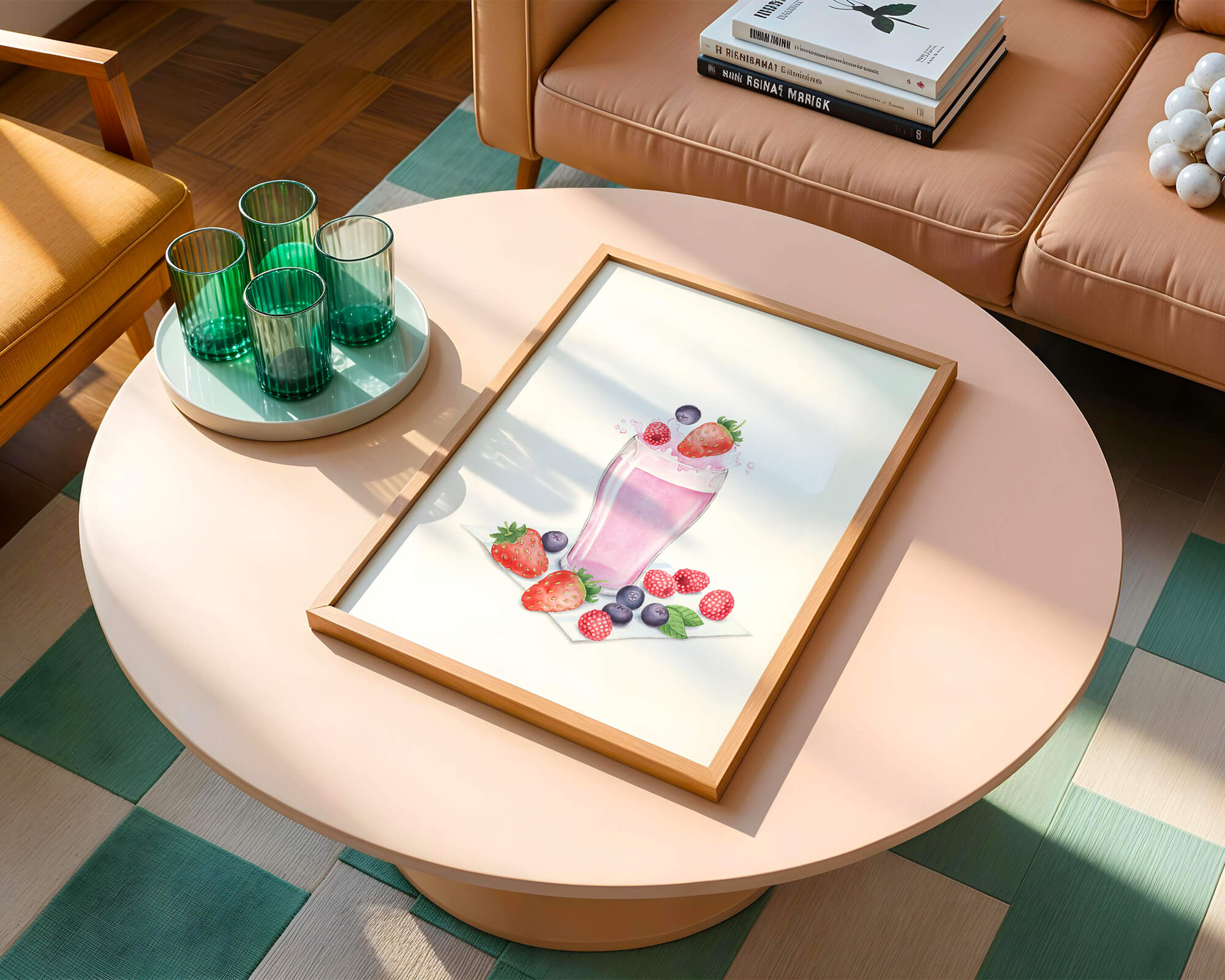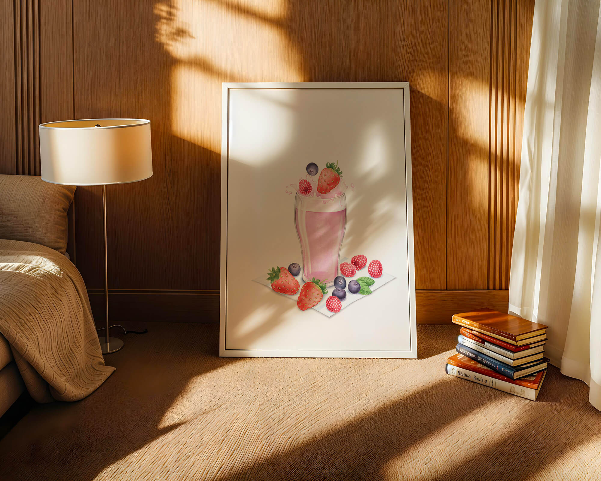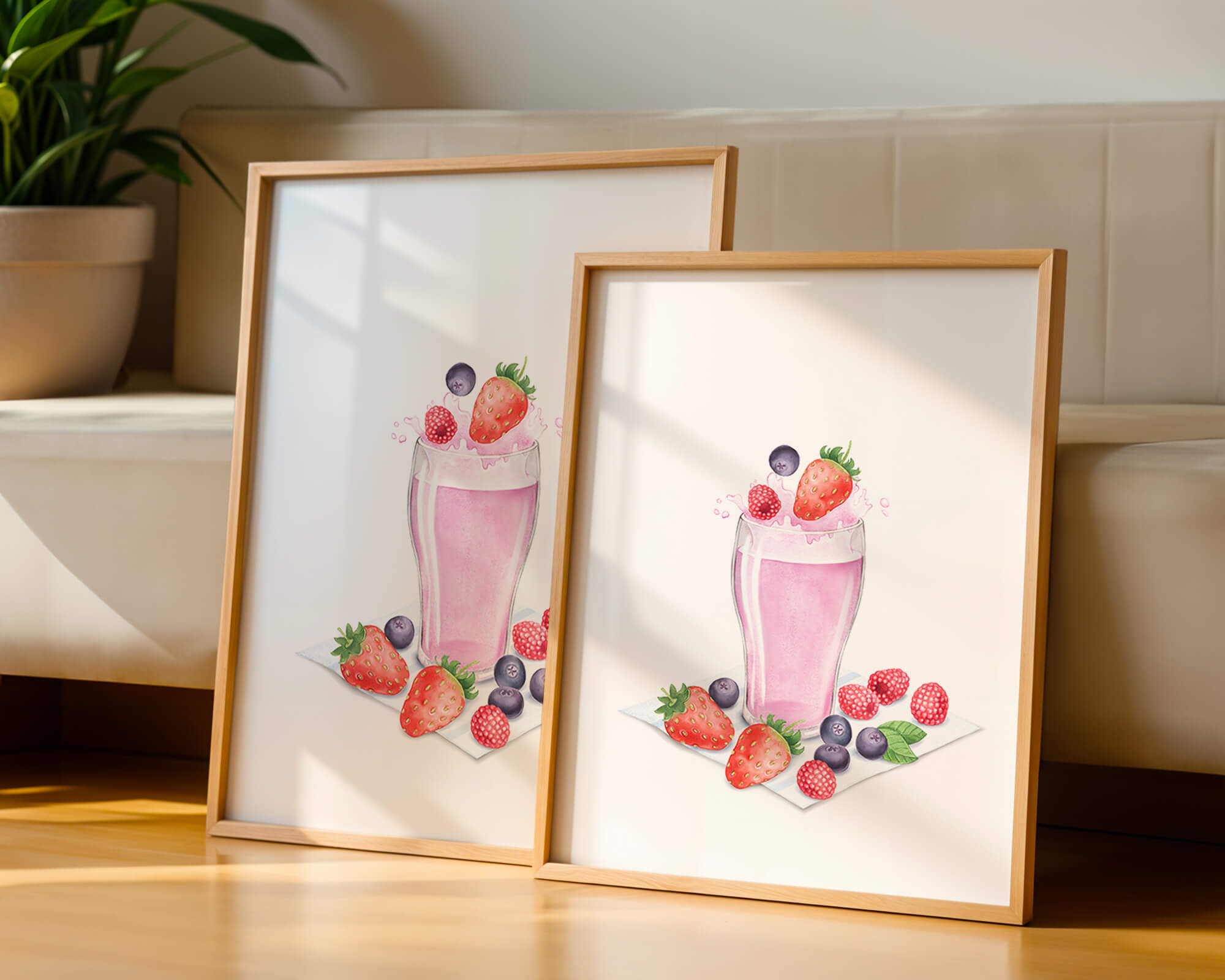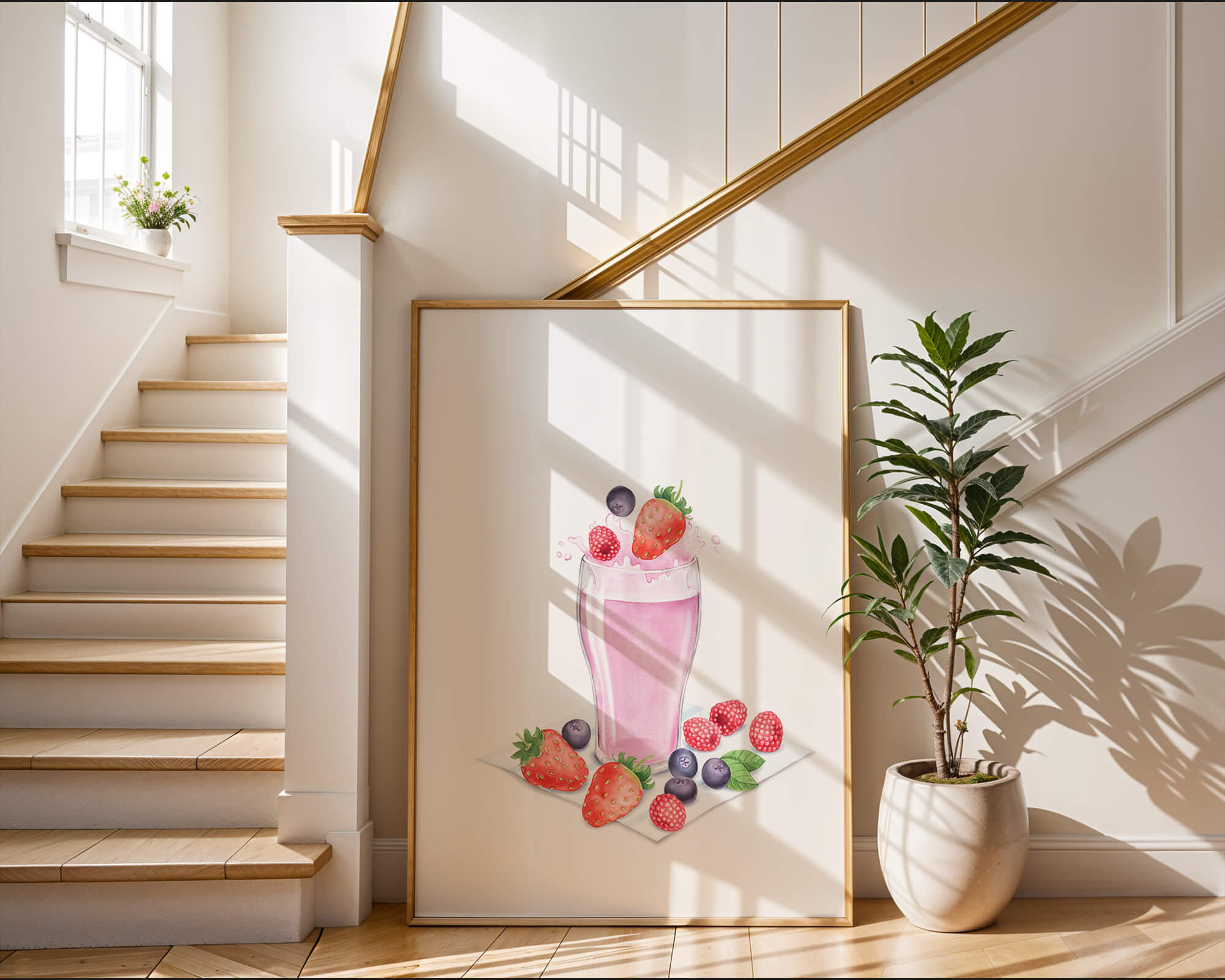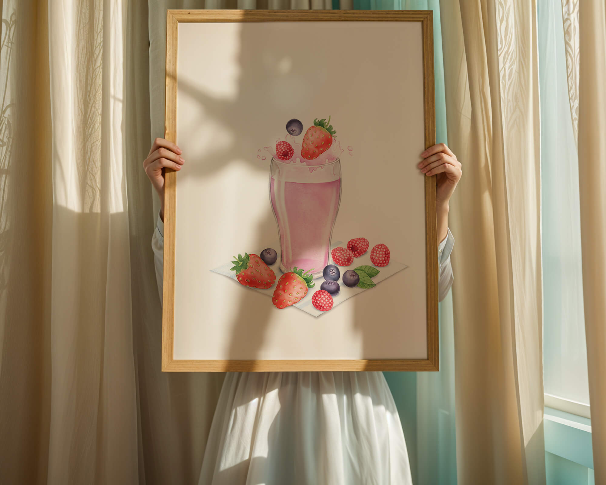 The image captures a tantalizing glass of pink smoothie, overflowing with the goodness of ripe strawberries and blueberries. The smooth, creamy texture invites indulgence, while the splash of colors energizes the viewer, making it a perfect fit for kitchens and dining spaces.Set upon a simple napkin, the combination of fresh berries around the glass hints at a nutritious and delicious treat. This visual delight not only appeals to the taste buds but also inspires a healthy lifestyle. Ideal for art lovers and food enthusiasts alike, this image brings a touch of summer into any home setting.| Type |
