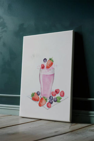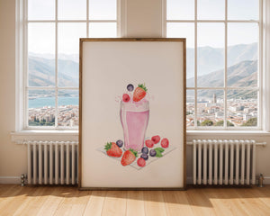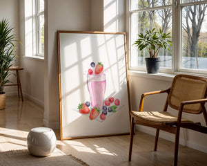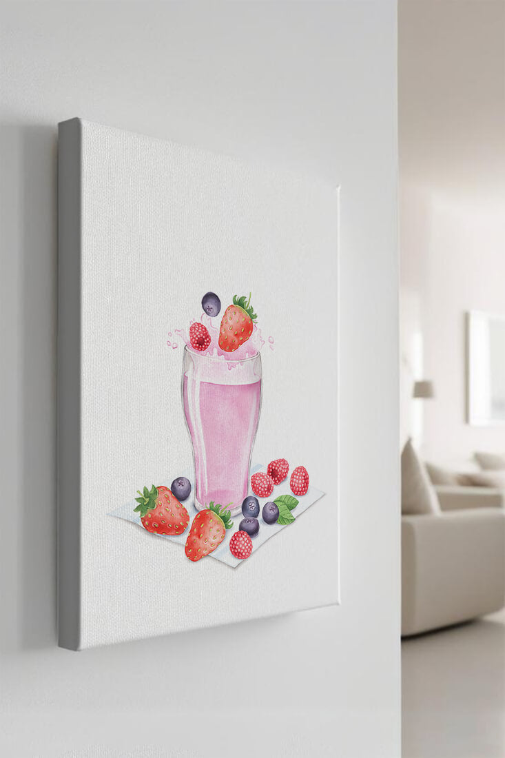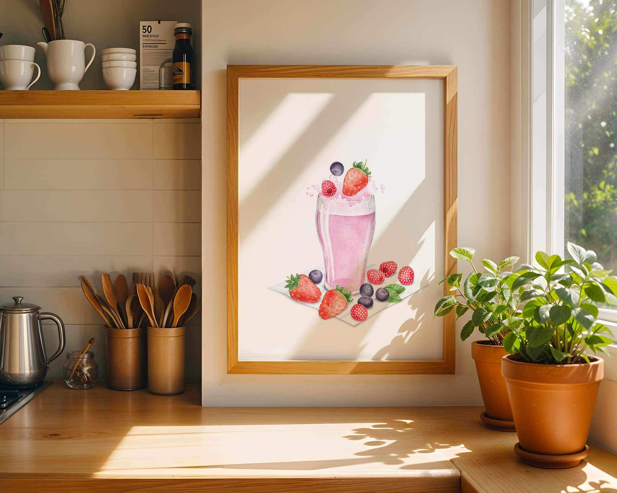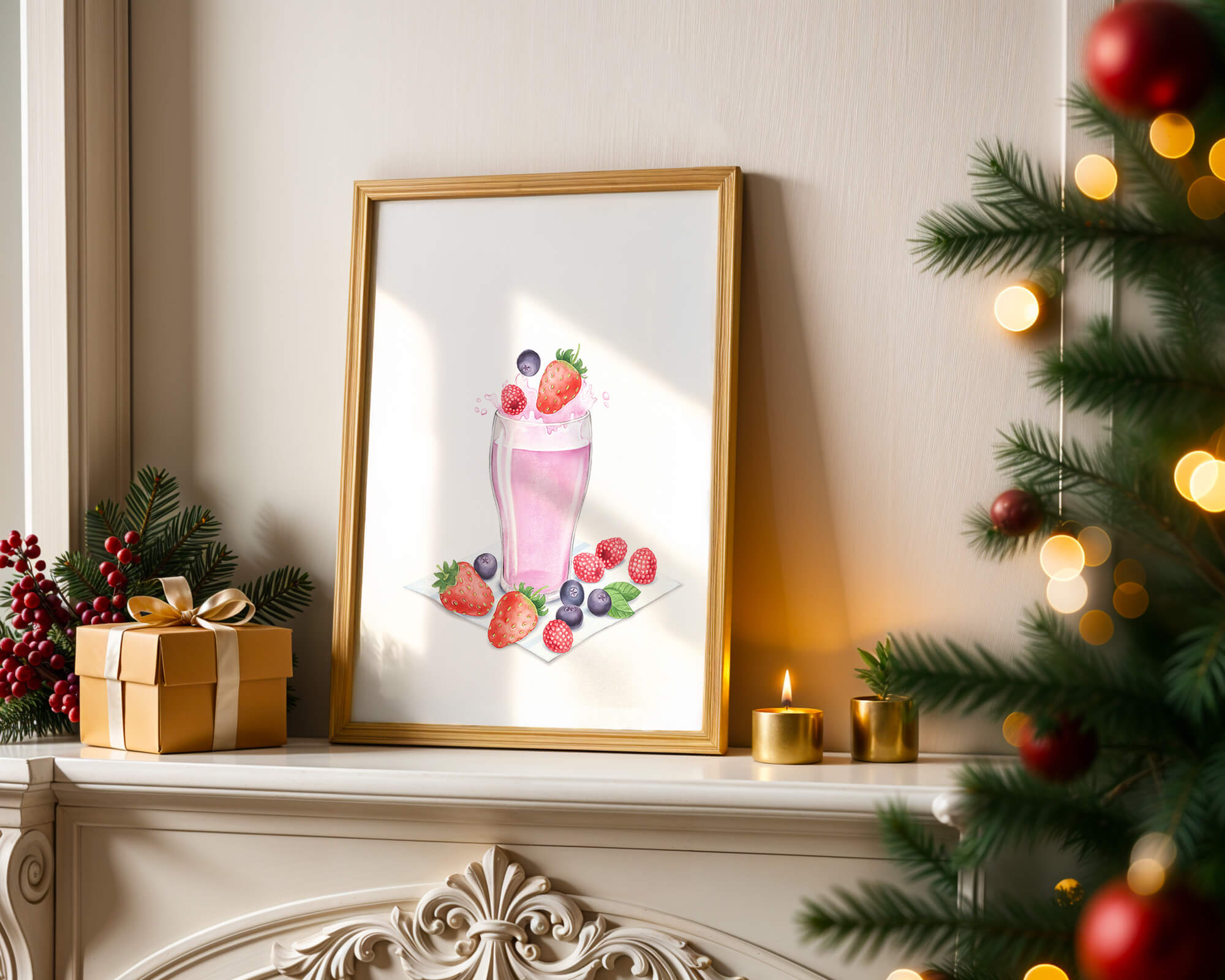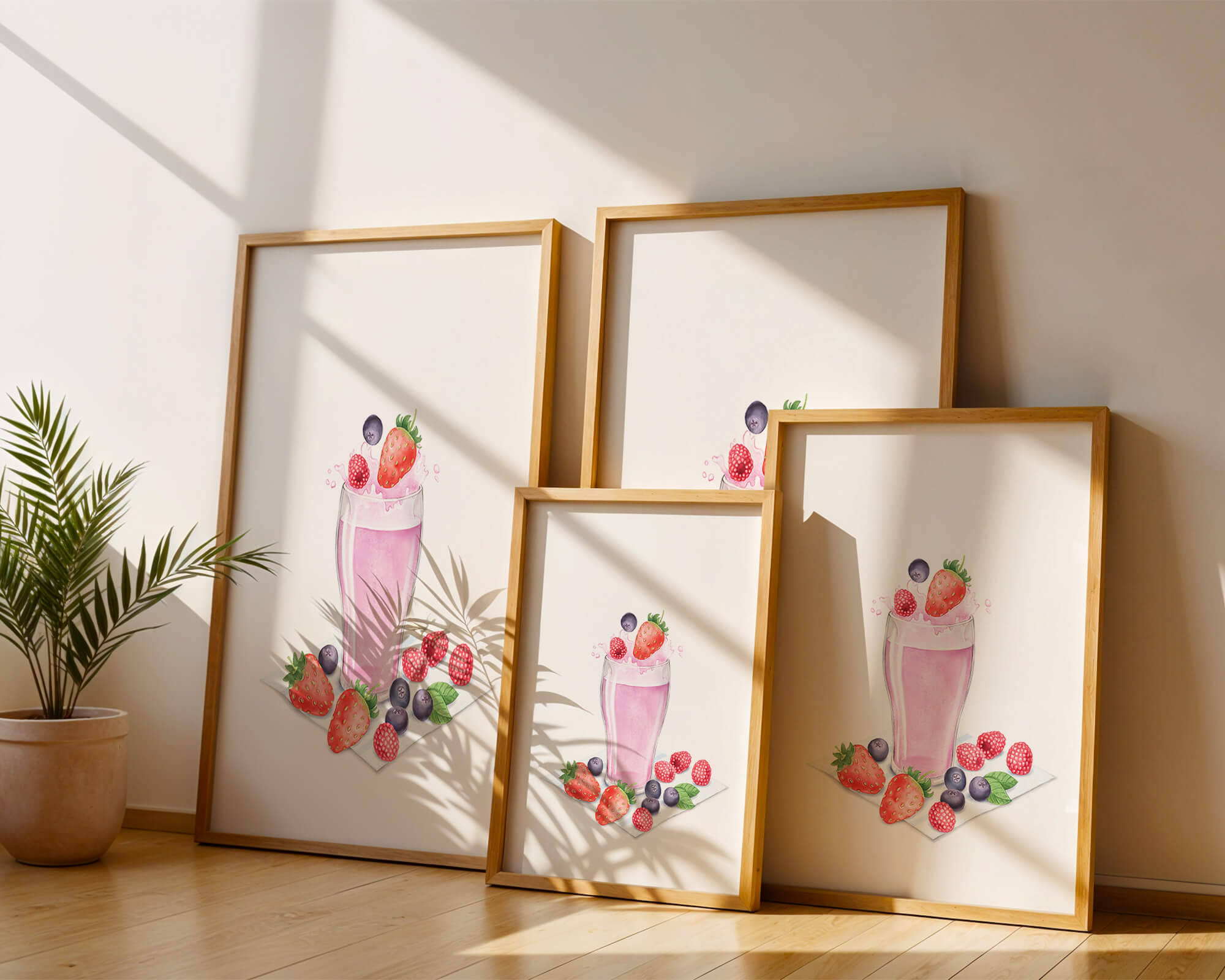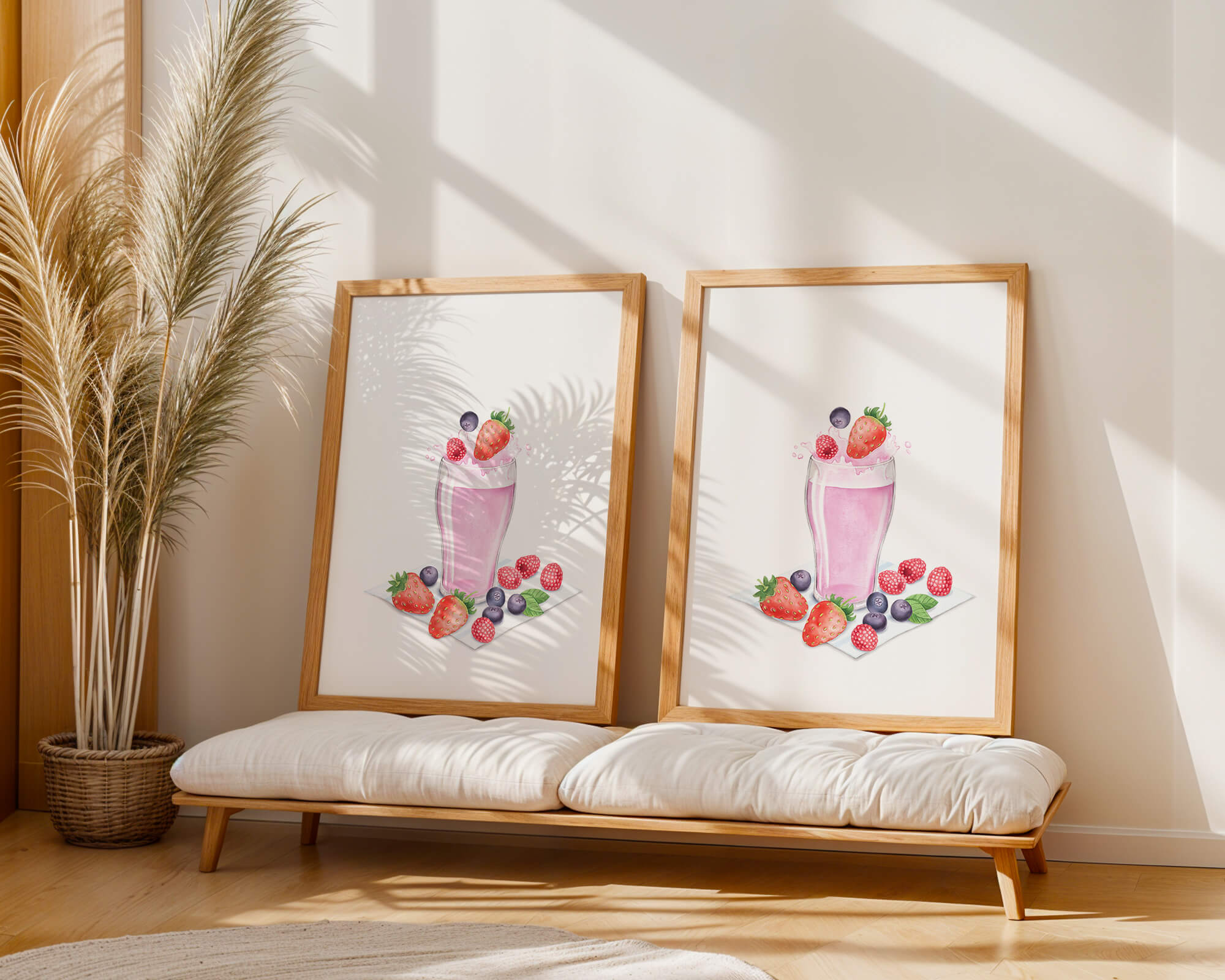 The image captures a tantalizing glass of pink smoothie, overflowing with the goodness of ripe strawberries and blueberries. The smooth, creamy texture invites indulgence, while the splash of colors energizes the viewer, making it a perfect fit for kitchens and dining spaces.Set upon a simple napkin, the combination of fresh berries around the glass hints at a nutritious and delicious treat. This visual delight not only appeals to the taste buds but also inspires a healthy lifestyle. Ideal for art lovers and food enthusiasts alike, this image brings a touch of summer into any home setting.| Type |