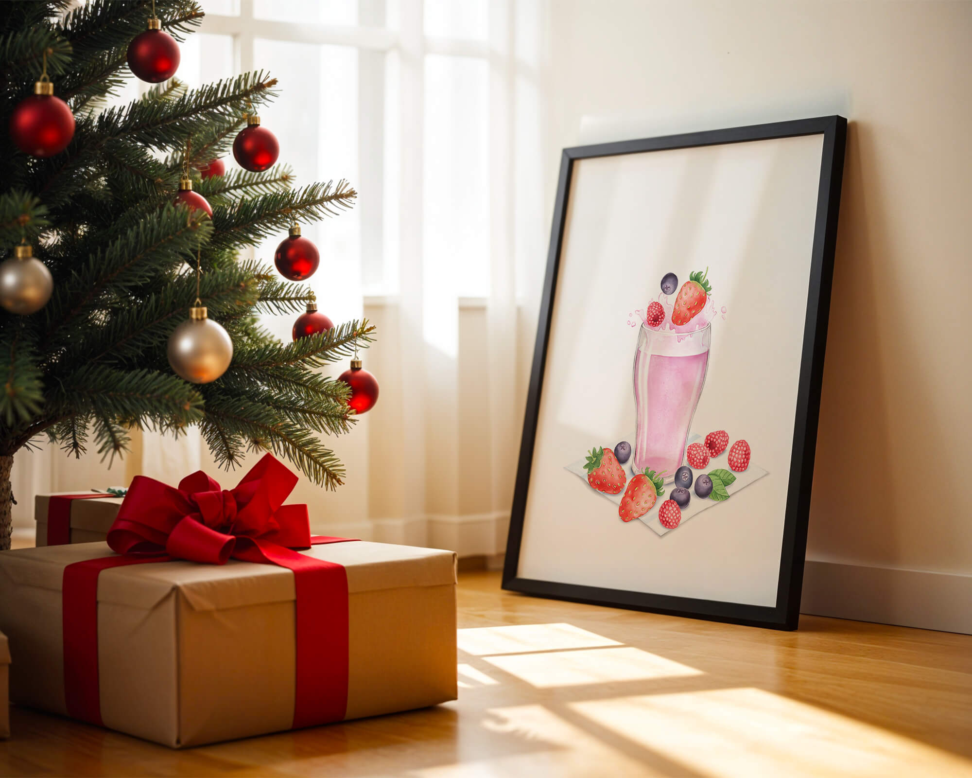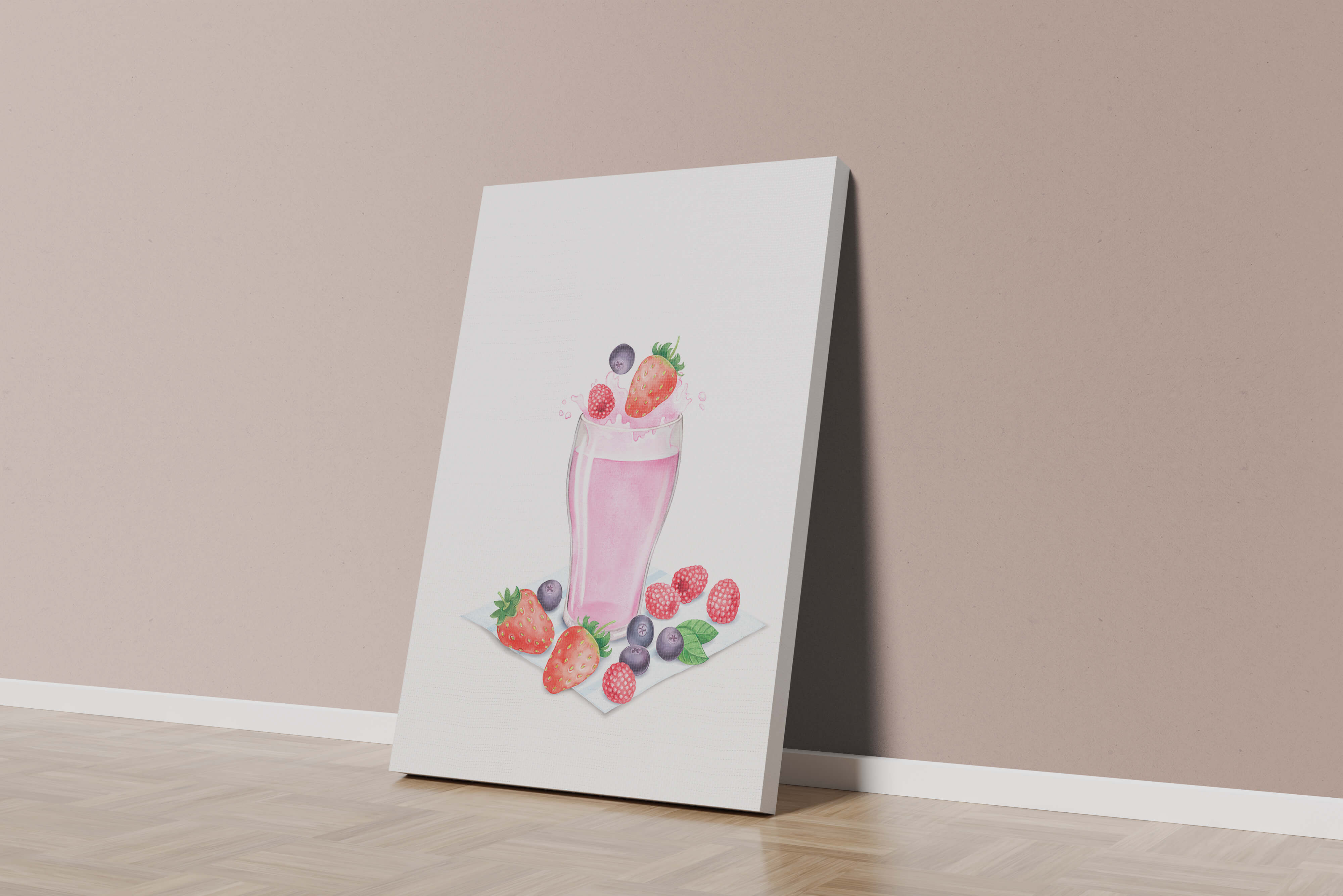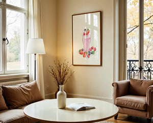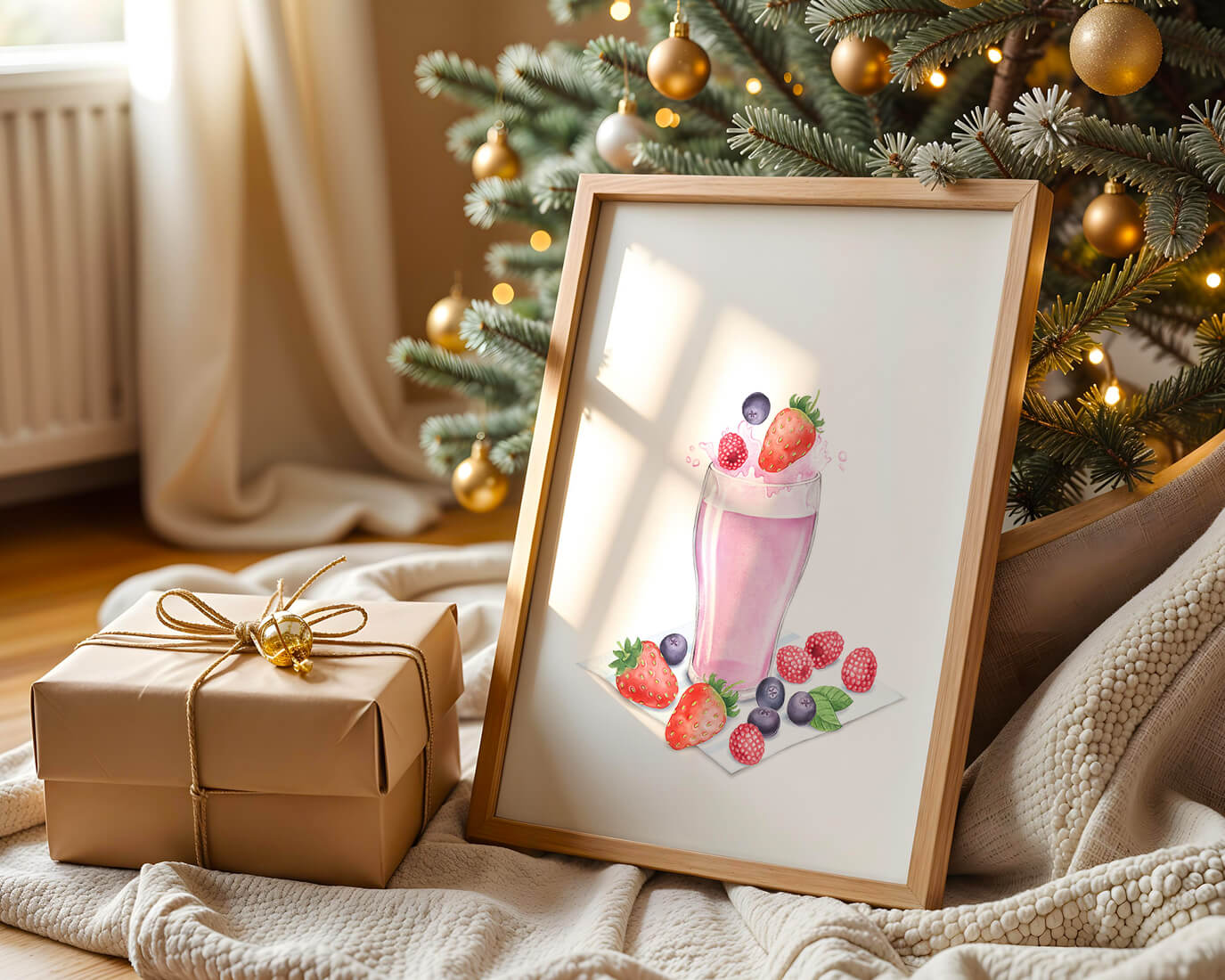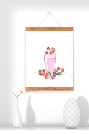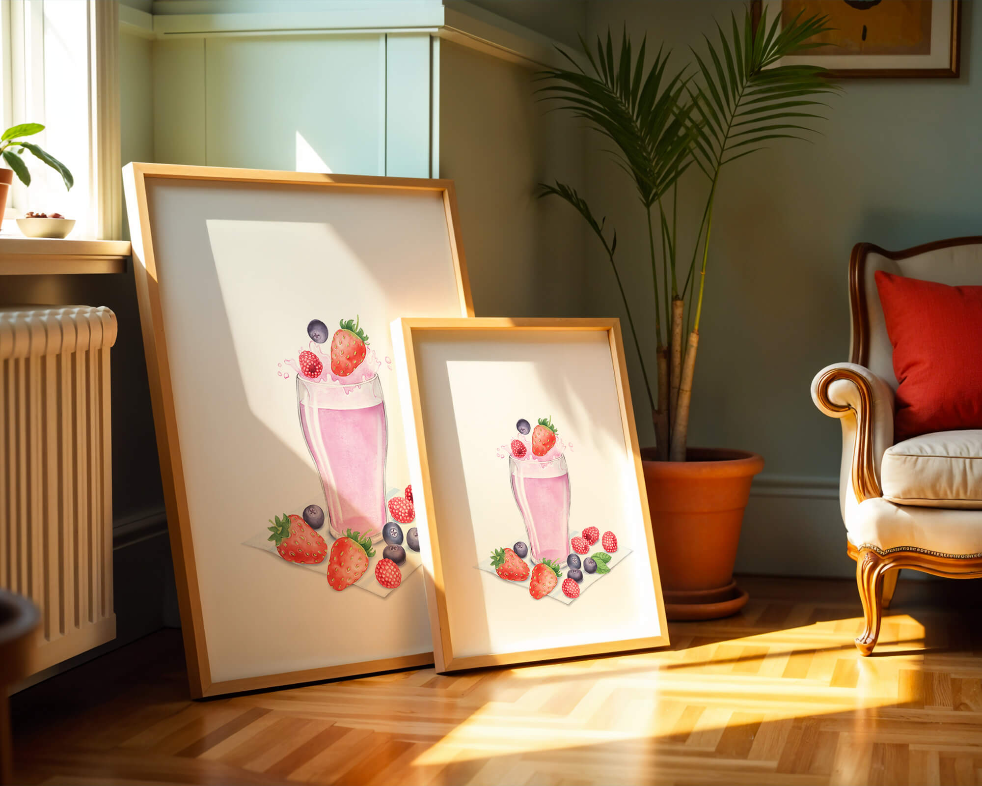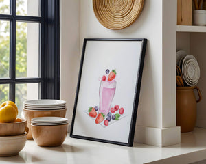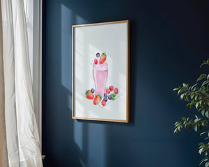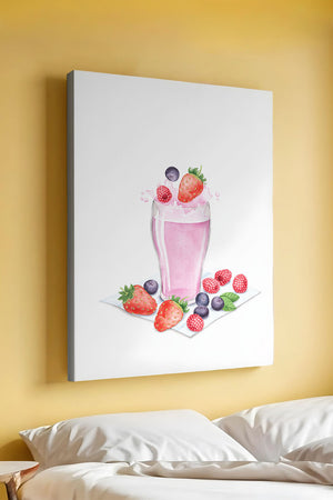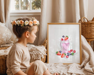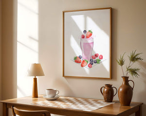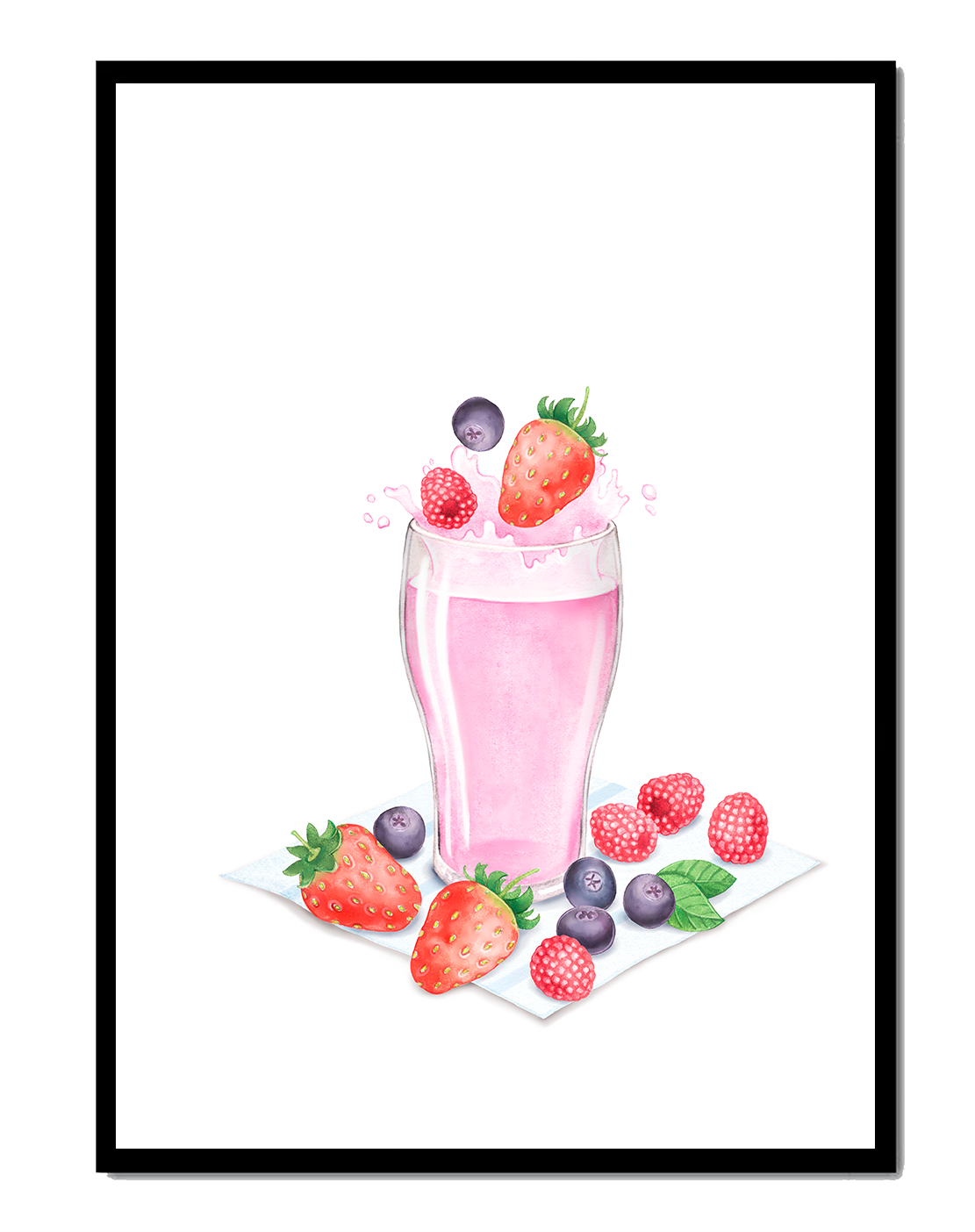 The image captures a tantalizing glass of pink smoothie, overflowing with the goodness of ripe strawberries and blueberries. The smooth, creamy texture invites indulgence, while the splash of colors energizes the viewer, making it a perfect fit for kitchens and dining spaces.Set upon a simple napkin, the combination of fresh berries around the glass hints at a nutritious and delicious treat. This visual delight not only appeals to the taste buds but also inspires a healthy lifestyle. Ideal for art lovers and food enthusiasts alike, this image brings a touch of summer into any home setting.| Type |