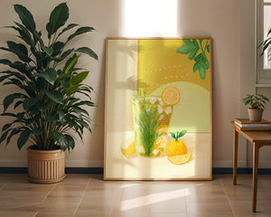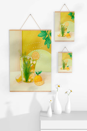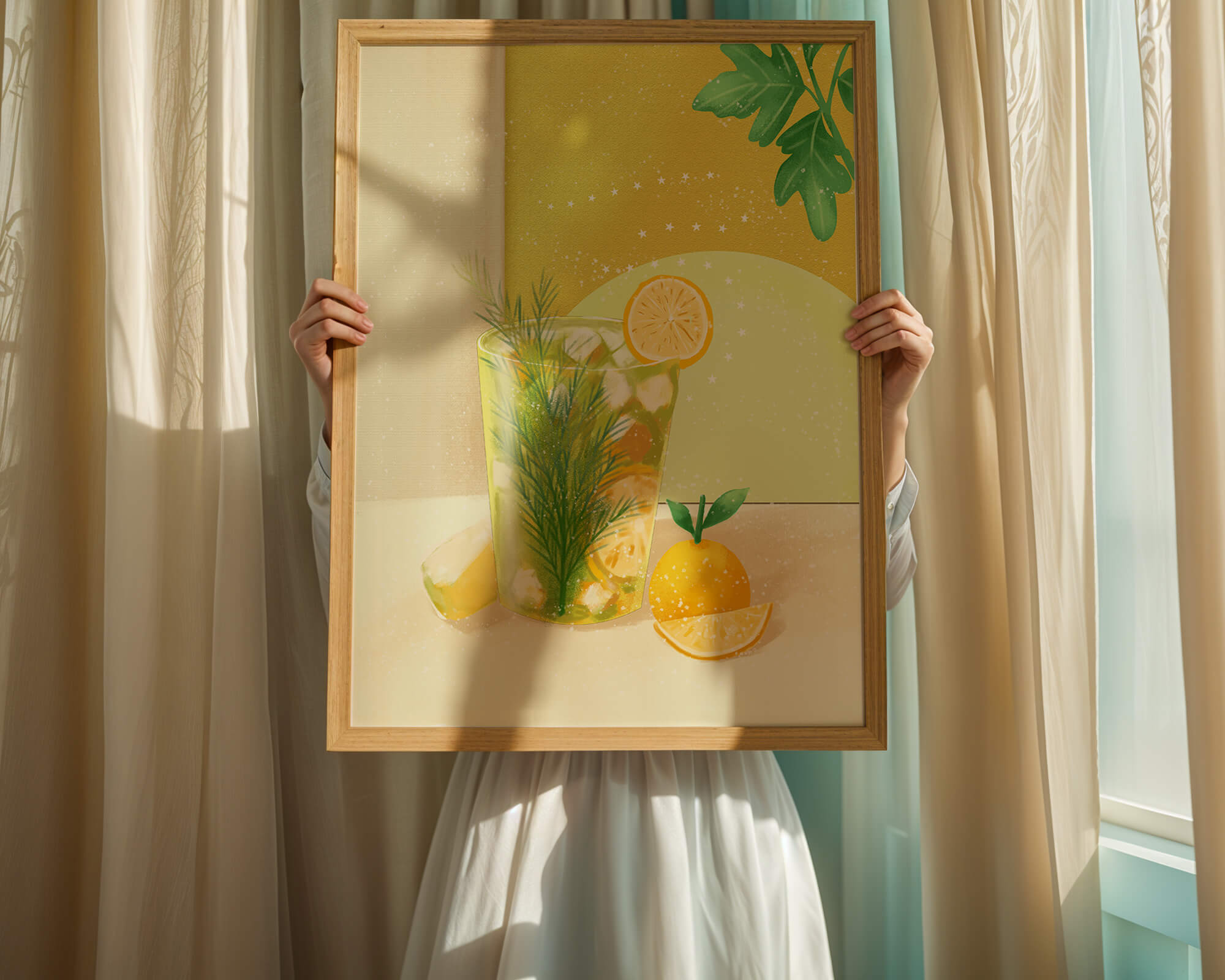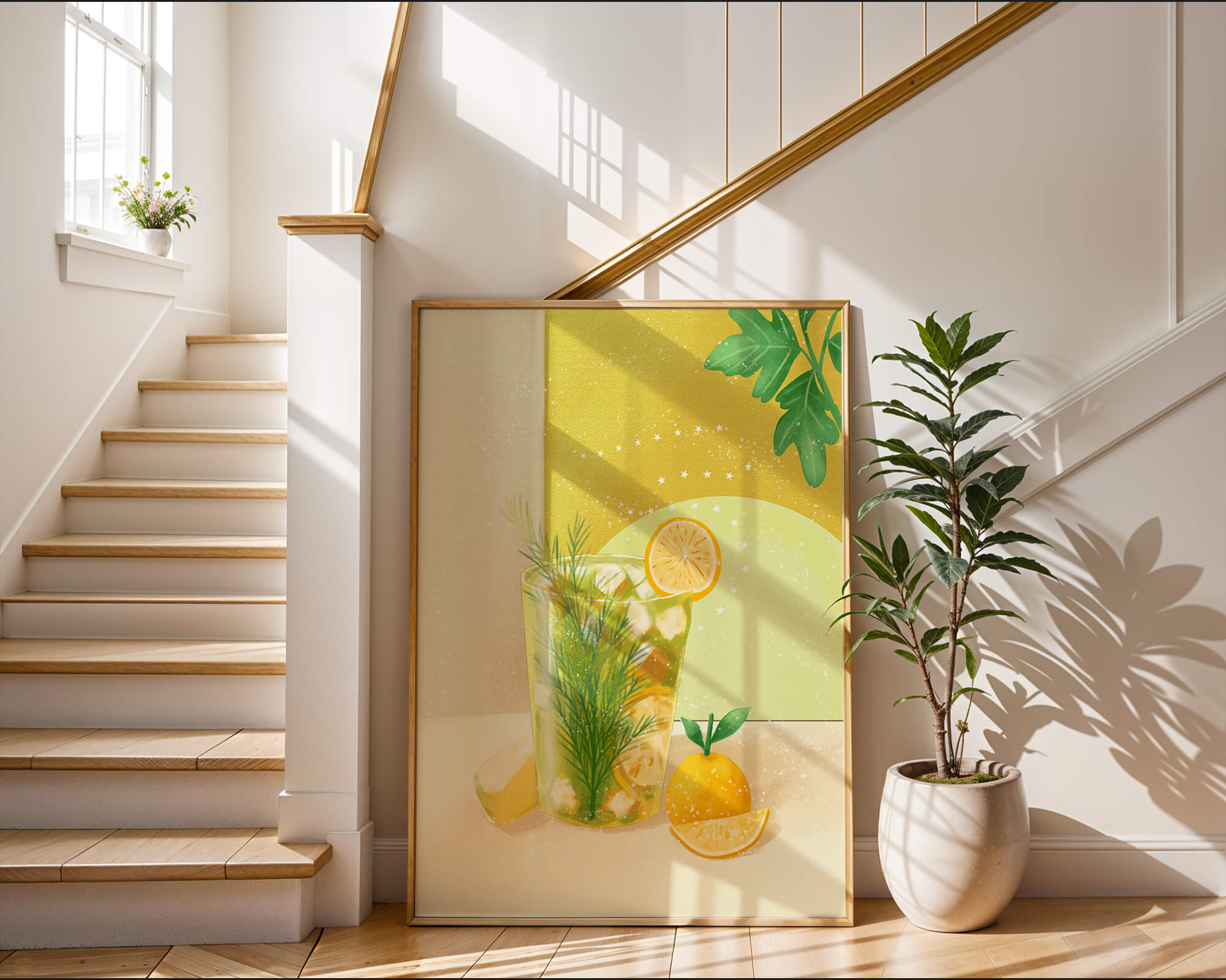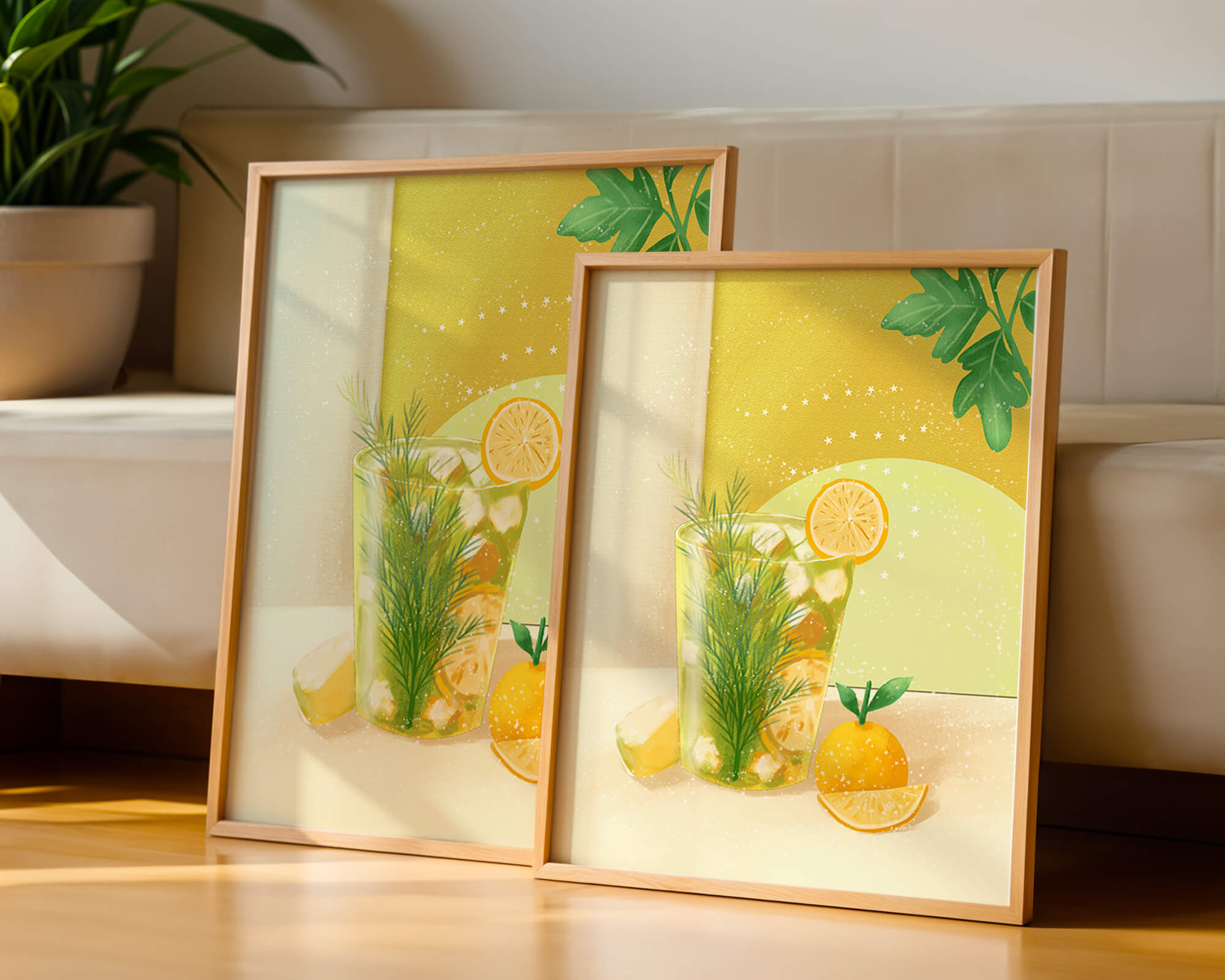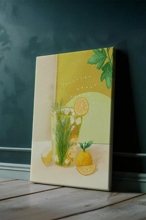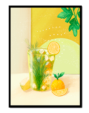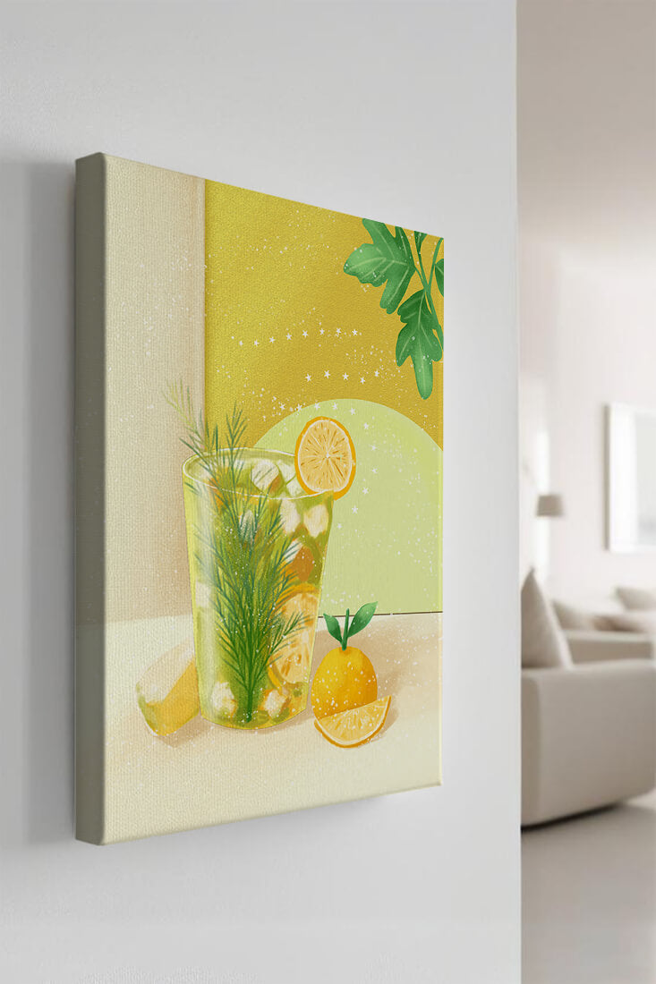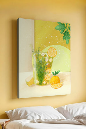 In the foreground, a clear glass is brimming with an invigorating mix of citrus and ice, showcasing the rich, warm hues of lemon. The delicate green garnish adds a natural touch, enhancing the drinks freshness. With soft, ambient lighting and subtle sparkles, the scene offers a sense of cool tranquility.The background complements the drinks vibrant appearance, with abstract yellow and green shades harmonizing with the overall theme. The presence of an orange and lemon slice beside the glass invites thoughts of sunlit days, making this an ideal inspiration for a kitchen or dining room setting seeking a lively, fresh touch.| Type |