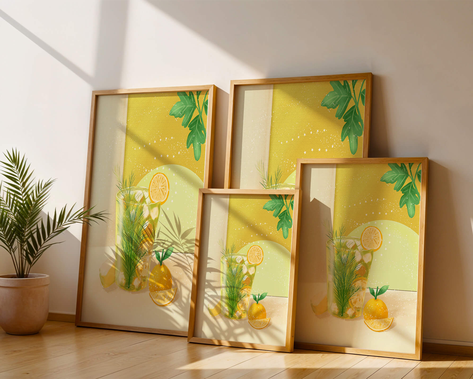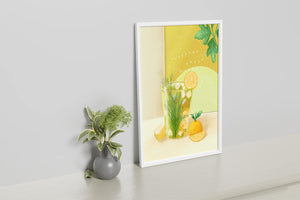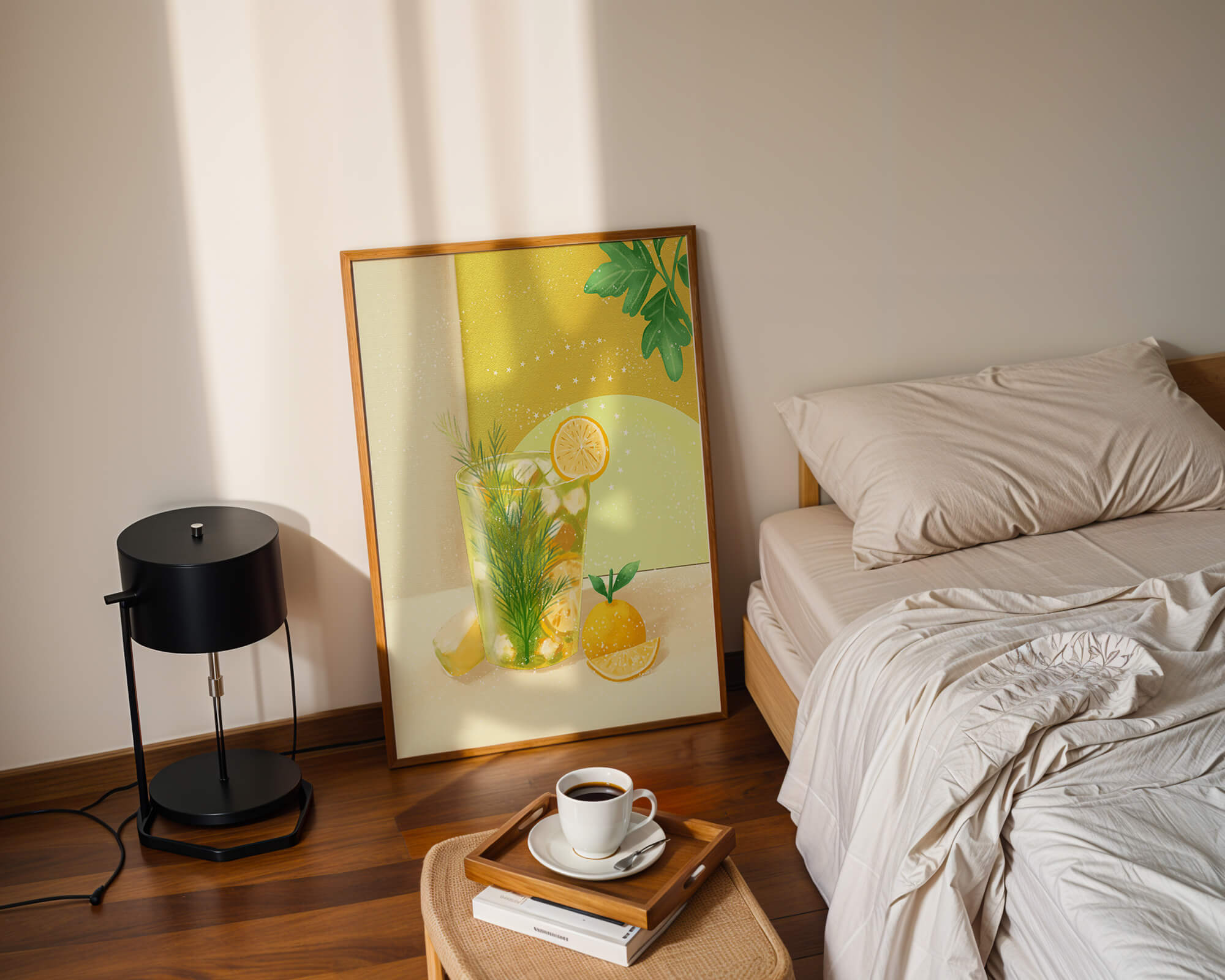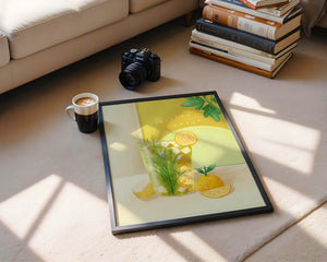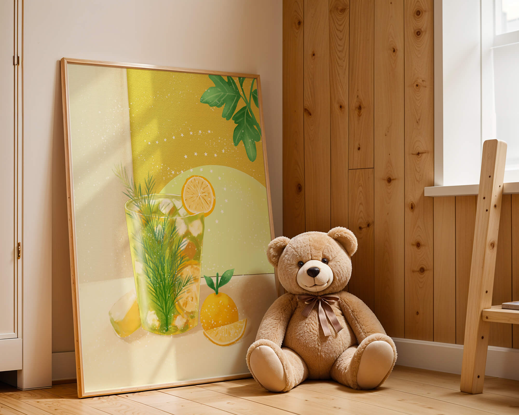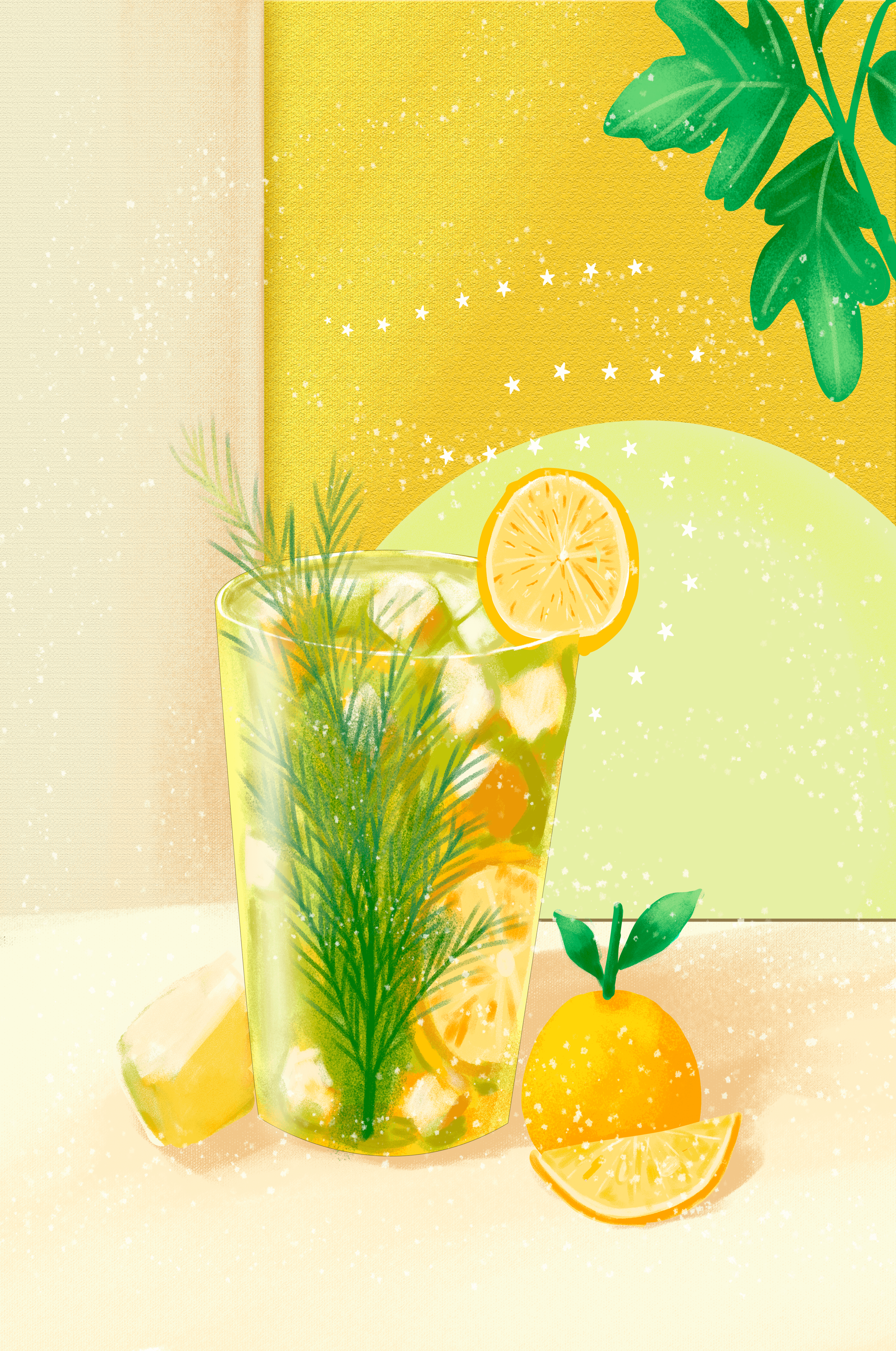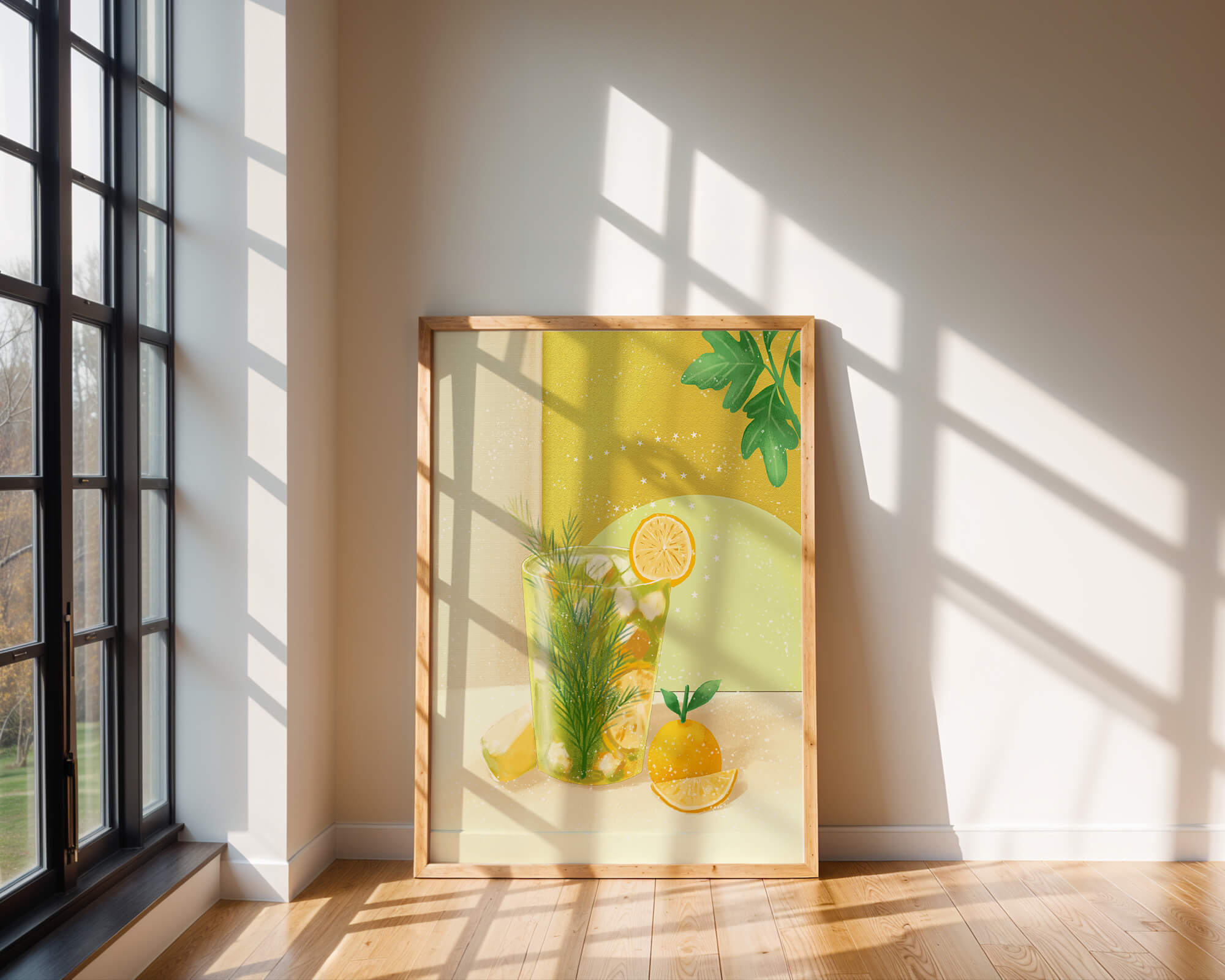 In the foreground, a clear glass is brimming with an invigorating mix of citrus and ice, showcasing the rich, warm hues of lemon. The delicate green garnish adds a natural touch, enhancing the drinks freshness. With soft, ambient lighting and subtle sparkles, the scene offers a sense of cool tranquility.The background complements the drinks vibrant appearance, with abstract yellow and green shades harmonizing with the overall theme. The presence of an orange and lemon slice beside the glass invites thoughts of sunlit days, making this an ideal inspiration for a kitchen or dining room setting seeking a lively, fresh touch.| Type |