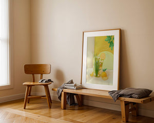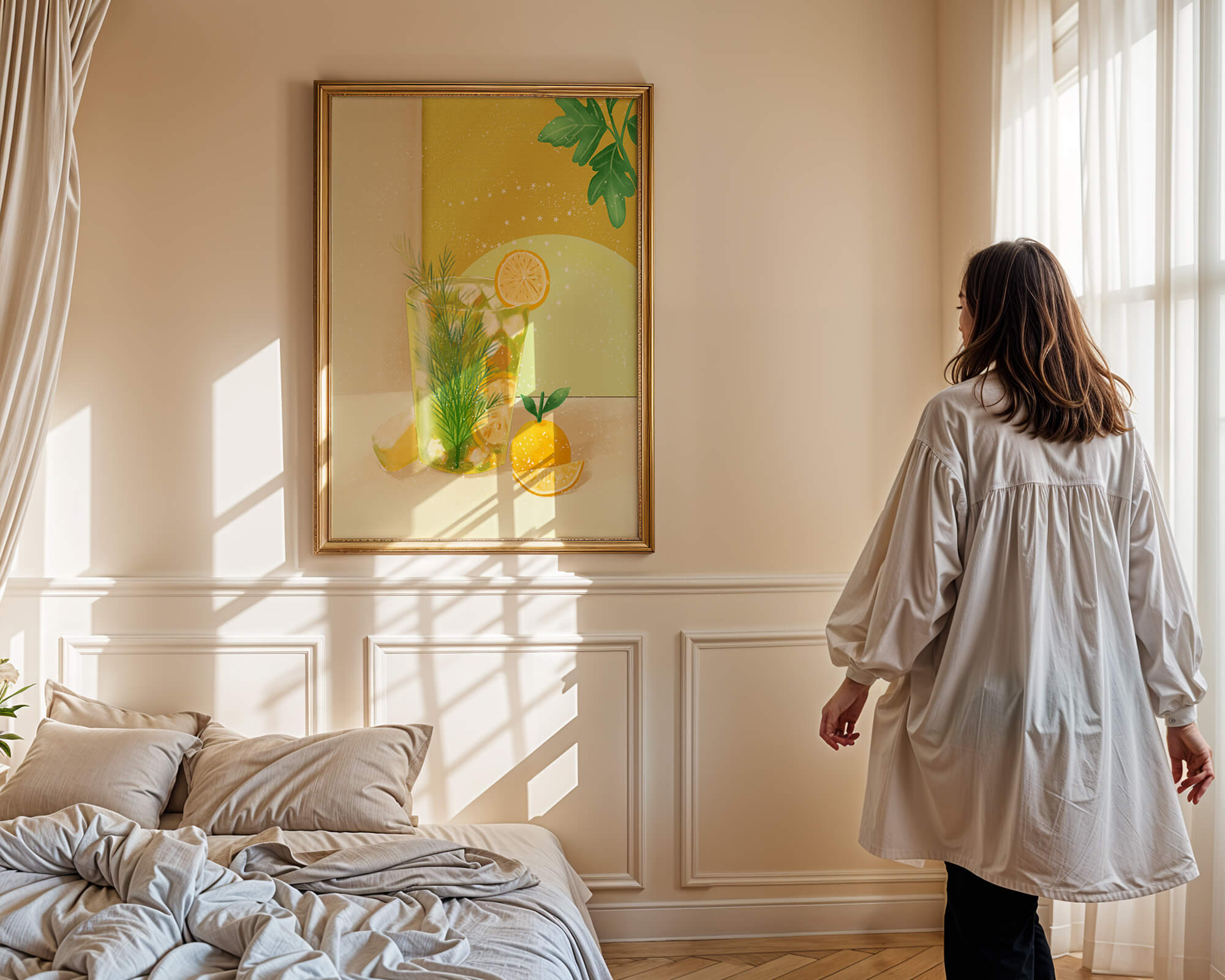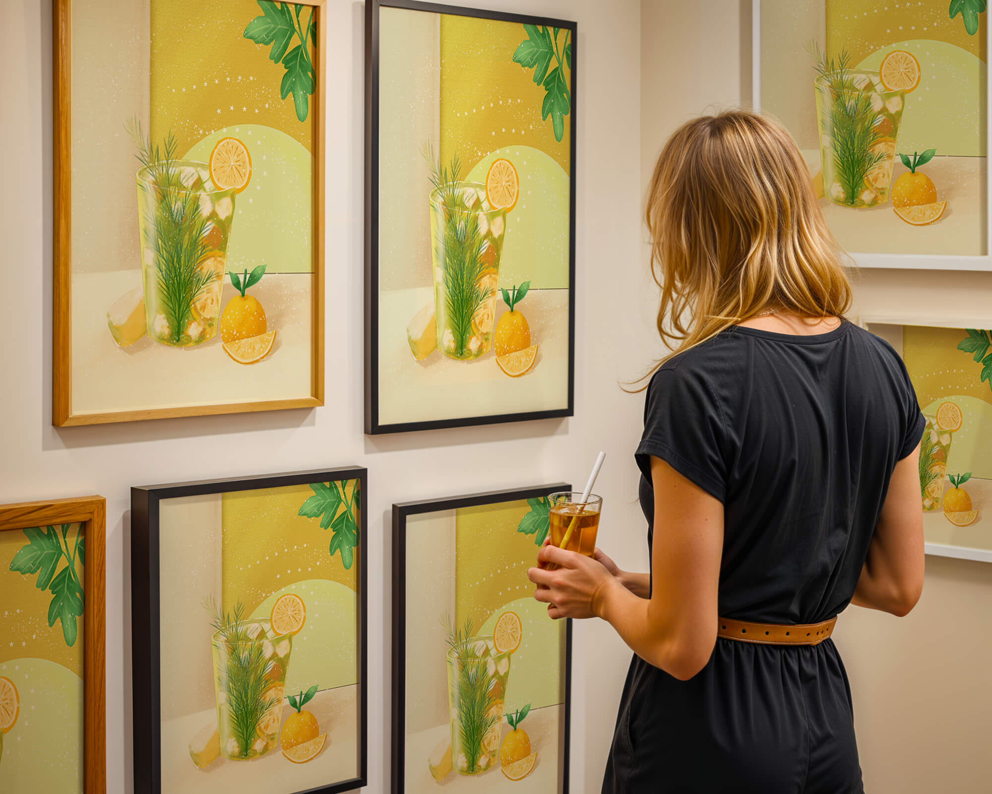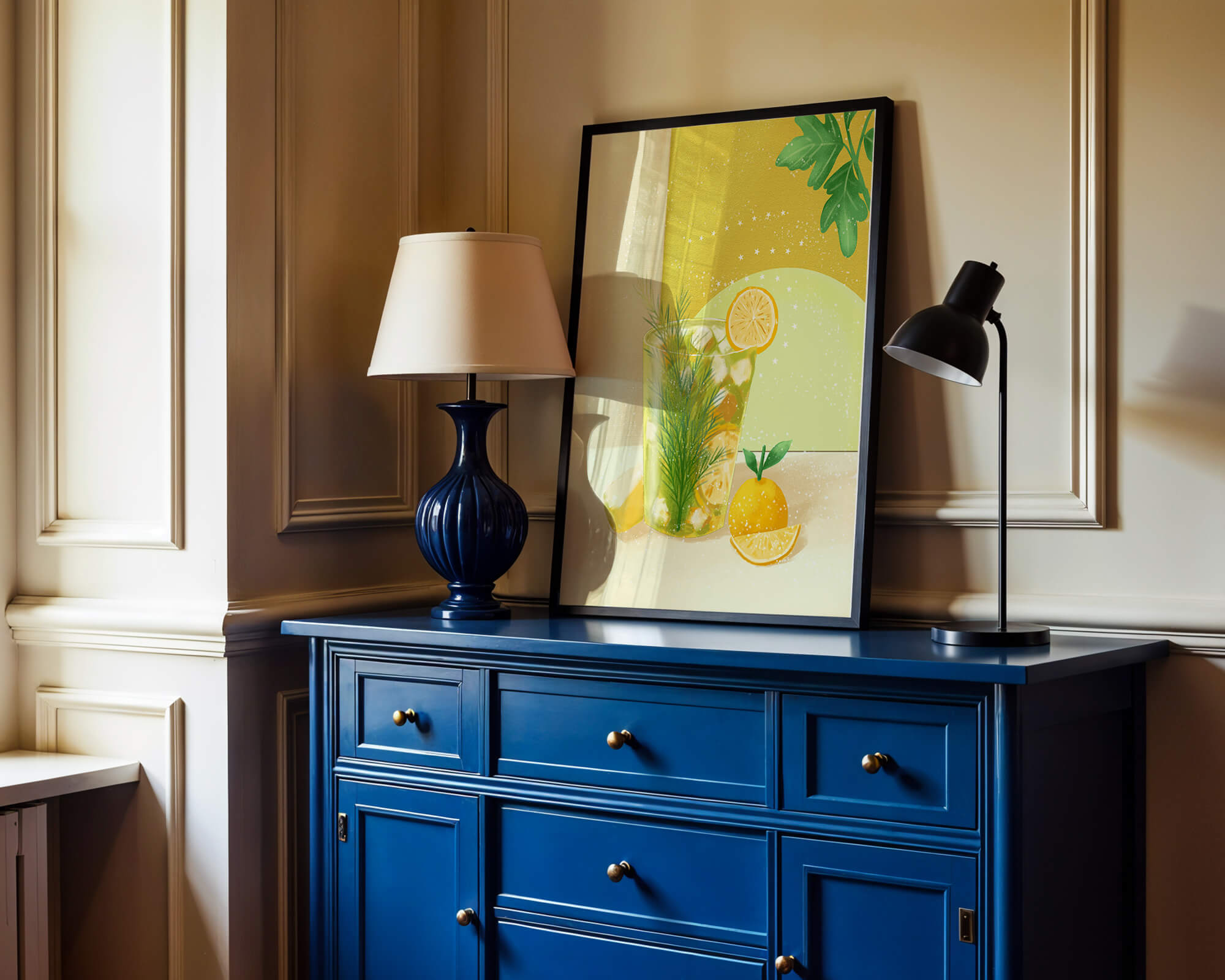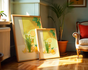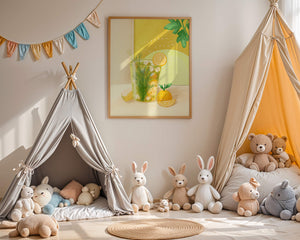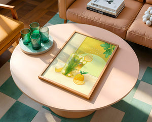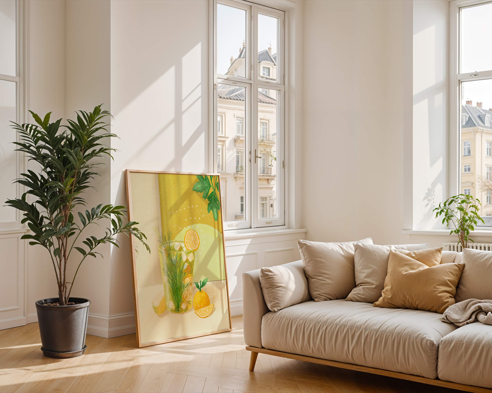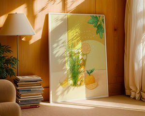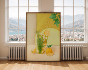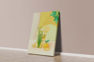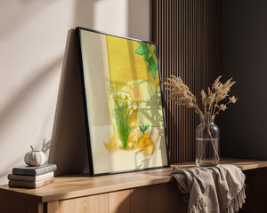 In the foreground, a clear glass is brimming with an invigorating mix of citrus and ice, showcasing the rich, warm hues of lemon. The delicate green garnish adds a natural touch, enhancing the drinks freshness. With soft, ambient lighting and subtle sparkles, the scene offers a sense of cool tranquility.The background complements the drinks vibrant appearance, with abstract yellow and green shades harmonizing with the overall theme. The presence of an orange and lemon slice beside the glass invites thoughts of sunlit days, making this an ideal inspiration for a kitchen or dining room setting seeking a lively, fresh touch.| Type |