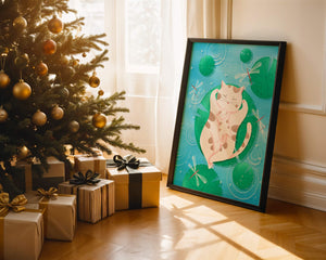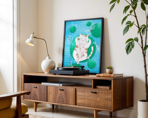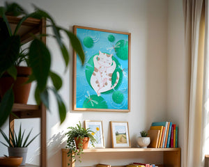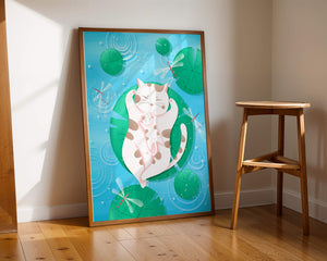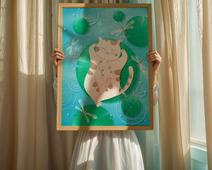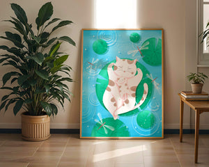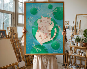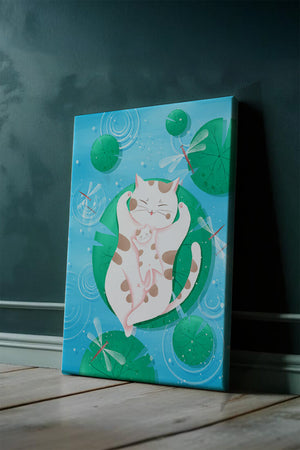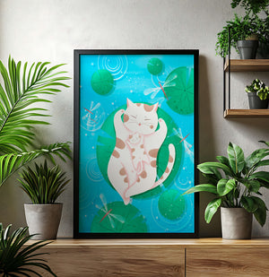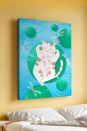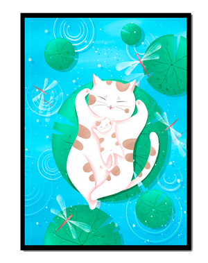 In this charming illustration, a large, spotted cat and a smaller cat are curled up on a vibrant green lily pad, creating a cozy and serene environment. The peaceful blue water below, adorned with splashes and circular ripples, enhances the calming effect of the scene.Surrounding the cats are several delicate dragonflies, adding a touch of dynamism to the otherwise tranquil setting. The juxtaposition of the cats soft, inviting appearances with the detailed, natural elements makes this image not only visually appealing but also emotionally comforting, ideal for a nursery or any space seeking a touch of whimsy and tranquility.| Type |