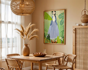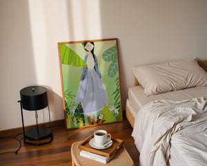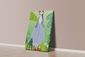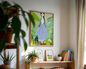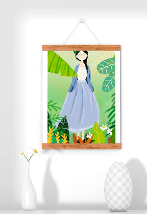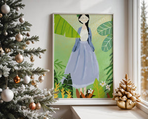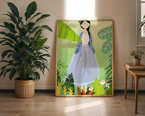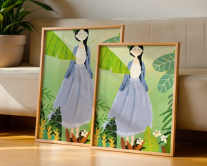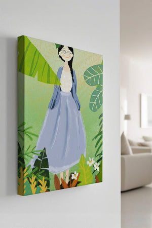In this delightful illustration, the woman stands gracefully, dressed in a long blue skirt and a casual top, exuding an air of tranquility. Her slight smile and closed eyes suggest a moment of peaceful introspection, perhaps lost in the gentle sounds of nature around her. The soft, pastel colors used in her outfit enhance the overall serene atmosphere of the artwork.Around her, vividly drawn tropical leaves in different shapes and sizes add a lively and fresh touch to the image. The green hues are harmoniously balanced, providing a perfect setting that transports the viewer to a tranquil garden or forest scene. This image exudes relaxation and is ideal for nature lovers and those seeking a moment of calm in their daily lives.
