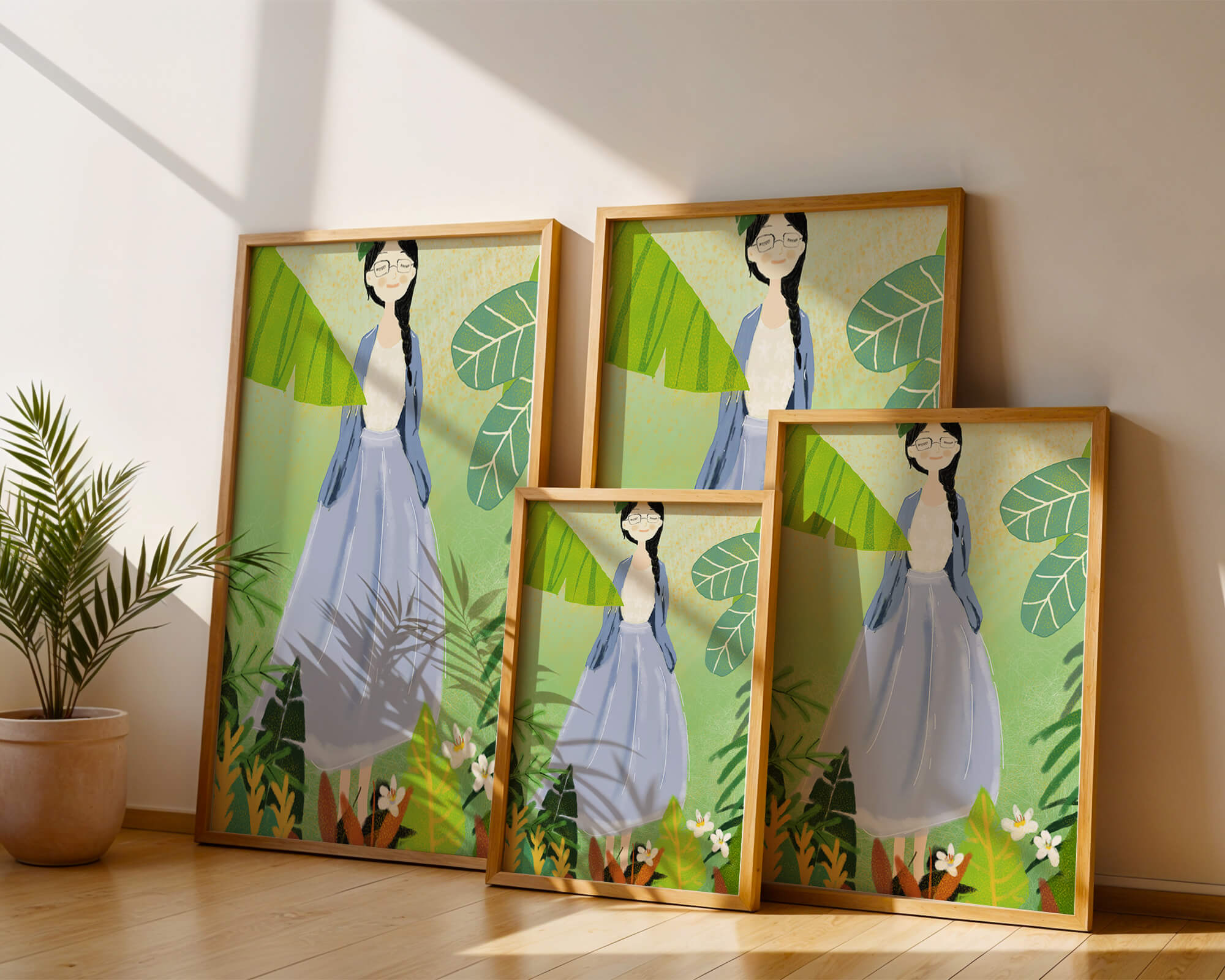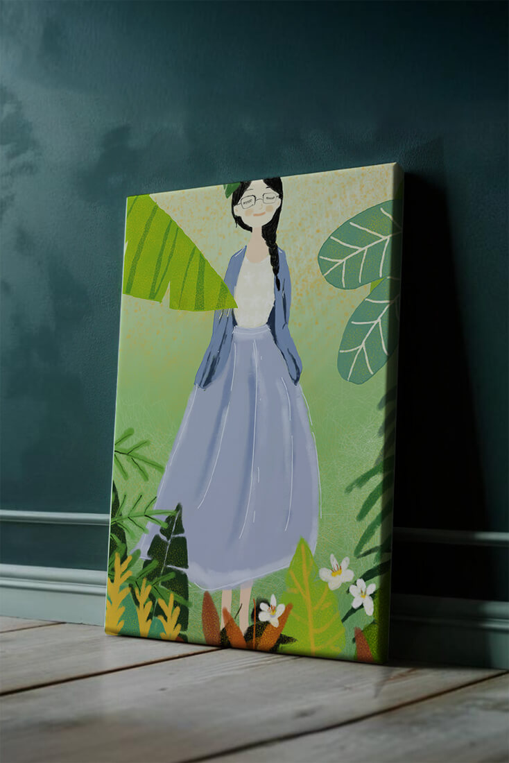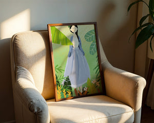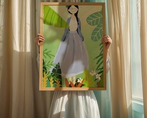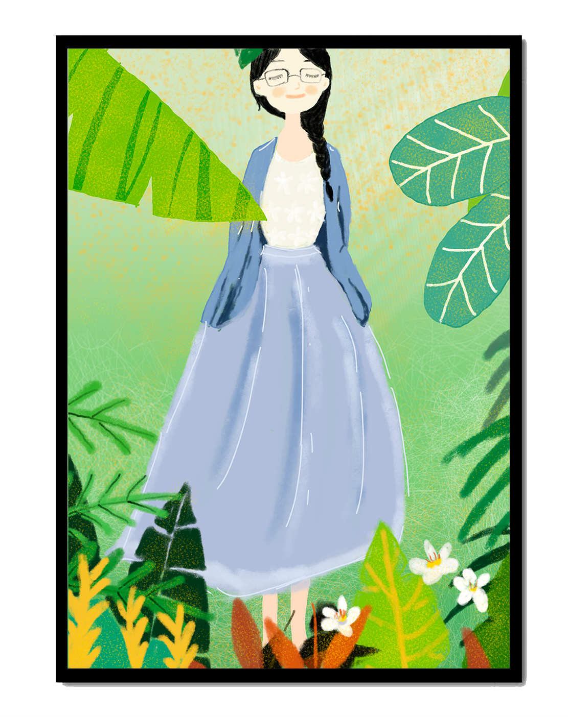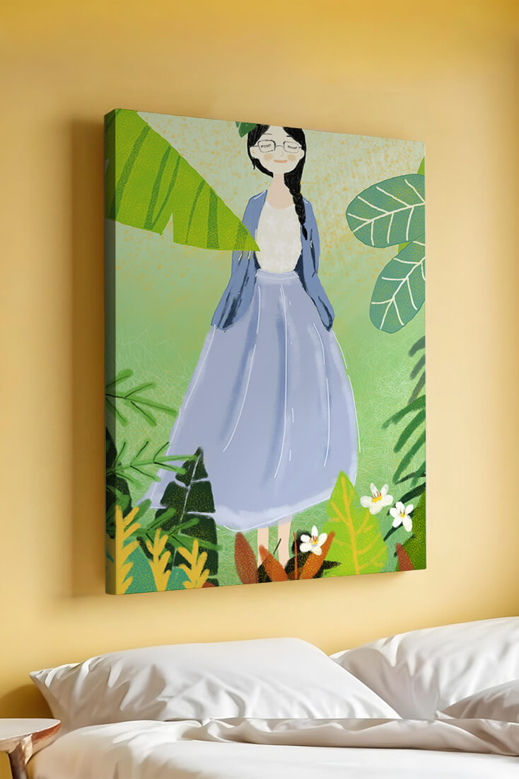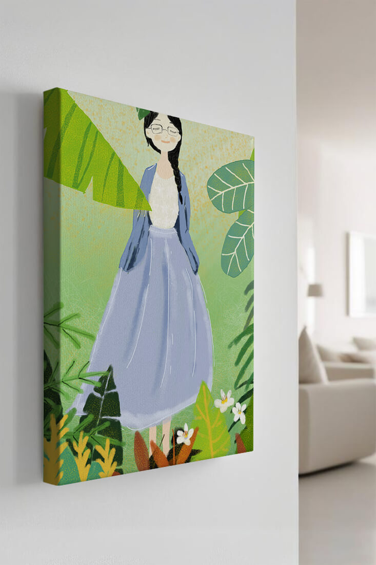 In this delightful illustration, the woman stands gracefully, dressed in a long blue skirt and a casual top, exuding an air of tranquility. Her slight smile and closed eyes suggest a moment of peaceful introspection, perhaps lost in the gentle sounds of nature around her. The soft, pastel colors used in her outfit enhance the overall serene atmosphere of the artwork.Around her, vividly drawn tropical leaves in different shapes and sizes add a lively and fresh touch to the image. The green hues are harmoniously balanced, providing a perfect setting that transports the viewer to a tranquil garden or forest scene. This image exudes relaxation and is ideal for nature lovers and those seeking a moment of calm in their daily lives.