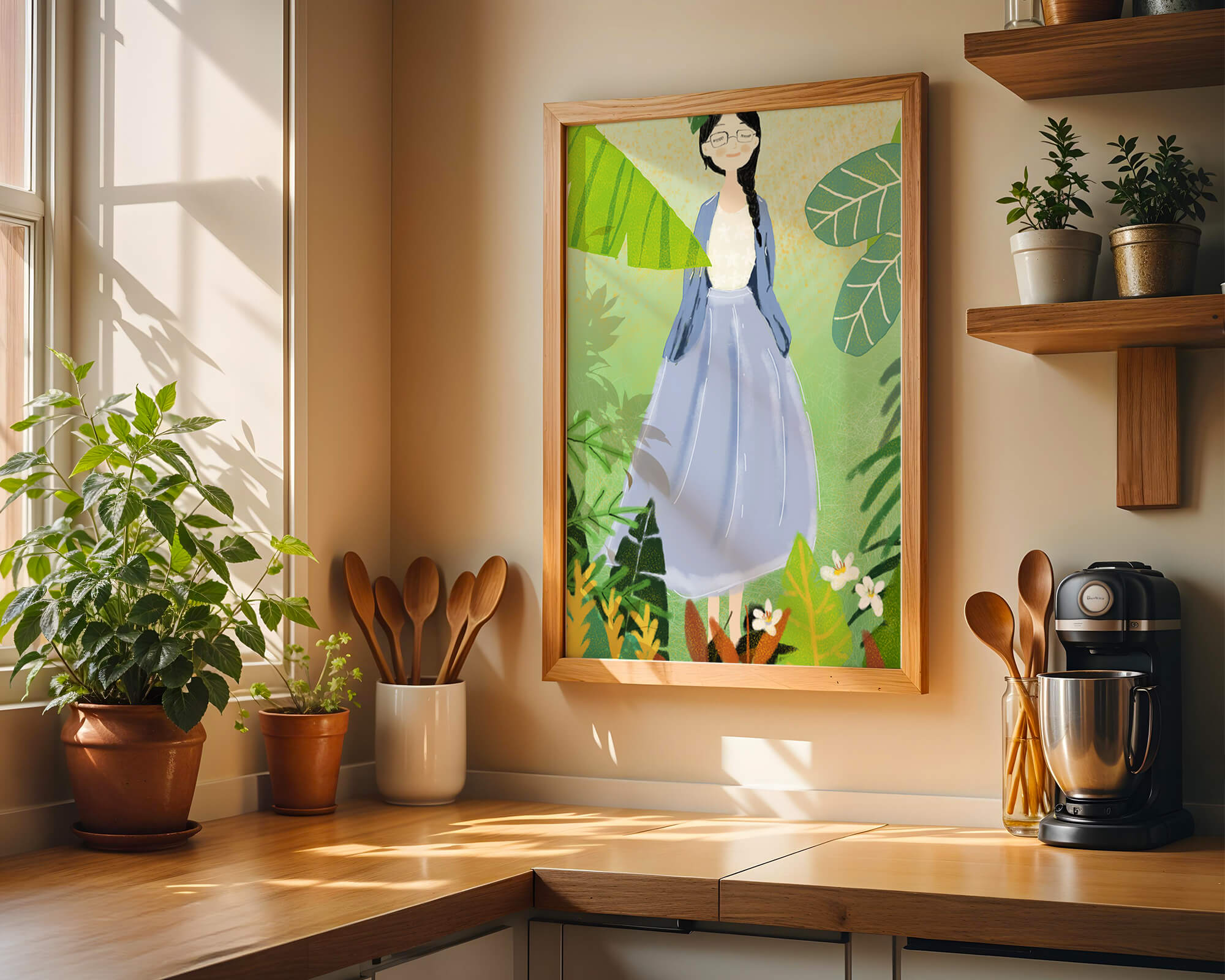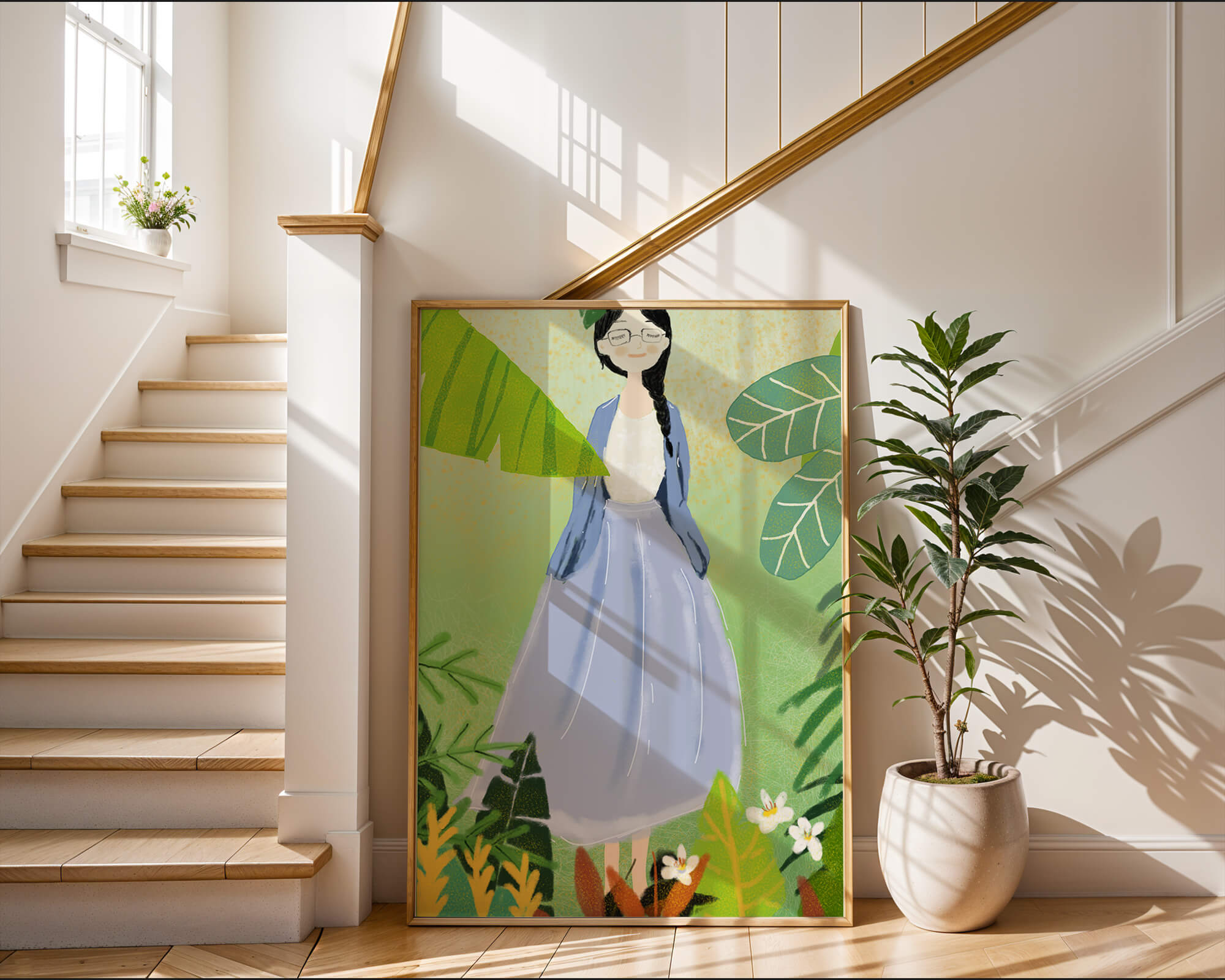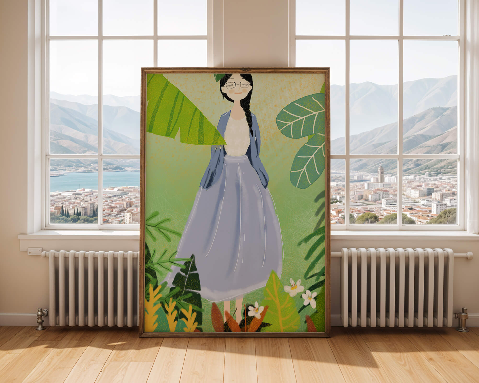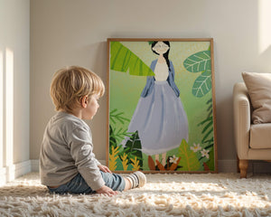 In this delightful illustration, the woman stands gracefully, dressed in a long blue skirt and a casual top, exuding an air of tranquility. Her slight smile and closed eyes suggest a moment of peaceful introspection, perhaps lost in the gentle sounds of nature around her. The soft, pastel colors used in her outfit enhance the overall serene atmosphere of the artwork.Around her, vividly drawn tropical leaves in different shapes and sizes add a lively and fresh touch to the image. The green hues are harmoniously balanced, providing a perfect setting that transports the viewer to a tranquil garden or forest scene. This image exudes relaxation and is ideal for nature lovers and those seeking a moment of calm in their daily lives.