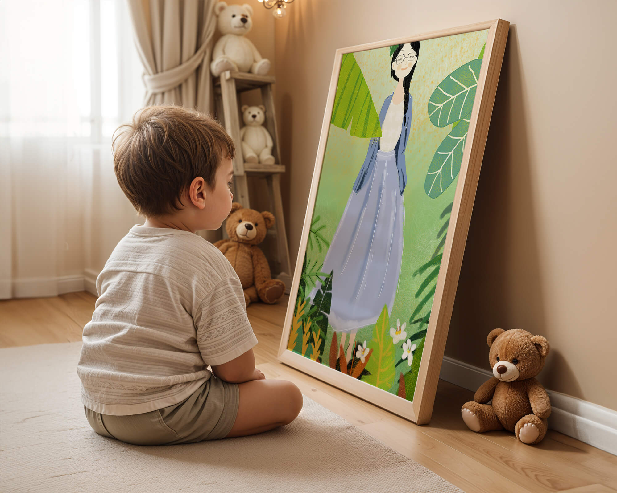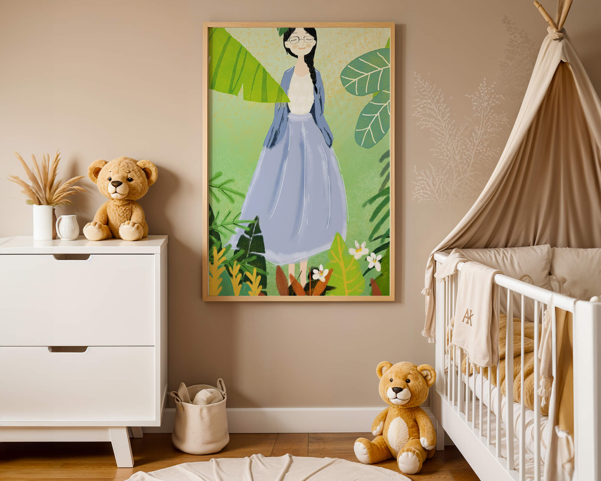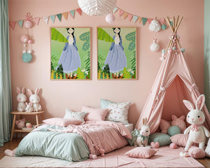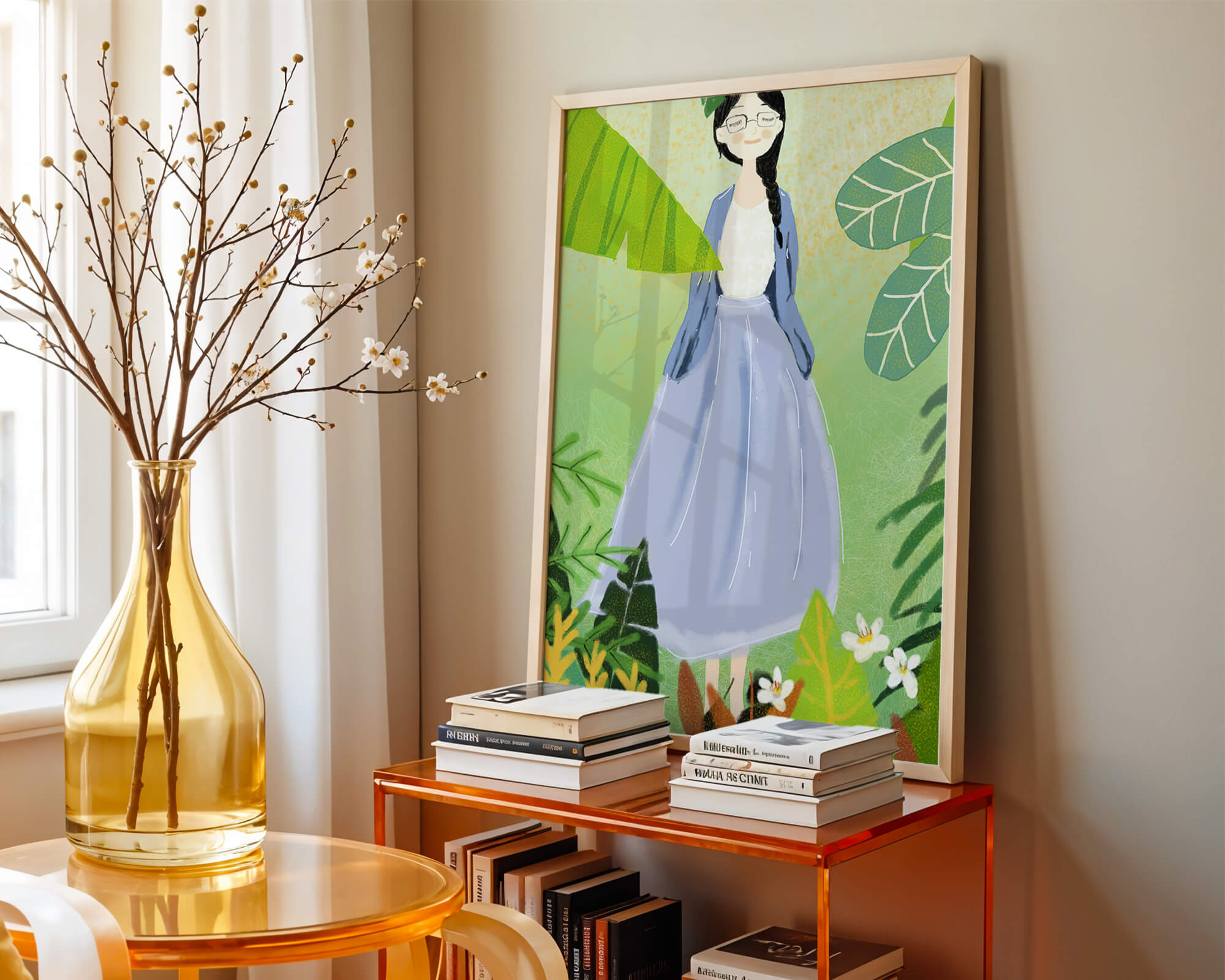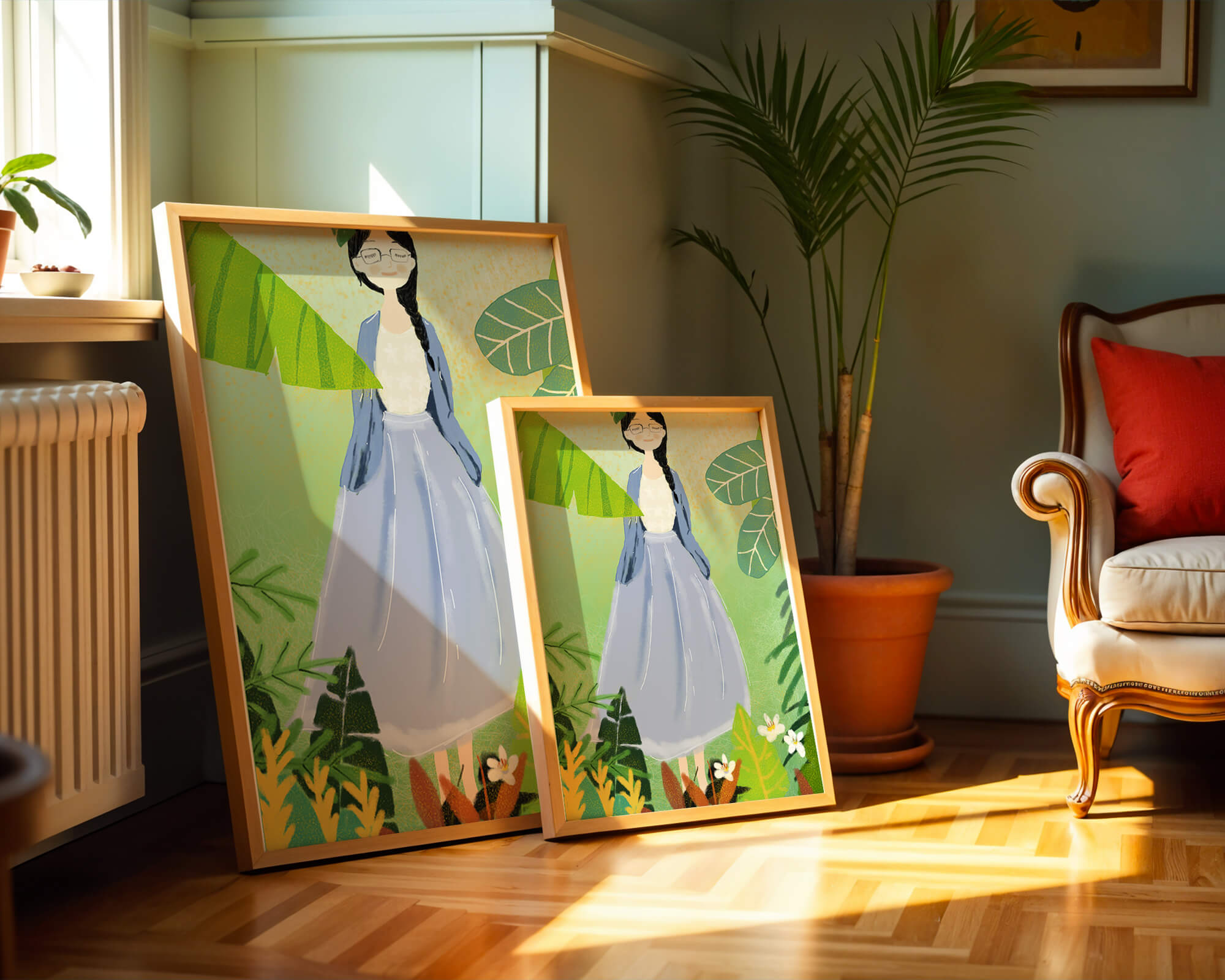 In this delightful illustration, the woman stands gracefully, dressed in a long blue skirt and a casual top, exuding an air of tranquility. Her slight smile and closed eyes suggest a moment of peaceful introspection, perhaps lost in the gentle sounds of nature around her. The soft, pastel colors used in her outfit enhance the overall serene atmosphere of the artwork.Around her, vividly drawn tropical leaves in different shapes and sizes add a lively and fresh touch to the image. The green hues are harmoniously balanced, providing a perfect setting that transports the viewer to a tranquil garden or forest scene. This image exudes relaxation and is ideal for nature lovers and those seeking a moment of calm in their daily lives.