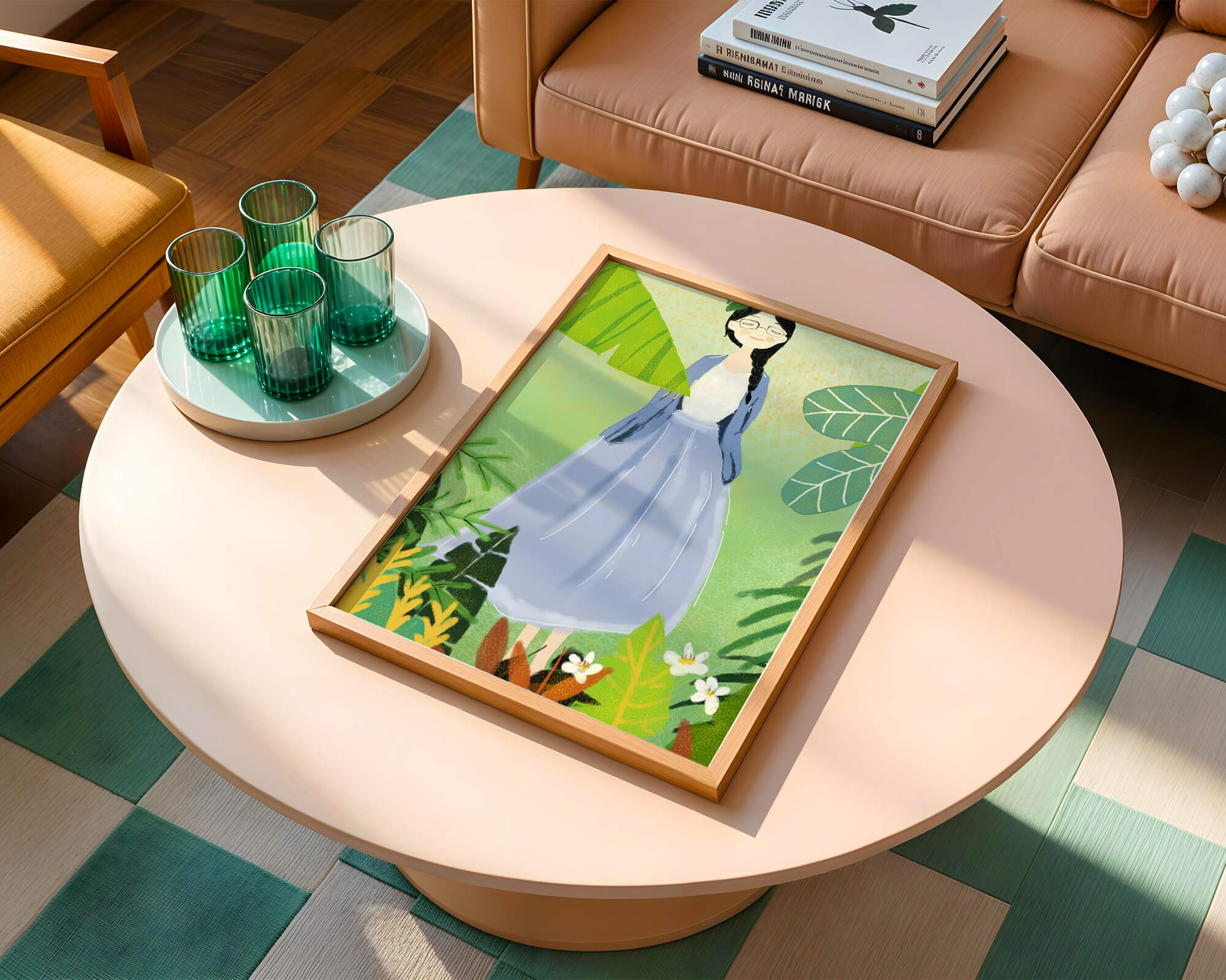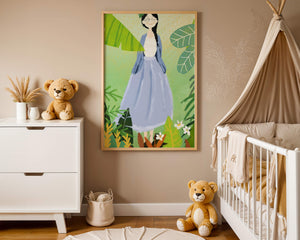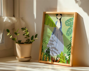 Home Serene illustration of a woman in nature with tropical leaves