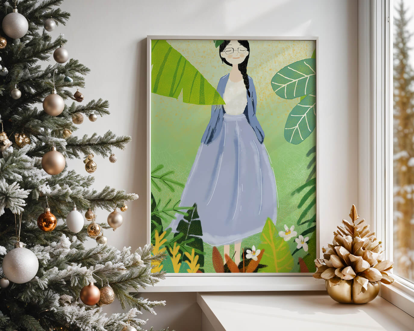 Serene illustration of a woman in nature with tropical leaves