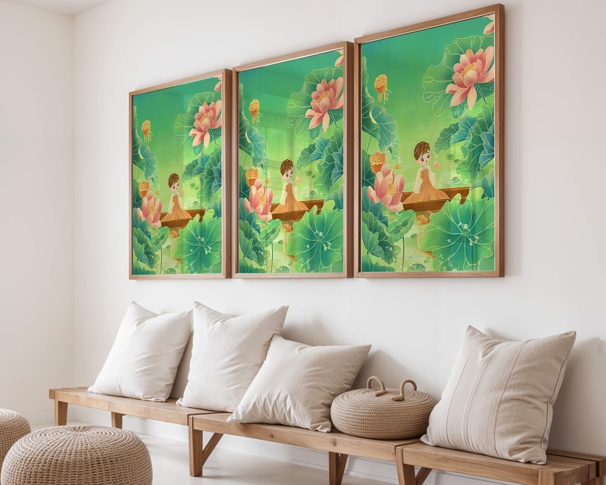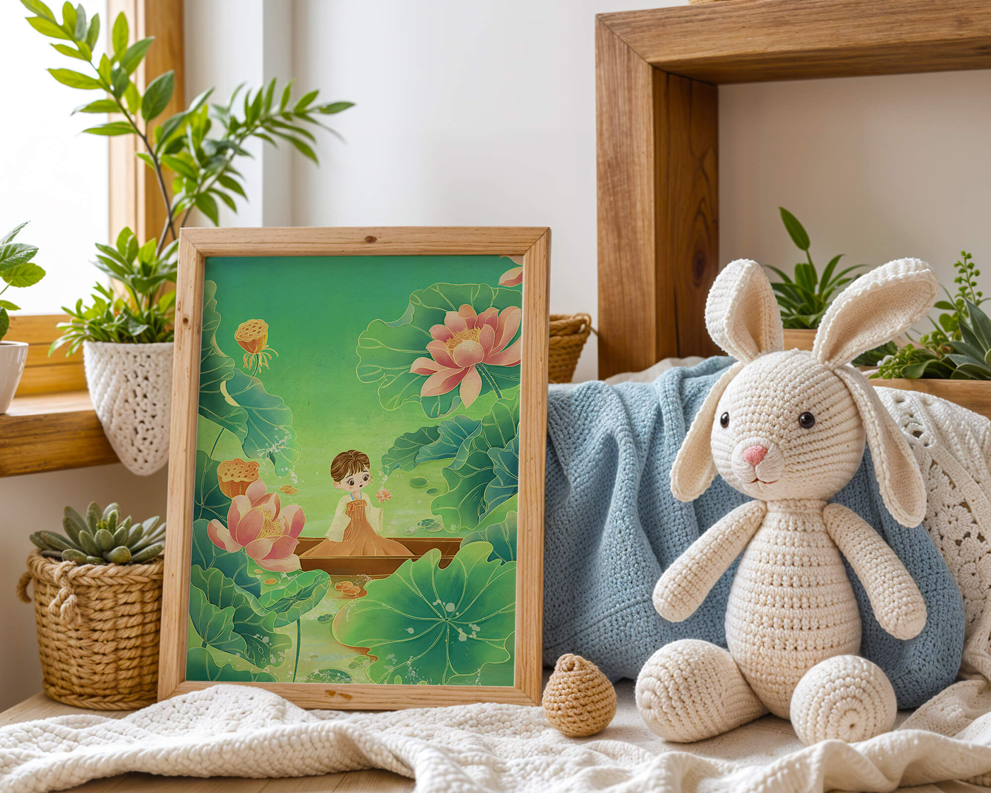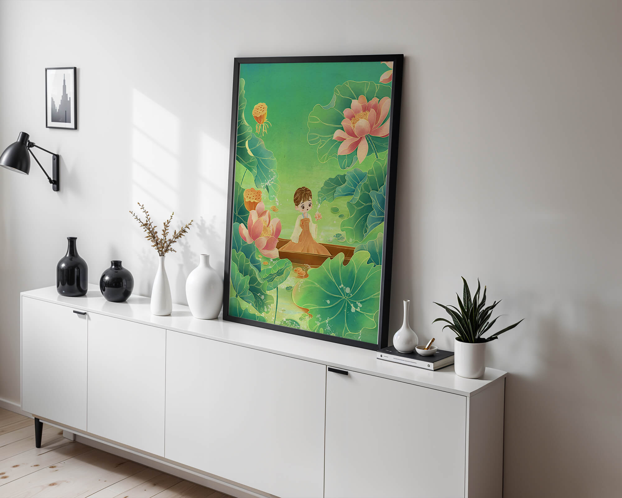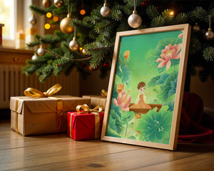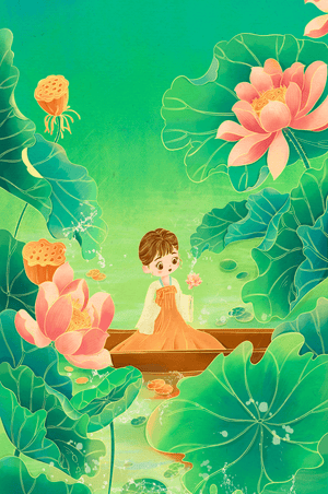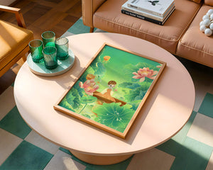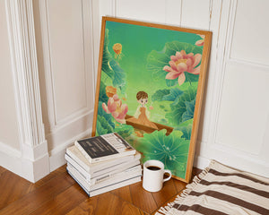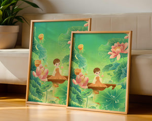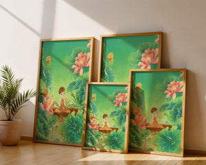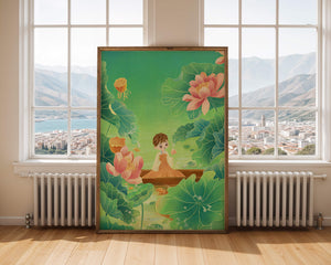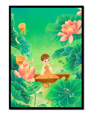 The artwork introduces a serene atmosphere, where a petite figure holds a delicate lotus flower, embodying innocence and peace. The backdrop of vibrant green leaves contrasts beautifully with the soft pink hues of blooming lotuses, enhancing the overall harmonious feel.This illustration invites viewers into a tranquil world, evoking a sense of wonder and relaxation. The gentle palette and imaginative elements make it an ideal choice for spaces aiming to inspire calmness, such as a childs room or a quiet corner dedicated to reflection.| Type |