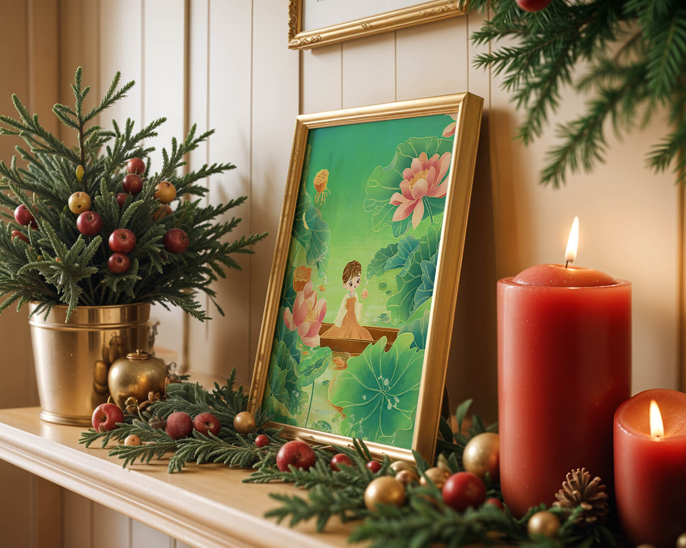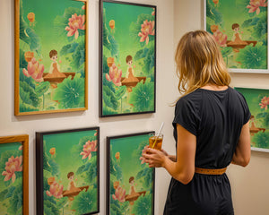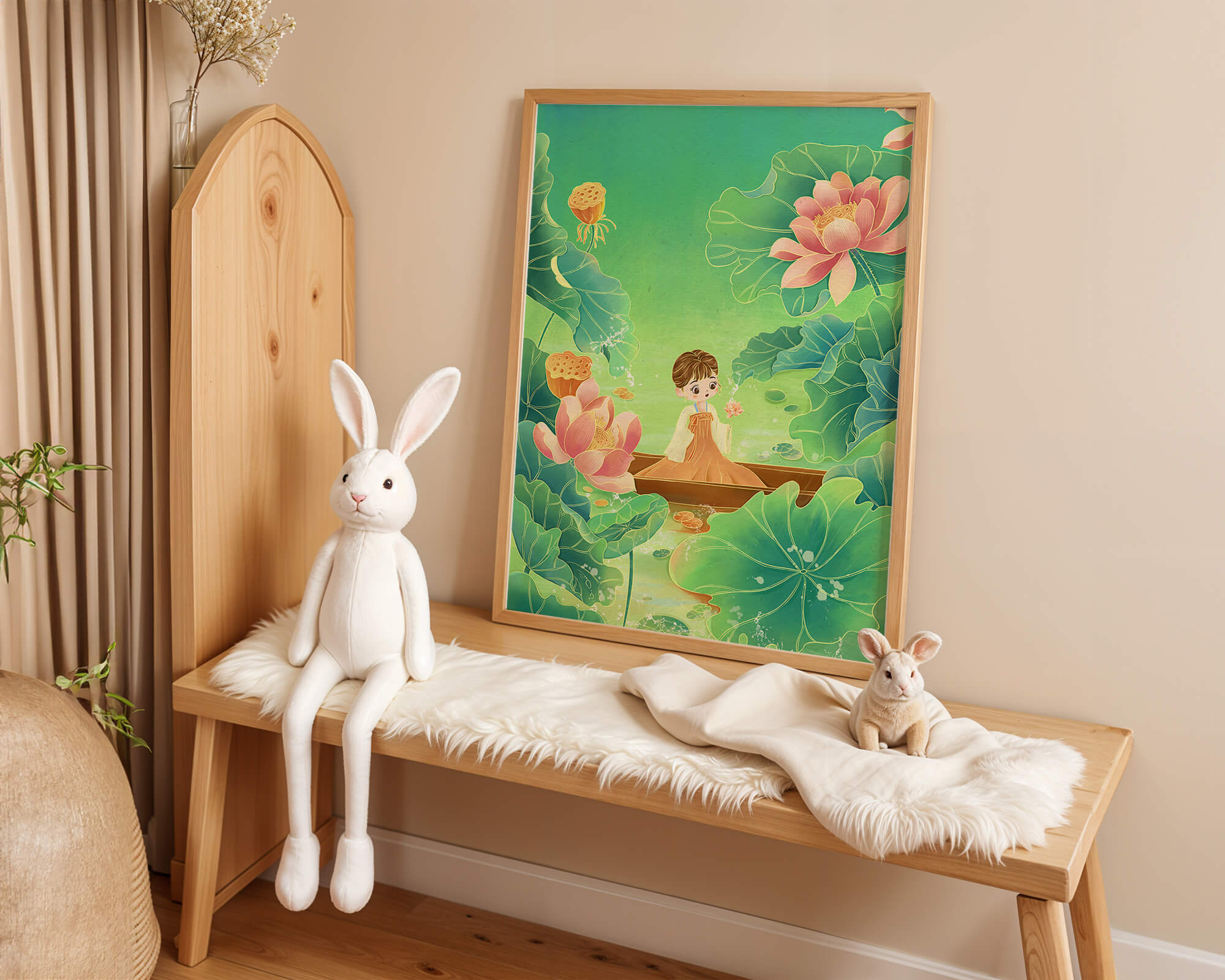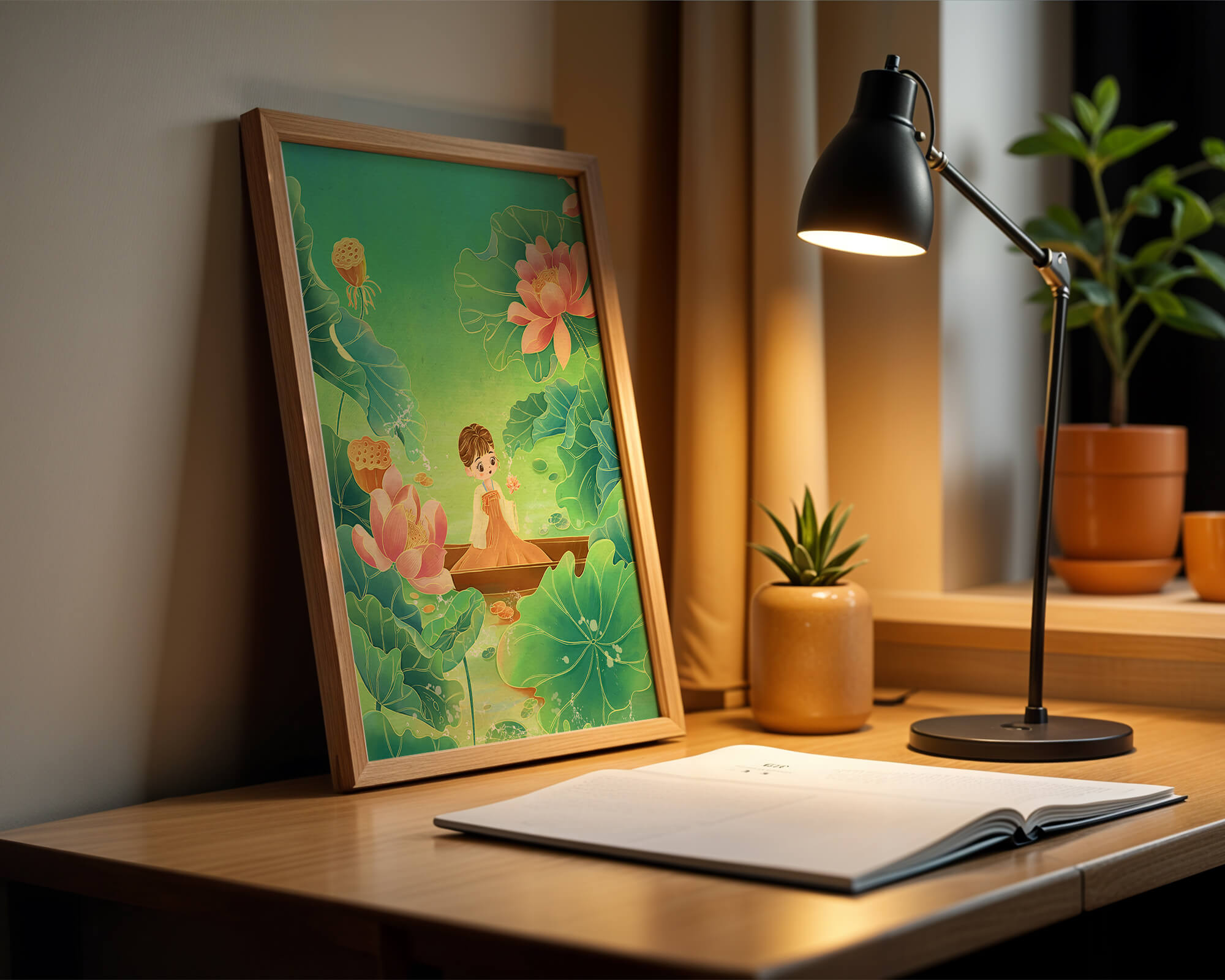 The artwork introduces a serene atmosphere, where a petite figure holds a delicate lotus flower, embodying innocence and peace. The backdrop of vibrant green leaves contrasts beautifully with the soft pink hues of blooming lotuses, enhancing the overall harmonious feel.This illustration invites viewers into a tranquil world, evoking a sense of wonder and relaxation. The gentle palette and imaginative elements make it an ideal choice for spaces aiming to inspire calmness, such as a childs room or a quiet corner dedicated to reflection.| Type |