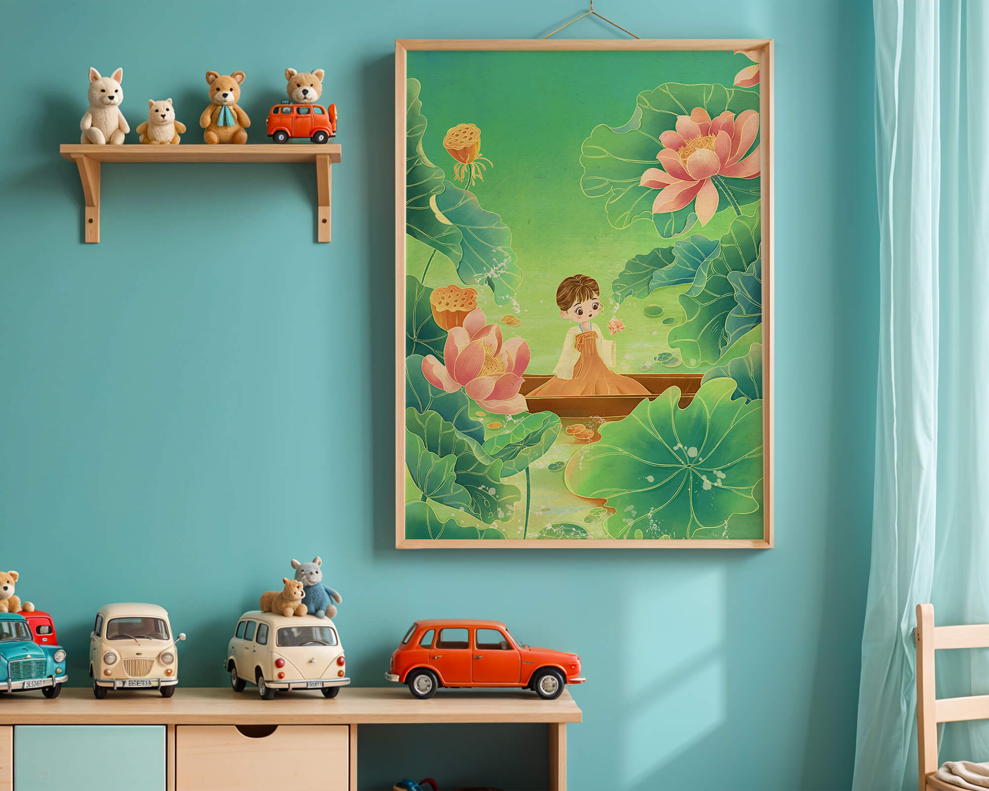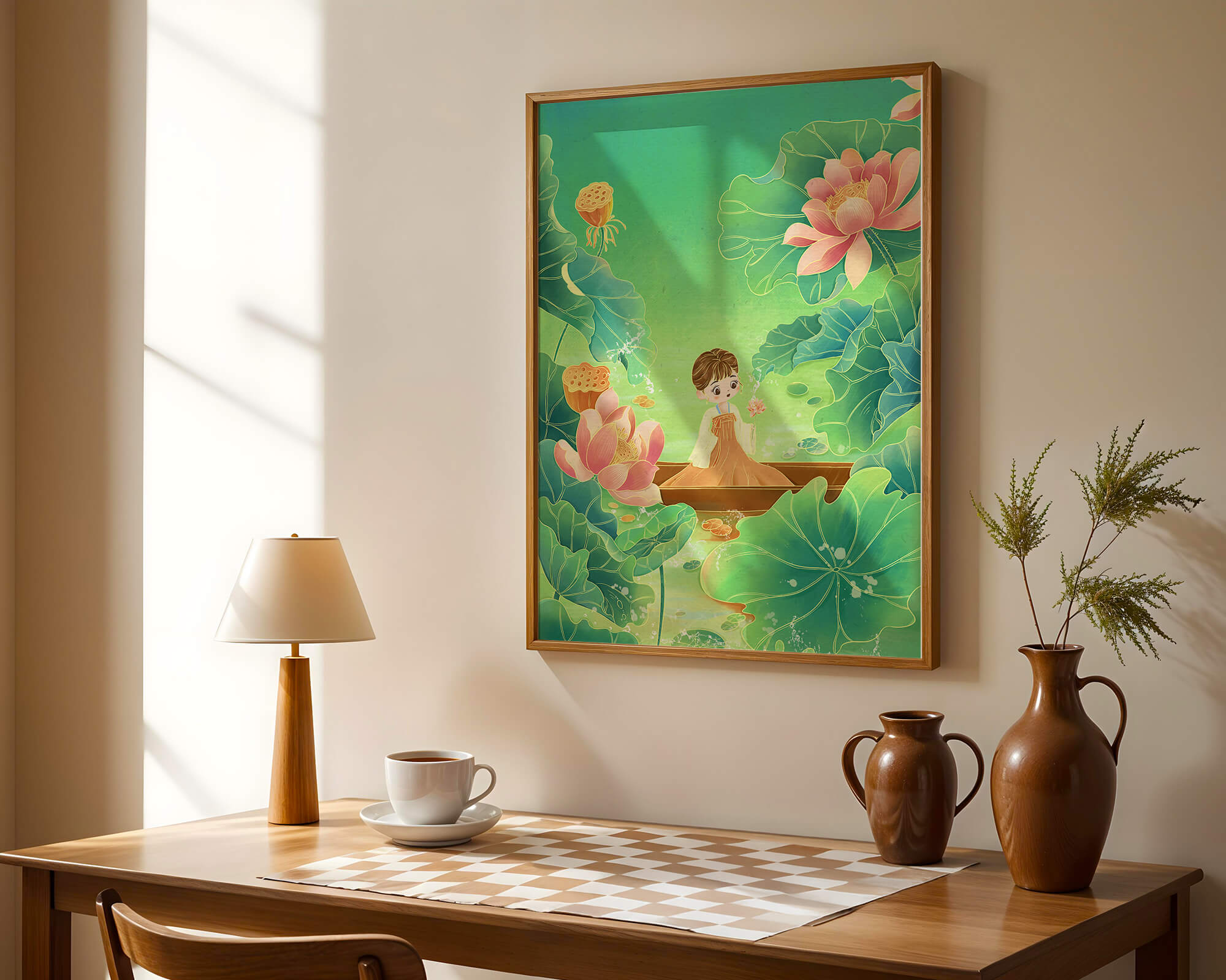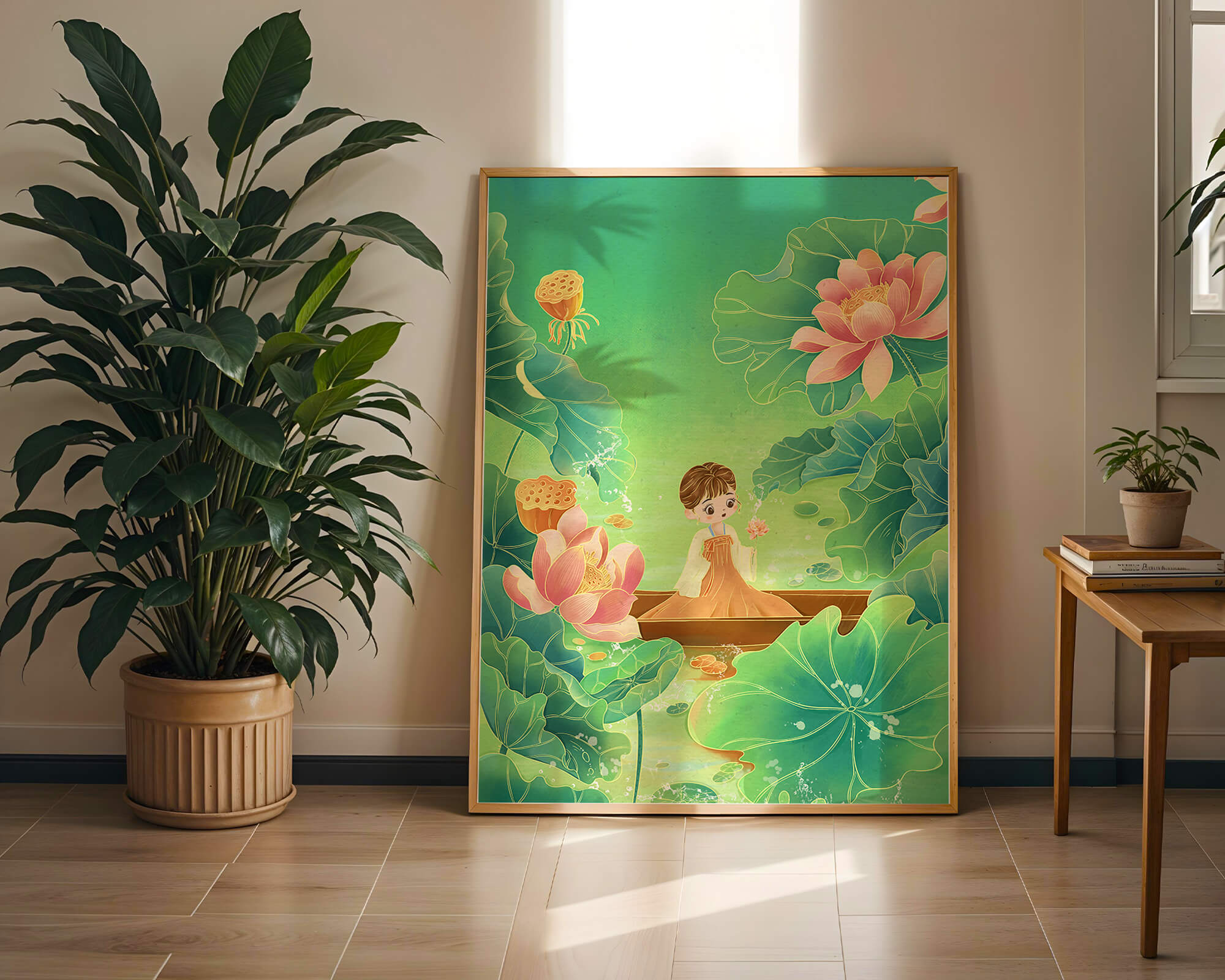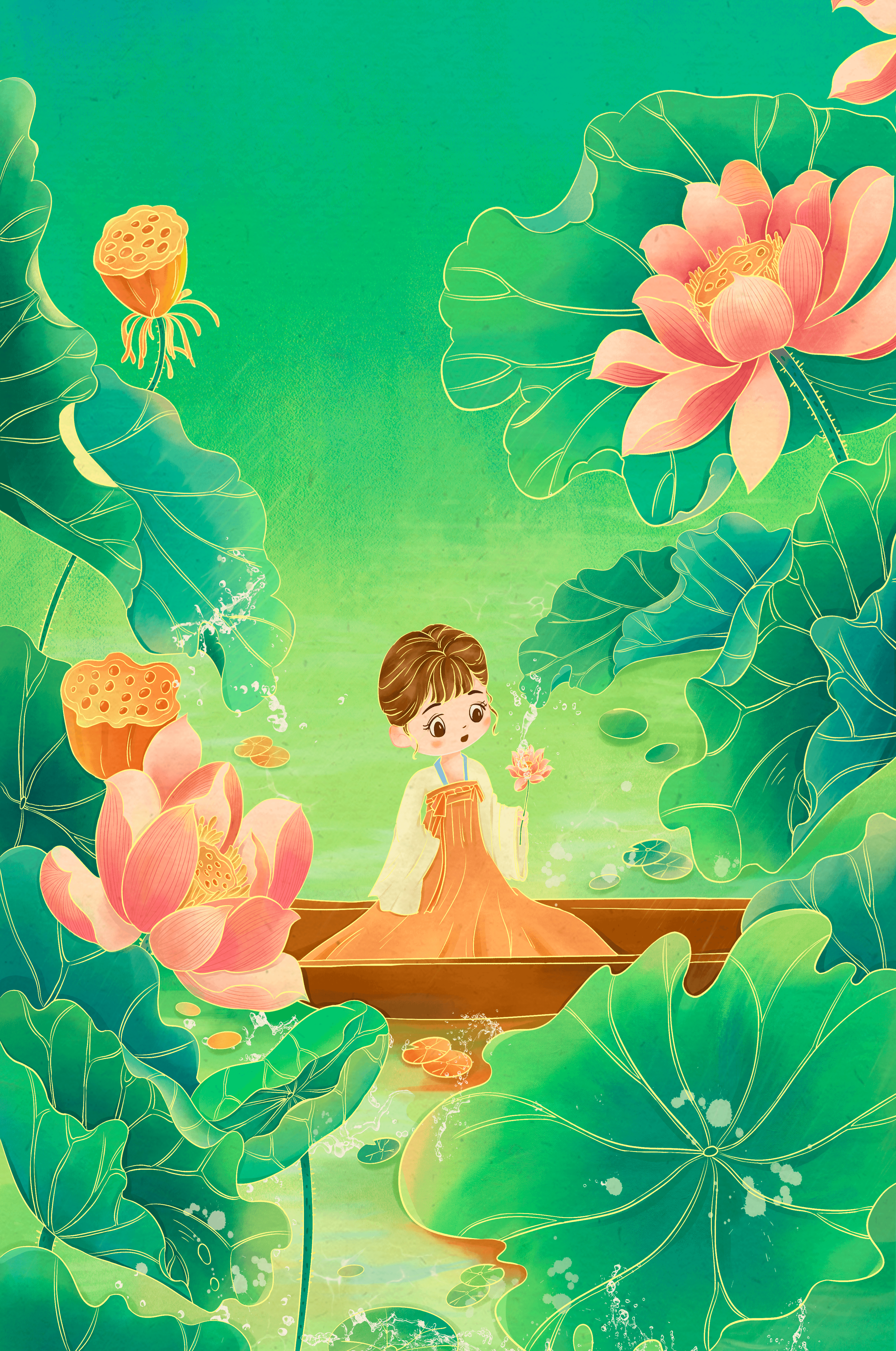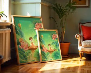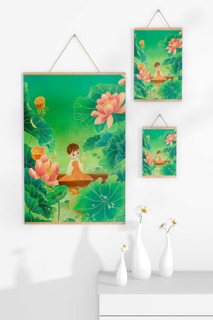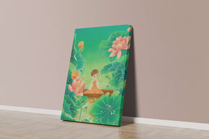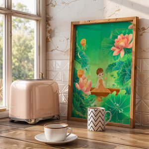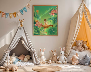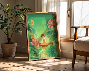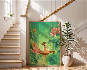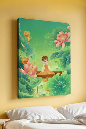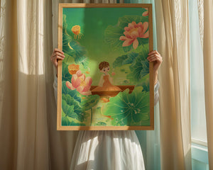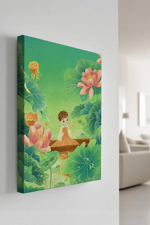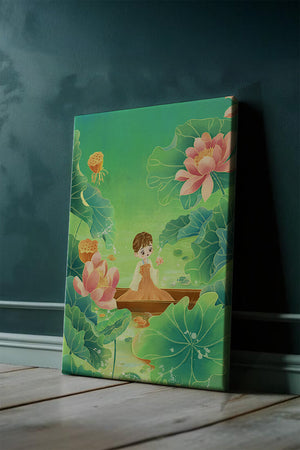 In this enchanting illustration, a young girl drifts in a wooden boat surrounded by expansive lotus flowers and lush green leaves. The scene is imbued with a calming and dreamlike quality, perfect for a childrens room or nature-themed decor.