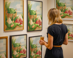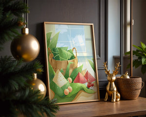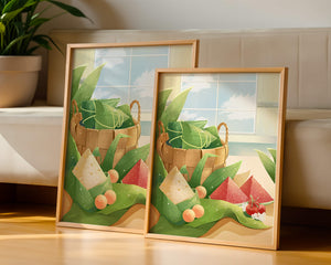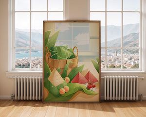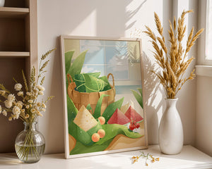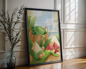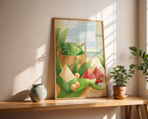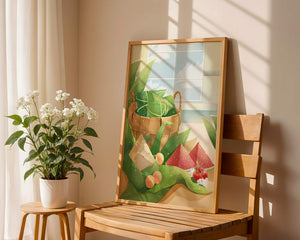 A rustic basket holds carefully wrapped items, perhaps filled with delicious surprises, adding a touch of mystery. The leaves, arranged artfully, cascade around the basket, highlighting the natural theme. The vibrant colors of the fruits—ranging from red to green—add a pop of color, enhancing the visual appeal and evoking a sense of freshness.The gentle play of light and shadow creates a serene atmosphere, making this image ideal for anyone looking to incorporate nature into their home environment. The combination of textures and hues invites viewers to imagine the soothing sounds of nature, providing a perfect escape from everyday rush.