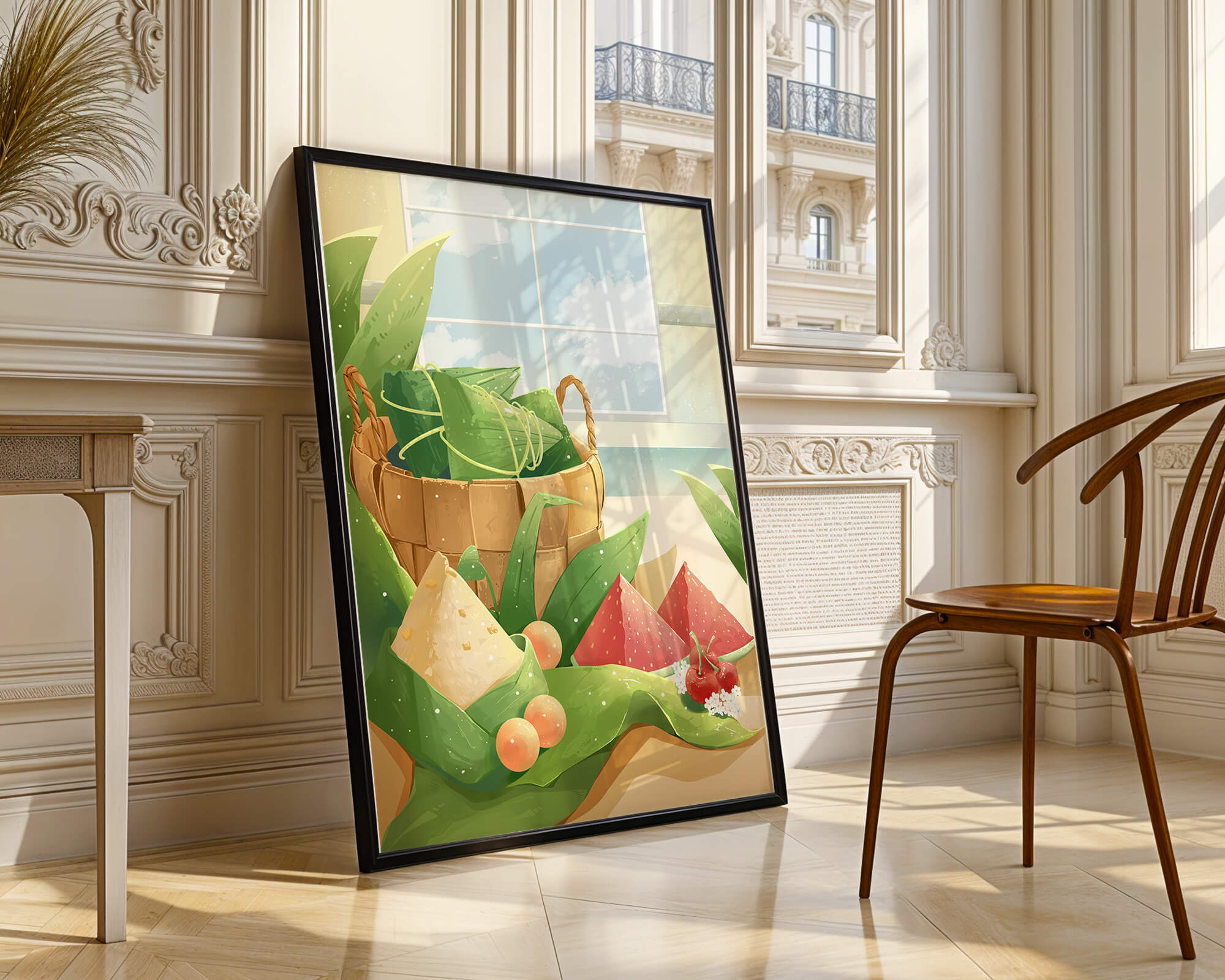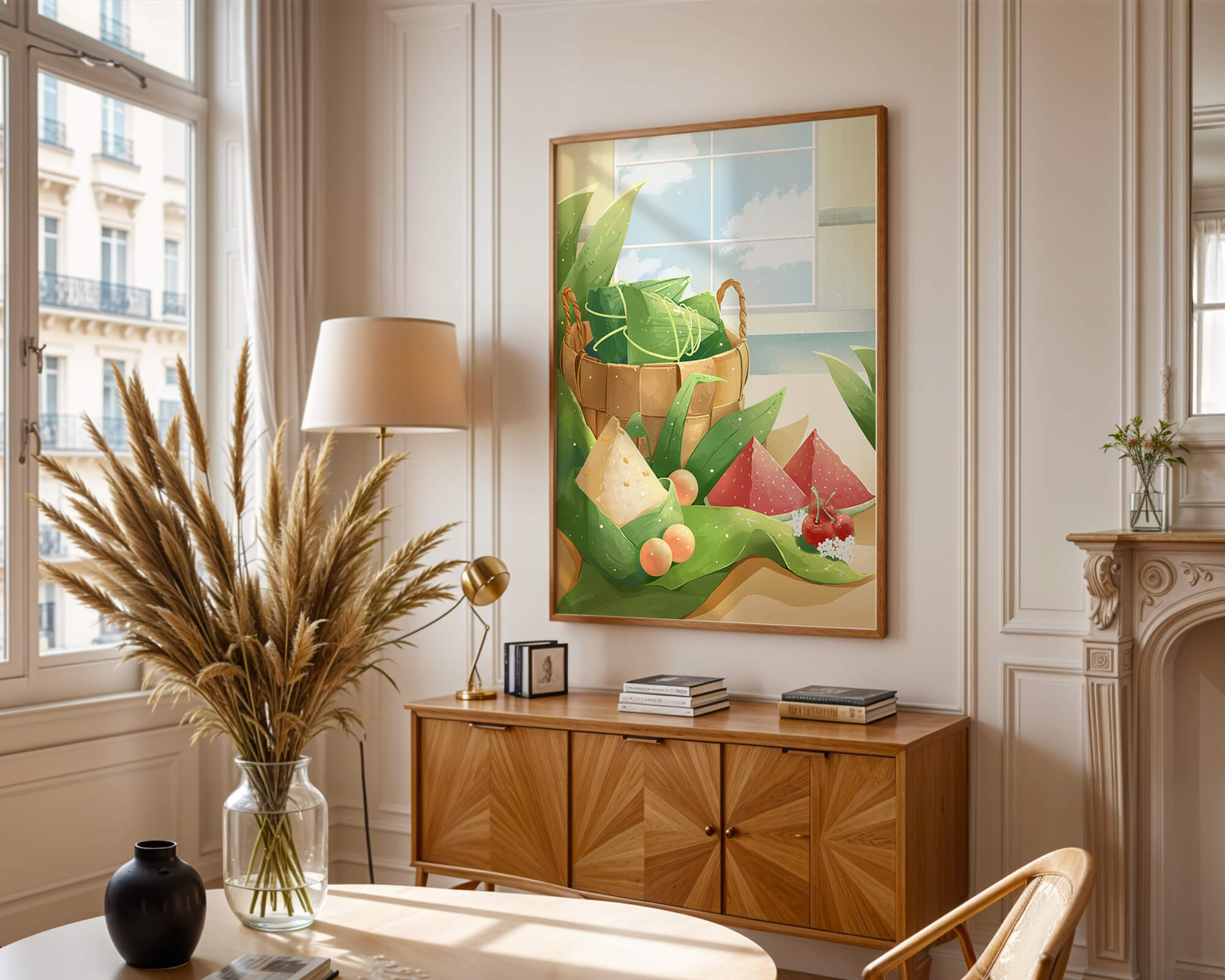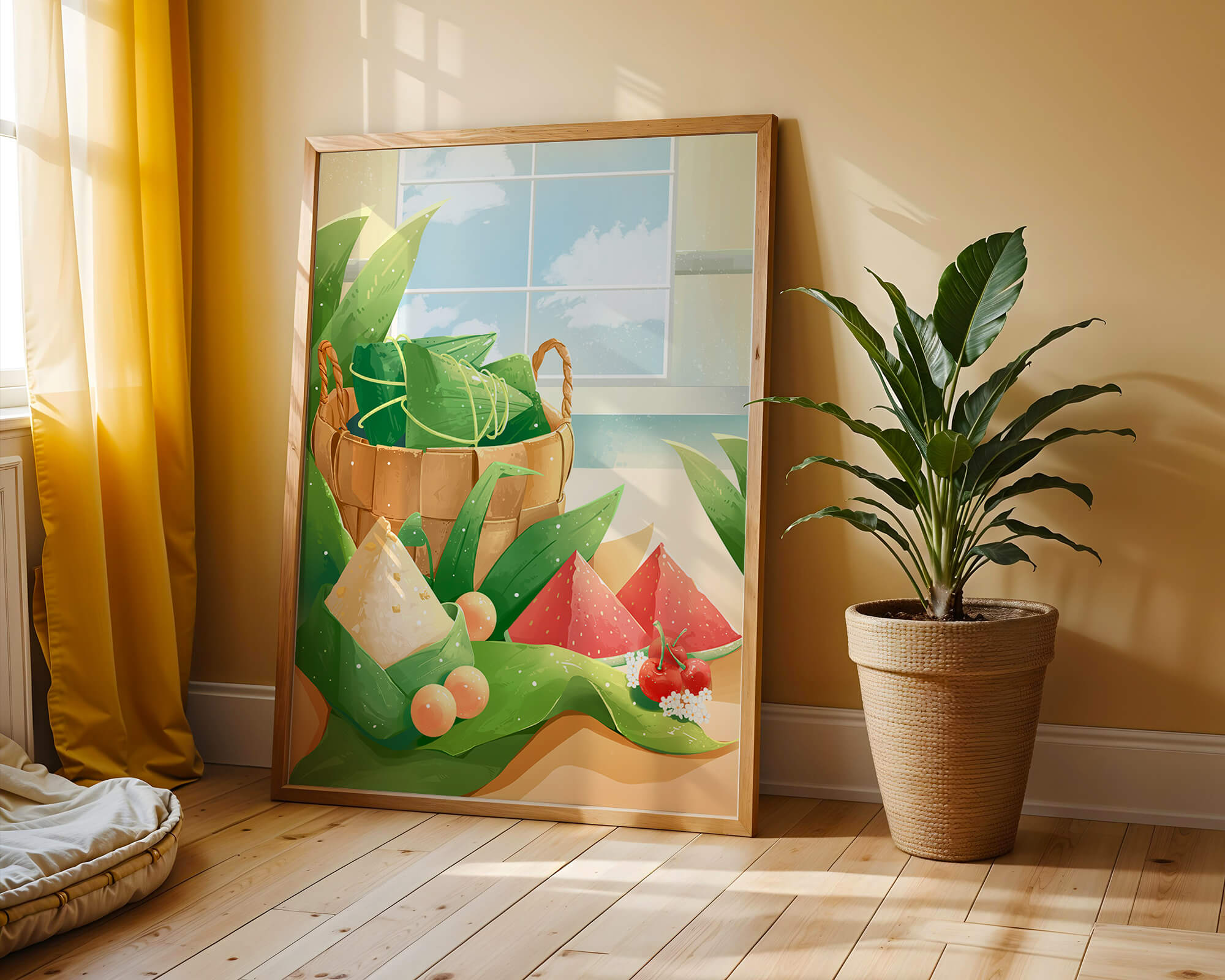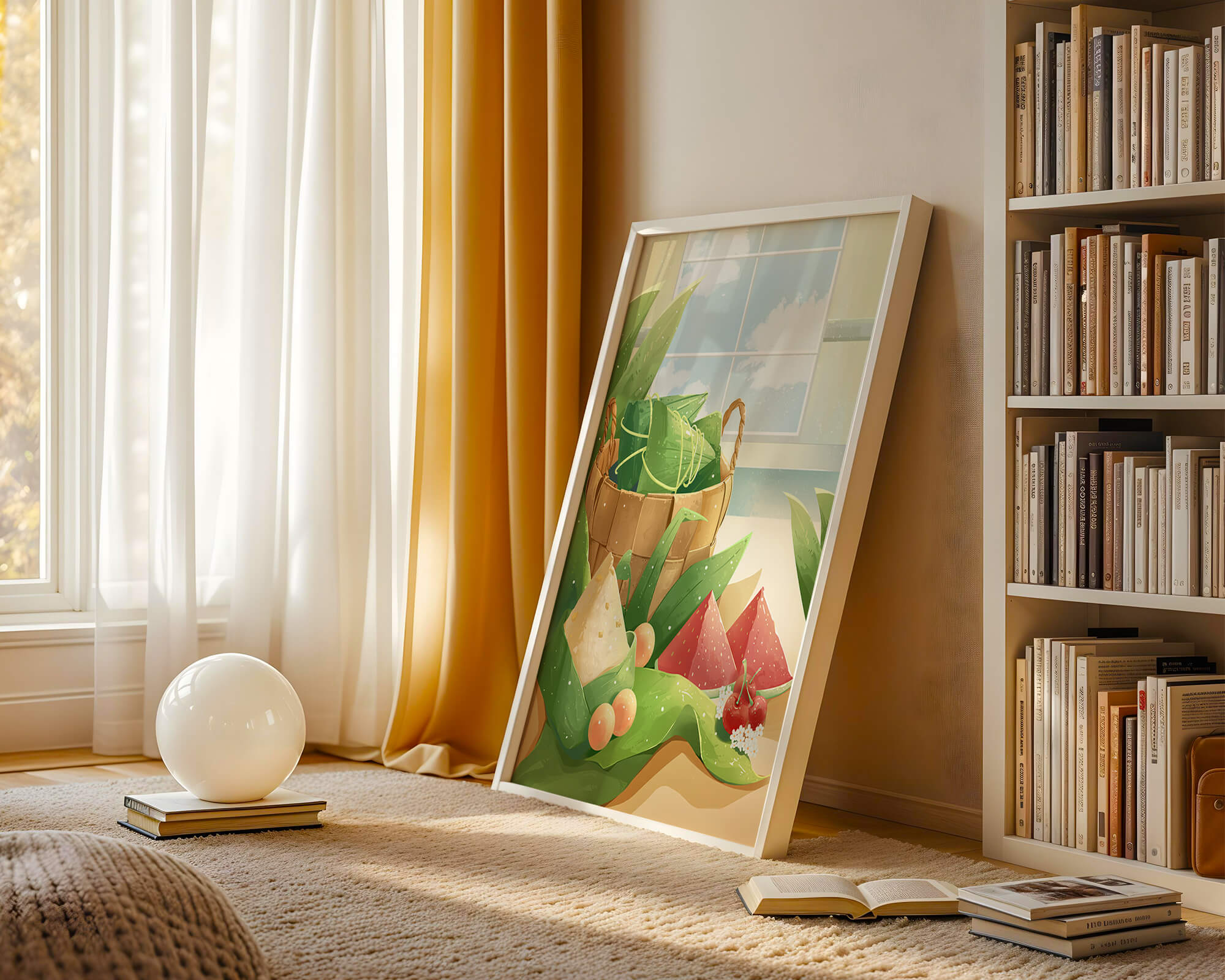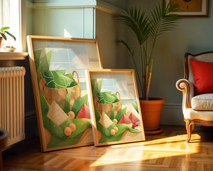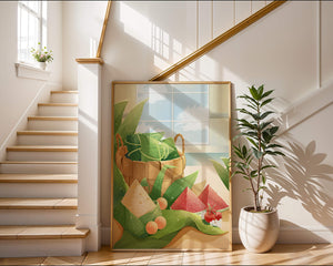 A rustic basket holds carefully wrapped items, perhaps filled with delicious surprises, adding a touch of mystery. The leaves, arranged artfully, cascade around the basket, highlighting the natural theme. The vibrant colors of the fruits—ranging from red to green—add a pop of color, enhancing the visual appeal and evoking a sense of freshness.The gentle play of light and shadow creates a serene atmosphere, making this image ideal for anyone looking to incorporate nature into their home environment. The combination of textures and hues invites viewers to imagine the soothing sounds of nature, providing a perfect escape from everyday rush.