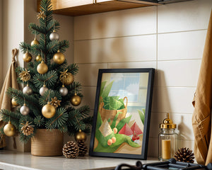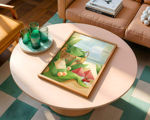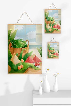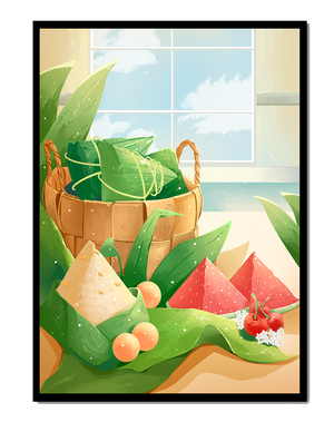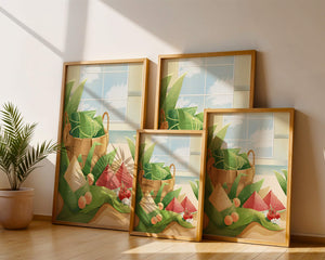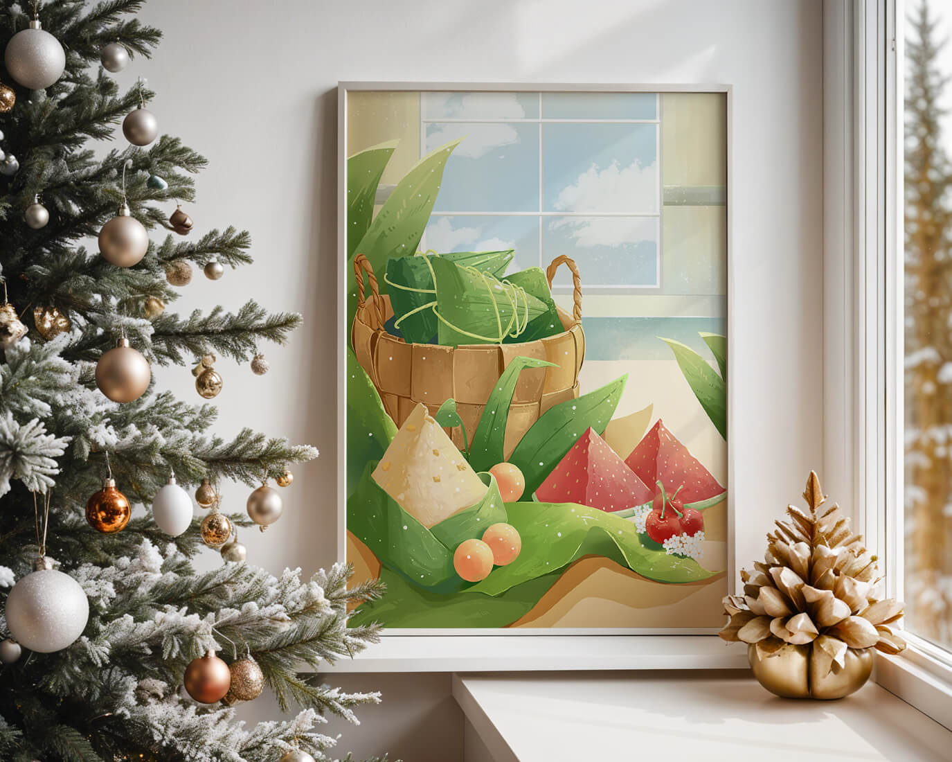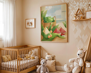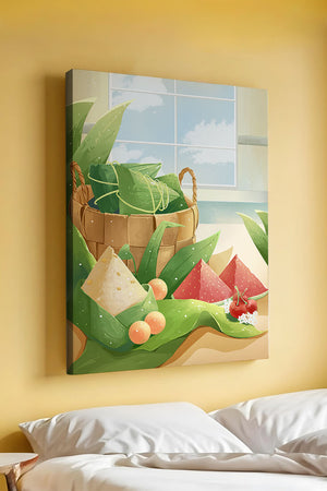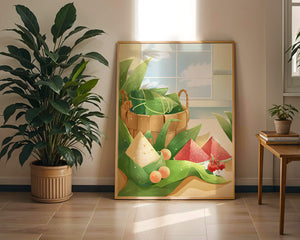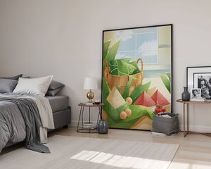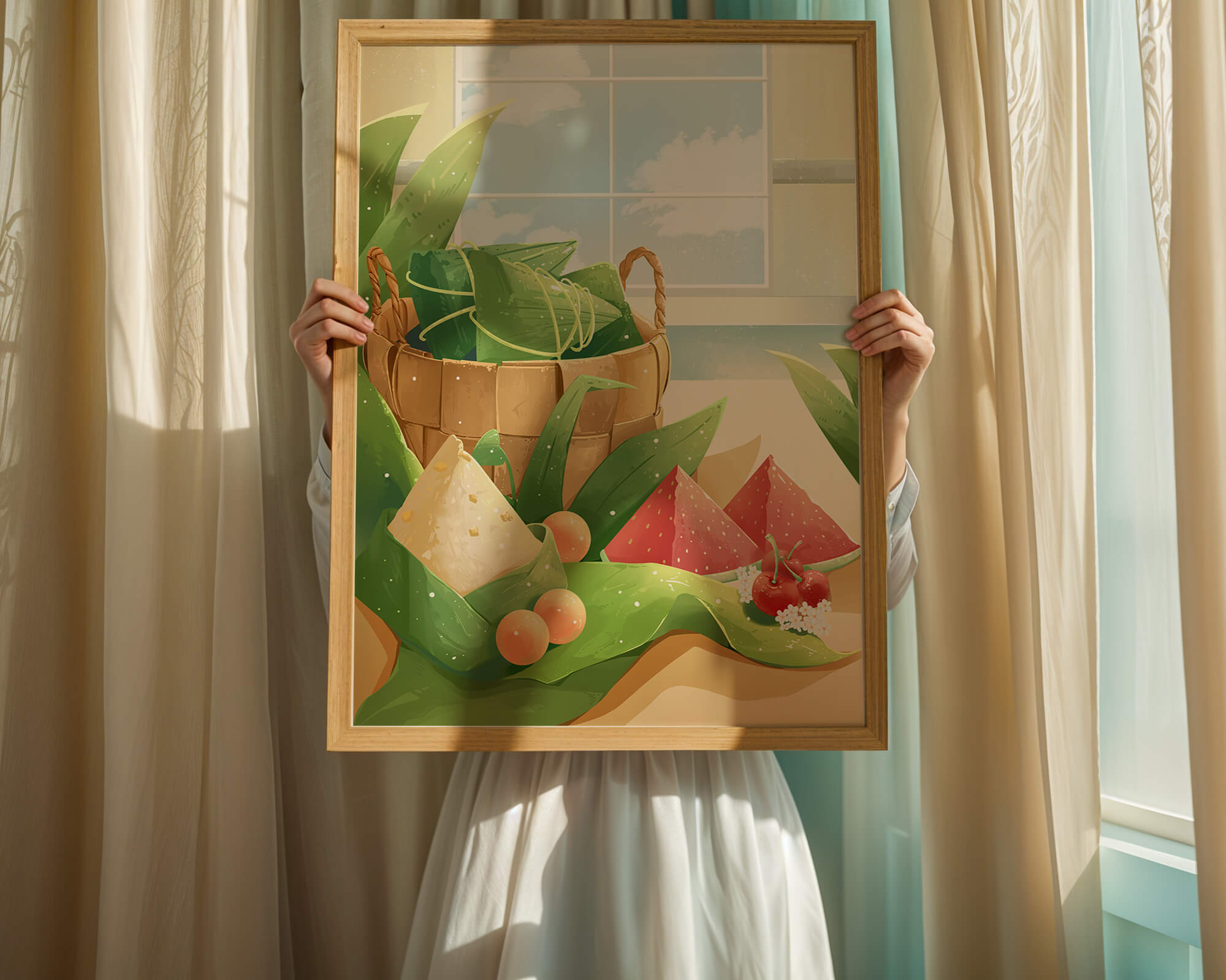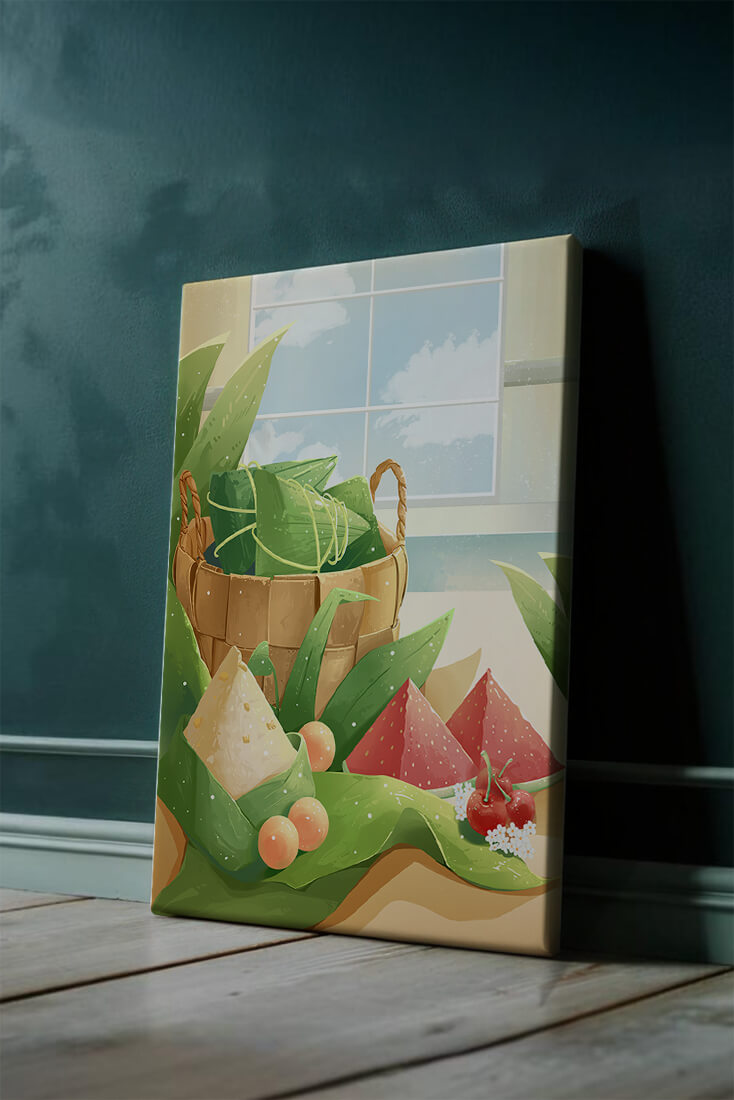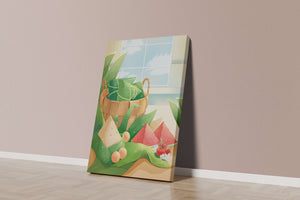 A rustic basket holds carefully wrapped items, perhaps filled with delicious surprises, adding a touch of mystery. The leaves, arranged artfully, cascade around the basket, highlighting the natural theme. The vibrant colors of the fruits—ranging from red to green—add a pop of color, enhancing the visual appeal and evoking a sense of freshness.The gentle play of light and shadow creates a serene atmosphere, making this image ideal for anyone looking to incorporate nature into their home environment. The combination of textures and hues invites viewers to imagine the soothing sounds of nature, providing a perfect escape from everyday rush.