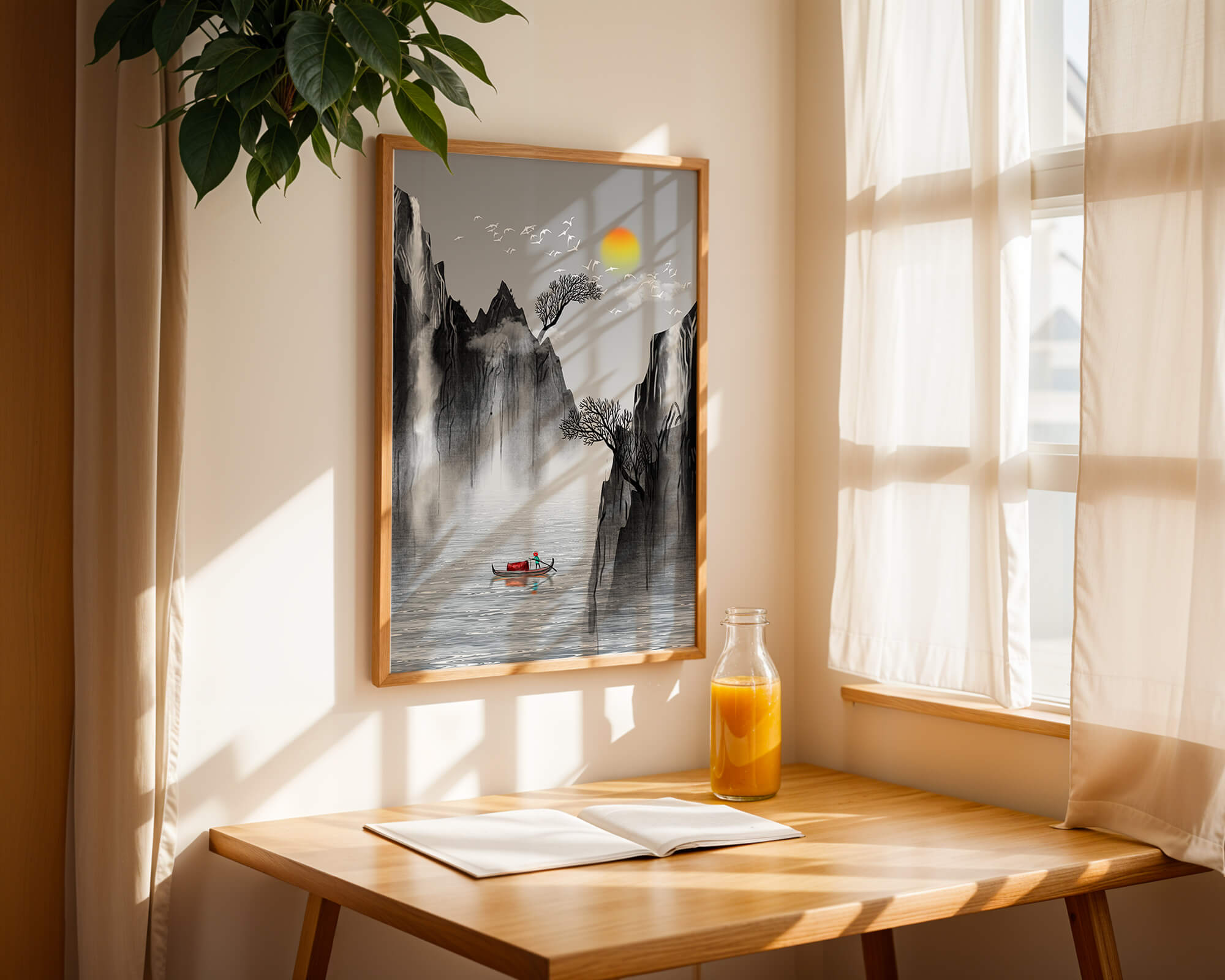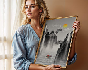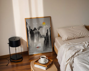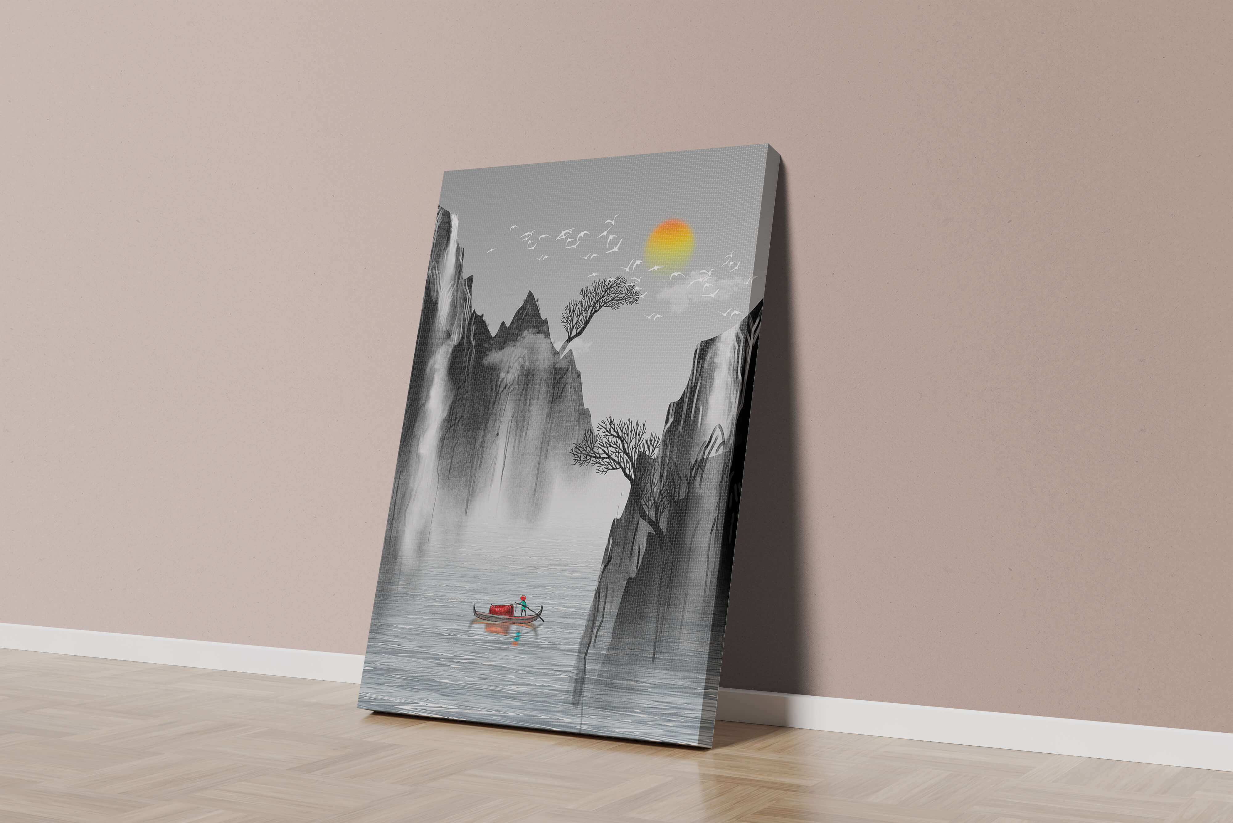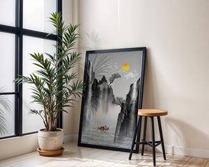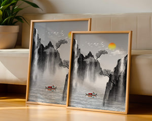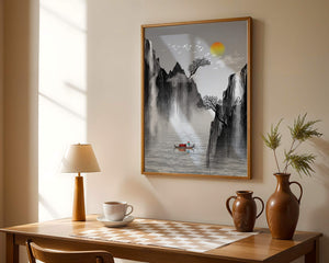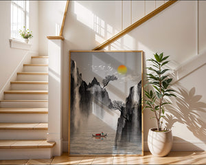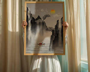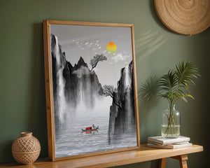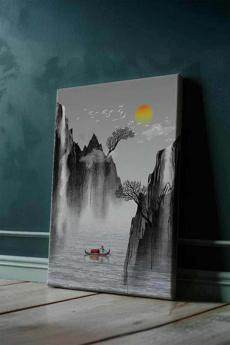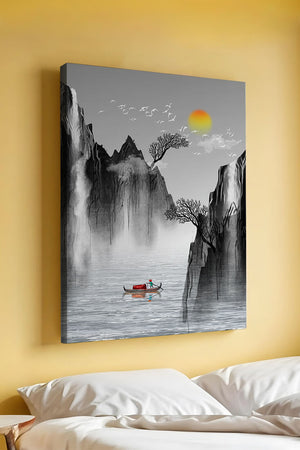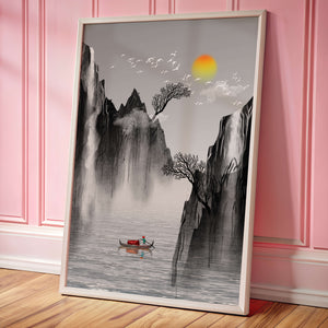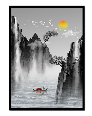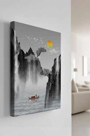 The image captures a peaceful river flowing between towering mountains, their rugged cliffs softened by the gentle cascade of waterfalls. These miniature torrents add a dynamic contrast to the stillness of the scene, further highlighted by the mist that delicately veils the rugged mountain surfaces.Above, the warm glow of the rising sun casts a soft light on the scene, silhouetting the graceful flight of birds across the sky. The inclusion of the lone boat suggests both exploration and solitude, enhancing the image’s calming qualities. Together, these elements create a harmonious depiction of natures serene beauty, making it an ideal addition to any living space aiming to evoke tranquility| Type |