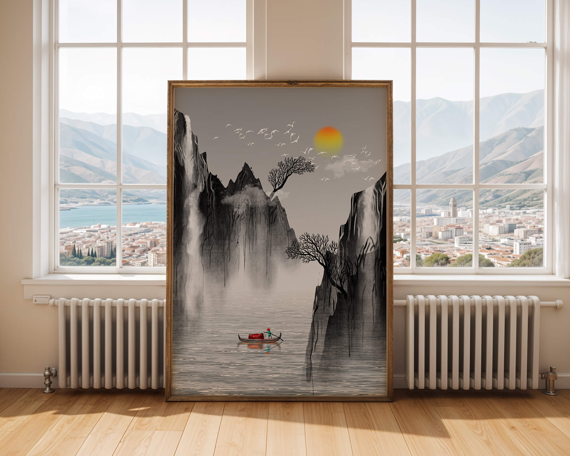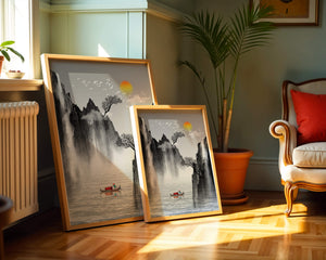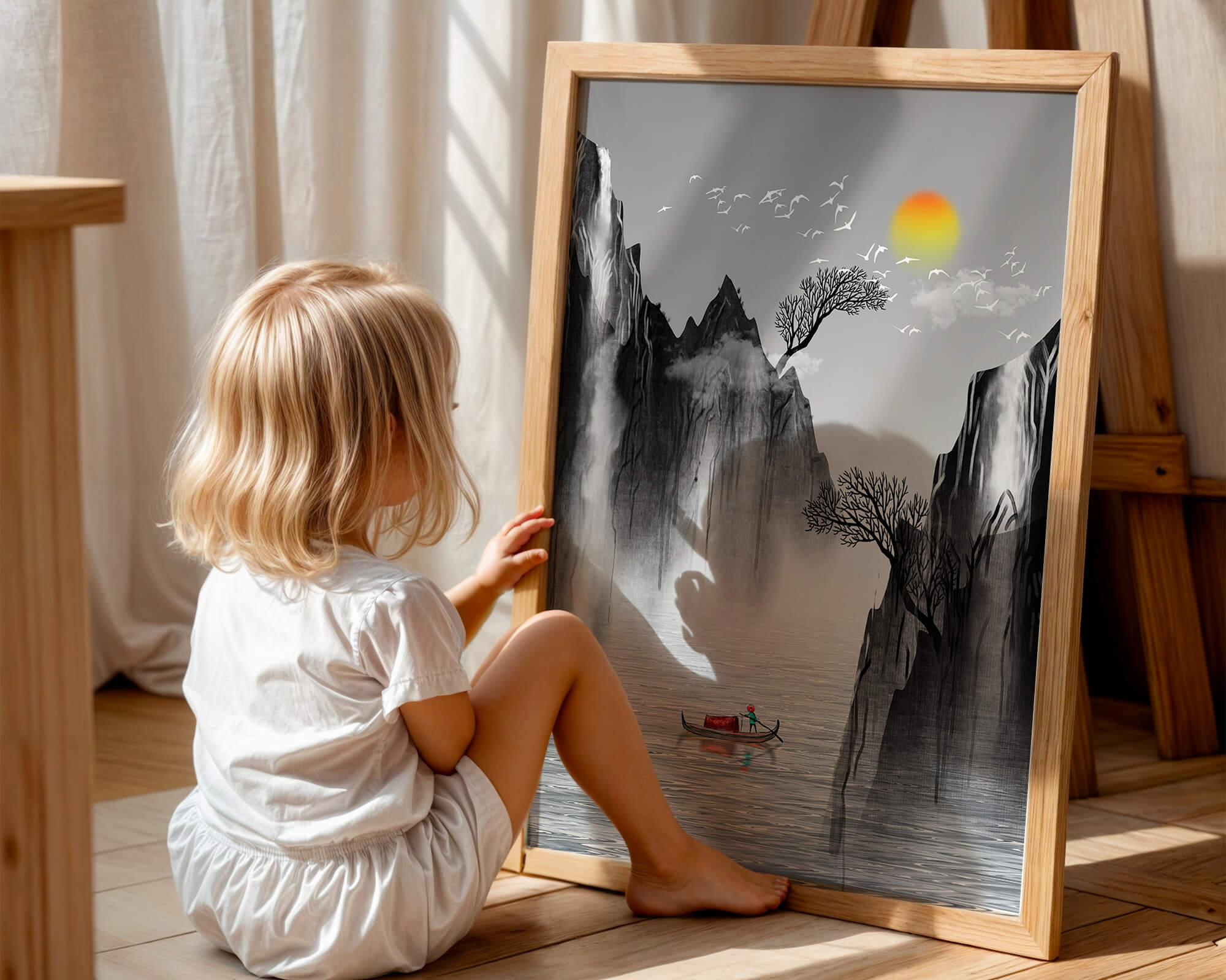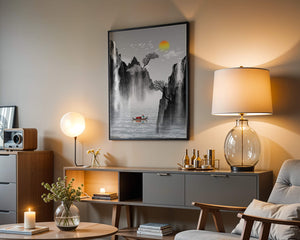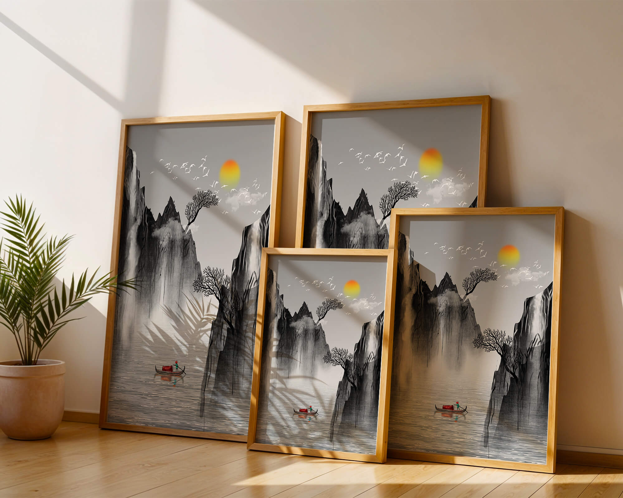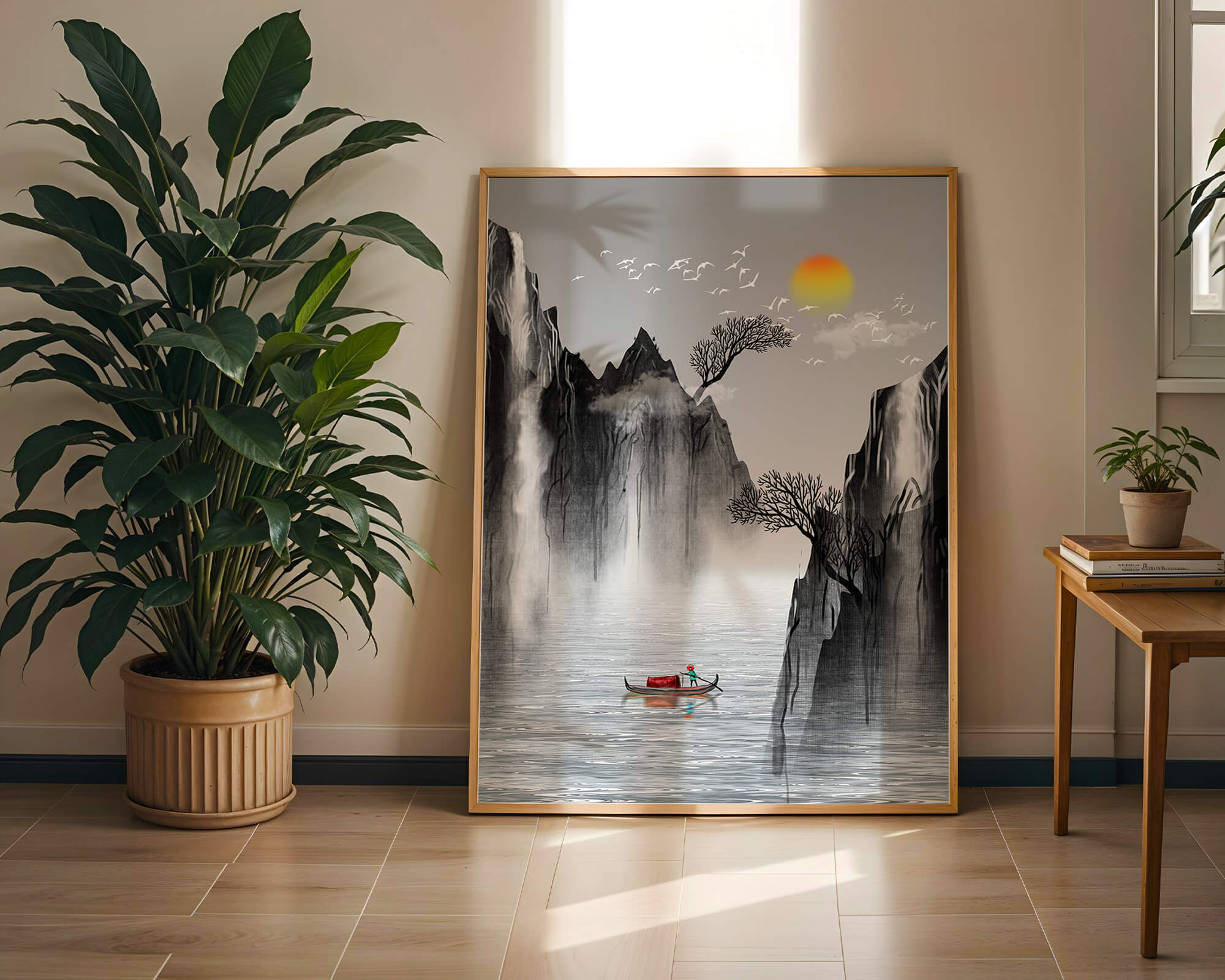 The image captures a peaceful river flowing between towering mountains, their rugged cliffs softened by the gentle cascade of waterfalls. These miniature torrents add a dynamic contrast to the stillness of the scene, further highlighted by the mist that delicately veils the rugged mountain surfaces.Above, the warm glow of the rising sun casts a soft light on the scene, silhouetting the graceful flight of birds across the sky. The inclusion of the lone boat suggests both exploration and solitude, enhancing the image’s calming qualities. Together, these elements create a harmonious depiction of natures serene beauty, making it an ideal addition to any living space aiming to evoke tranquility| Type |