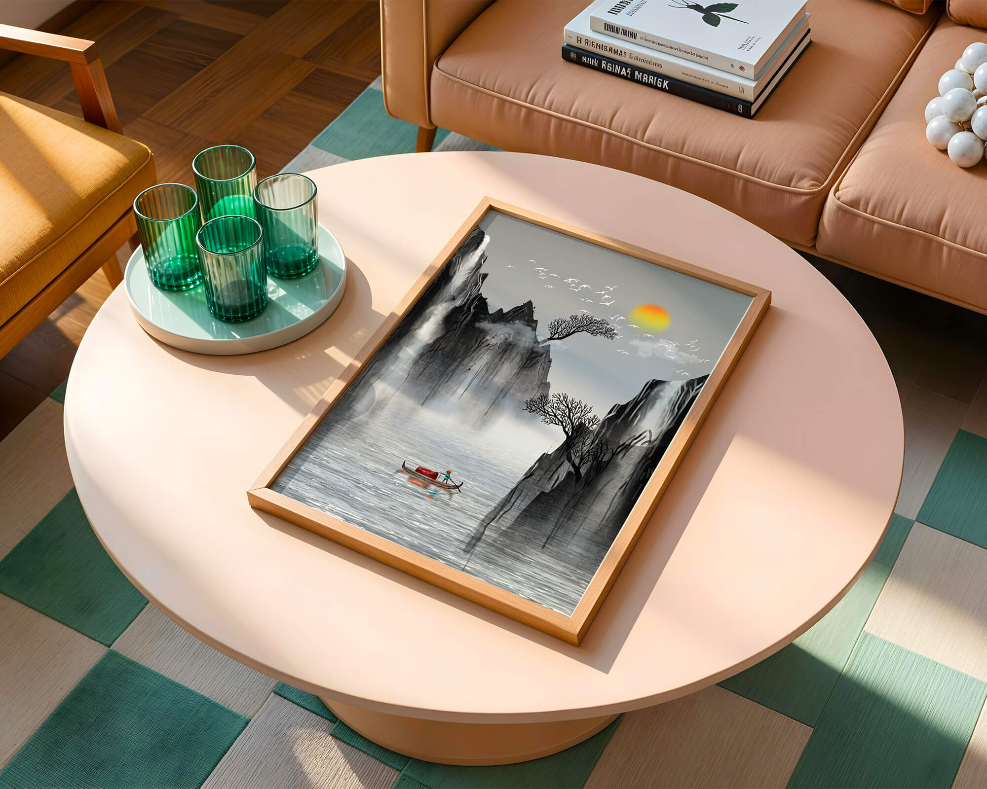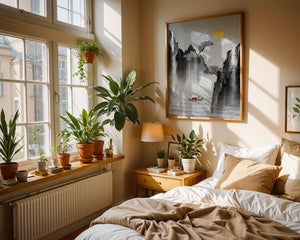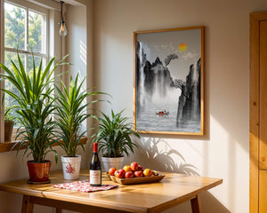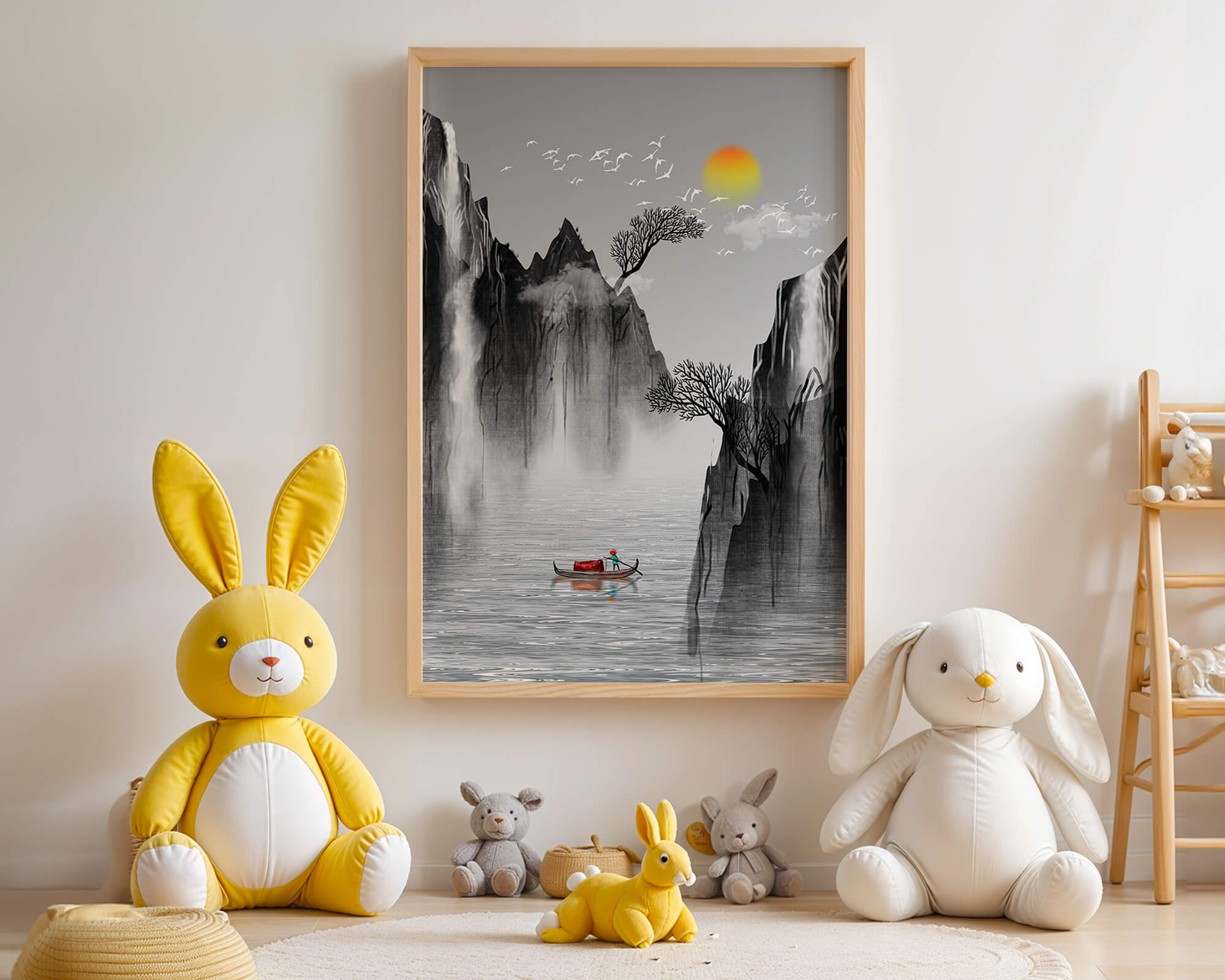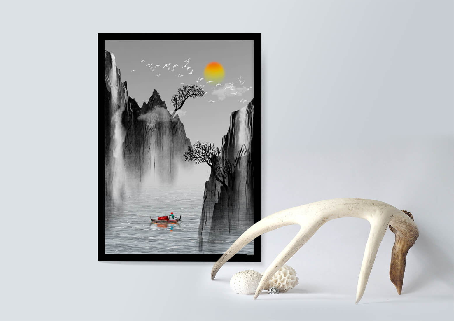 The image captures a peaceful river flowing between towering mountains, their rugged cliffs softened by the gentle cascade of waterfalls. These miniature torrents add a dynamic contrast to the stillness of the scene, further highlighted by the mist that delicately veils the rugged mountain surfaces.Above, the warm glow of the rising sun casts a soft light on the scene, silhouetting the graceful flight of birds across the sky. The inclusion of the lone boat suggests both exploration and solitude, enhancing the image’s calming qualities. Together, these elements create a harmonious depiction of natures serene beauty, making it an ideal addition to any living space aiming to evoke tranquility| Type |