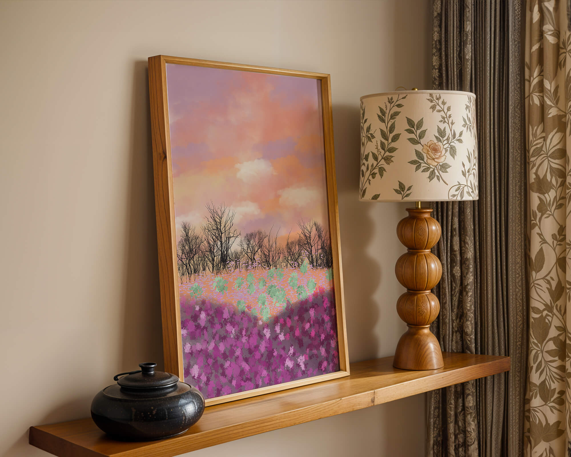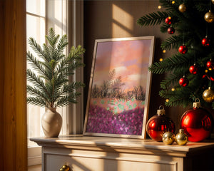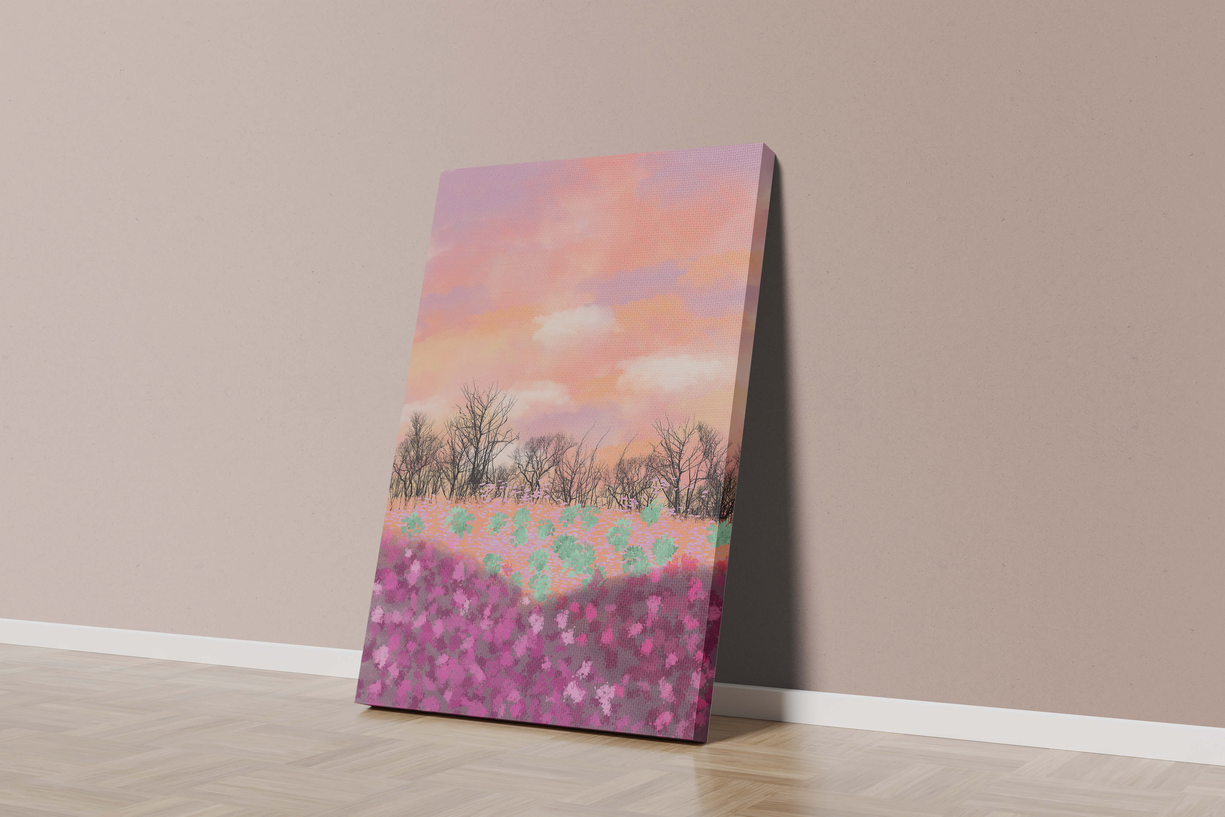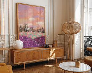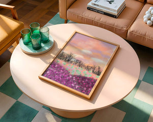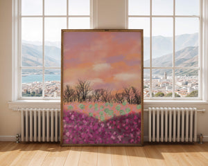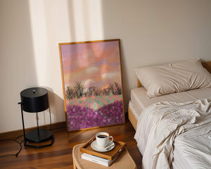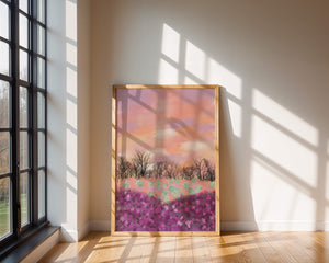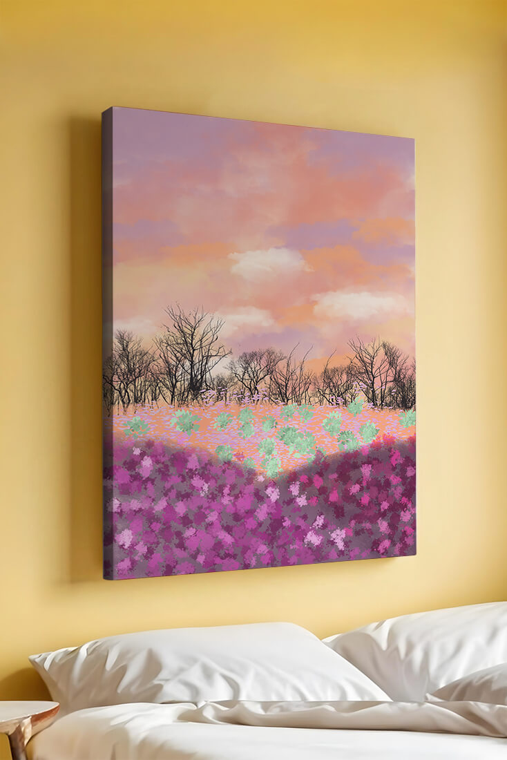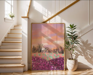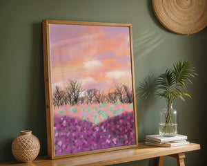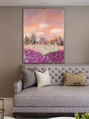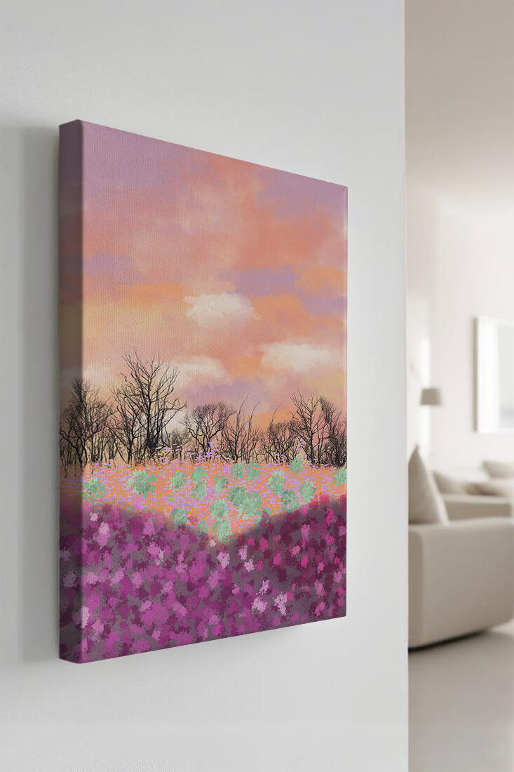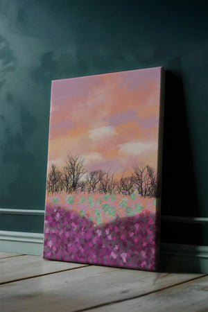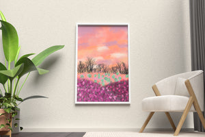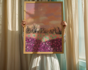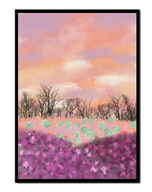 This artwork captures a serene landscape featuring a colorful field covered with pink and purple flowers. The bare trees stand in stark contrast to the vibrant floral display, adding depth to the composition. Above, a beautiful pastel-colored sky of oranges and purples stretches across the horizon.