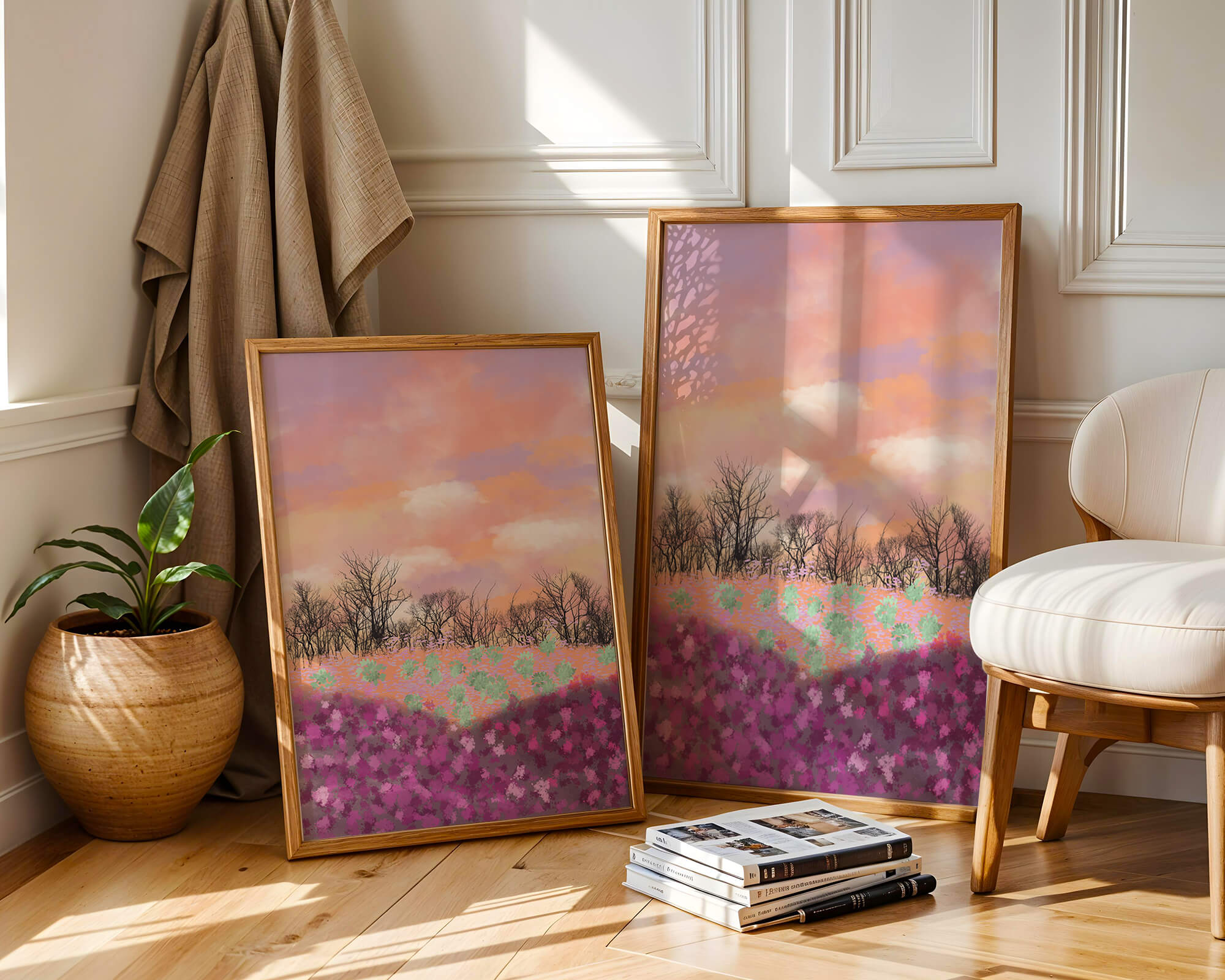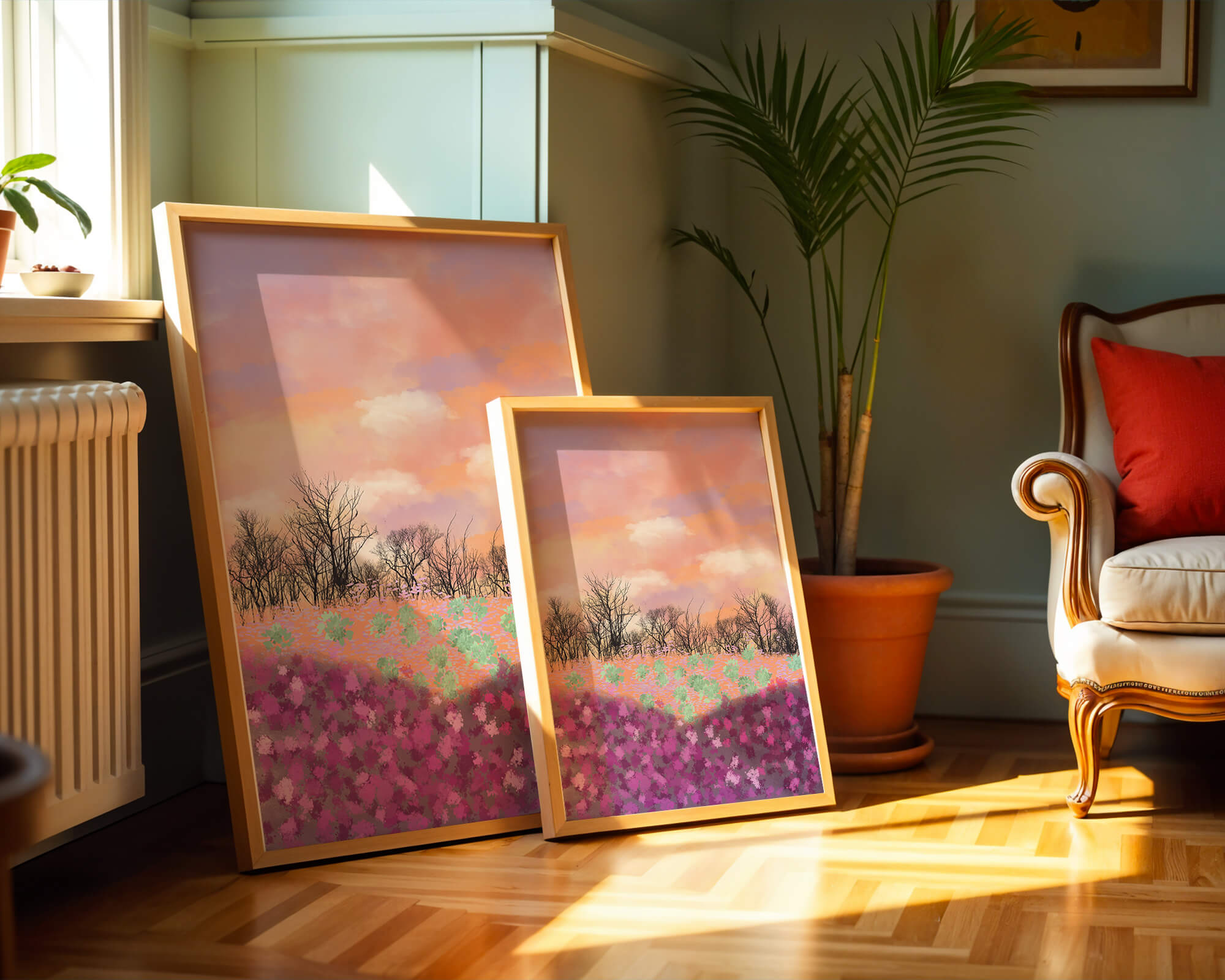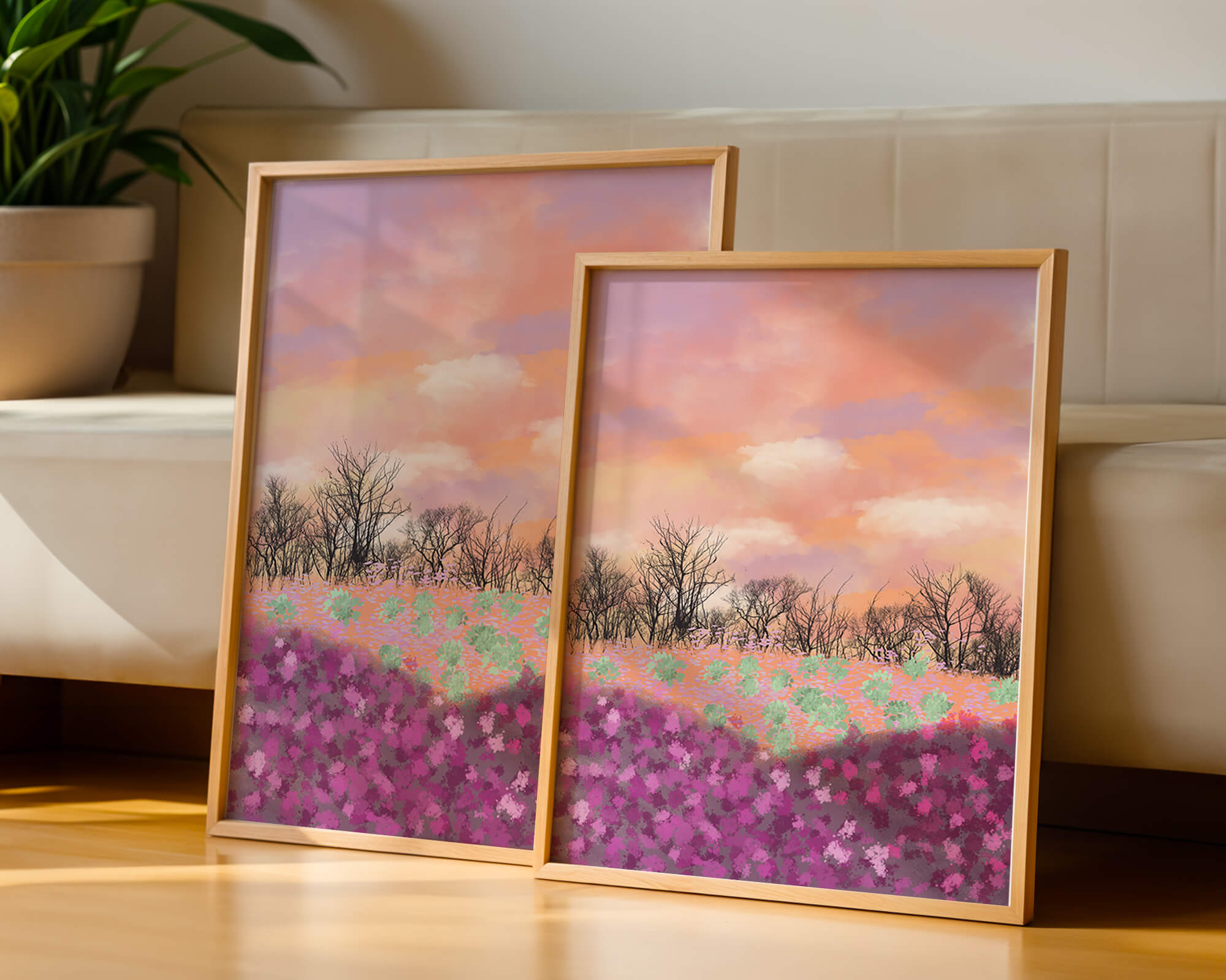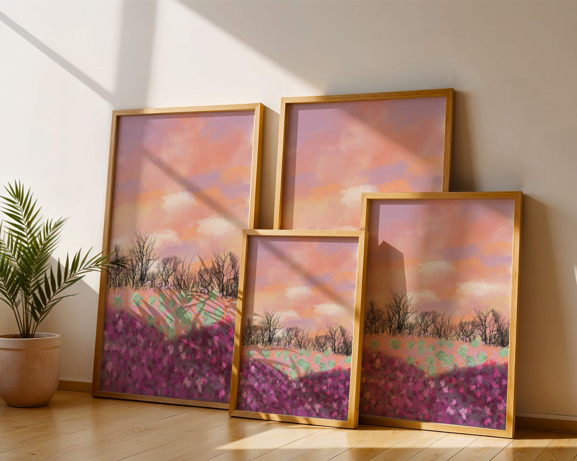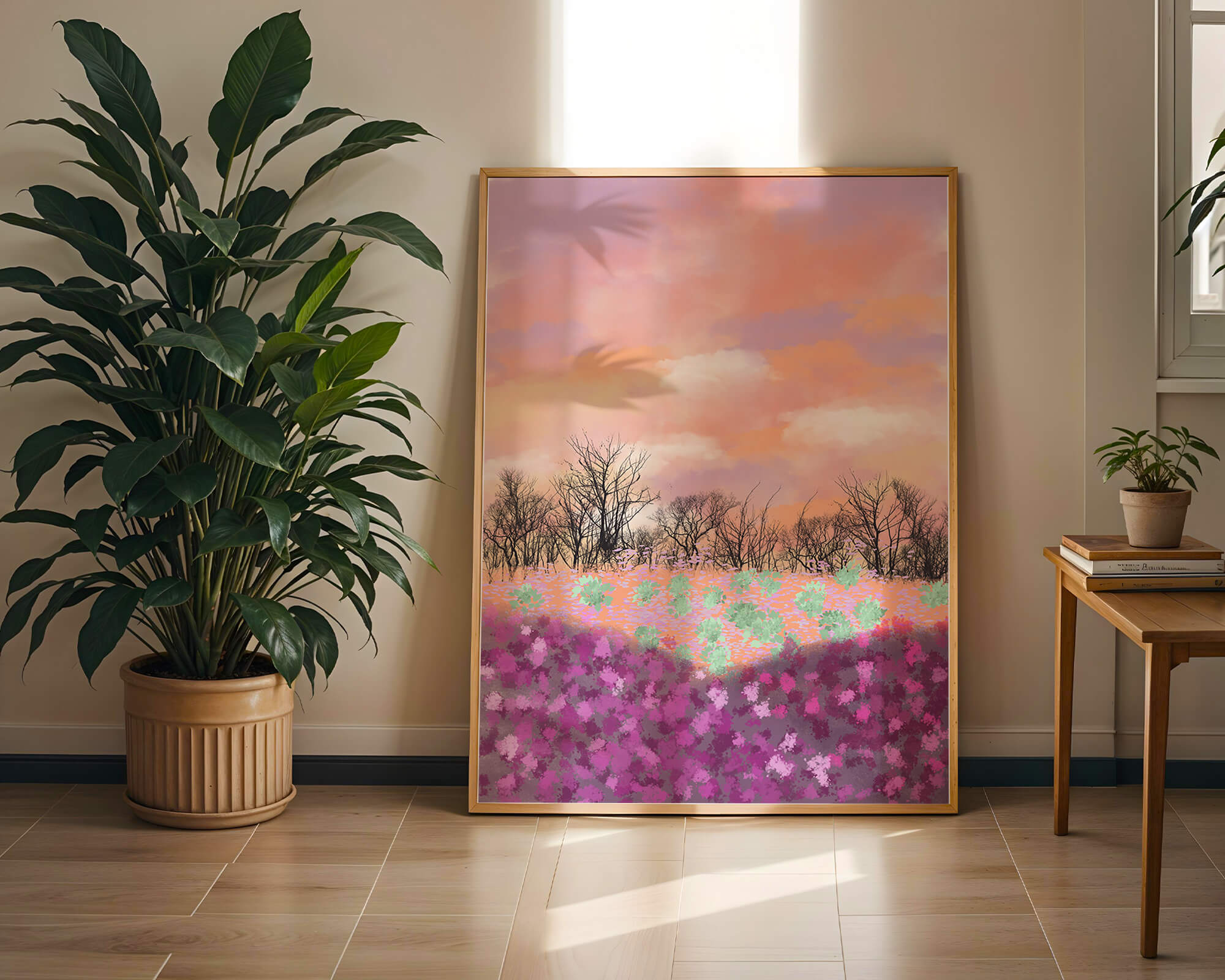 This artwork captures a serene landscape featuring a colorful field covered with pink and purple flowers. The bare trees stand in stark contrast to the vibrant floral display, adding depth to the composition. Above, a beautiful pastel-colored sky of oranges and purples stretches across the horizon.