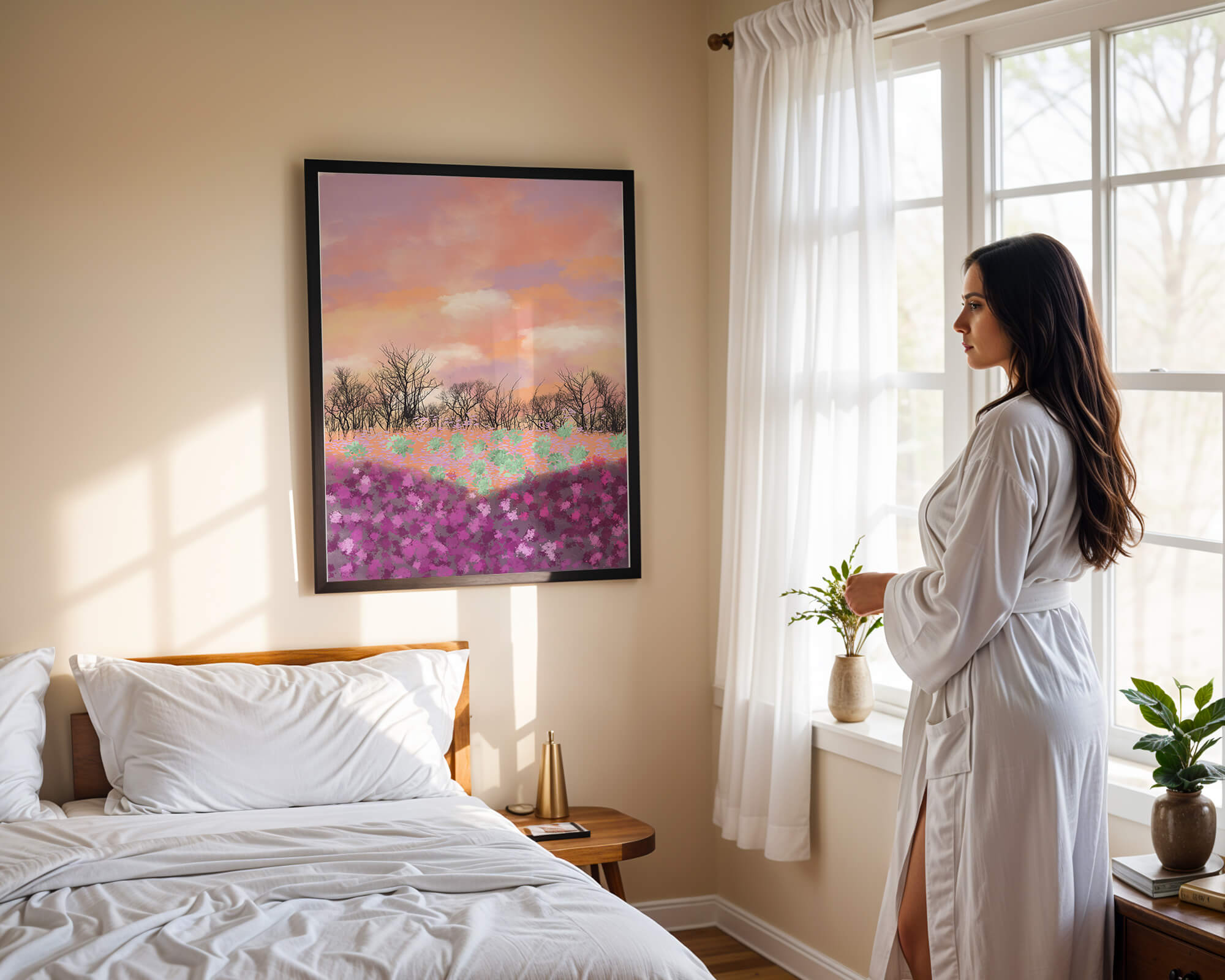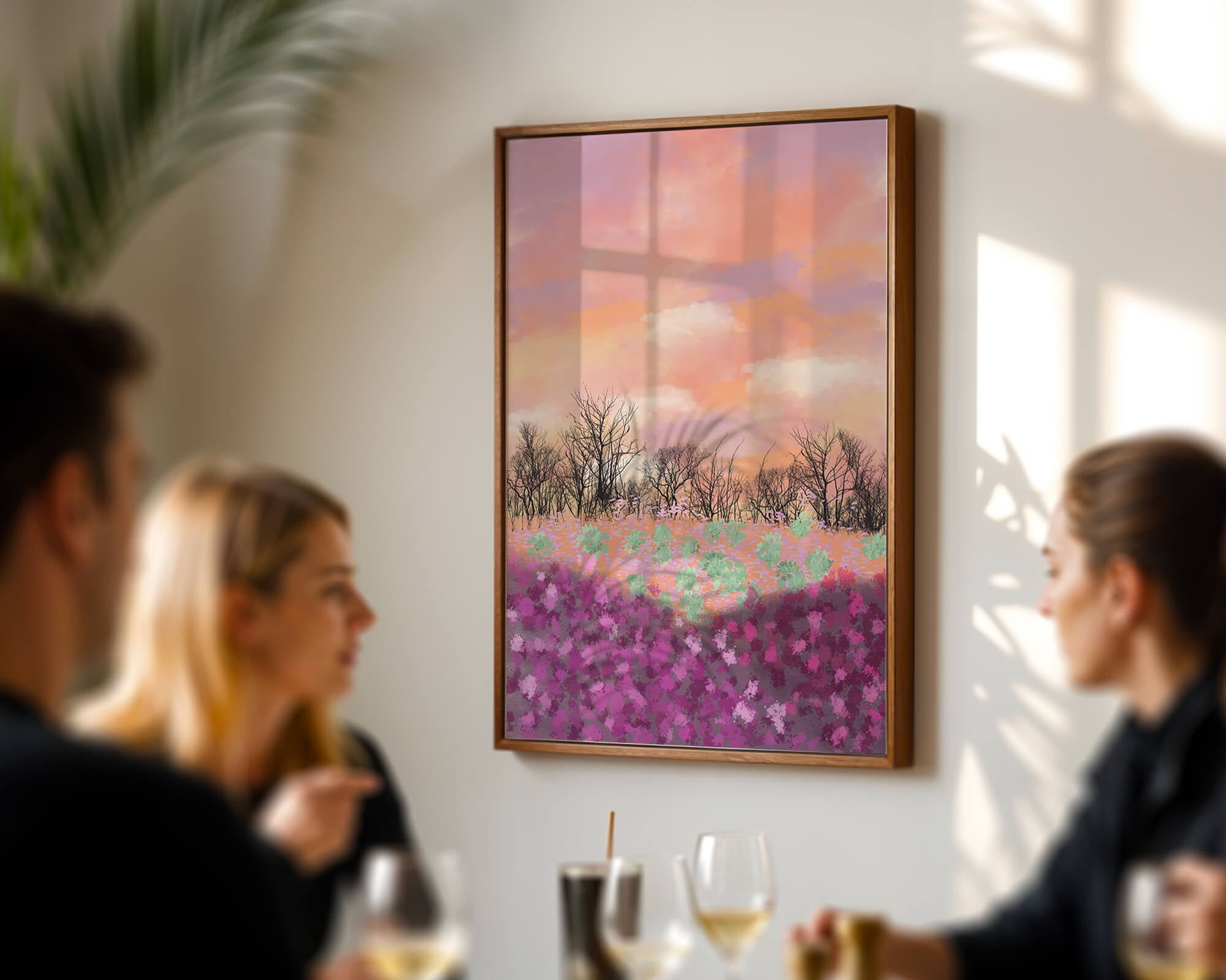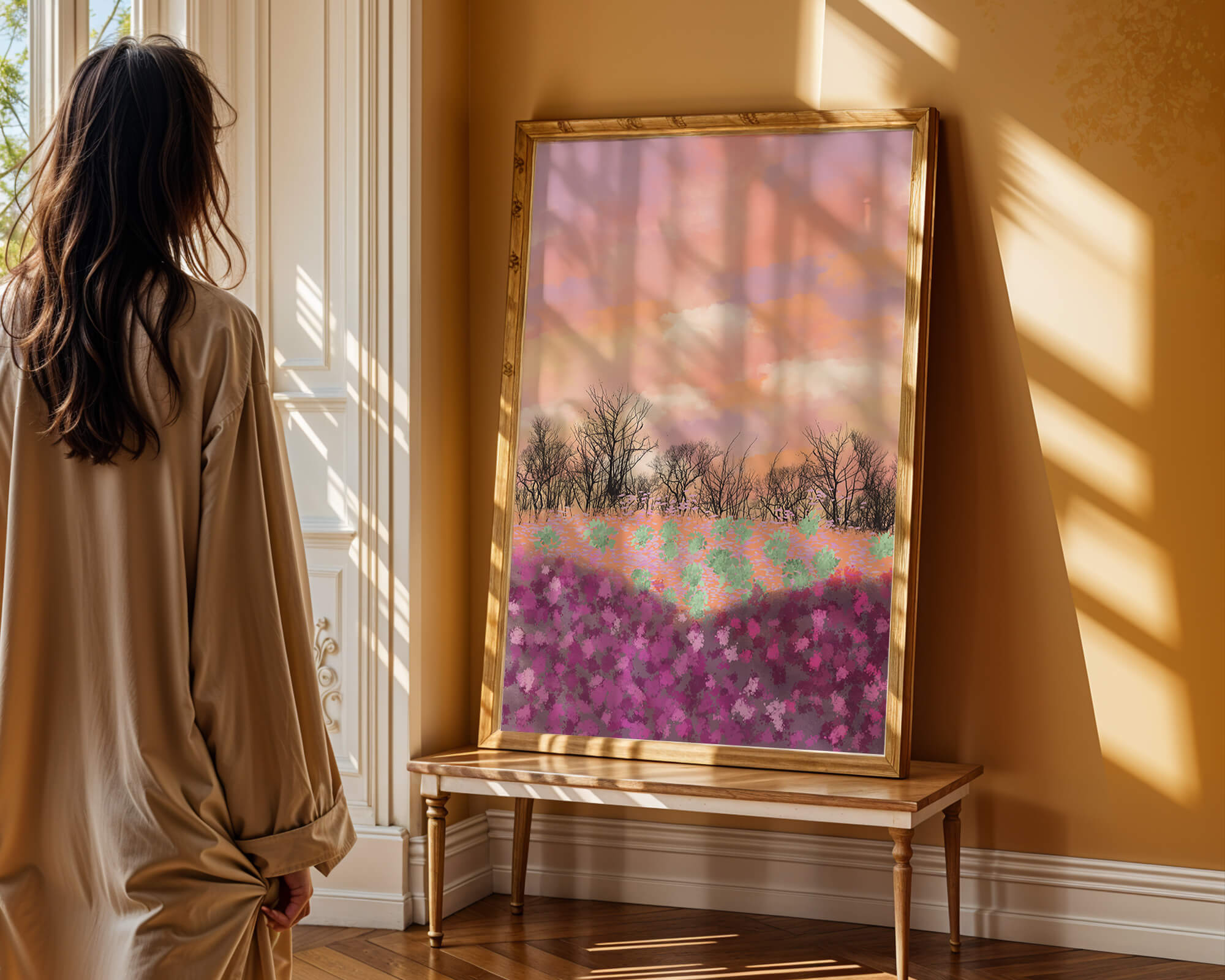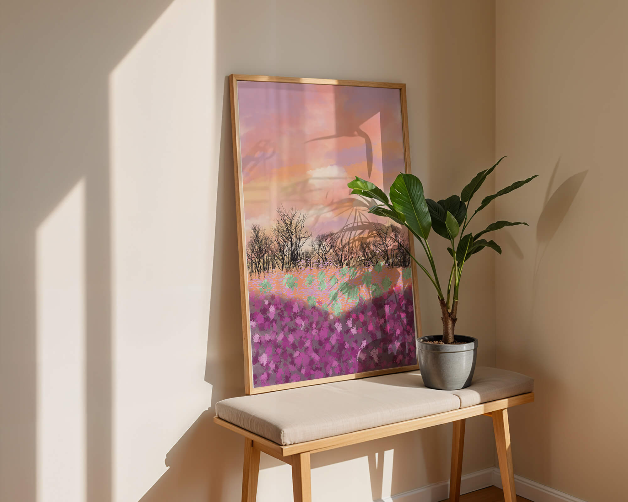 This artwork captures a serene landscape featuring a colorful field covered with pink and purple flowers. The bare trees stand in stark contrast to the vibrant floral display, adding depth to the composition. Above, a beautiful pastel-colored sky of oranges and purples stretches across the horizon.