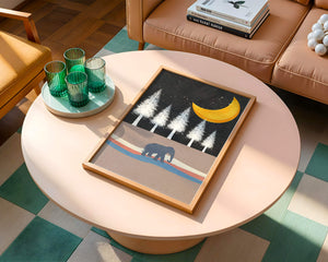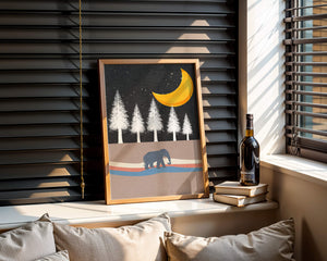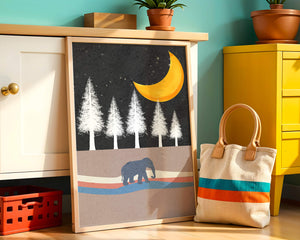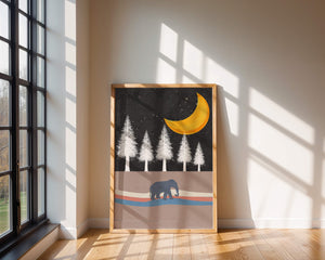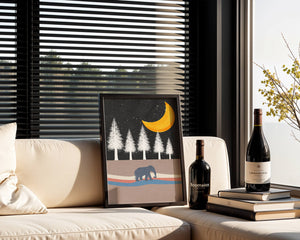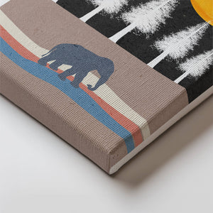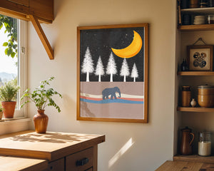 In the foreground, a gentle pattern of waves creates a path for the solitary elephant, contributing to the scenes soothing atmosphere. The silhouette of the animal adds a touch of mystery and wonder. The golden moon illuminates the trees, casting a beautiful glow over the landscape. This image evokes a sense of peace and connection with nature, making it a perfect piece for anyone who appreciates the tranquility of the wilderness.