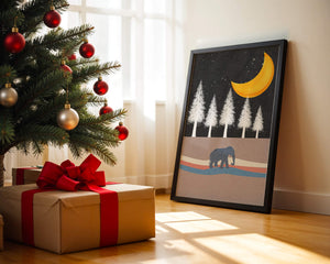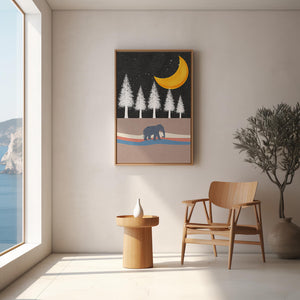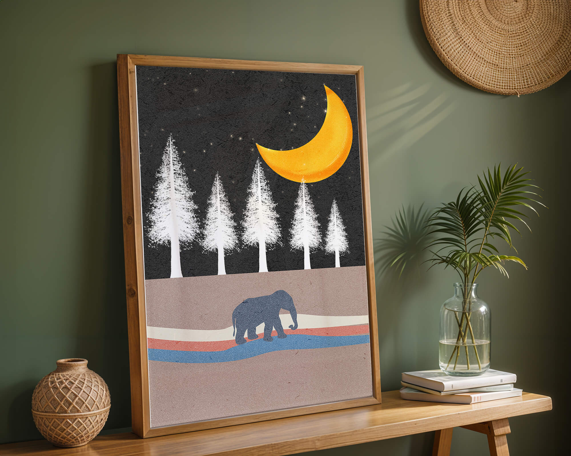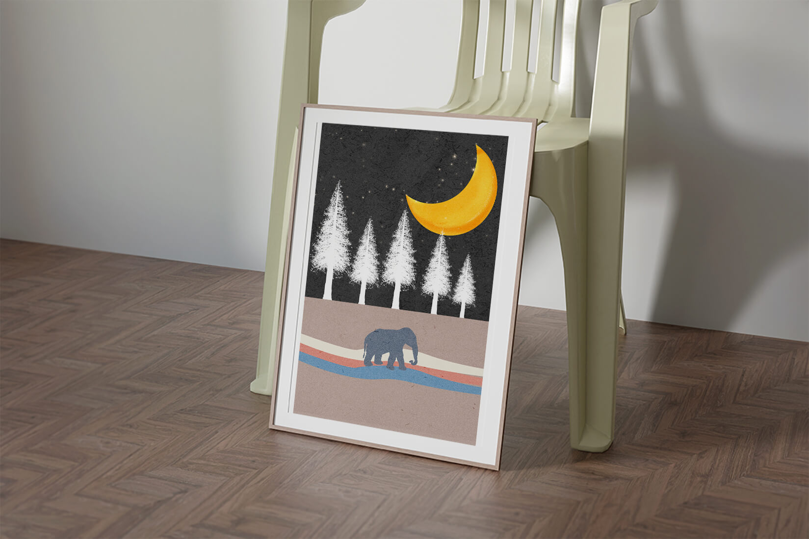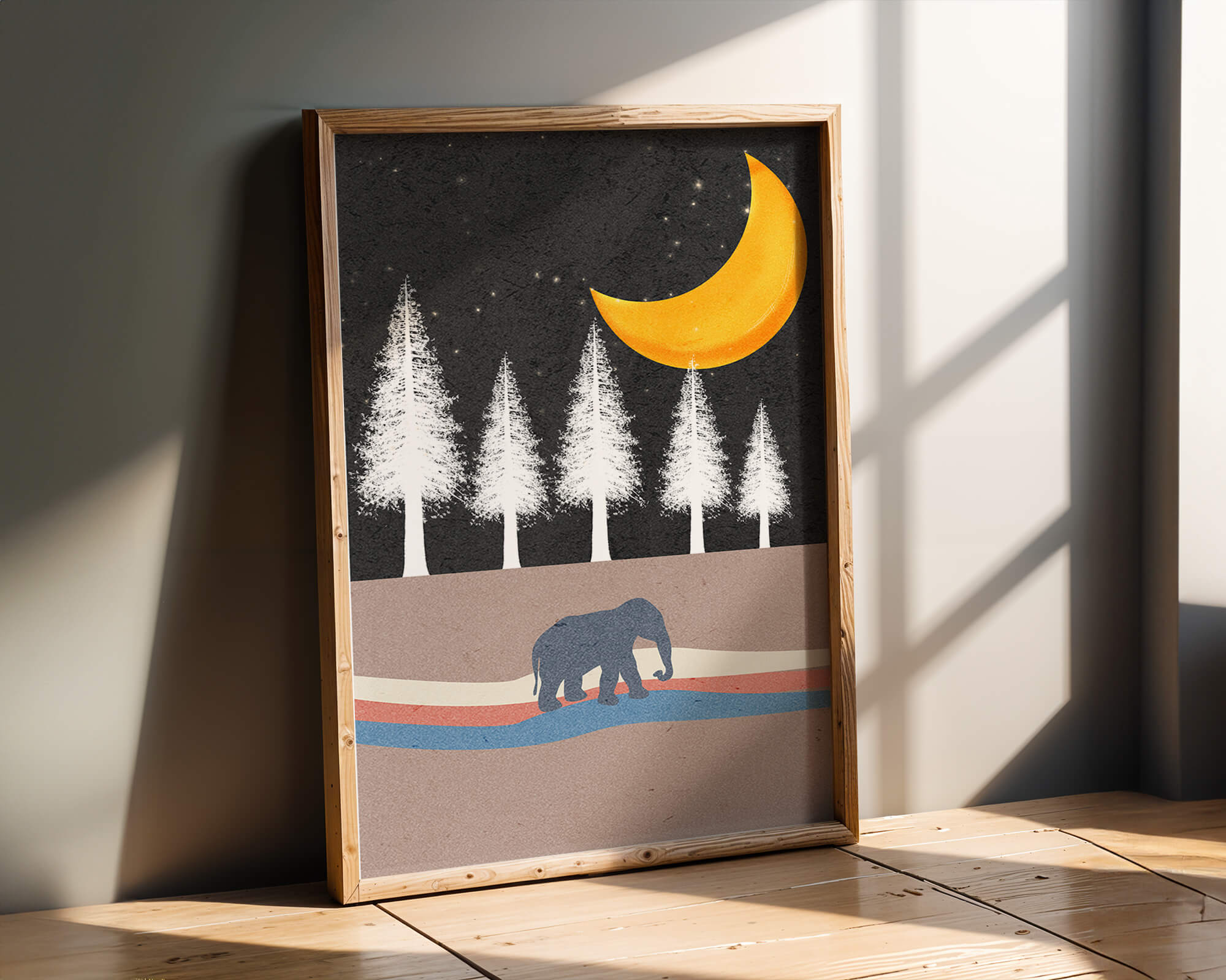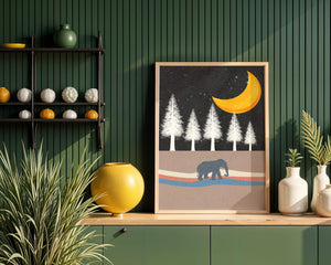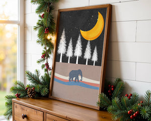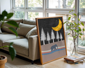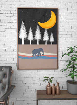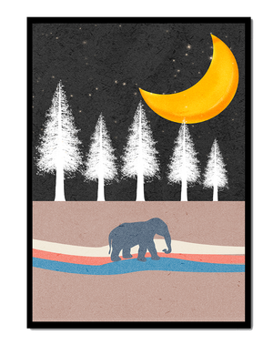 This artwork captures a serene night scene with an elephant walking under a golden crescent moon. The background features tall white trees against a dark, starry sky.