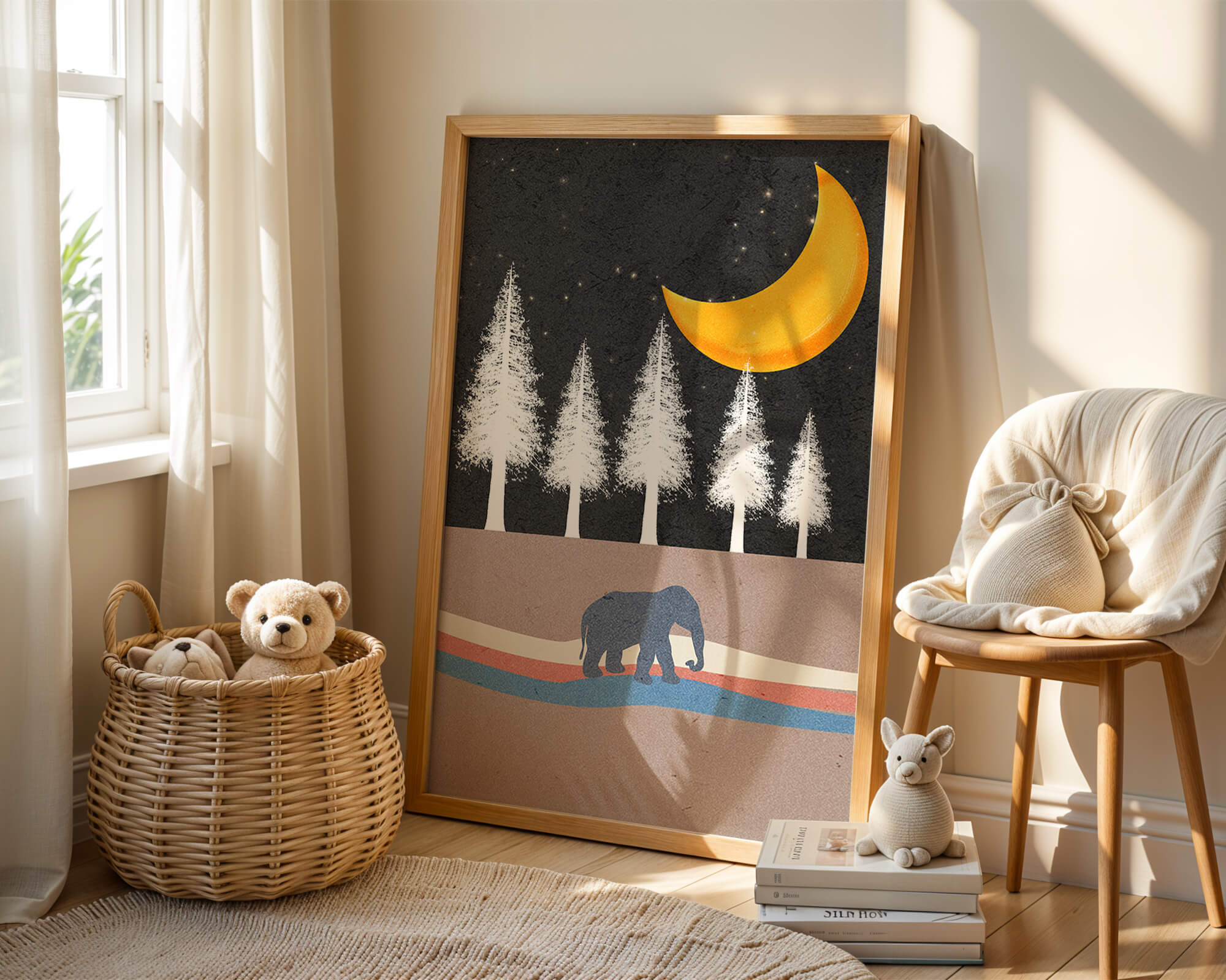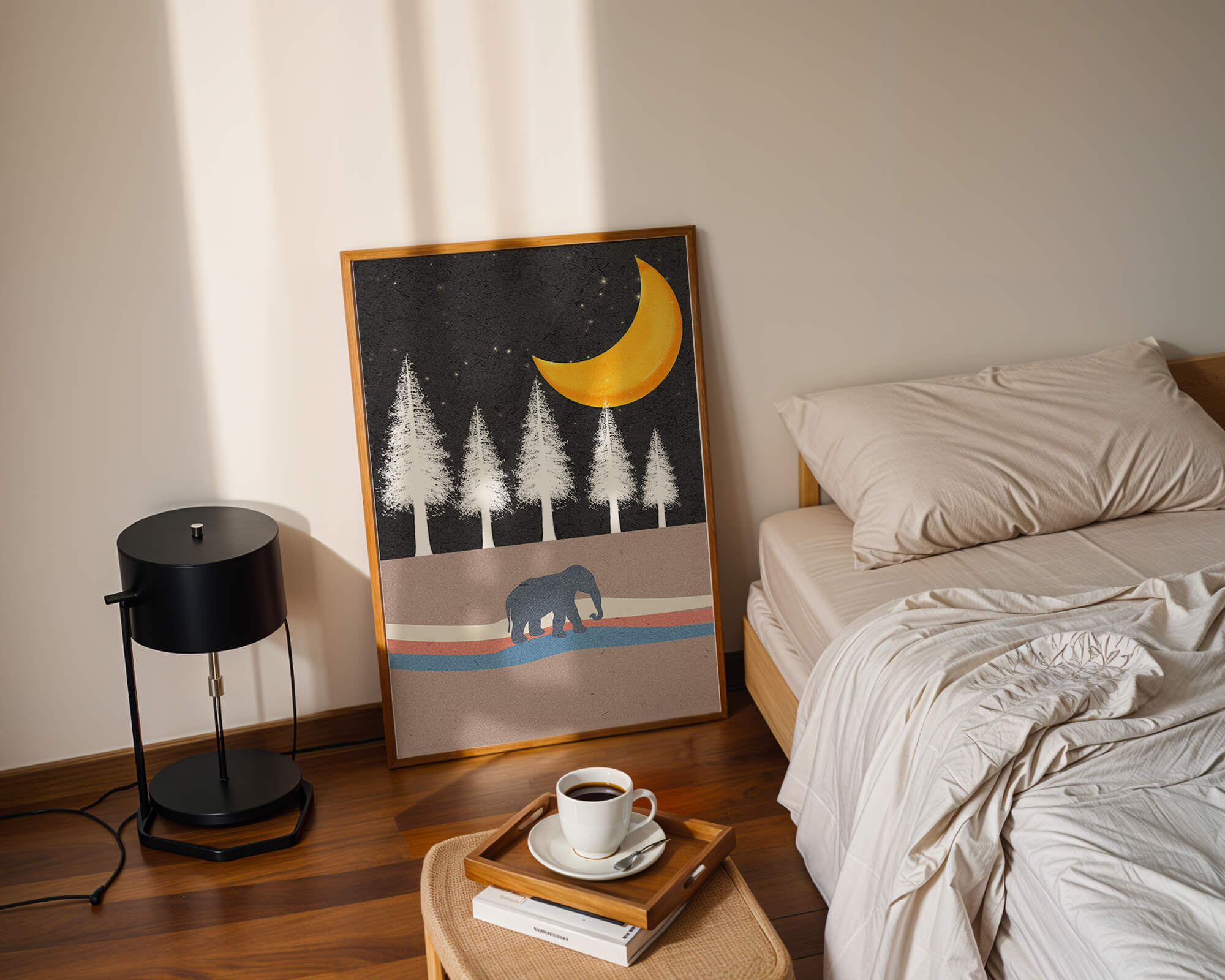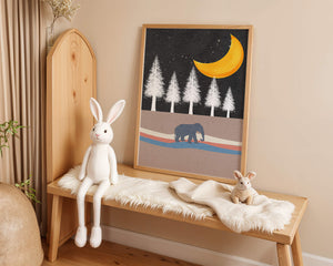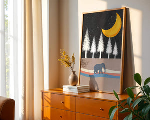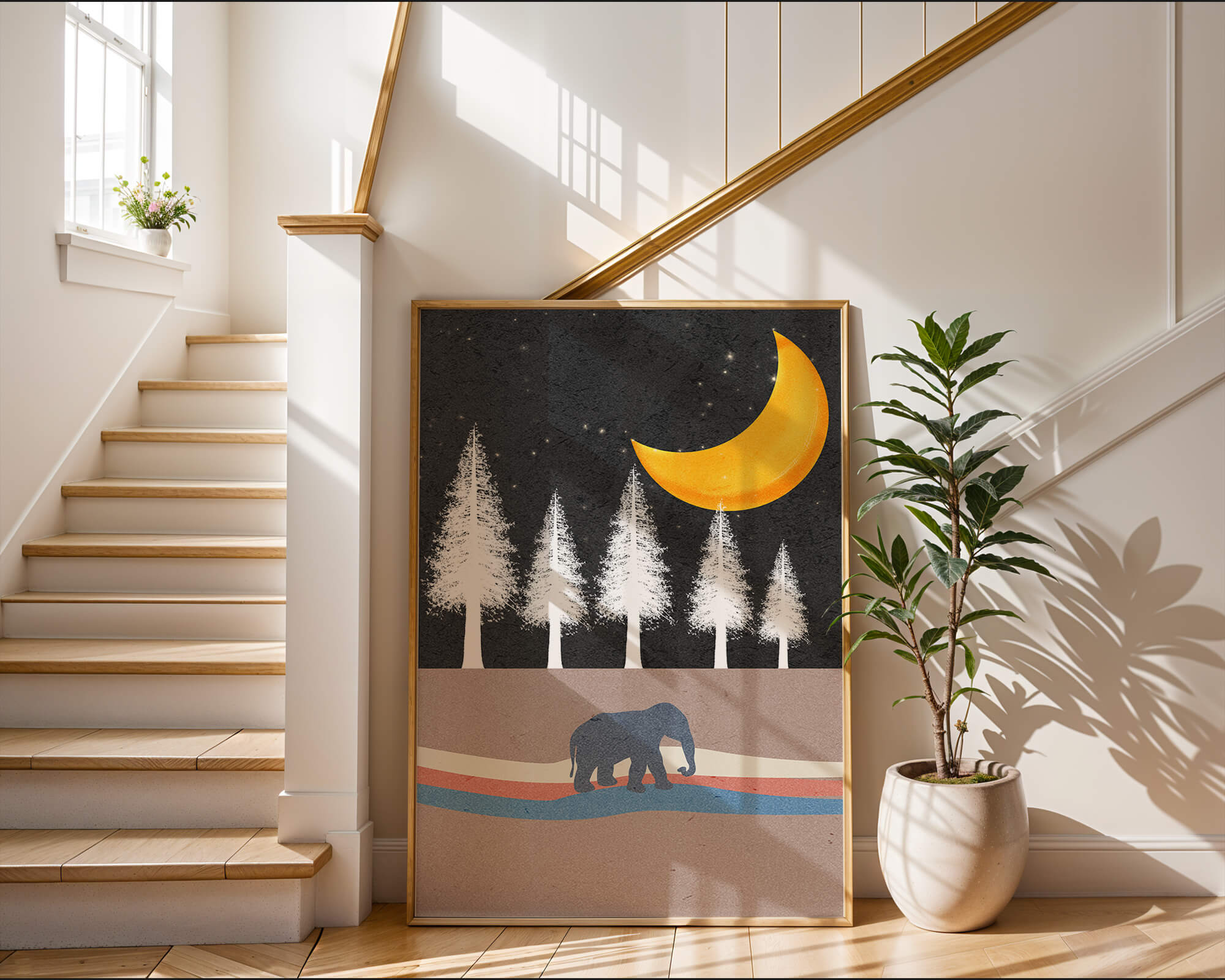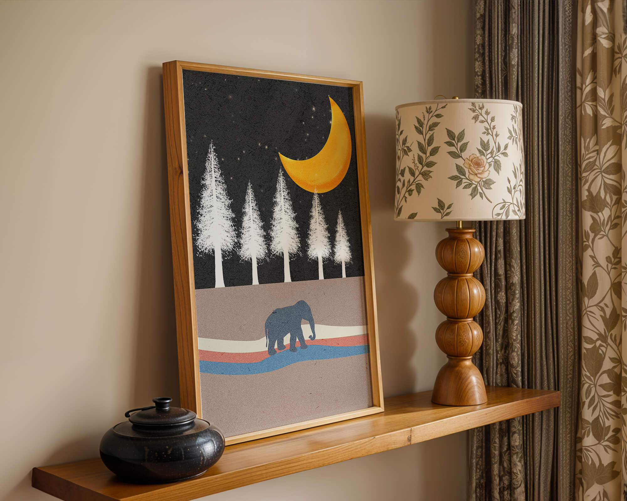 This artwork captures a serene night scene with an elephant walking under a golden crescent moon. The background features tall white trees against a dark, starry sky.