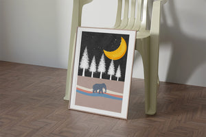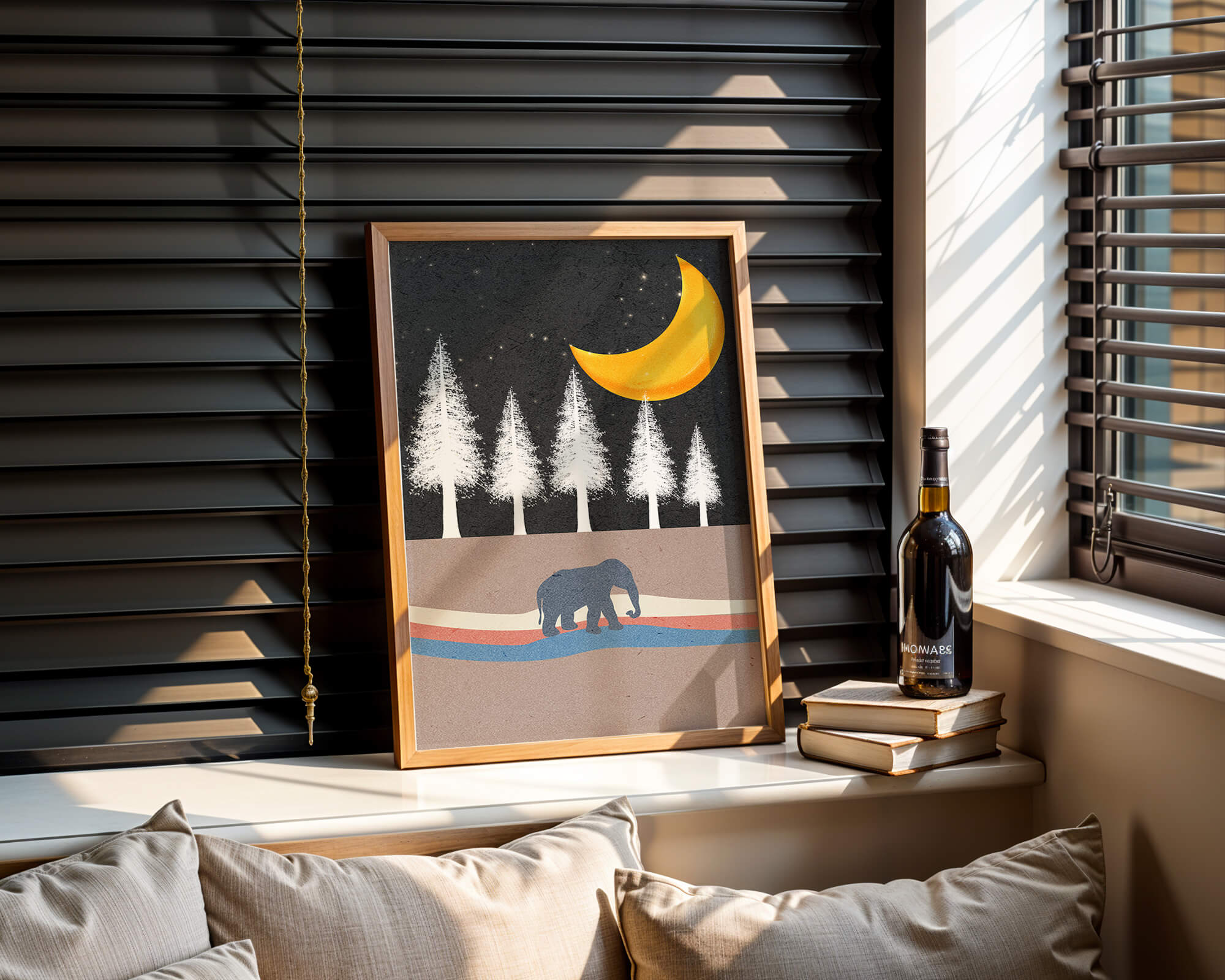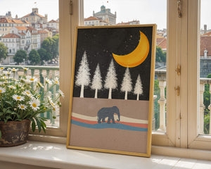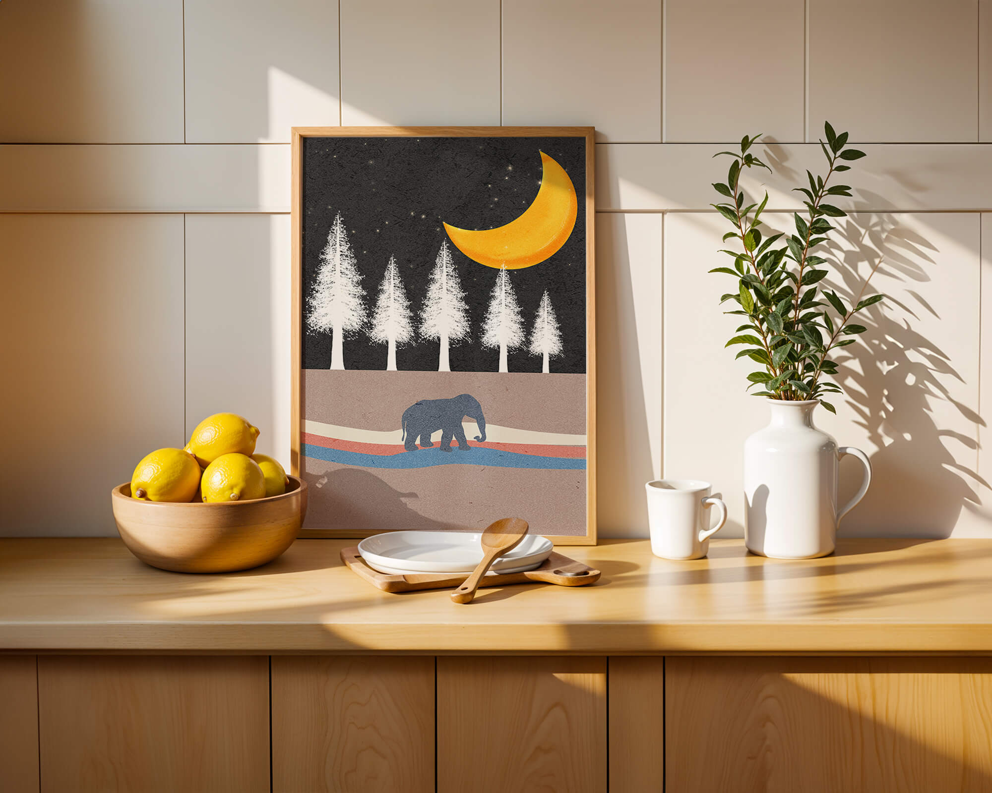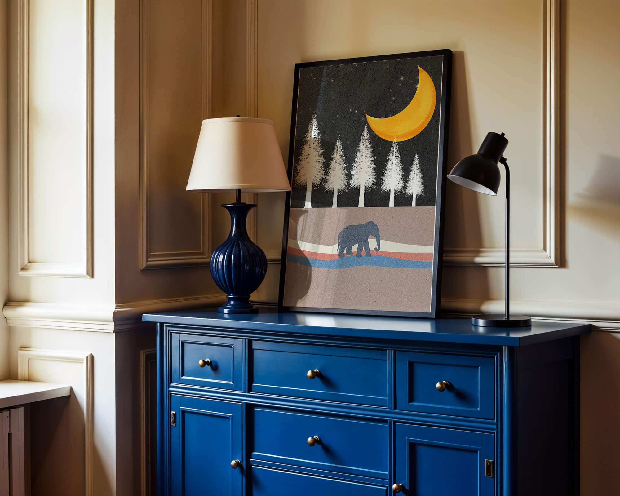 This artwork captures a serene night scene with an elephant walking under a golden crescent moon. The background features tall white trees against a dark, starry sky.