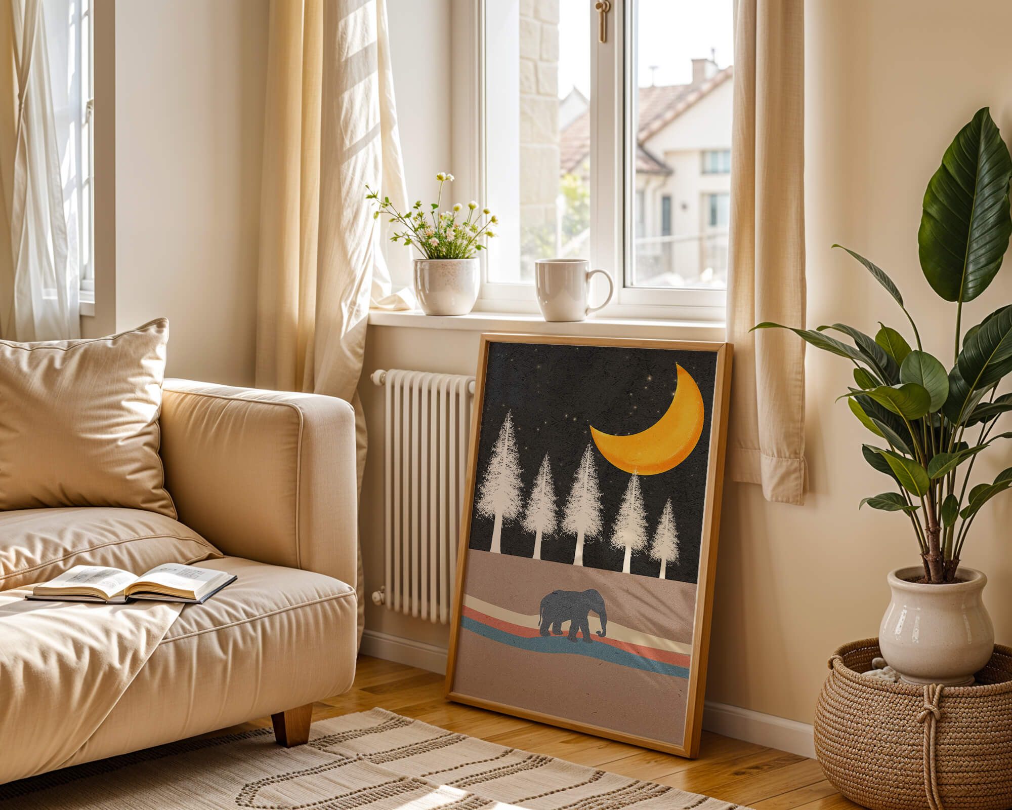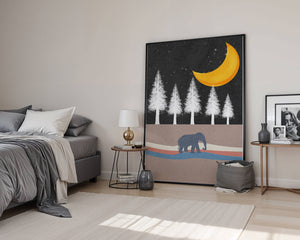 Home Serene Night Scene with Elephant Under Golden Moon in Forest