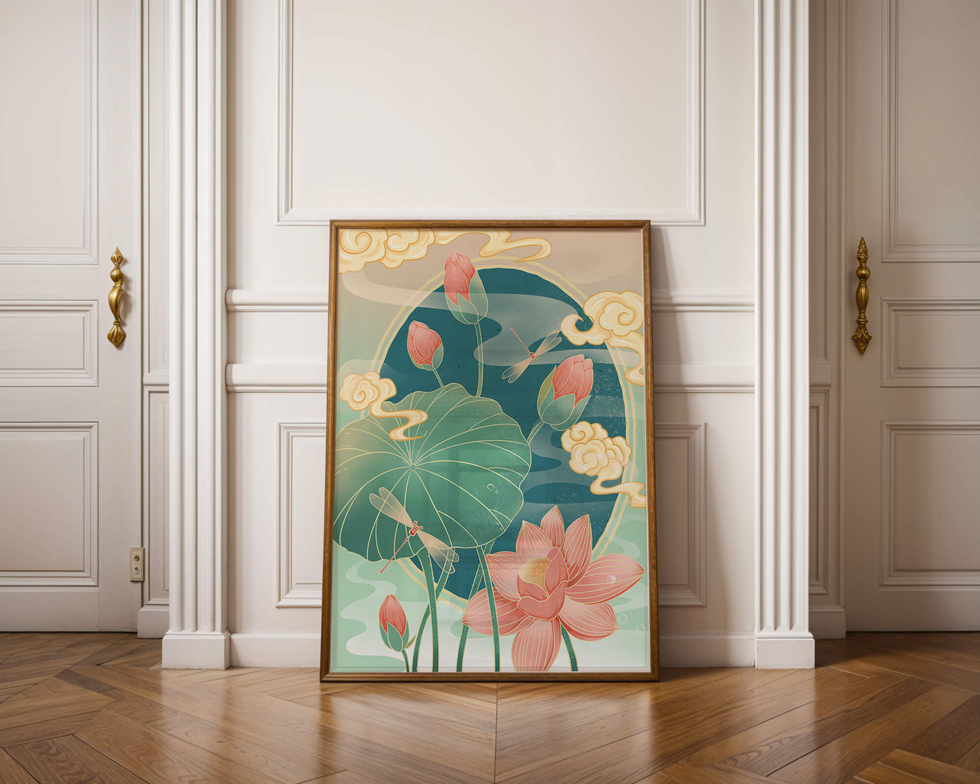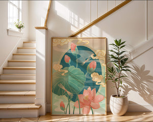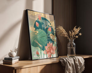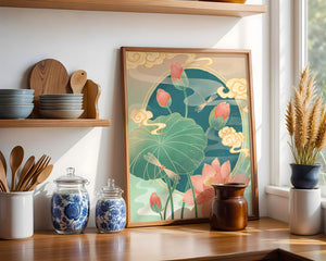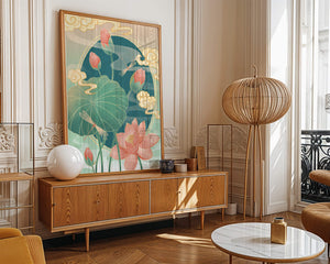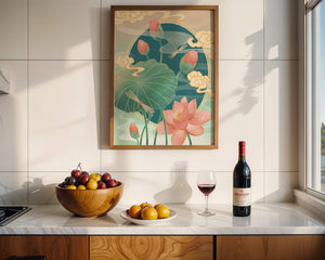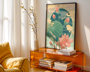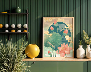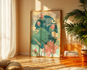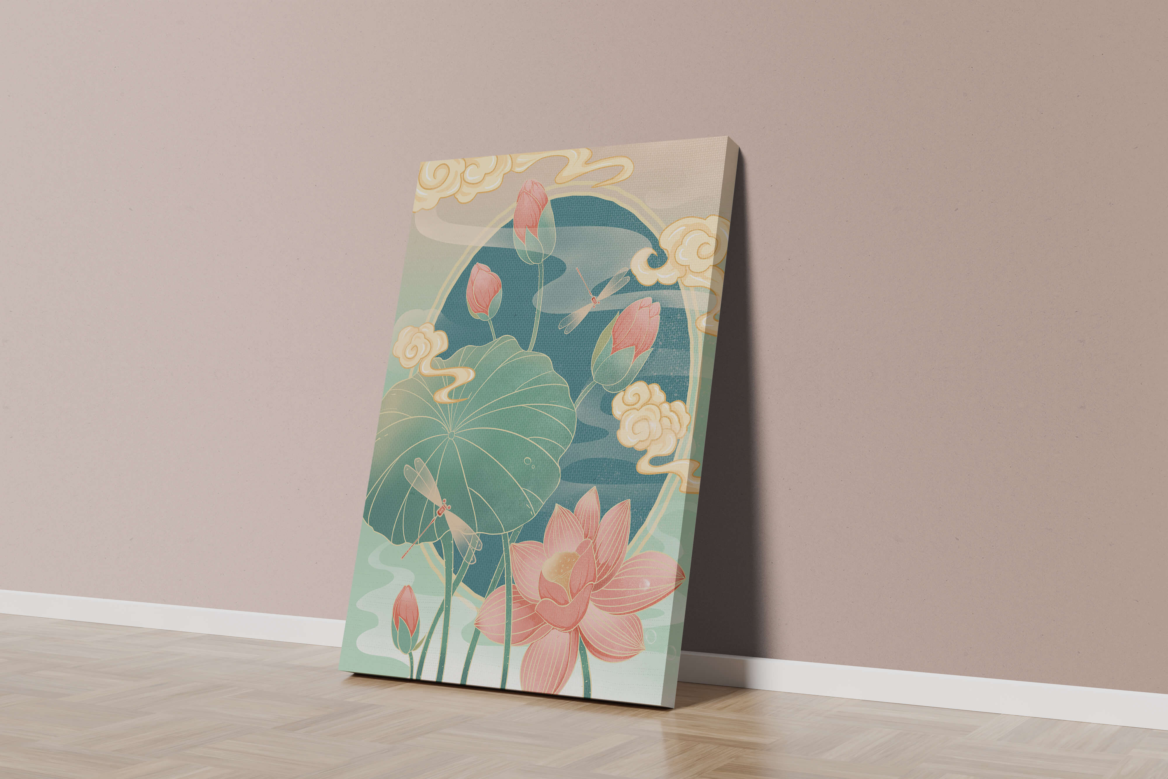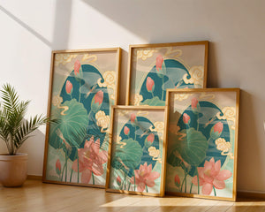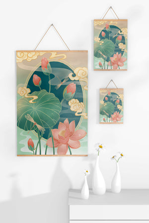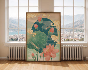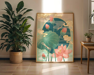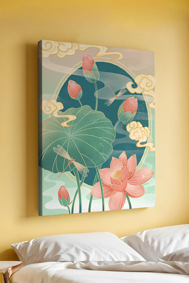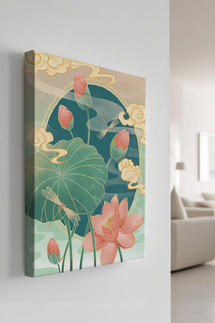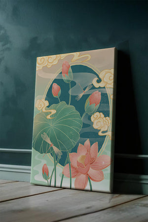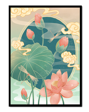 Discover a serene and calming illustration that captures the essence of nature with its elegant portrayal of lotus flowers and dragonflies. This artwork brings together pastel hues of green and pink to create a tranquil scene reminiscent of a serene pond environment. The gentle curves of the lotus leaves and flowers are beautifully complemented by the delicate presence of dragonflies, adding a sense of peace and balance to any space.### Captivating Nature-Inspired ArtThe image showcases a harmonious blend of natural elements that inspire relaxation and calm. The graceful lotus flowers, in various stages of bloom, symbolize purity and enlightenment, while the dragonflies dance around them, bringing a sense of lightness and movement. The background is softly adorned with stylized clouds, adding depth and an oriental touch to the scene.Perfect for any room in your home, this artwork serves as a reminder of the beauty and tranquility of nature. Whether displayed in a living room or a bedroom, it will create an inviting and peaceful atmosphere, allowing viewers to