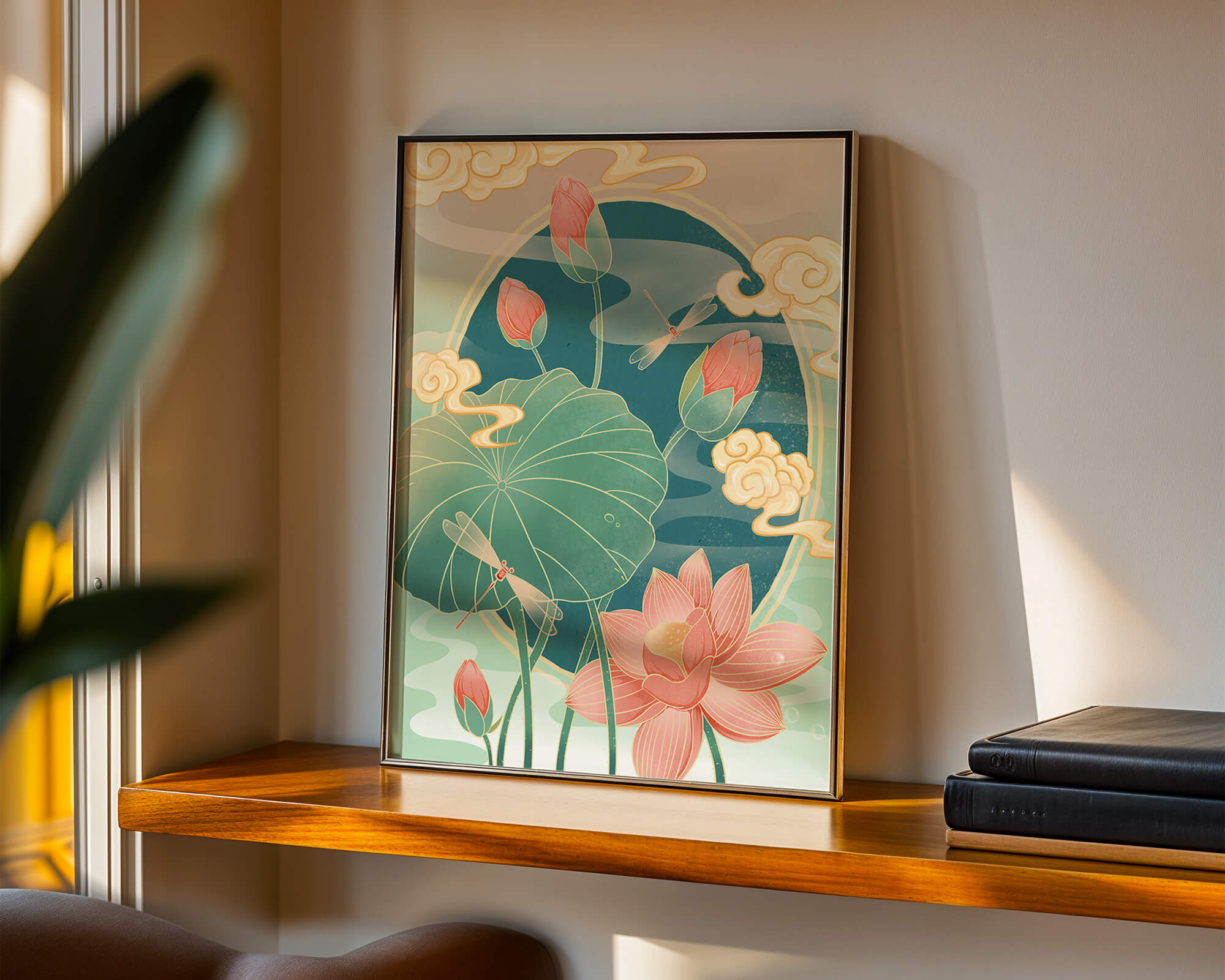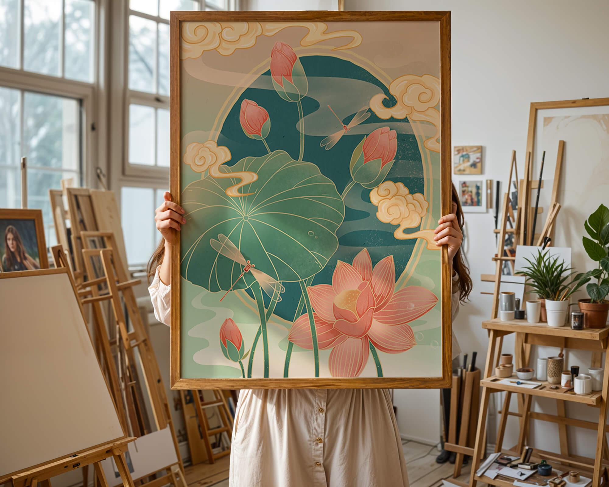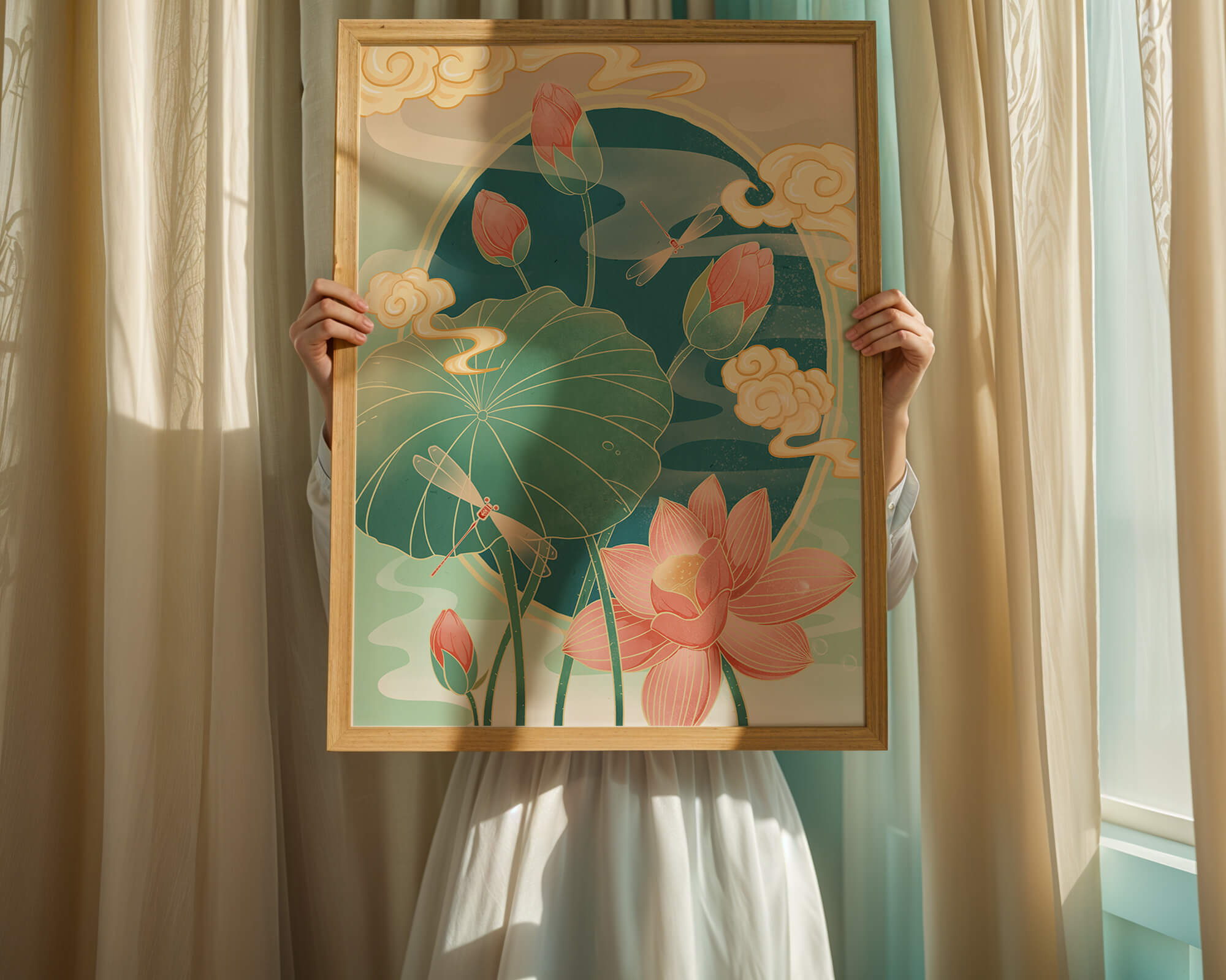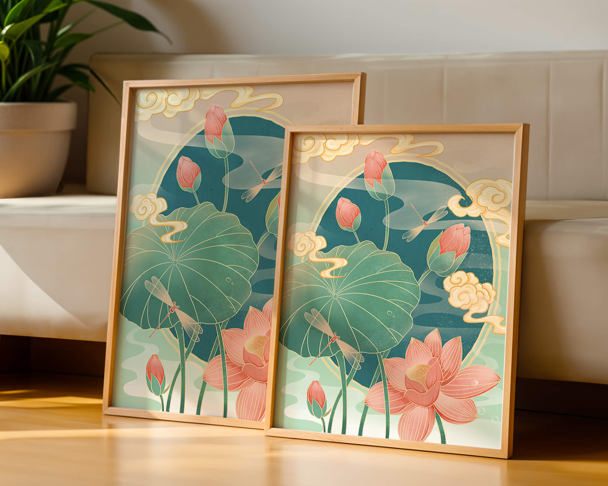 Discover a serene and calming illustration that captures the essence of nature with its elegant portrayal of lotus flowers and dragonflies. This artwork brings together pastel hues of green and pink to create a tranquil scene reminiscent of a serene pond environment. The gentle curves of the lotus leaves and flowers are beautifully complemented by the delicate presence of dragonflies, adding a sense of peace and balance to any space.### Captivating Nature-Inspired ArtThe image showcases a harmonious blend of natural elements that inspire relaxation and calm. The graceful lotus flowers, in various stages of bloom, symbolize purity and enlightenment, while the dragonflies dance around them, bringing a sense of lightness and movement. The background is softly adorned with stylized clouds, adding depth and an oriental touch to the scene.Perfect for any room in your home, this artwork serves as a reminder of the beauty and tranquility of nature. Whether displayed in a living room or a bedroom, it will create an inviting and peaceful atmosphere, allowing viewers to