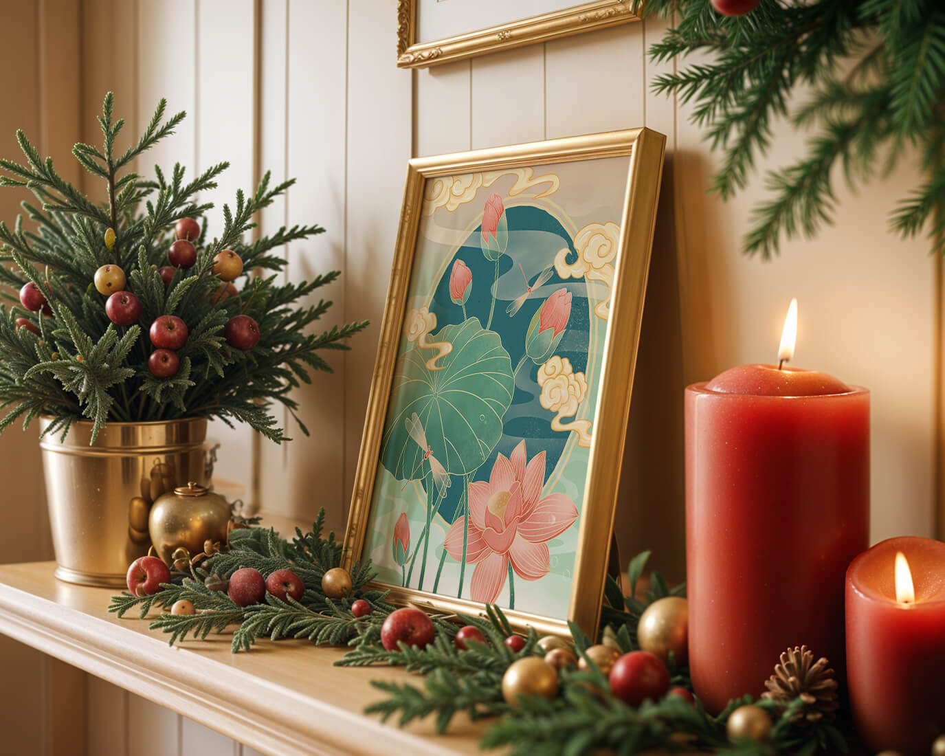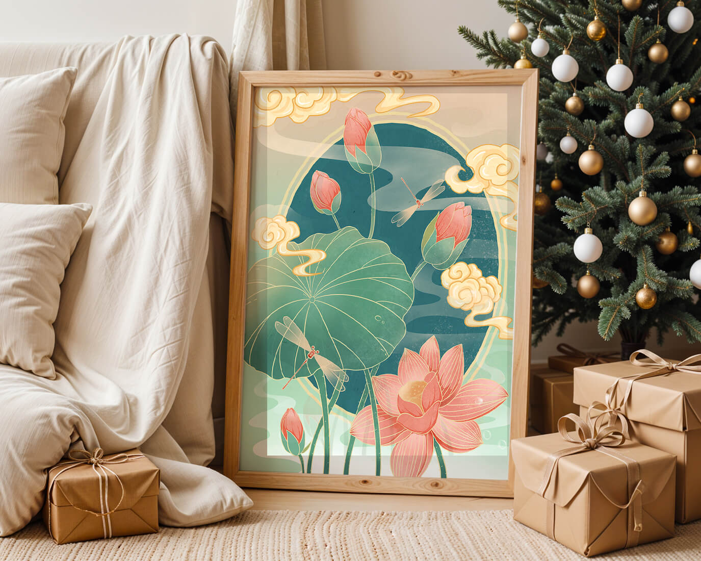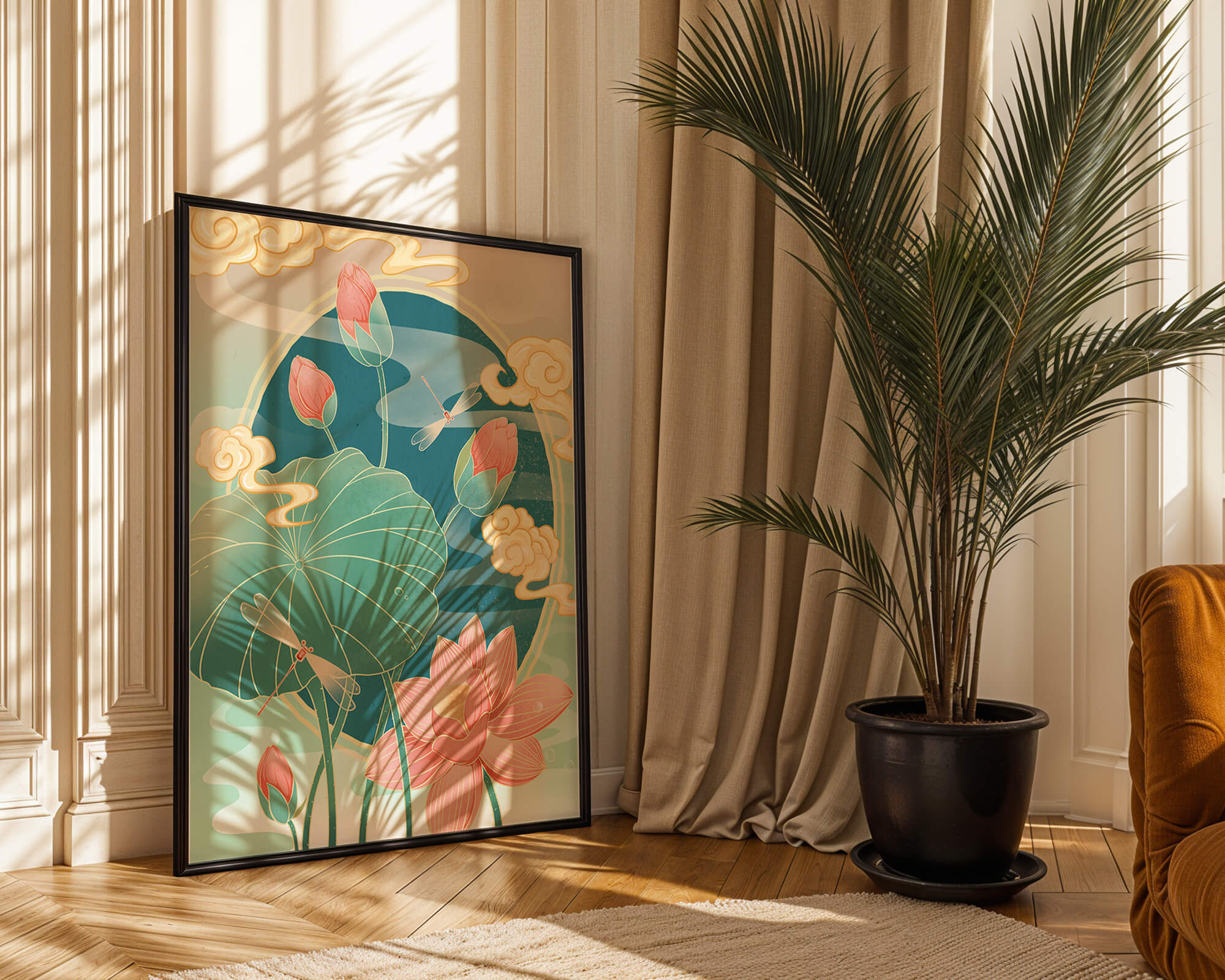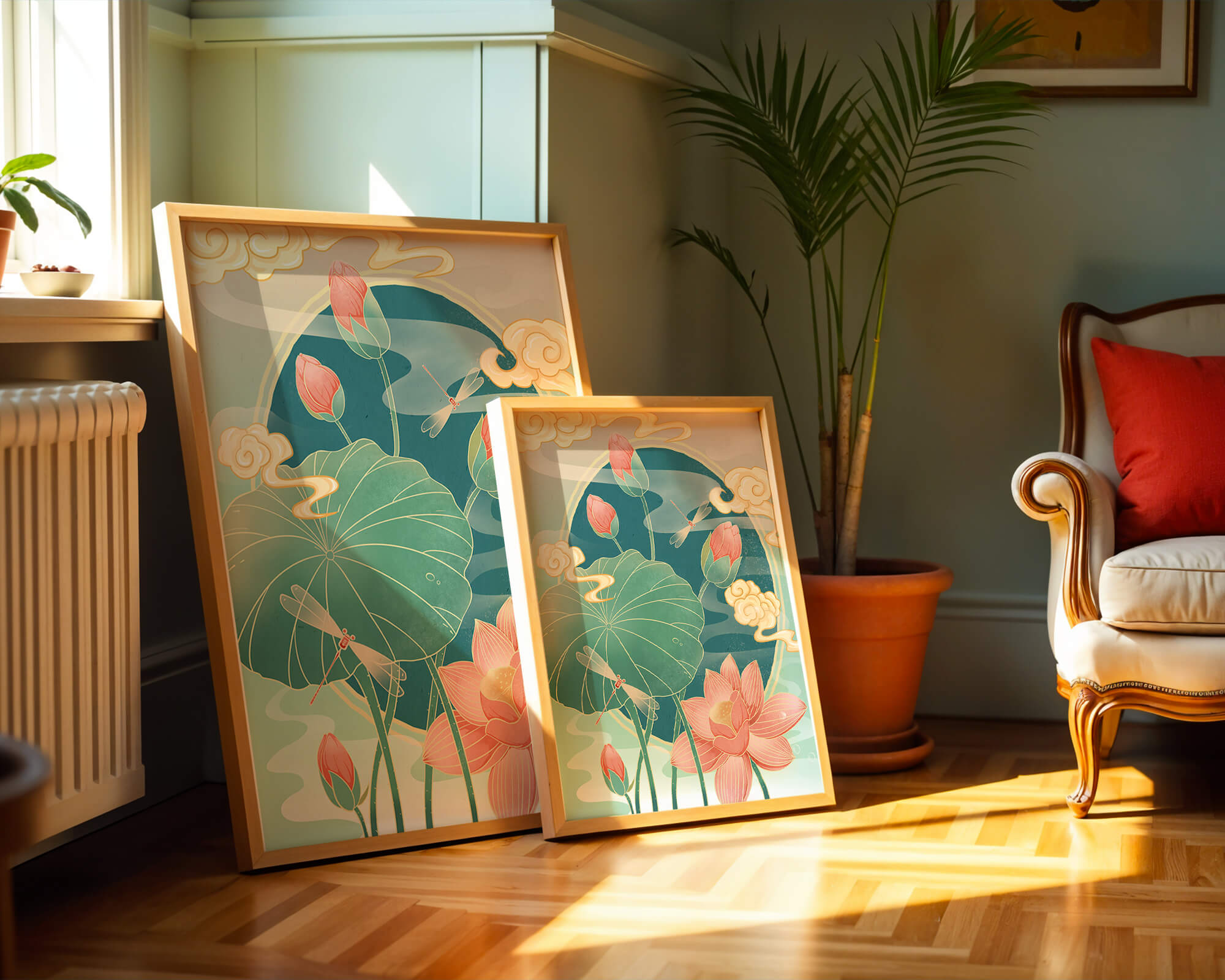 Discover a serene and calming illustration that captures the essence of nature with its elegant portrayal of lotus flowers and dragonflies. This artwork brings together pastel hues of green and pink to create a tranquil scene reminiscent of a serene pond environment. The gentle curves of the lotus leaves and flowers are beautifully complemented by the delicate presence of dragonflies, adding a sense of peace and balance to any space.### Captivating Nature-Inspired ArtThe image showcases a harmonious blend of natural elements that inspire relaxation and calm. The graceful lotus flowers, in various stages of bloom, symbolize purity and enlightenment, while the dragonflies dance around them, bringing a sense of lightness and movement. The background is softly adorned with stylized clouds, adding depth and an oriental touch to the scene.Perfect for any room in your home, this artwork serves as a reminder of the beauty and tranquility of nature. Whether displayed in a living room or a bedroom, it will create an inviting and peaceful atmosphere, allowing viewers to