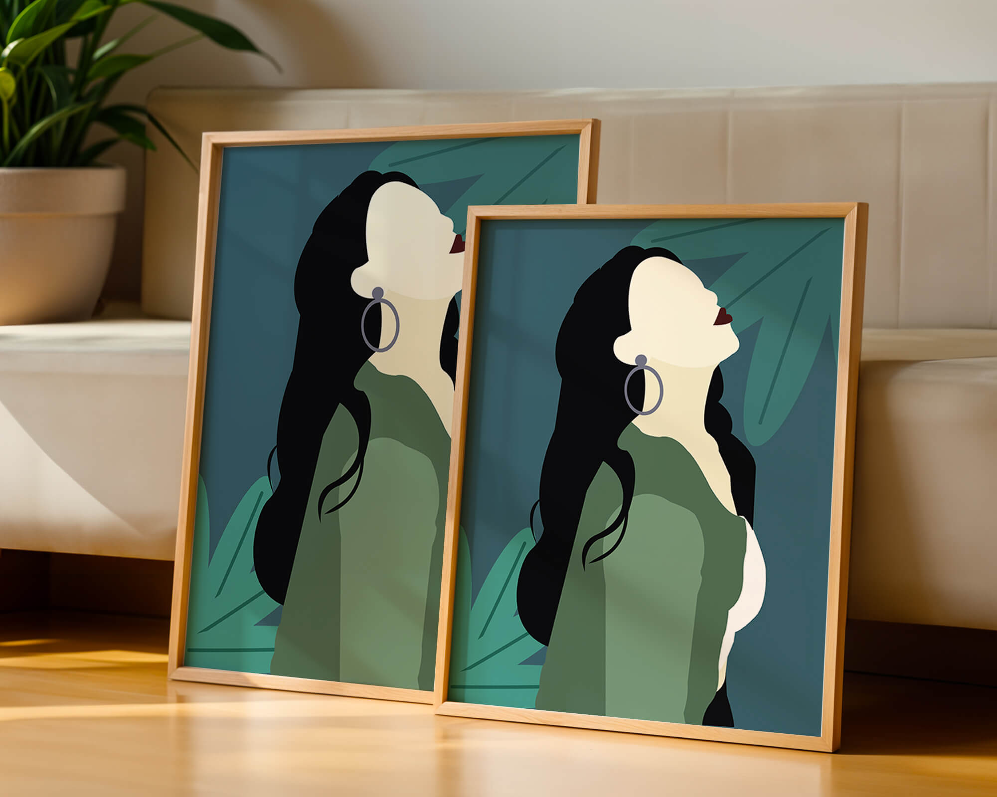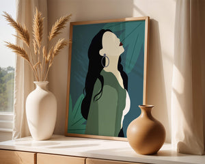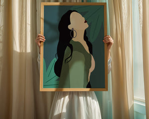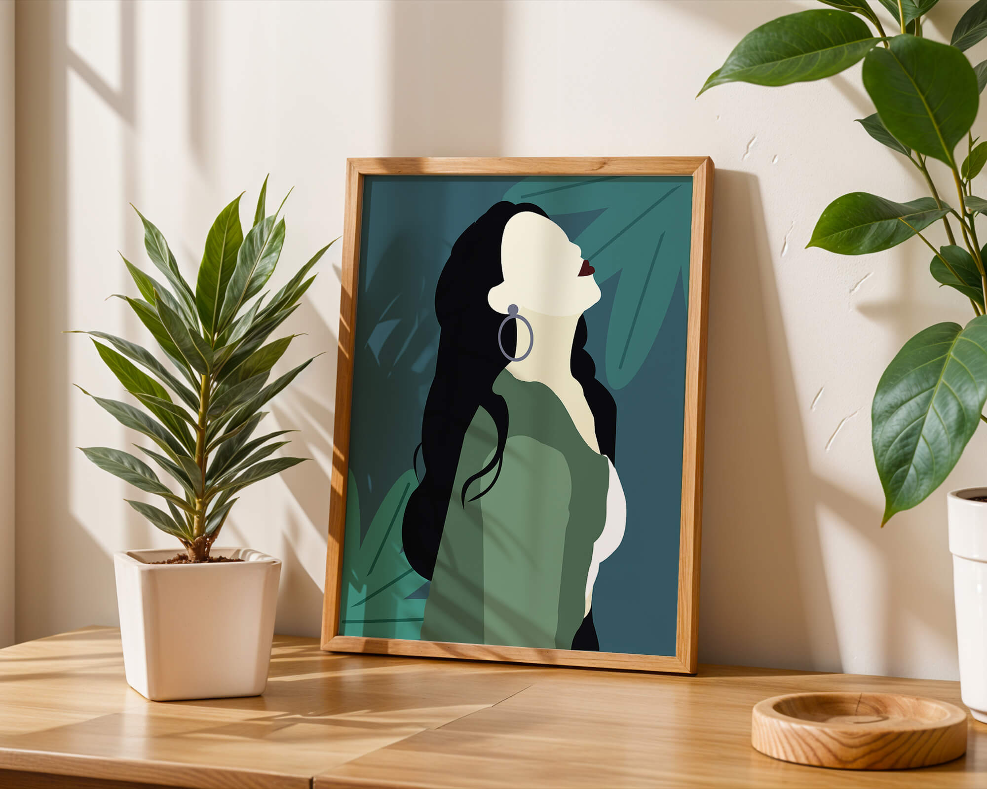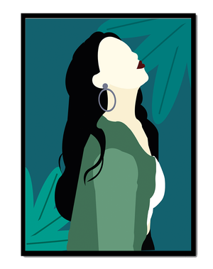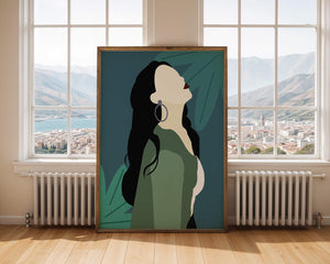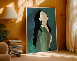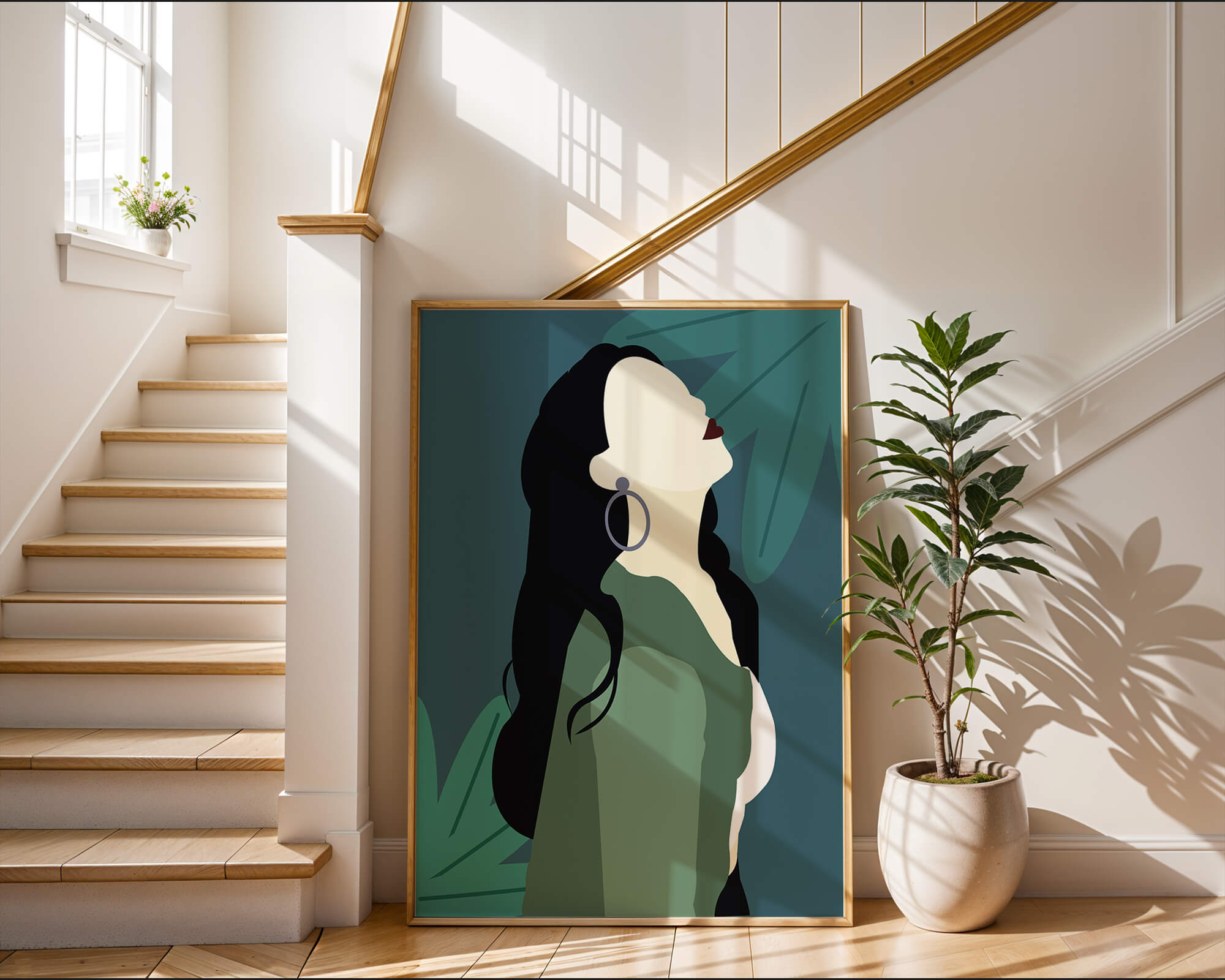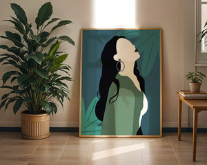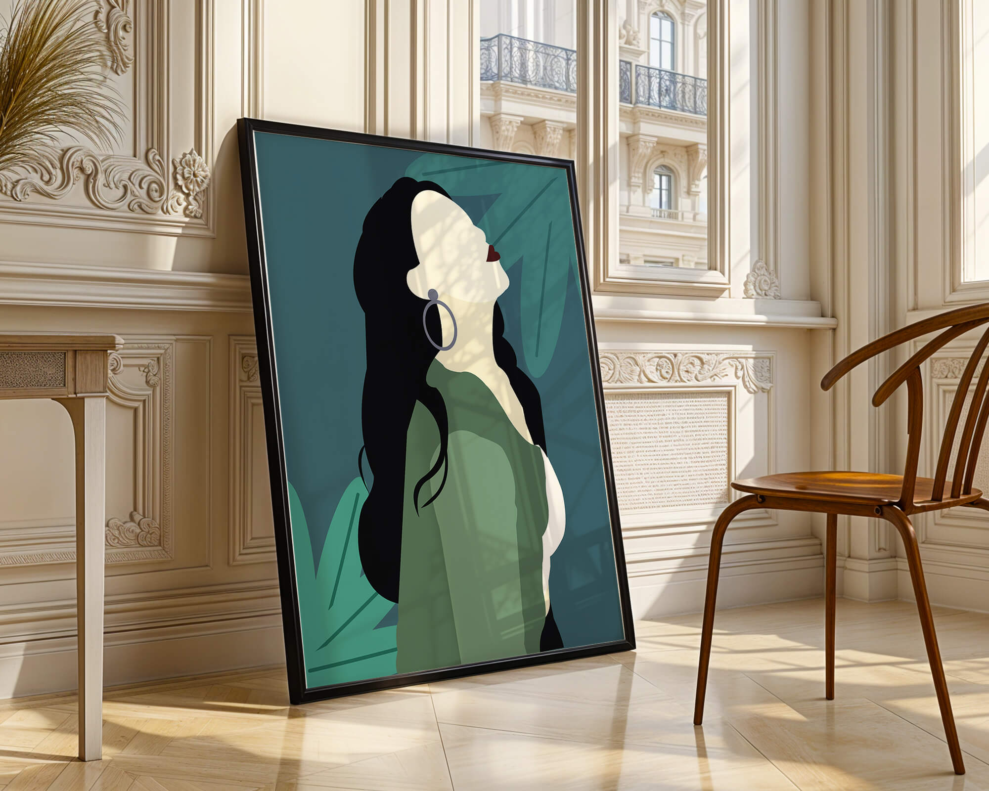 The simplicity of this artwork makes it a perfect piece for any contemporary space. The muted colors of green and blue create a soothing atmosphere, while the bold black hair and red lipstick of the woman add striking contrast. Large hoop earrings add a touch of elegance and modern fashion, highlighting her graceful demeanor.This piece can transform any room, adding a sense of tranquility and sophistication. The abstract foliage in the backdrop complements the minimalist style of the illustration, making it a versatile addition to various interior décors. Whether displayed in a living room or a personal study, this artwork will surely draw the viewers attention and invoke contemplation.