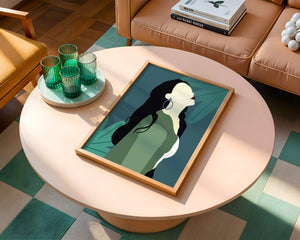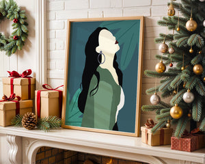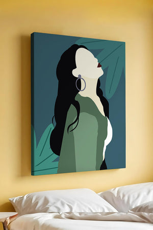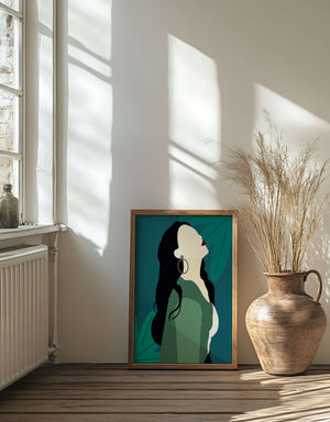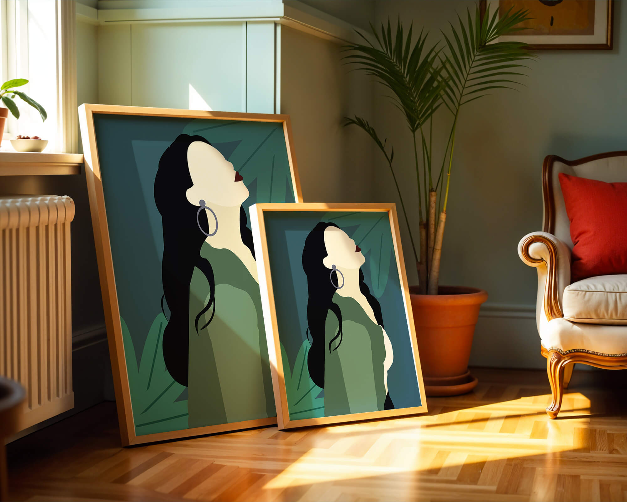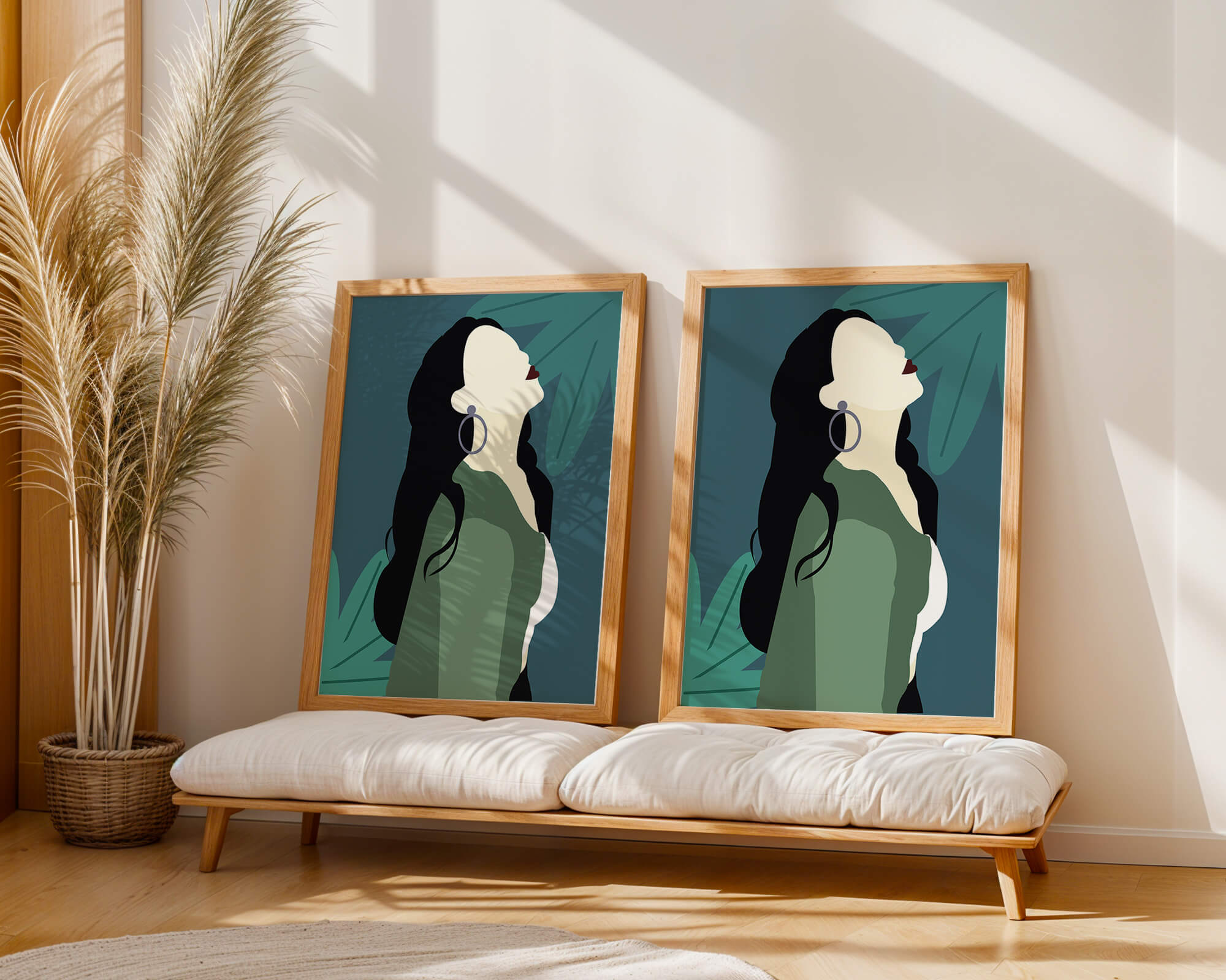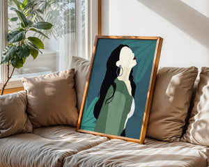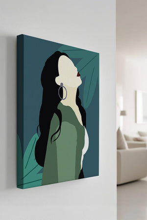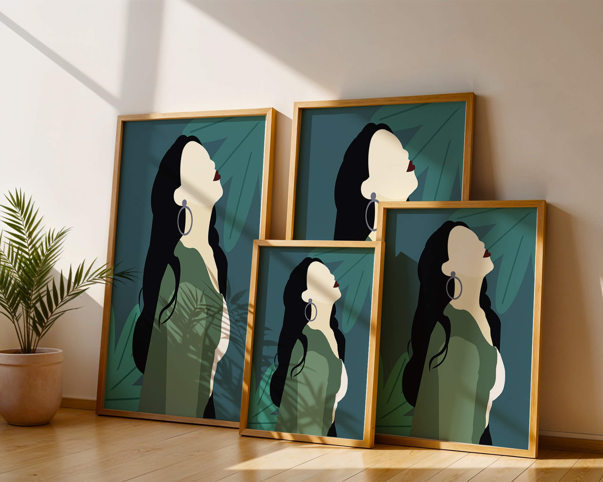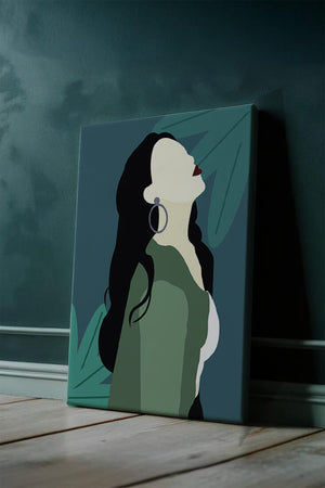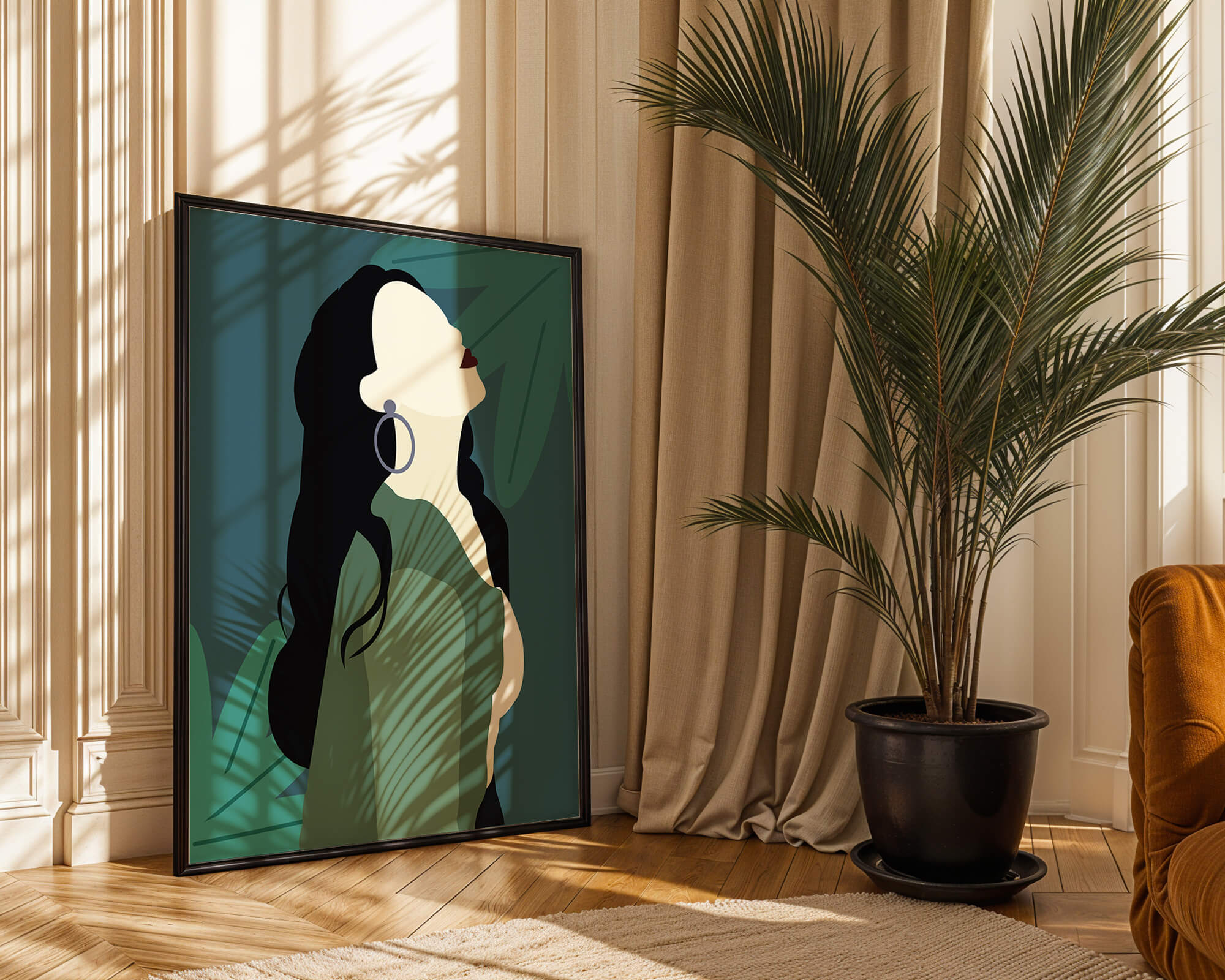 The simplicity of this artwork makes it a perfect piece for any contemporary space. The muted colors of green and blue create a soothing atmosphere, while the bold black hair and red lipstick of the woman add striking contrast. Large hoop earrings add a touch of elegance and modern fashion, highlighting her graceful demeanor.This piece can transform any room, adding a sense of tranquility and sophistication. The abstract foliage in the backdrop complements the minimalist style of the illustration, making it a versatile addition to various interior décors. Whether displayed in a living room or a personal study, this artwork will surely draw the viewers attention and invoke contemplation.